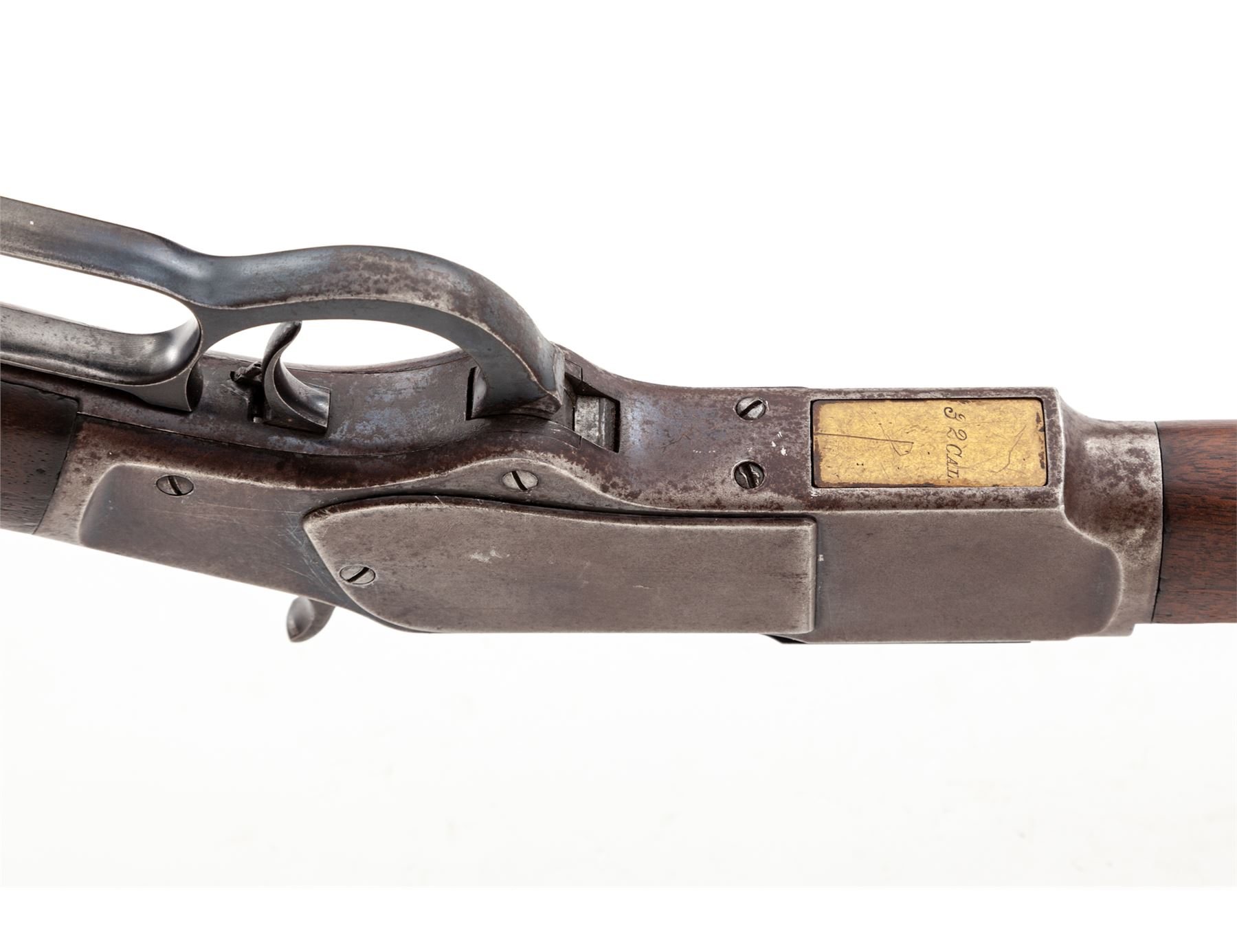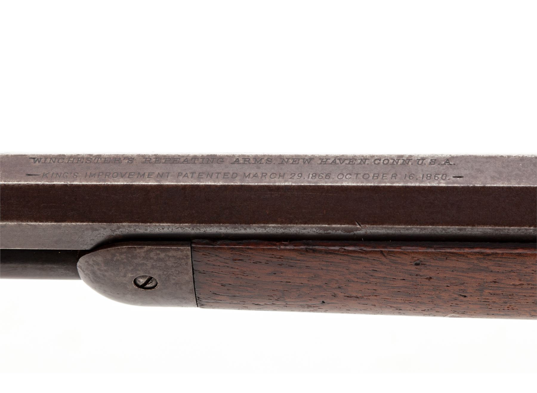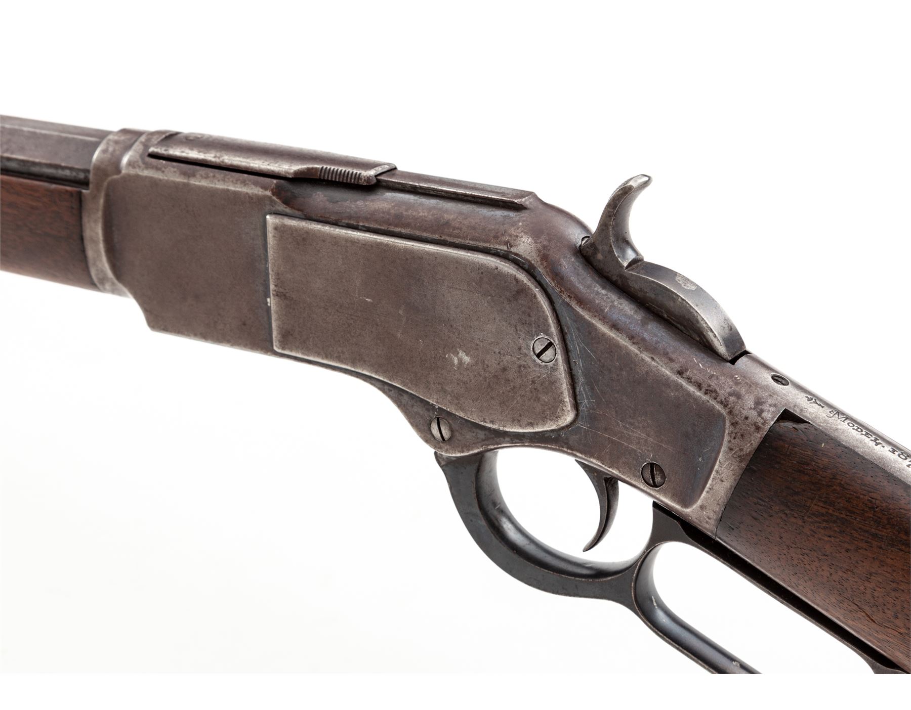 Antique Winchester Model 1873 3rd Type Lever Action Repeating Cartridge Rifle, #241493, .32 WCF cal., 24'' blued octagonal barrel with dovetailed German silver small blade front and adjustable buckhorn sporting rear sights is marked on top flat ''Winchester's Repeating Arms, New Haven, Conn. U.S.A./King's-Improvement-Patented-March 29, 1856, October 16, 1860'' in two lines, and ''32 W.C.F.'' just ahead of juncture with blued steel receiver, which is marked ''Model 1873'' within fancy brackets on top tang and the serial number on lower tang; blued sliding dustcover over top cartridge ejection port; brass cartridge elevator is marked ''32 Cal'' on bottom; full-length blued tubular cartridge magazine; blued steel nosecap and crescent buttplate on varnished walnut forend and buttstock. Mfg'd 1887. Condition is fine, the barrel retaining approx. 85% smooth original blue, thinning and darkening; the magazine tube a blue-brown patina; the receiver retaining 20% blue mixed with brown age patina; the nosecap and buttplate retain much blue; the hammer and operating lever are dark with hints of case coloring; the stocks overall smooth and sound showing a few nicks and dents commensurate with age and use but having nice straight grain and color. Action is smooth; bore is moderately etched but clean with defined rifling. The '73 is renowned as ''The Gun That Won The West.'' Est.: $1,500-$2,500. (Antique)