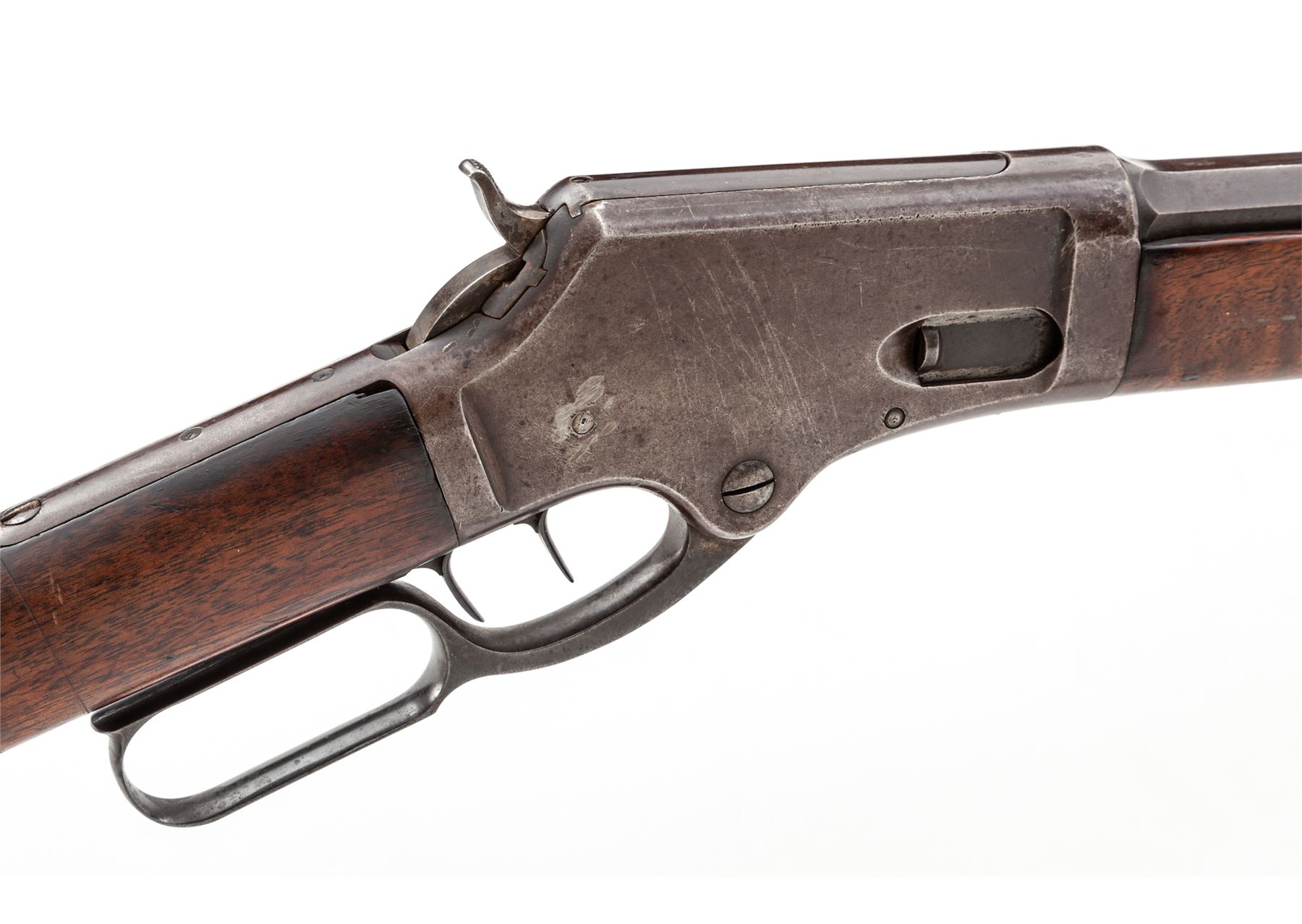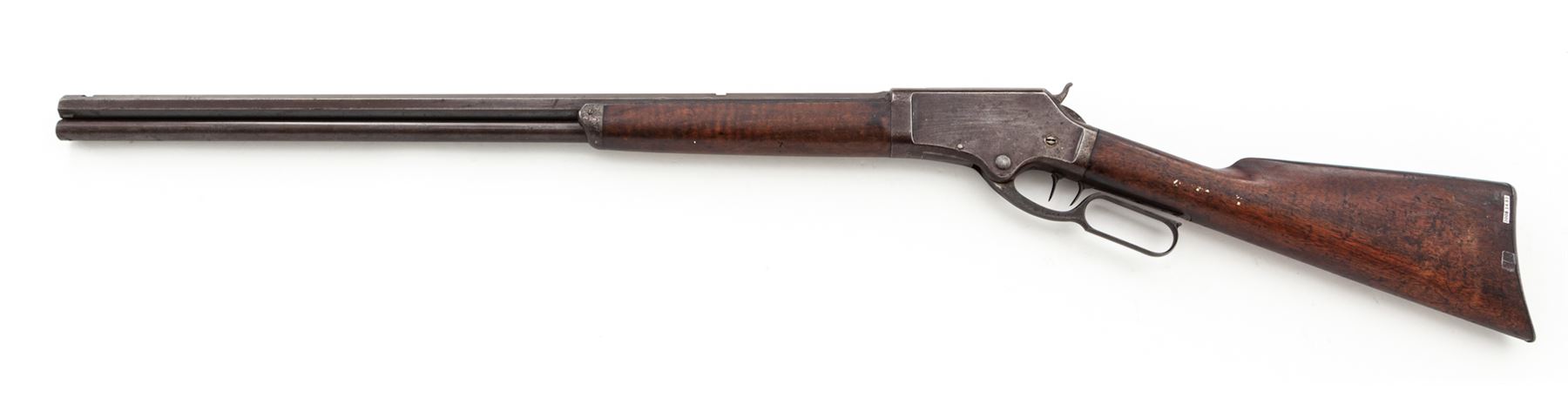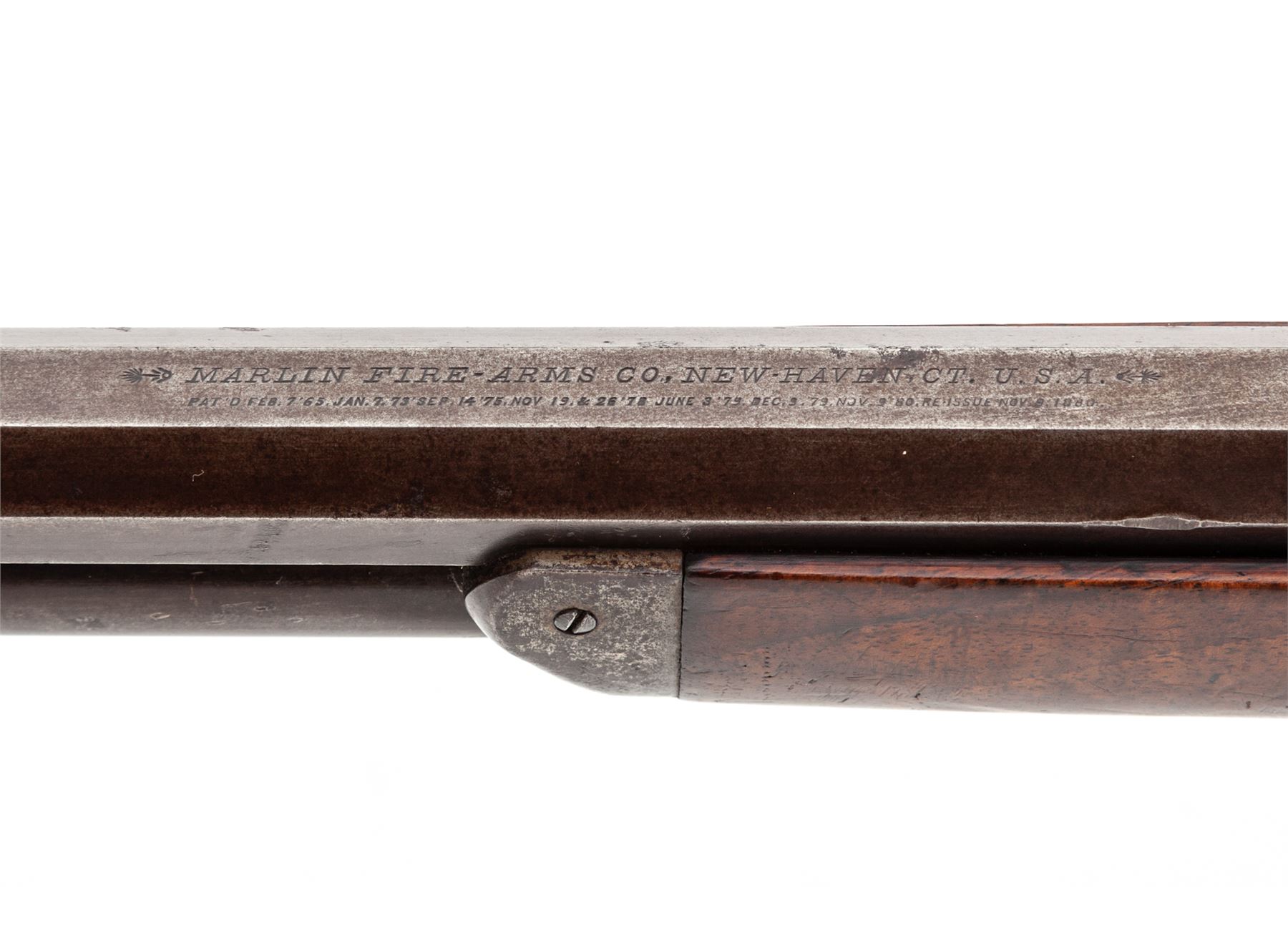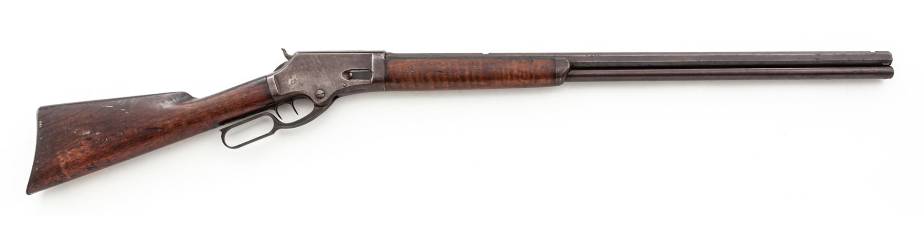 Antique Marlin Model 1881 3rd Type Lever Action Rifle, #5656, .40-60 CF cal., 28'' octagonal barrel with vacant dovetails for front and rear sights marked on top flat ''Marlin Fire-Arms Co., New-Haven, CT. U.S.A.'' flanked by fletched arrows, over eight patent dates followed by ''Reissue Nov. 9, 1880'' in two lines; full-length tubular under-barrel magazine, steel receiver and furniture including nosecap, operating lever, hammer, double-set triggers (a rarity), and buttplate; varnished walnut forend and buttstock. Mfg'd 1881-92. Originally with blued barrel and magazine tube, case hardened lever, hammer and buttplate. Condition is very good, the barrel and magazine tube retaining approx. 25% original blue mixing with age patina but no pitting, the receiver a brown patina, with silvered/darkened case hardened parts (some roughness to buttplate). Stocks show minor dings from use but are smooth, solid, fit well and have nice grain and color. Barrel sights are missing. Set triggers do not function properly, and hammer does not hold when lever is cocked (trigger mechanism likely needs attention); bore is shiny and clean with defined rifling. Est.: $1,000-$1,500. (Antique)