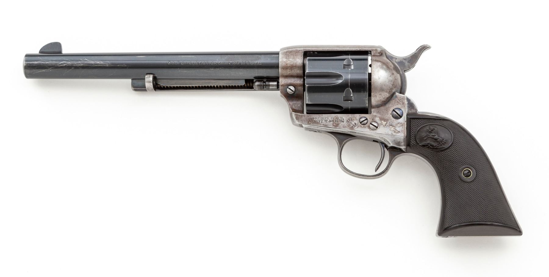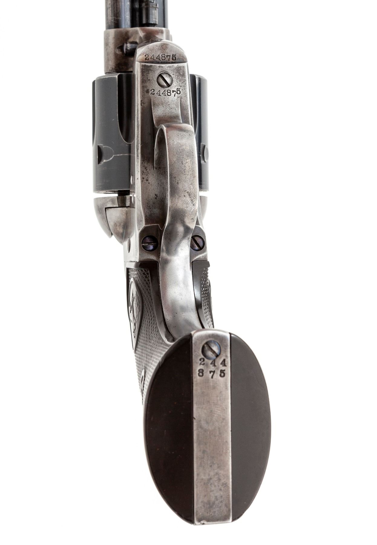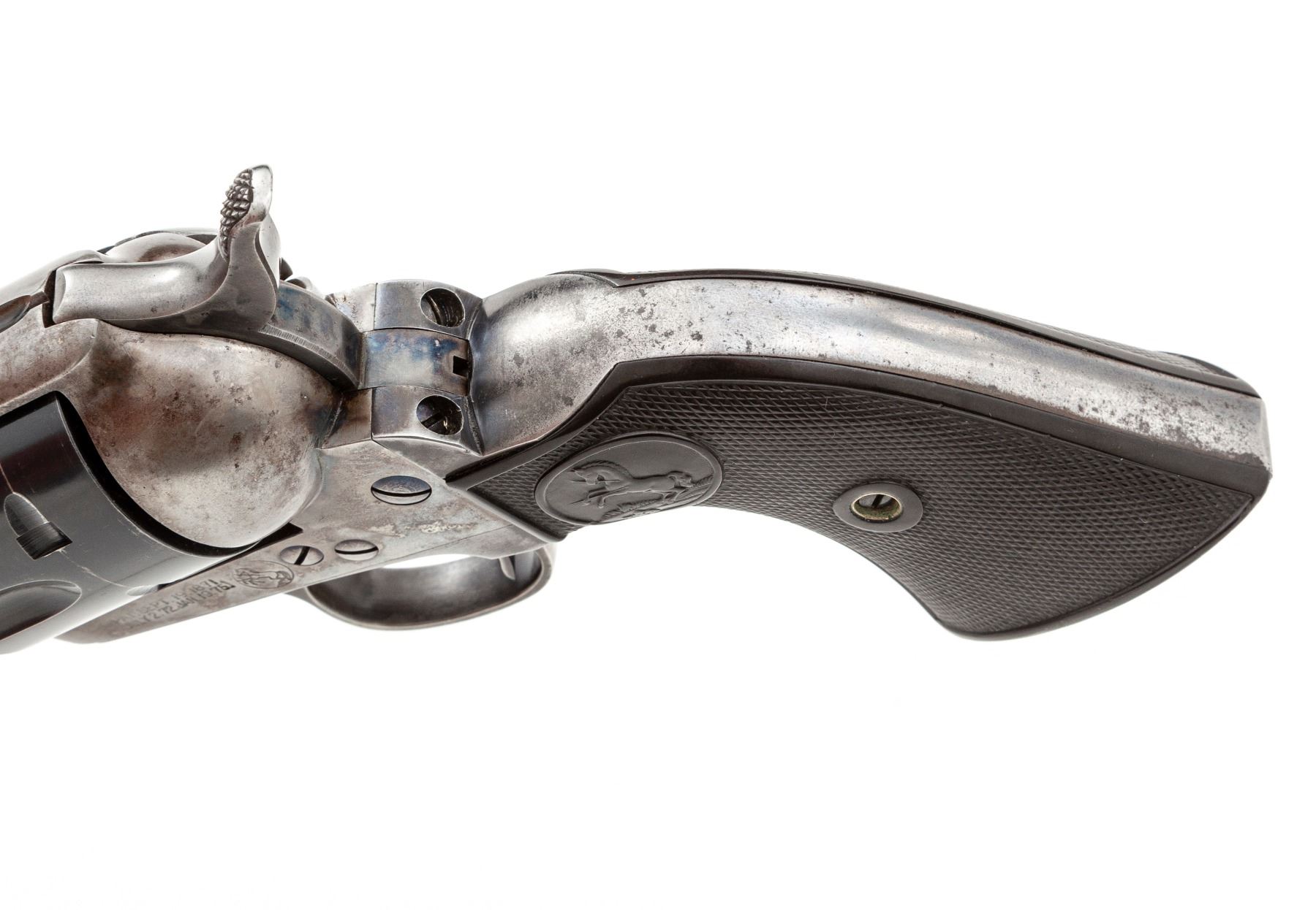 Colt Model 1873 Single Action Army Revolver, #244875, .38 Spec. CF cal., 7.5'' round barrel marked ''Colt's Pt. F.A. Mfg. Co. Hartford CT U.S.A.'' on top in one line, and ''Colt Single Action Army .38 Special'' along left side ahead of juncture with frame; 6-shot fluted cylinder stamped with a tiny ''D'' on its face and the ''Rampant Colt'' logo on rear, case hardened hammer and frame with the two-line ''1871-72-75'' patent dates adjacent to an encircled ''Rampant Colt'' on left side, hinged loading gate correctly batch marked ''6326'', blued steel straps and two-piece black checkered hard rubber grips having the ''Rampant Colt'' in an oval at top. Originally blued and case hardened finishes. Mfg'd 1903. Condition is excellent, retaining 85% factory blue to barrel and cylinder, as possibly later altered to .38 Special with genuine Colt replacement parts; cylinder with a light dragline; 10% original thinning blue to grip straps (mostly in protected areas); case hardening on frame has silvered out, hammer retains more colors. Screw heads retain much original blue with unblemished slots. Grips are very fine showing sharp checkering, only mild wear and a tiny nick at bottom right side. Action is crisp and sure; bore is shiny with deep rifling. A very attractive Single Action Colt. Est.: $2,000-$2,500. (C&R)