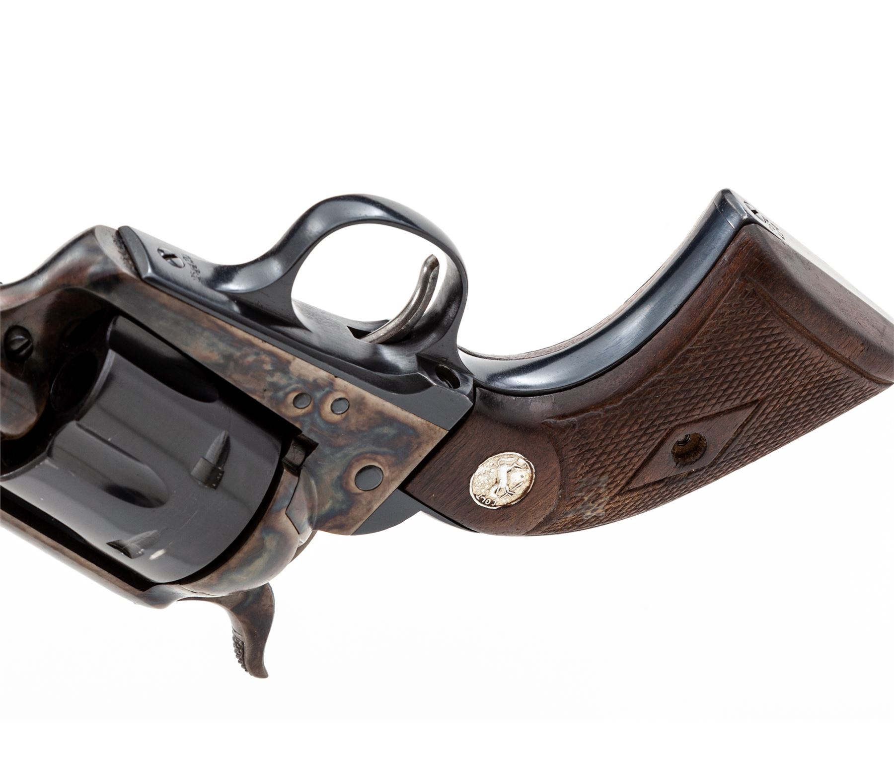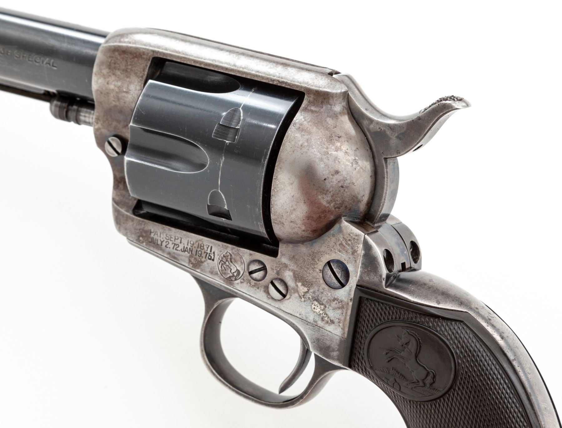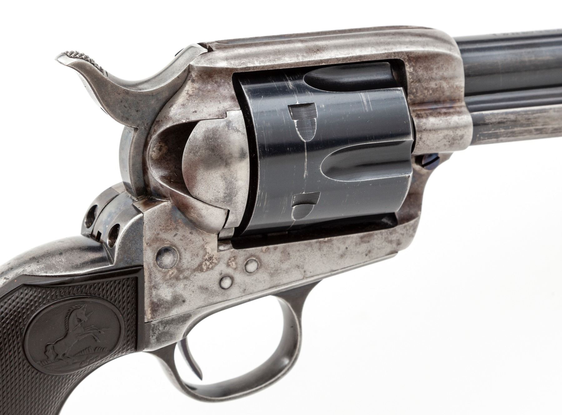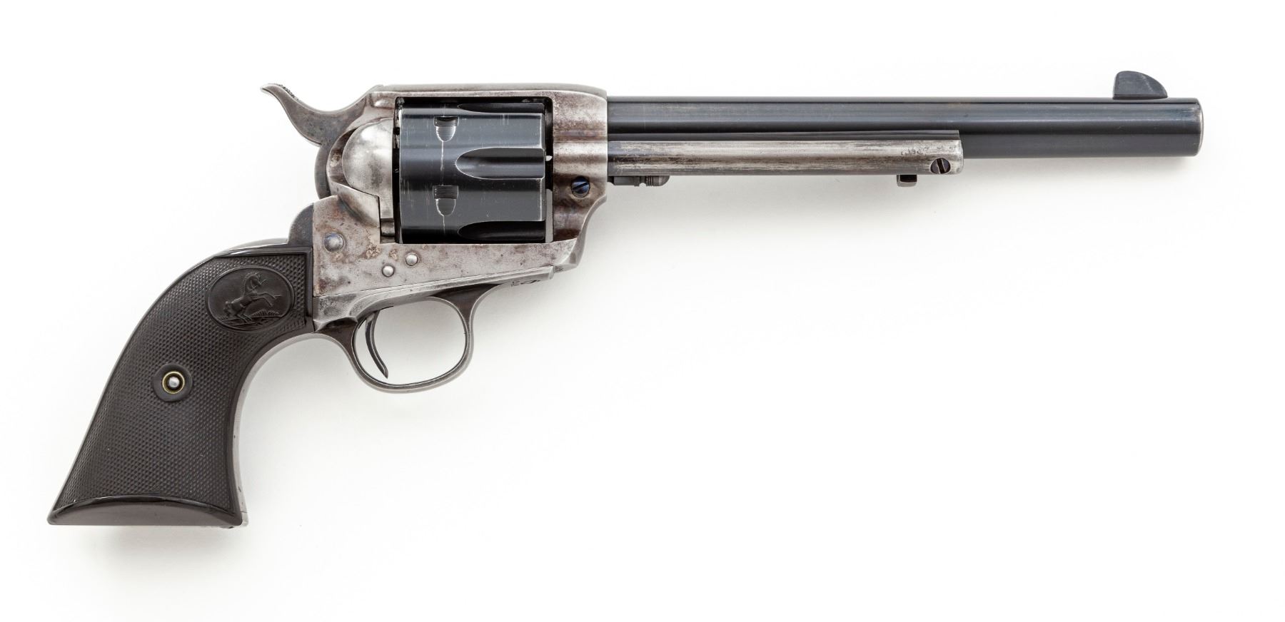 Colt Model 1873 Single Action Army Revolver, #244875, .38 Spec. CF cal., 7.5'' round barrel marked ''Colt's Pt. F.A. Mfg. Co. Hartford CT U.S.A.'' on top in one line, and ''Colt Single Action Army .38 Special'' along left side ahead of juncture with frame; 6-shot fluted cylinder stamped with a tiny ''D'' on its face and the ''Rampant Colt'' logo on rear, case hardened hammer and frame with the two-line ''1871-72-75'' patent dates adjacent to an encircled ''Rampant Colt'' on left side, hinged loading gate correctly batch marked ''6326'', blued steel straps and two-piece black checkered hard rubber grips having the ''Rampant Colt'' in an oval at top. Originally blued and case hardened finishes. Mfg'd 1903. Condition is excellent, retaining 85% factory blue to barrel and cylinder, as possibly later altered to .38 Special with genuine Colt replacement parts; cylinder with a light dragline; 10% original thinning blue to grip straps (mostly in protected areas); case hardening on frame has silvered out, hammer retains more colors. Screw heads retain much original blue with unblemished slots. Grips are very fine showing sharp checkering, only mild wear and a tiny nick at bottom right side. Action is crisp and sure; bore is shiny with deep rifling. A very attractive Single Action Colt. Est.: $2,000-$2,500. (C&R)