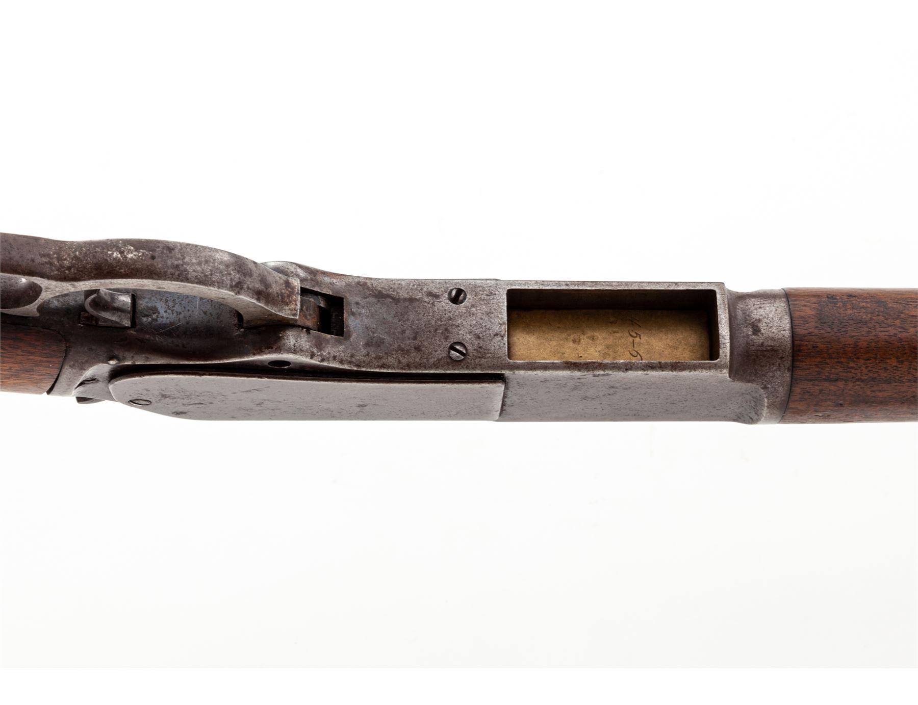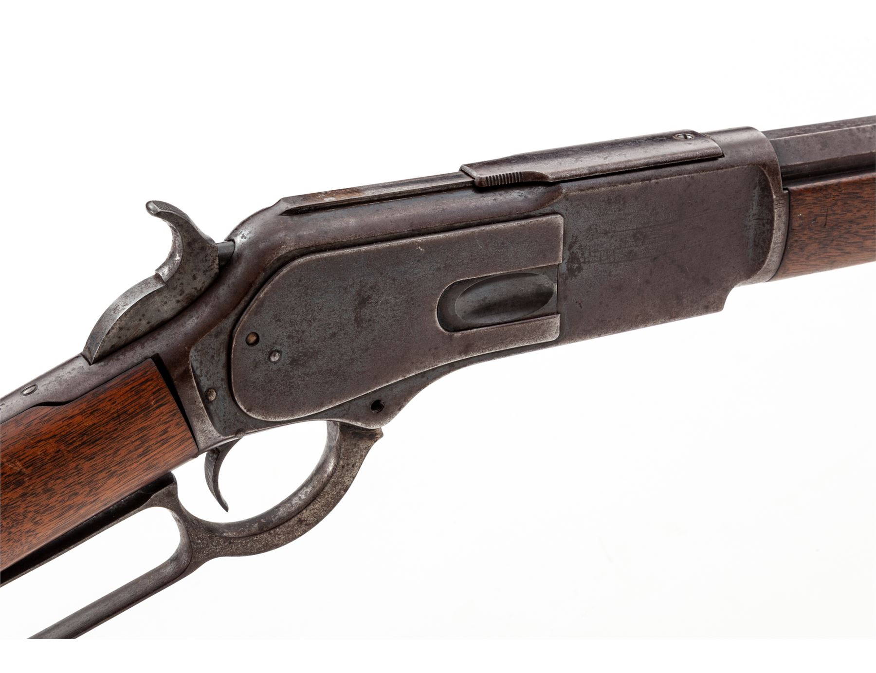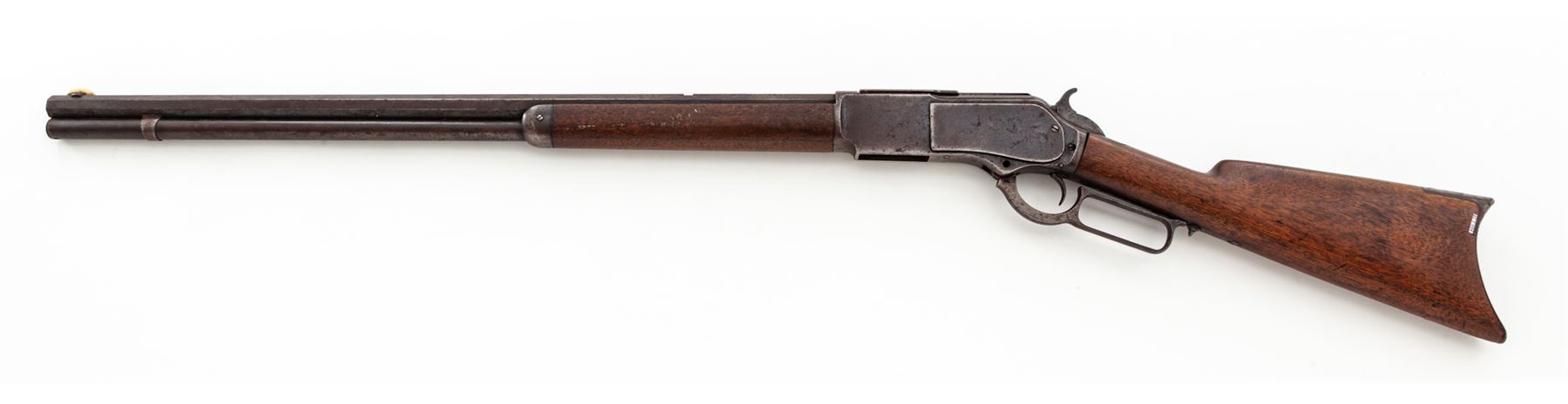 Antique Winchester Model 1876 Late 2nd Type Lever Action Rifle, #30636, .45-60 CF cal., 28'' octagonal barrel with dovetailed long ivory blade front sight and vacant dovetail for a leaf rear sight marked on top flat ''Winchester's-Repeating-Arms, New Haven, CT./King's-Improvement-Patented-March 29, 1856, October 16, 1860.'' in two lines, full-length tubular under-barrel magazine, steel receiver and furniture including sliding dustcover, nosecap, loop operating lever, hammer, trigger and crescent buttplate, with sliding trapdoor for cleaning rod (not present), walnut forend and buttstock. Mfg'd 1876-97. Originally with blued barrel, magazine tube, receiver, dustcover, sideplates and buttplate, case hardened lever and hammer, and oil-stained stocks. Condition is very good, the barrel and magazine tube retaining approx. 40% original blue mixing with age brown and occasional roughness (buttplate with some rust), and silvered/darkened case hardening. Stocks show light dings from use but are smooth and solid. Rear barrel sight is missing. Action does not function correctly (missing lever screw), bore is very dark and dirty with shallow rifling. Est.: $1,250-$1,750. (Antique)