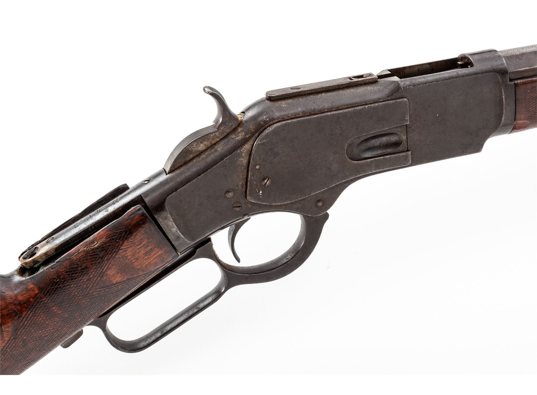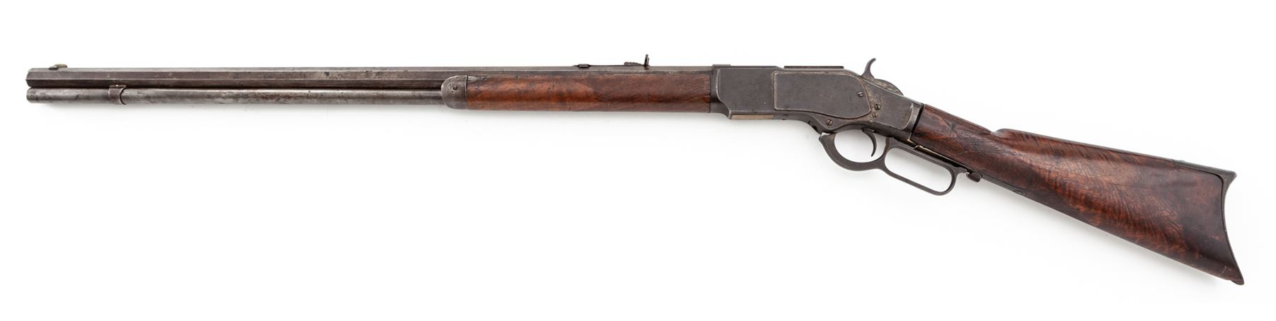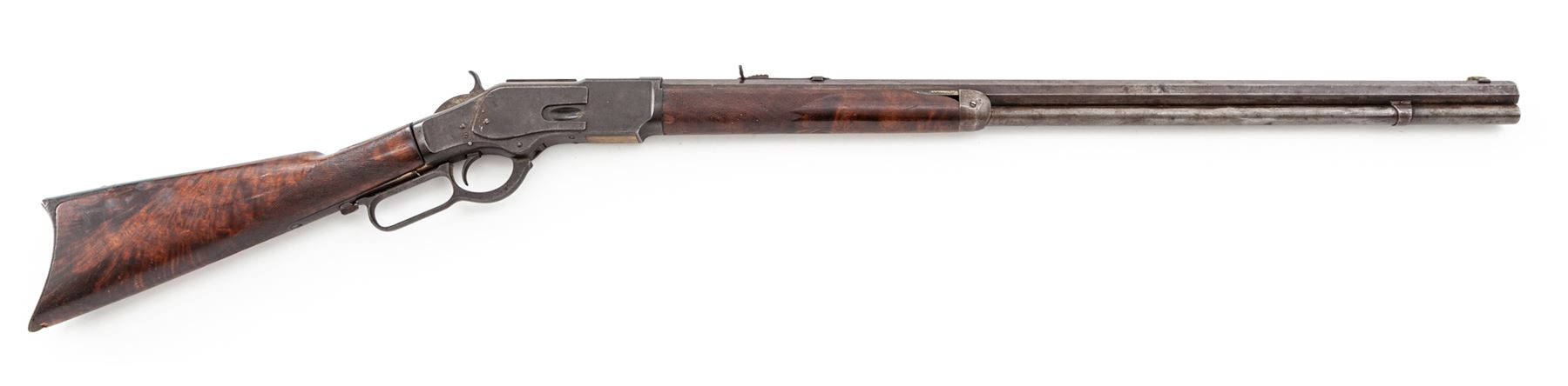 Deluxe Winchester Model 1873 Lever Action Rifle, #62009, .44-40 cal., 28'' octagonal barrel, blue finish, case hardened frame, 2X checkered straight stock, standard crescent steel buttplate with trap for rod. Top of barrel is spuriously marked ''One of One Thousand''. Cody Firearms Information Sheet states shipped from the warehouse on Nov. 27, 1880, Order number 23138. Condition is good as modified. Barrel and mag tube retain approx. 10%-20% thinning blue finish. Front sight has been replaced with a brass blade. Case hardened frame with sharp edges, with case colors in protected areas near sideplate. Stock and forend show nice figure, loss at heel of buttplate. Buttstock with moderate to heavy flattening of checks, crack to left side near upper tang. Forend with 1.5'' loss to right side and 5/8'' loss to left side at cap; dustcover is missing as well. Lower tang has cracked and been repaired once, and has since cracked again slightly affecting hammer action. Bore is very good with just light pitting but well defined lands and grooves. Est.: $2,000-$3,000. (Antique)