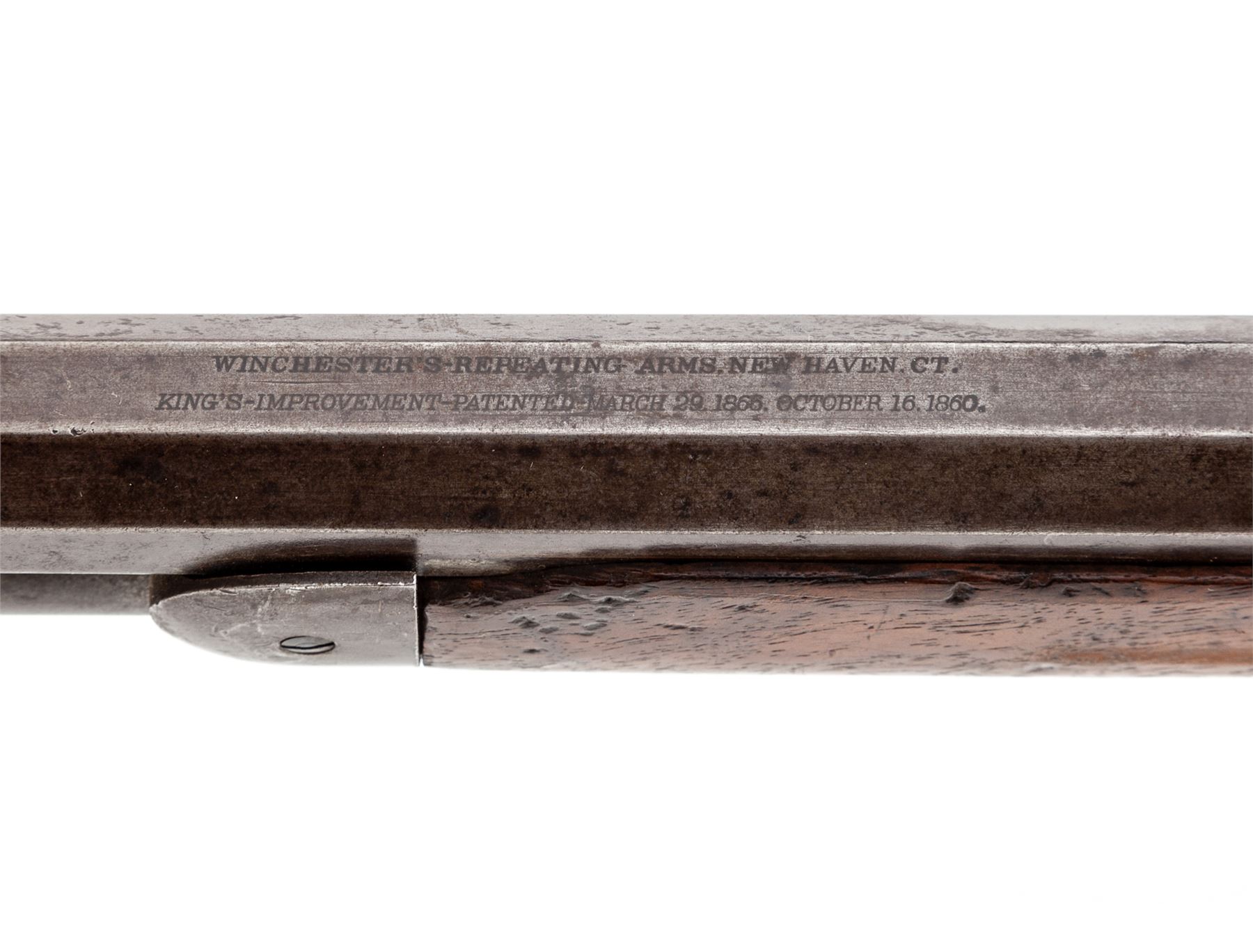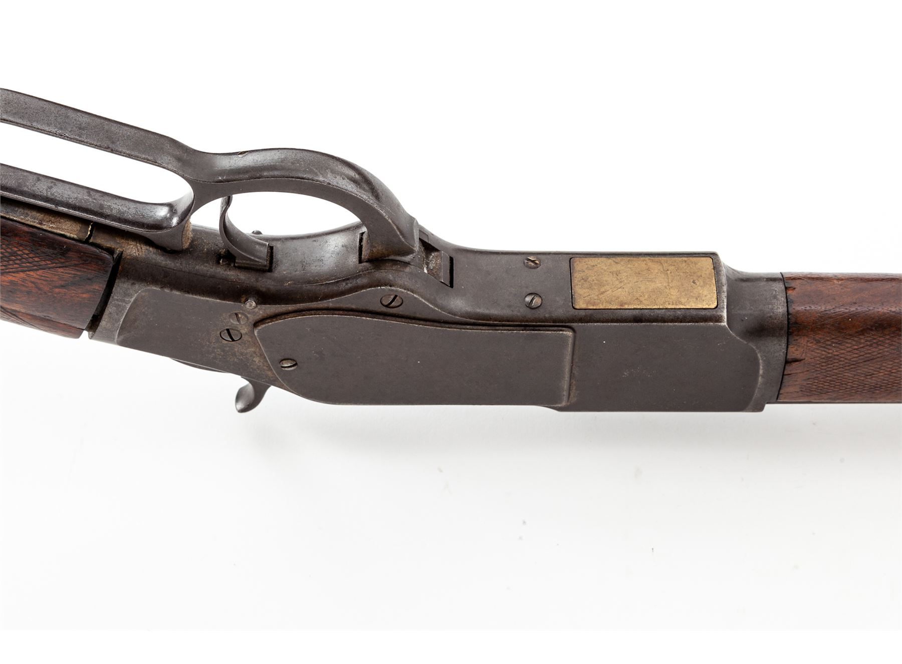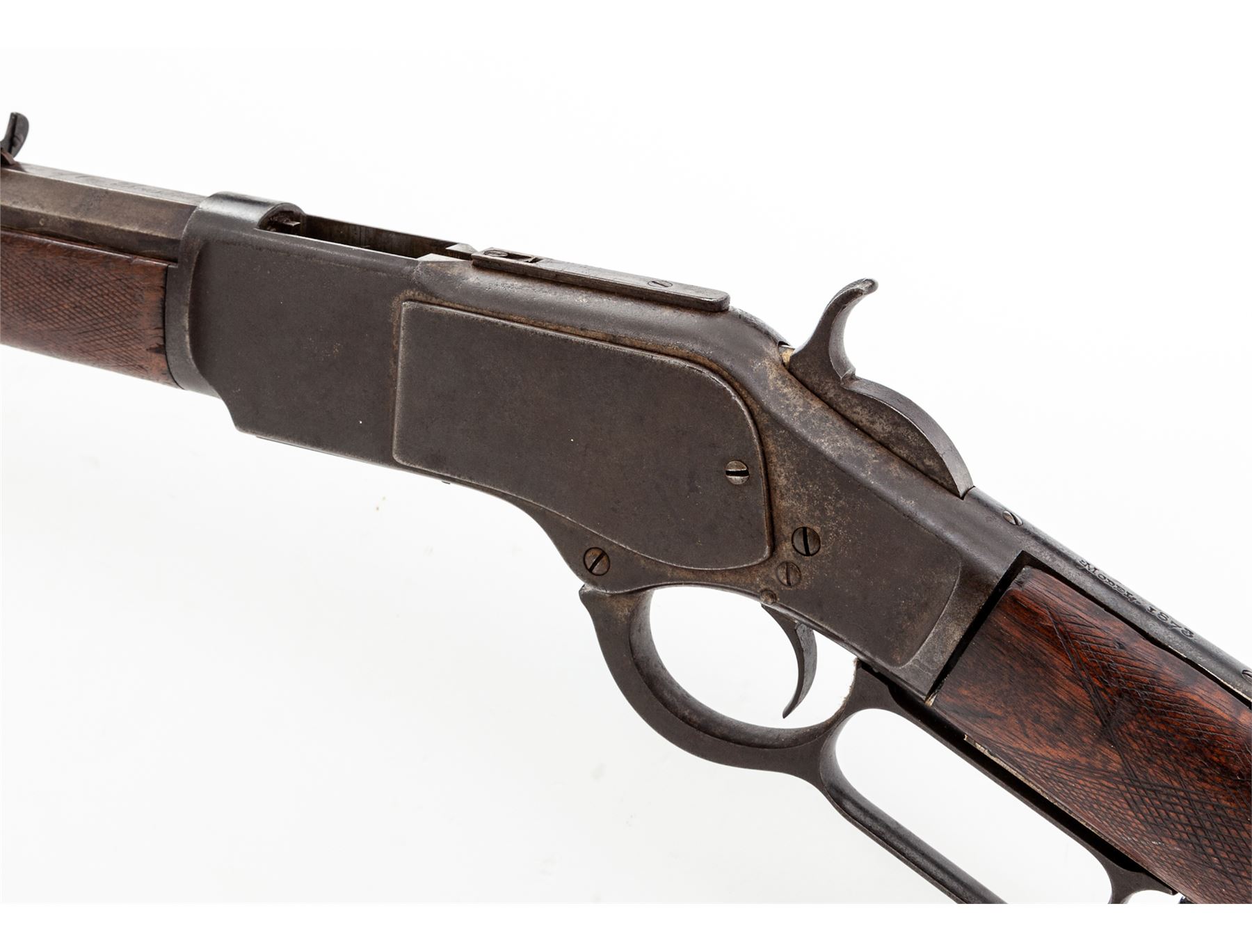 Deluxe Winchester Model 1873 Lever Action Rifle, #62009, .44-40 cal., 28'' octagonal barrel, blue finish, case hardened frame, 2X checkered straight stock, standard crescent steel buttplate with trap for rod. Top of barrel is spuriously marked ''One of One Thousand''. Cody Firearms Information Sheet states shipped from the warehouse on Nov. 27, 1880, Order number 23138. Condition is good as modified. Barrel and mag tube retain approx. 10%-20% thinning blue finish. Front sight has been replaced with a brass blade. Case hardened frame with sharp edges, with case colors in protected areas near sideplate. Stock and forend show nice figure, loss at heel of buttplate. Buttstock with moderate to heavy flattening of checks, crack to left side near upper tang. Forend with 1.5'' loss to right side and 5/8'' loss to left side at cap; dustcover is missing as well. Lower tang has cracked and been repaired once, and has since cracked again slightly affecting hammer action. Bore is very good with just light pitting but well defined lands and grooves. Est.: $2,000-$3,000. (Antique)