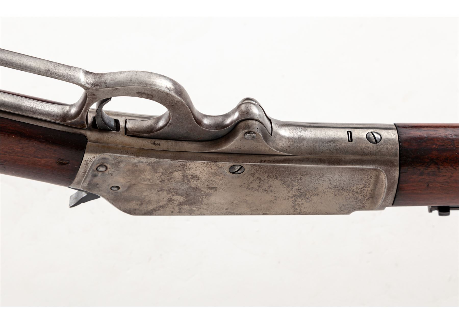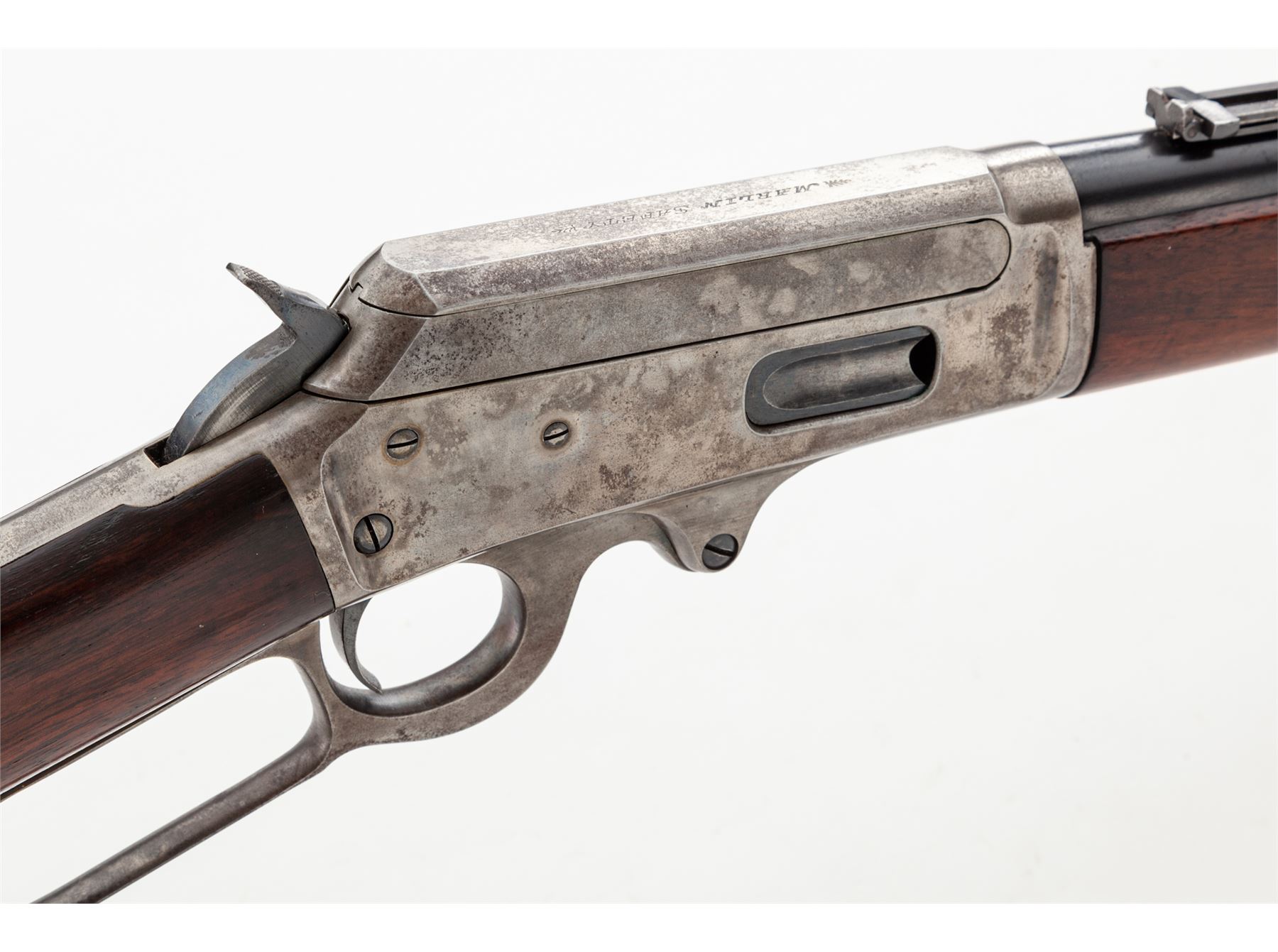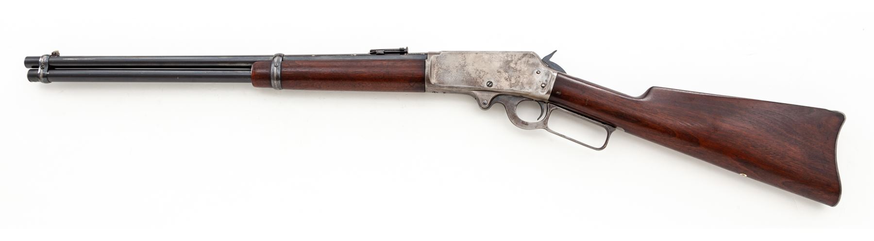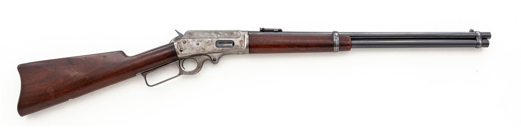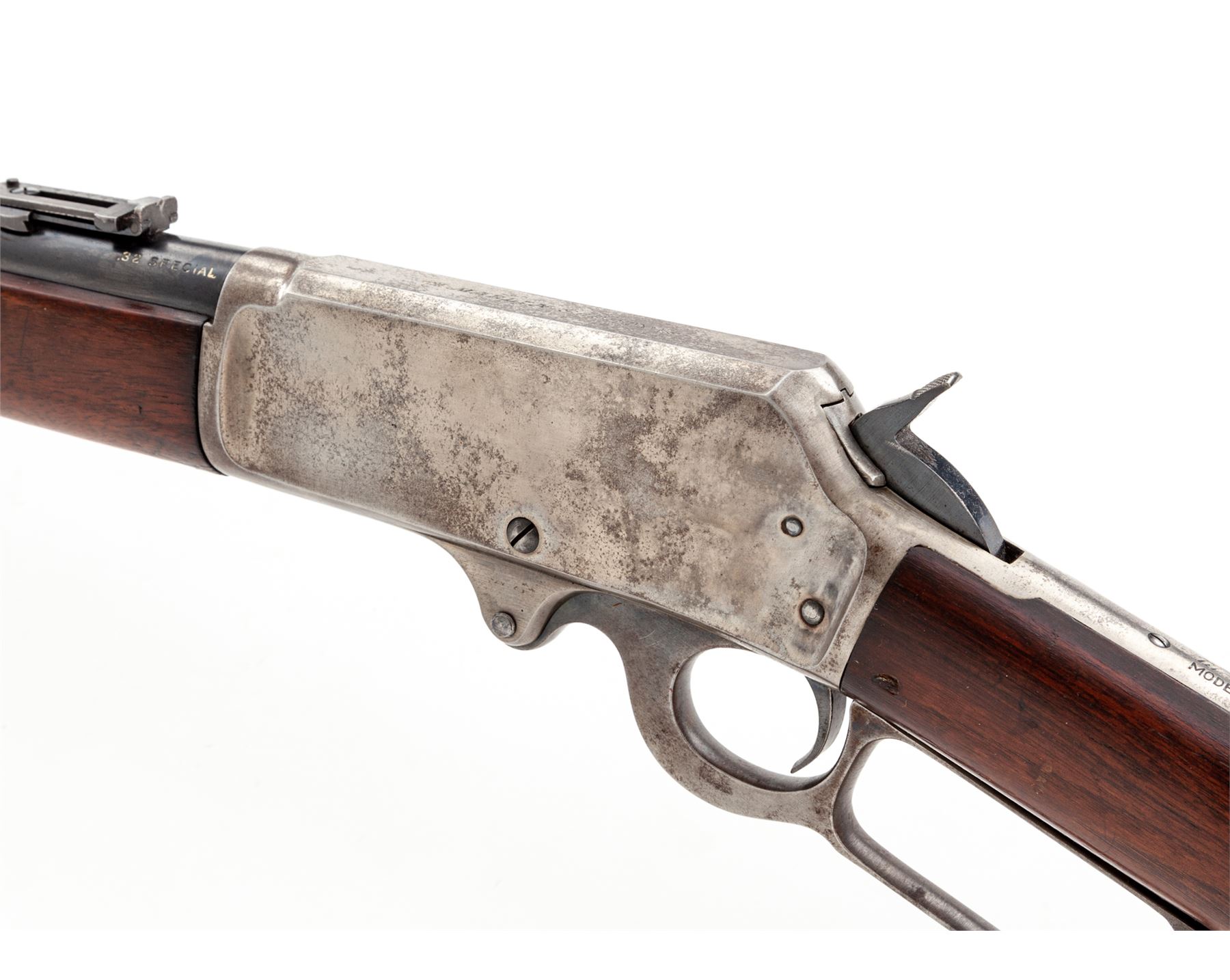 Marlin Model 93 Lever Action Repeating Carbine, #5327C, .32 Spec. CF cal., blued 20'' round barrel with dovetailed block-blade front and adjustable leaf rear sights marked on top between lower barrel band and rear sight, ''The Marlin Firearms Corporation/New Haven, Conn. U.S.A. - Patented'' in two lines over ''Special Smokeless Steel'' flanked by diamonds, and ''.32 Special'' at juncture with case hardened steel receiver, which is marked on top ''Marlin Safety'', and on top tang ''Marlin/Model 93'' in two lines and serial number on lower tang; blued full-length under-barrel magazine tube, two barrel bands and carbine buttplate; varnished walnut forend and buttstock. Mfg'd post-1919. Condition is fine, the barrel, magazine tube and bands retaining 95% deep original blue, dulling somewhat on magazine, the receiver silvered out, the operating lever with color at hinge area, approx. 99% blue on hammer and trigger, the buttplate with much blue at top tang and the balance gunmetal gray. Stocks are smooth and sound with light handling marks. Action is strong; bore is brilliant with sharp rifling. Est.: $750-$1,000. (C&R)