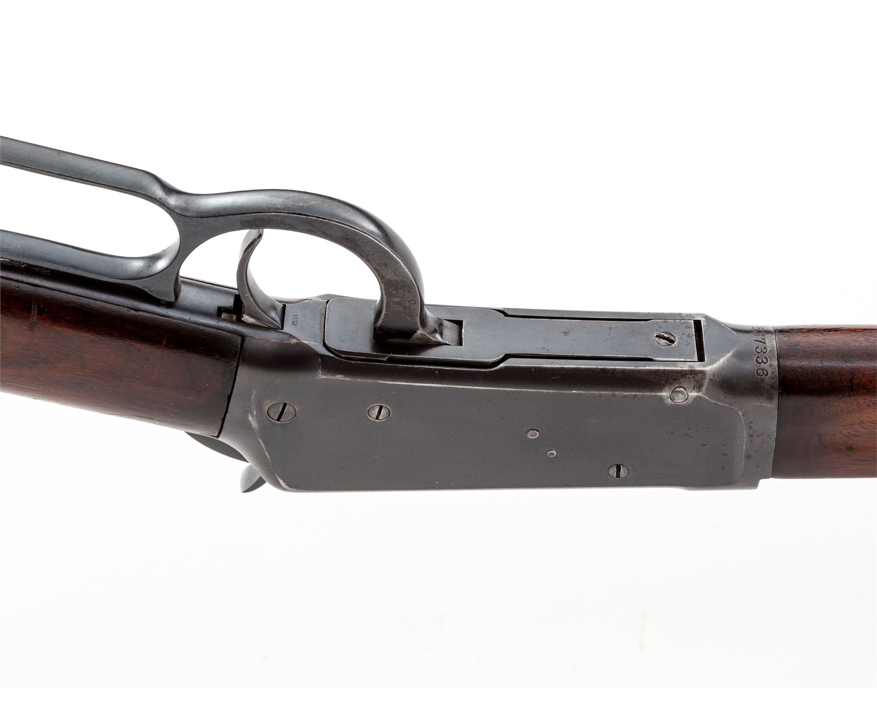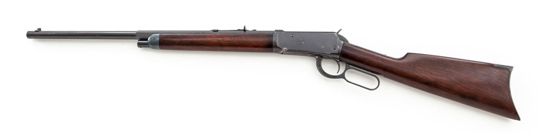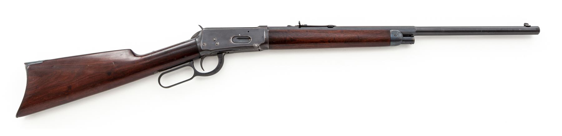 Special Order Winchester Model 1894 Lever Action Rifle, #537336, .25-35 cal., 22'' half-round barrel, blue finish, walnut stock and forend, with crescent steel buttplate. Rifle additionally features half magazine and bright bead front sight. Mfg'd 1910. Condition is near excellent retaining approx. 92% of a nice refinish. Upper tang screw is a non-factory replacement, and forend cap has been refinished. Stock with mild pressure dings and some oil darkening. Good action, bore is fair. Est.: $600-$800. (C&R)