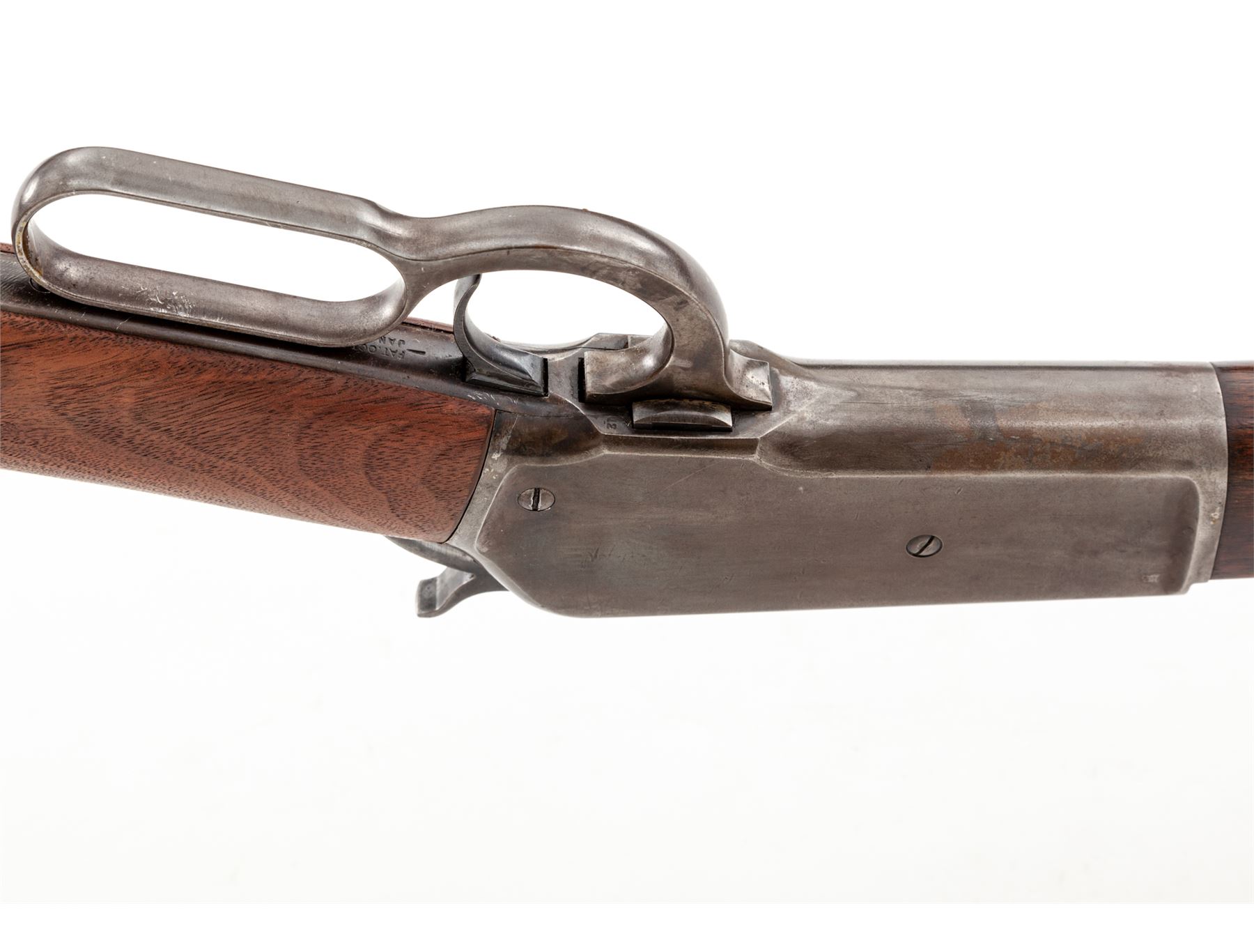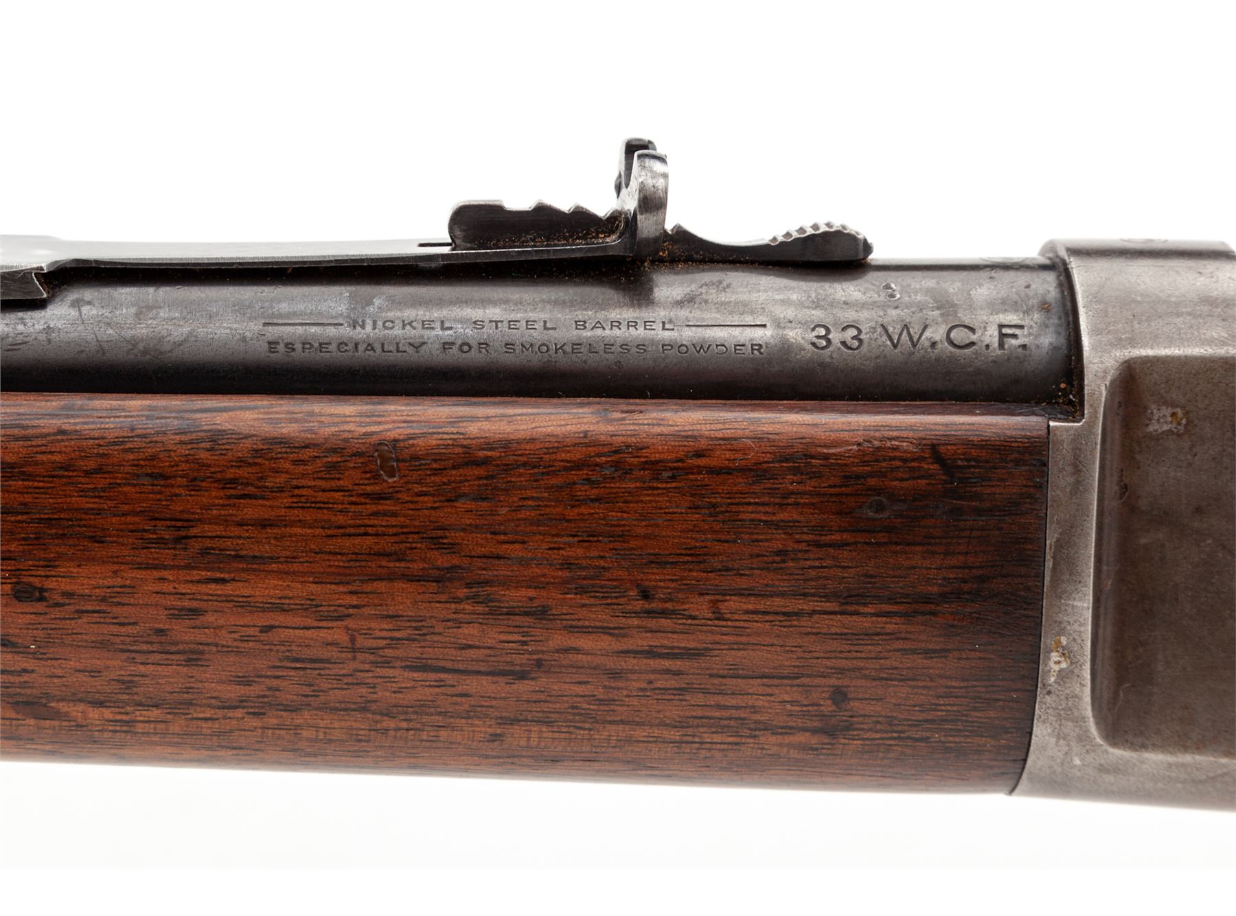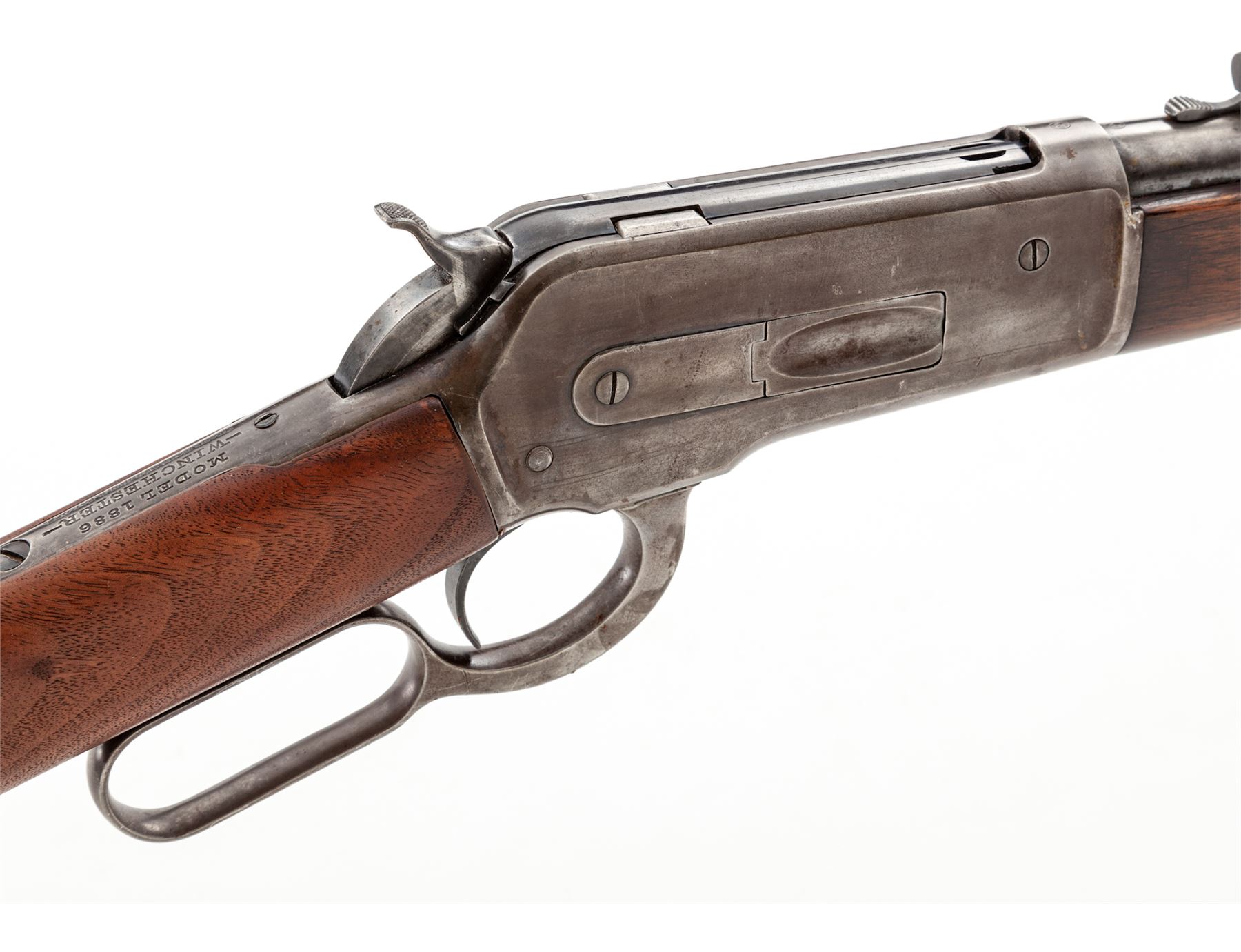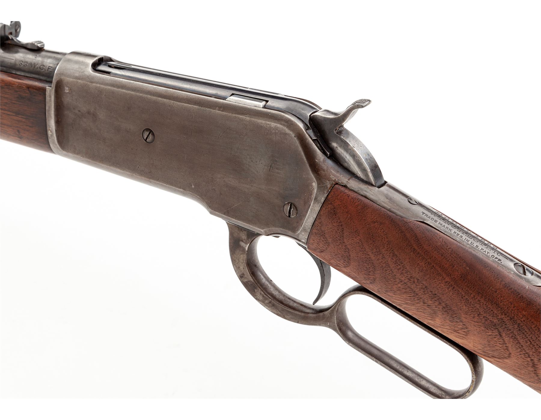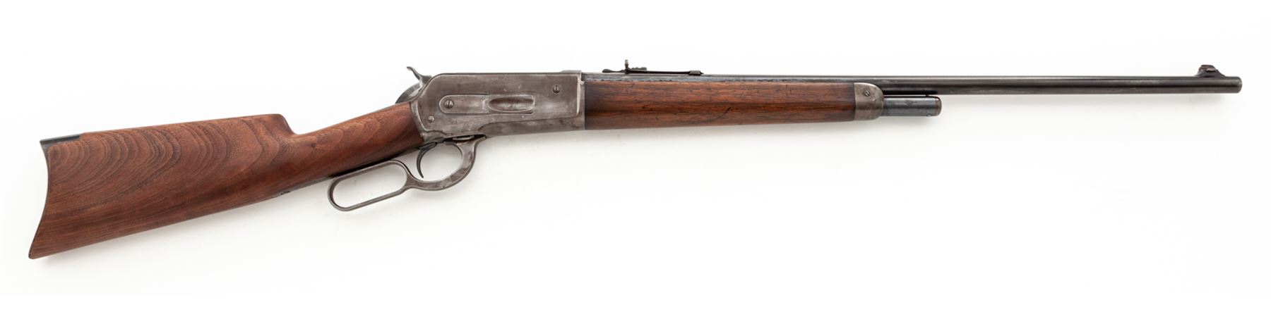 Winchester Model 1886 Lightweight Lever Action Repeating Rifle, #151640, .33 WCF cal., 24'' blued tapered round barrel with integral block-blade front and adjustable buckhorn sporting rear sights is marked on left side ''Manufactured by the Winchester Repeating Arms Co./New Haven, Conn. U.S.A. Pat. Oct. 14, 1884 Jan. 20, 1885'' in two lines, ''-Nickel Steel Barrel-/Especially for Smokeless Powder'' in two lines, and ''33 W.C.F.'' and an oval Winchester proofmark just ahead of juncture with blued steel receiver, which has an adjacent matching proofmark and marked ''Model 1886/-Winchester/Trademark Reg. in U.S. Pat. Off.'' on top tang and the serial number on lower tang; blued sliding bolt; blued tubular half-magazine; blued steel nosecap and crescent buttplate on oil-stained walnut forend and buttstock. Mfg'd 1912. Condition is fine, the barrel and magazine tube retaining 85% smooth original blue; the receiver retaining 20% blue mixed with smooth brown age patina; the nosecap retains much toned blue; the hammer and operating lever with 20% silvered case coloring. Forestock is smooth and sound showing straight grain and nice color, buttstock (and possibly buttplate) a modern replacement. Action is smooth; bore is moderately etched and clean with pronounced rifling. The '86 was one of Teddy Roosevelt's favorite rifles. Est.: $1,500-$2,500. (C&R)