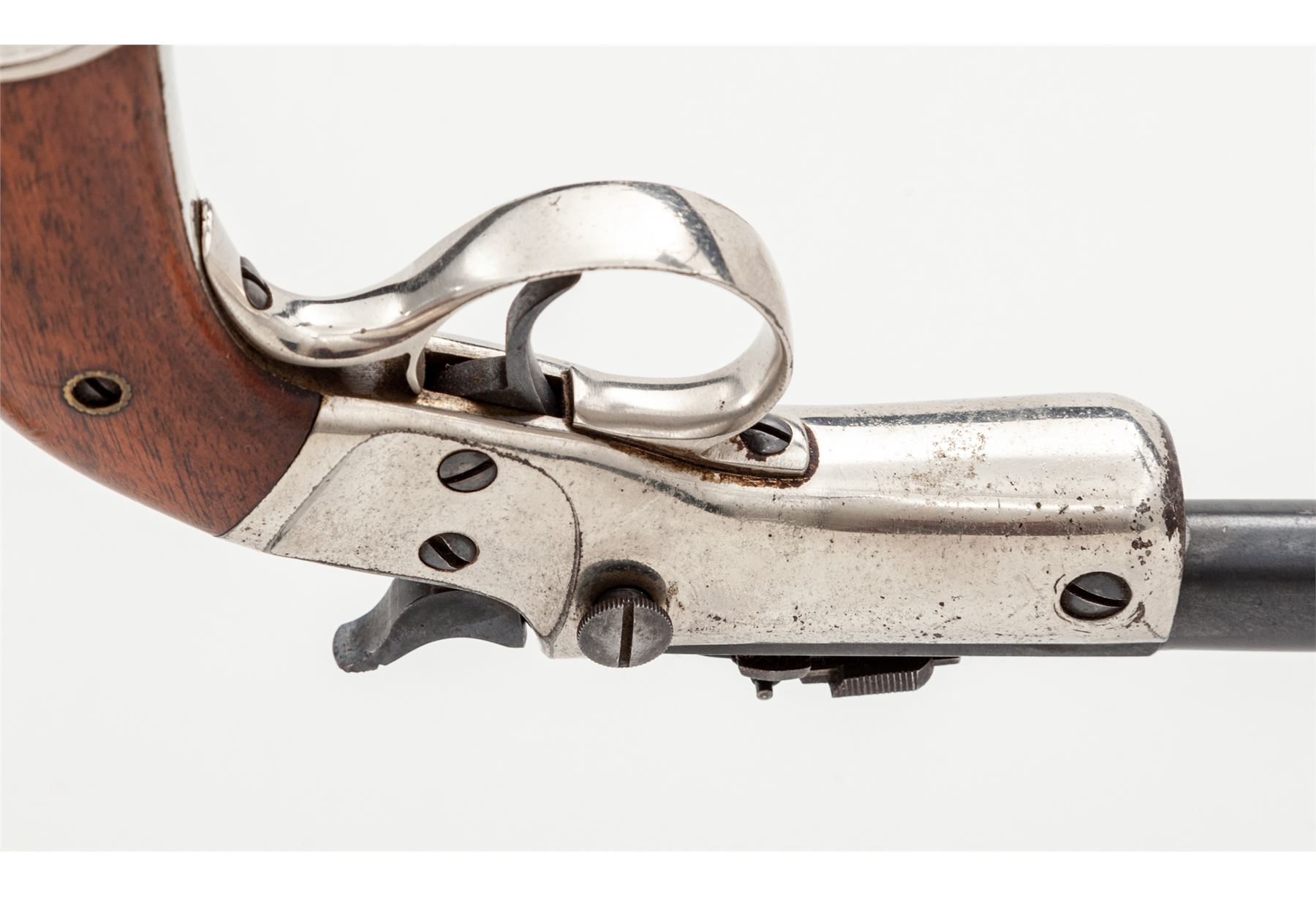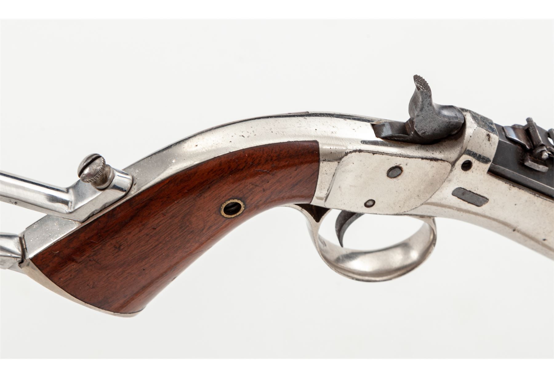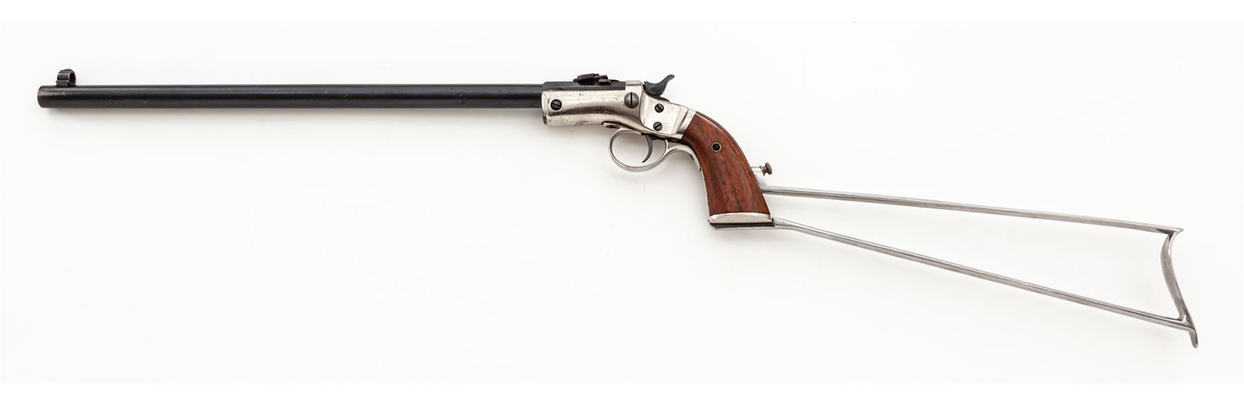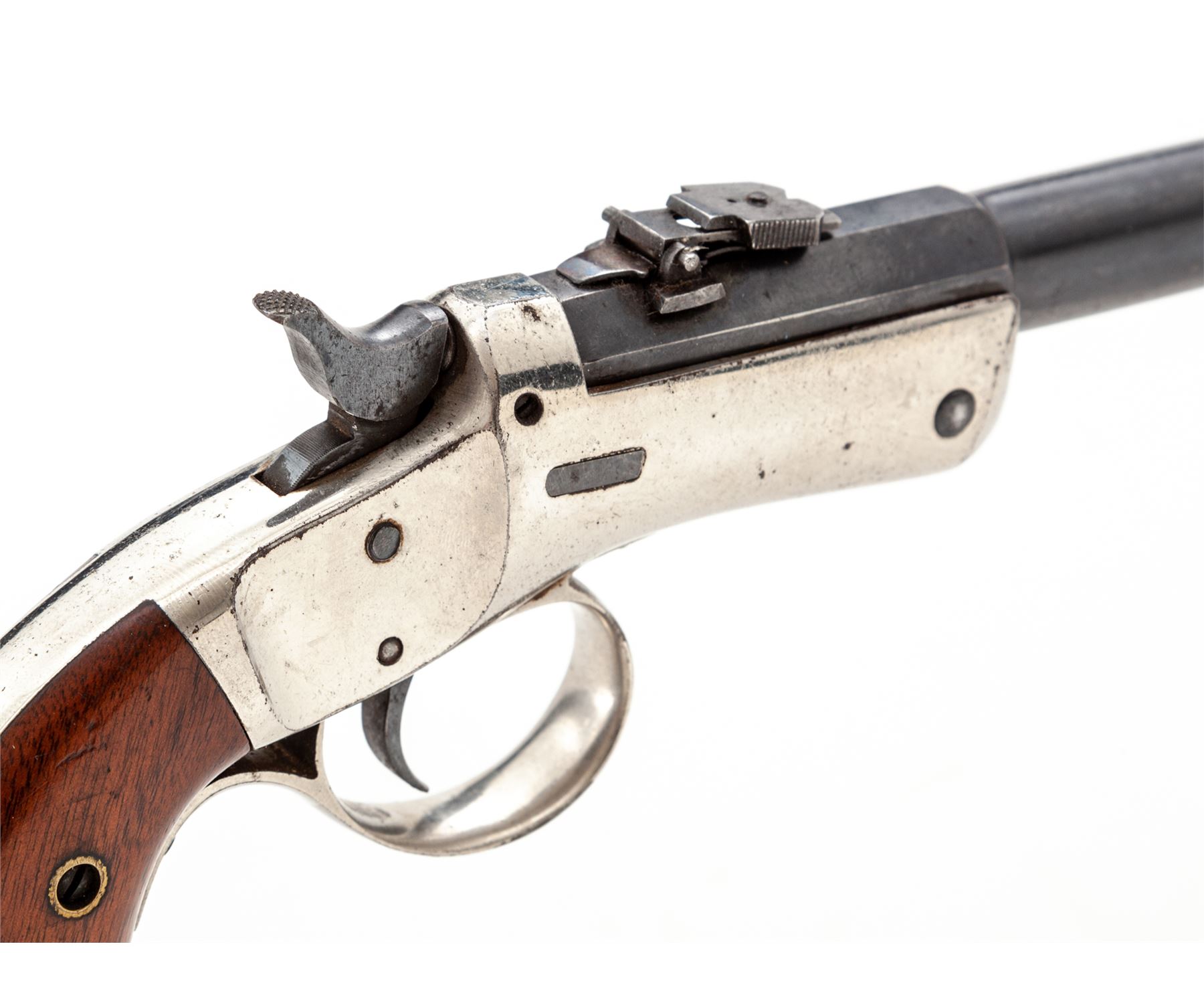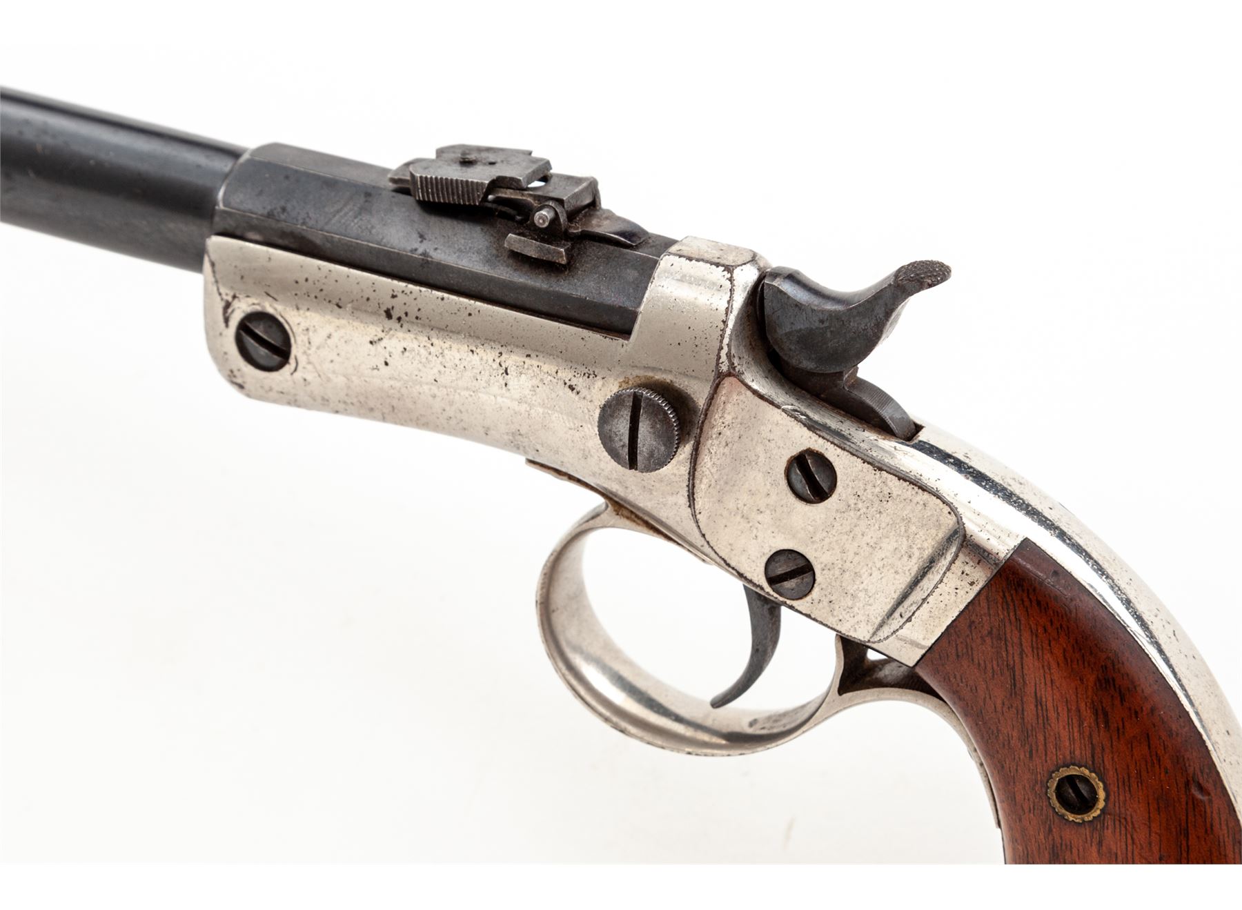 Stevens New Model Second Issue Single-Shot Tip-Up Pocket Rifle, with detachable shoulder stock, #21829, .32 Long CF cal., blued 15'' part round-part octagon barrel with hooded Beach-type front and adjustable folding leaf rear sights, and automatic cartridge extractor, marked only ''32/21829'' at left breech; nickel-plated steel receiver with knurled button-type barrel release screw, integral grip straps, loop triggerguard, and matching nickel-plated skeleton-type detachable shoulder stock; two-piece varnished walnut grips. Mfg'd 1875-1896. Condition is excellent, the barrel retaining approx. 95% dulling blue, the receiver 95% nickel with minor scattered puckering, the triggerguard, gripstraps and stock with smooth, bright nickel. Grips fit well with minor light handling marks and nice color. Action is smooth; bore is bright with defined rifling. Est.: $750-$1,250. (Antique)