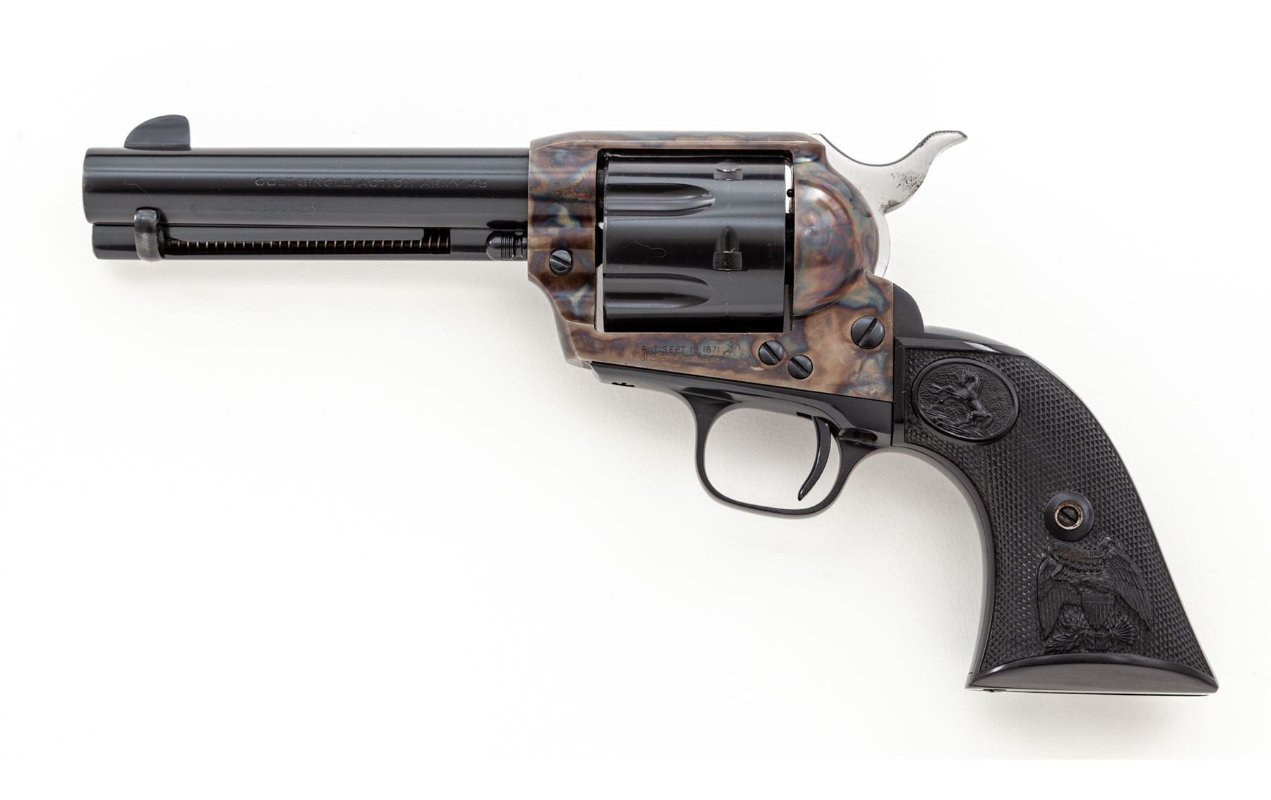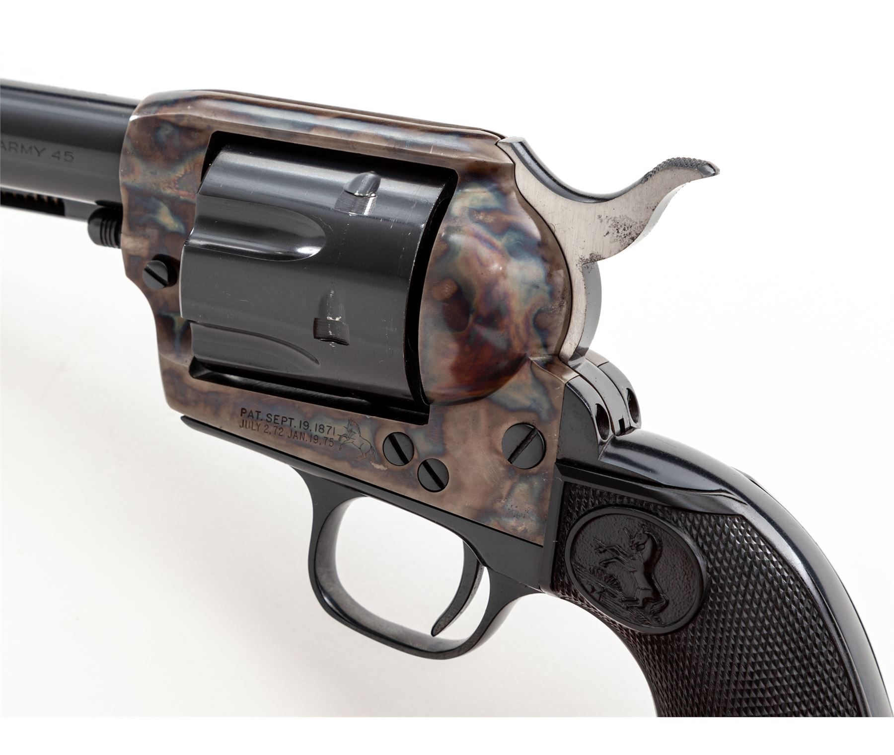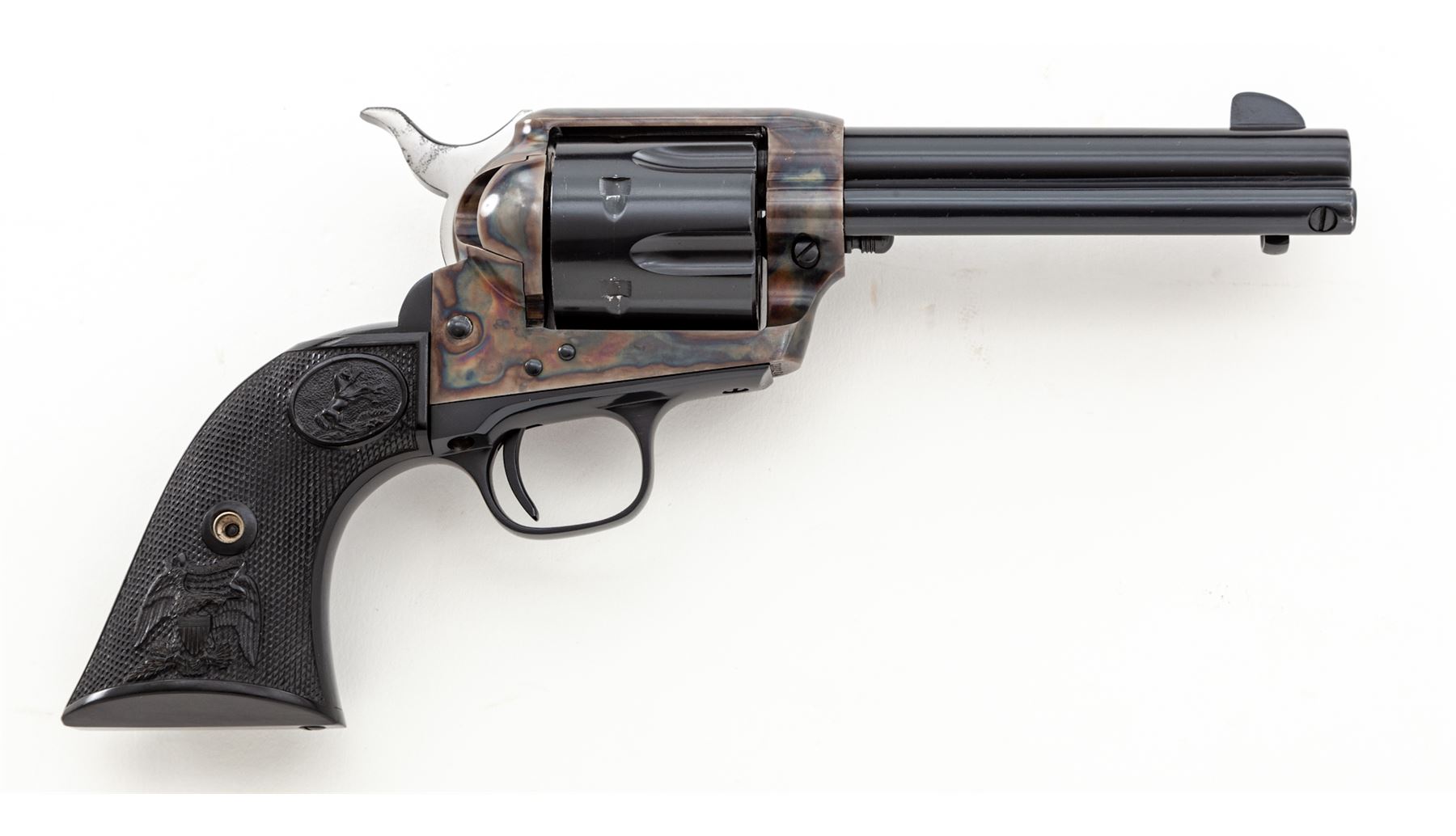 Very Nice First Year 2nd Generation Colt Single Action Army Revolver, #1902SA, .45 Long Colt cal., 4.75'' barrel, blue finish, very nice case hardened frame, factory checkered black plastic grips with ''Eagle'' and ''Rampant Colt'', standard fixed sights. Top of barrel marked ''COLT'S PT. F.A. MFG. CO. HARTFORD CT. U.S.A.''; left side of frame with two-line patent dates and ''Rampant Colt''. Mfg'd 1956. Included is a 3rd Gen. SAA owner's manual. Condition is excellent retaining approx. 98% factory blue and color case hardened finish. Cylinder with a light and thin index line as well as some micro-scratching from being turned. Grips appear as new. Both sides of the hammer spur with a little dark spotting. Excellent bright bore. Overall a high condition early 2nd Gen. revolver. Est.: $2,000-$2,800. (C&R/PPT)