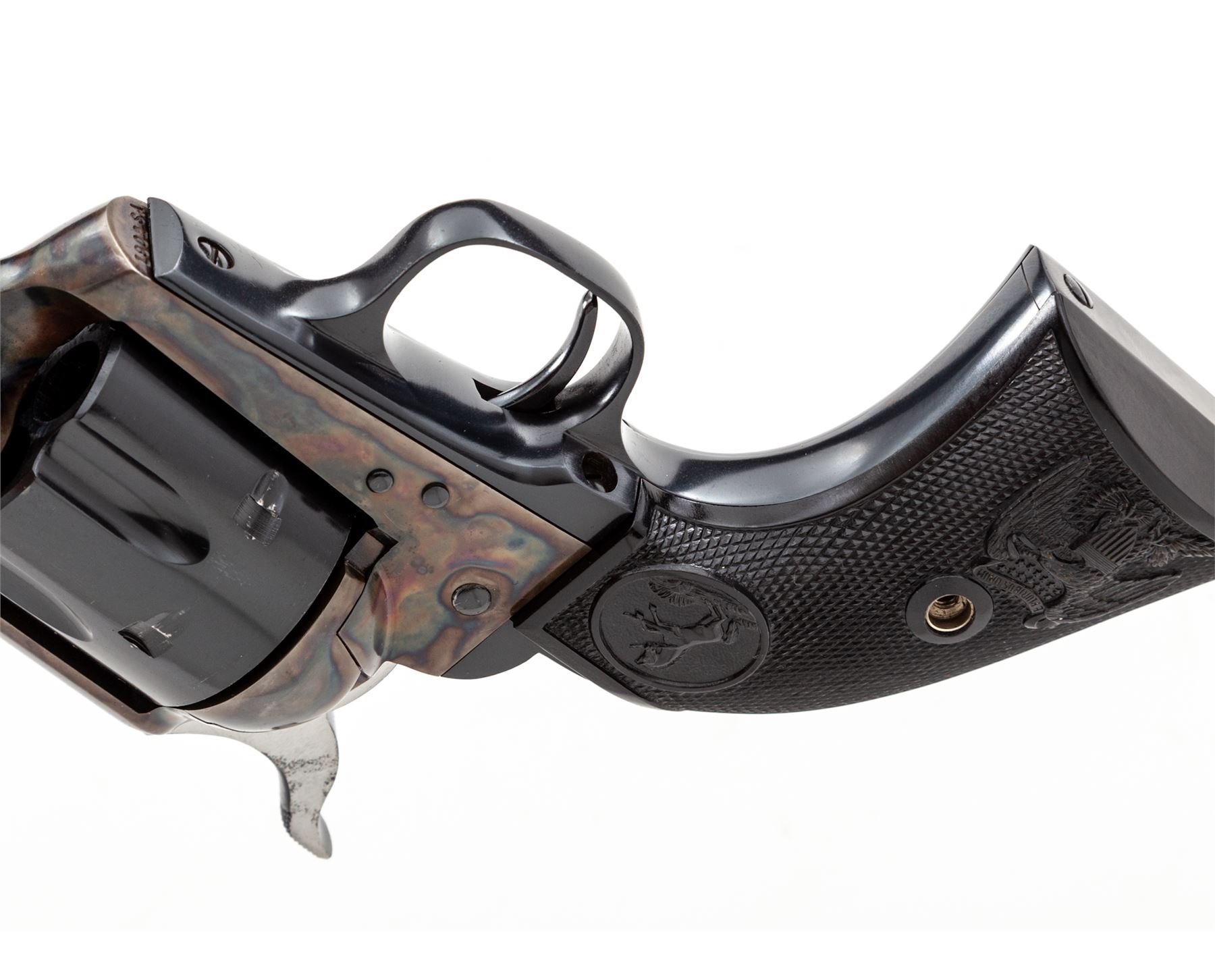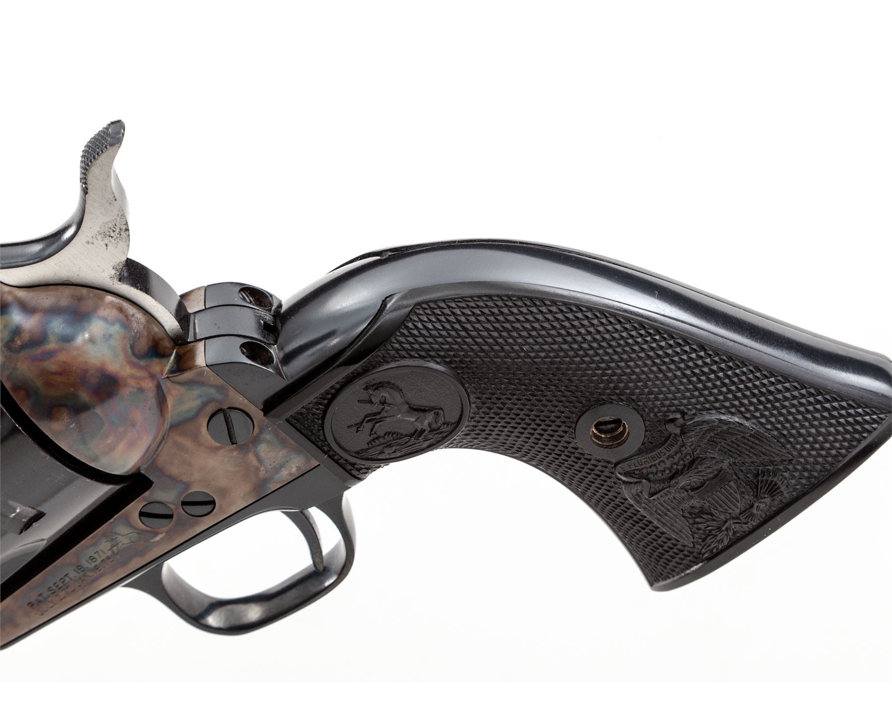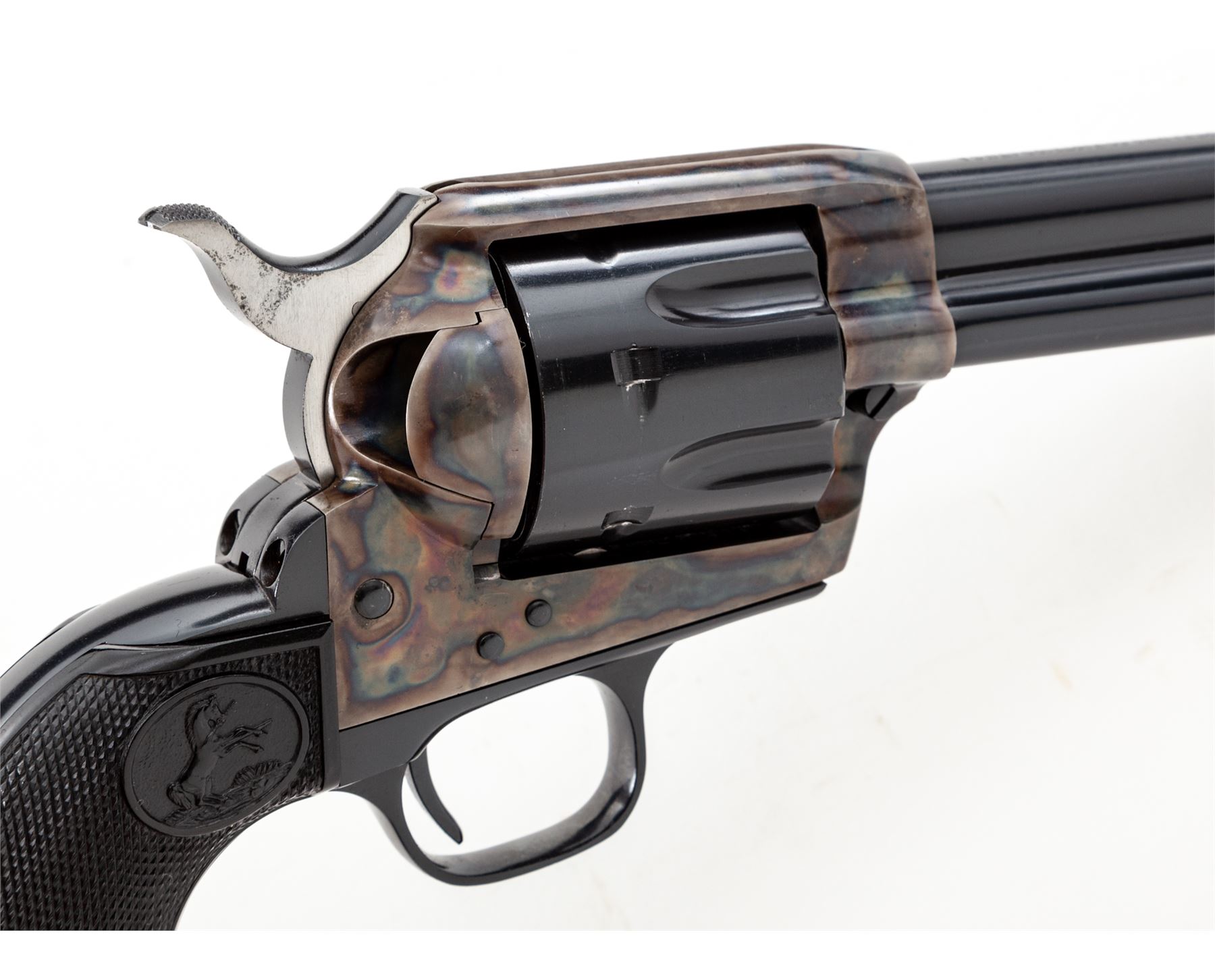 Very Nice First Year 2nd Generation Colt Single Action Army Revolver, #1902SA, .45 Long Colt cal., 4.75'' barrel, blue finish, very nice case hardened frame, factory checkered black plastic grips with ''Eagle'' and ''Rampant Colt'', standard fixed sights. Top of barrel marked ''COLT'S PT. F.A. MFG. CO. HARTFORD CT. U.S.A.''; left side of frame with two-line patent dates and ''Rampant Colt''. Mfg'd 1956. Included is a 3rd Gen. SAA owner's manual. Condition is excellent retaining approx. 98% factory blue and color case hardened finish. Cylinder with a light and thin index line as well as some micro-scratching from being turned. Grips appear as new. Both sides of the hammer spur with a little dark spotting. Excellent bright bore. Overall a high condition early 2nd Gen. revolver. Est.: $2,000-$2,800. (C&R/PPT)