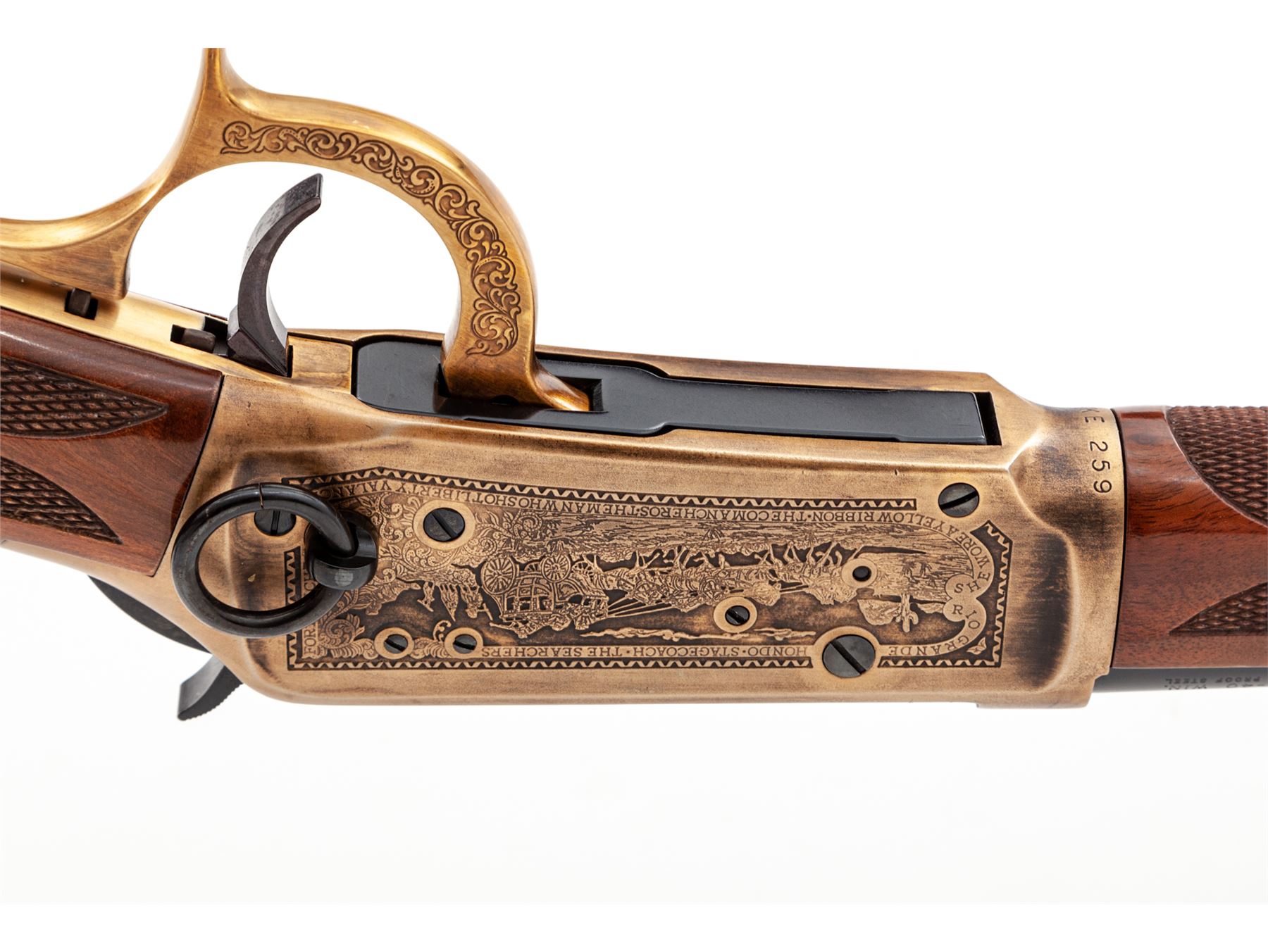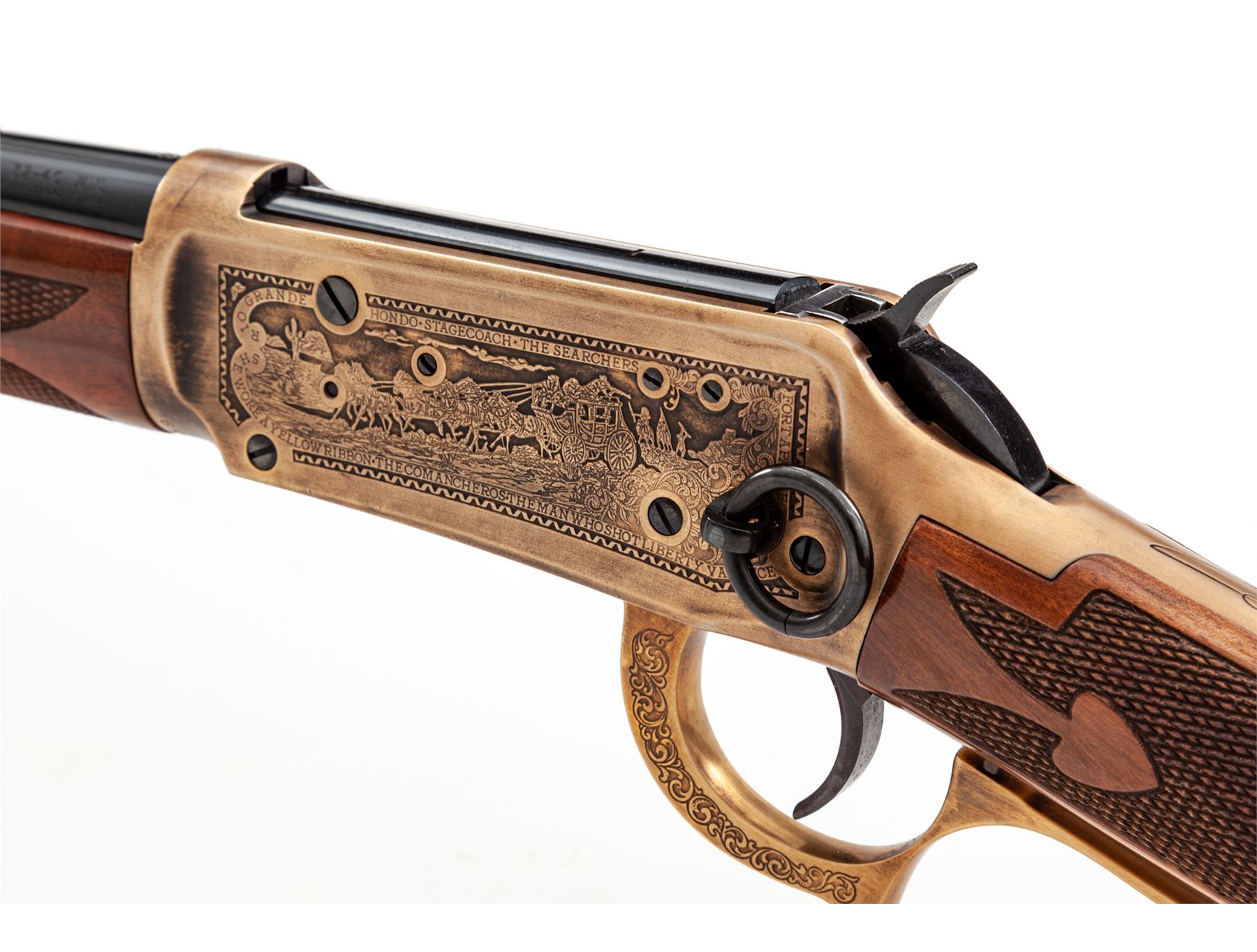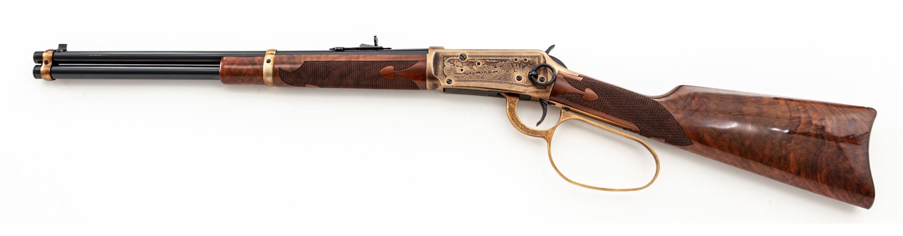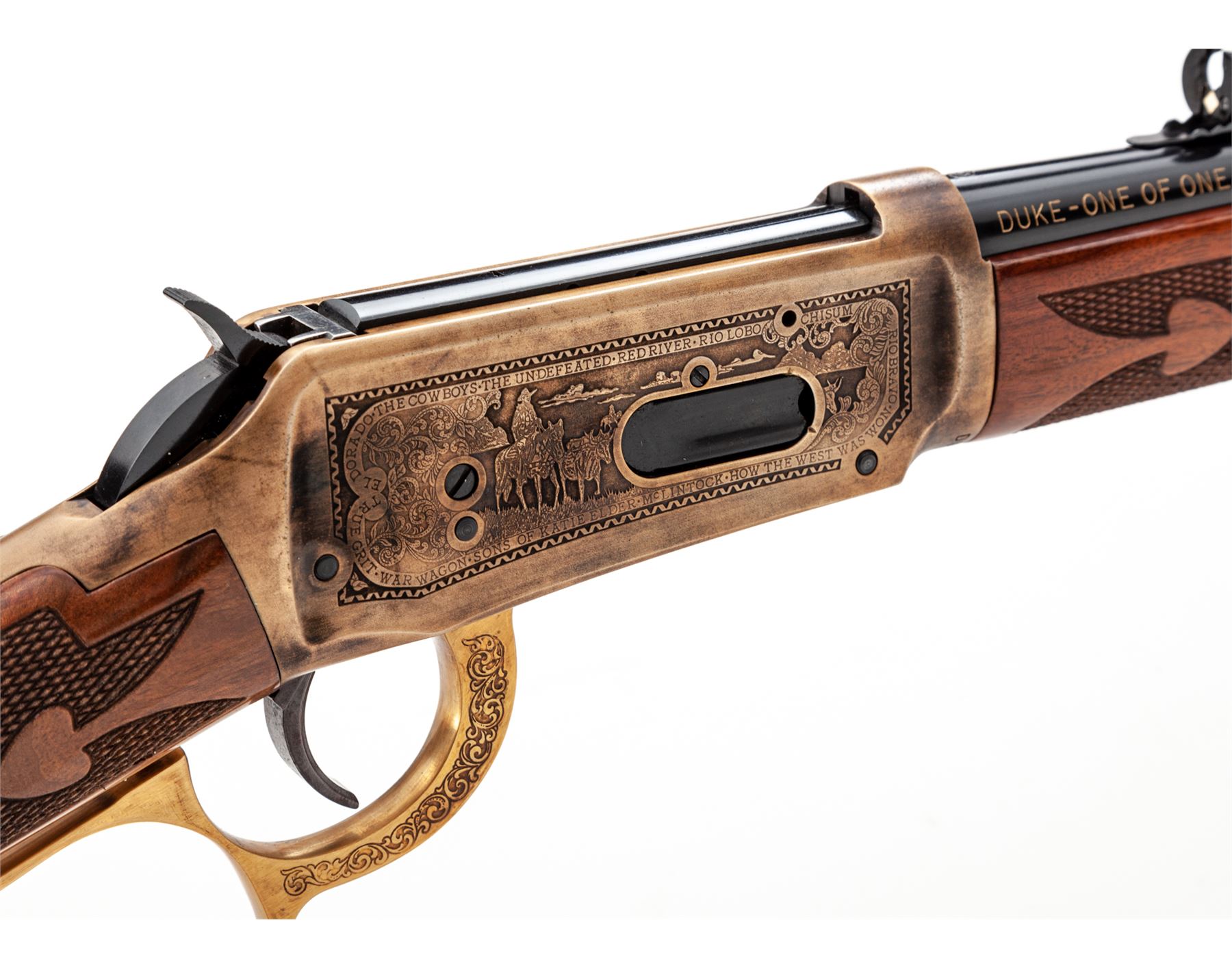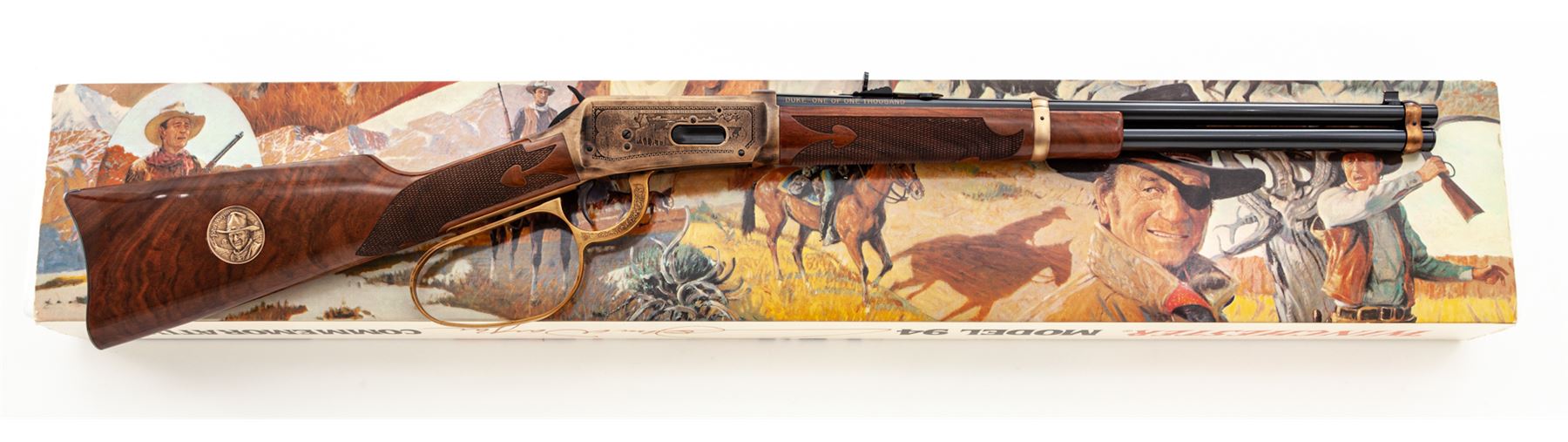 ''Duke One of One Thousand'' Winchester Model 94 Commemorative Large Loop Lever Action Carbine, #DUKE259, .32-40 cal., 18.5'' round barrel with standard sights, antique gold receiver with roll-engraved facsimile of mounted cowboys, stagecoach scene, and the names of John Wayne movies along the borders; nicely figured gloss finished straight grip fleur d'lis checkered walnut stock and forend, with gold-plated John Wayne medallion in stock, and blued crescent buttplate. In original Styrofoam box with polychrome sleeve, shipping box that is also numbered to the gun, with instruction manual, warranty card, and other misc. factory paperwork. Mfg'd 1981. Condition to rifle is excellent, appearing as new and unfired. Polychrome sleeve is very good showing a few spots of edge wear. Est.: $2,500-$4,000. (Modern)