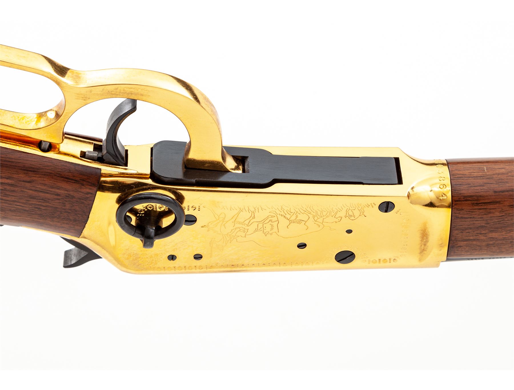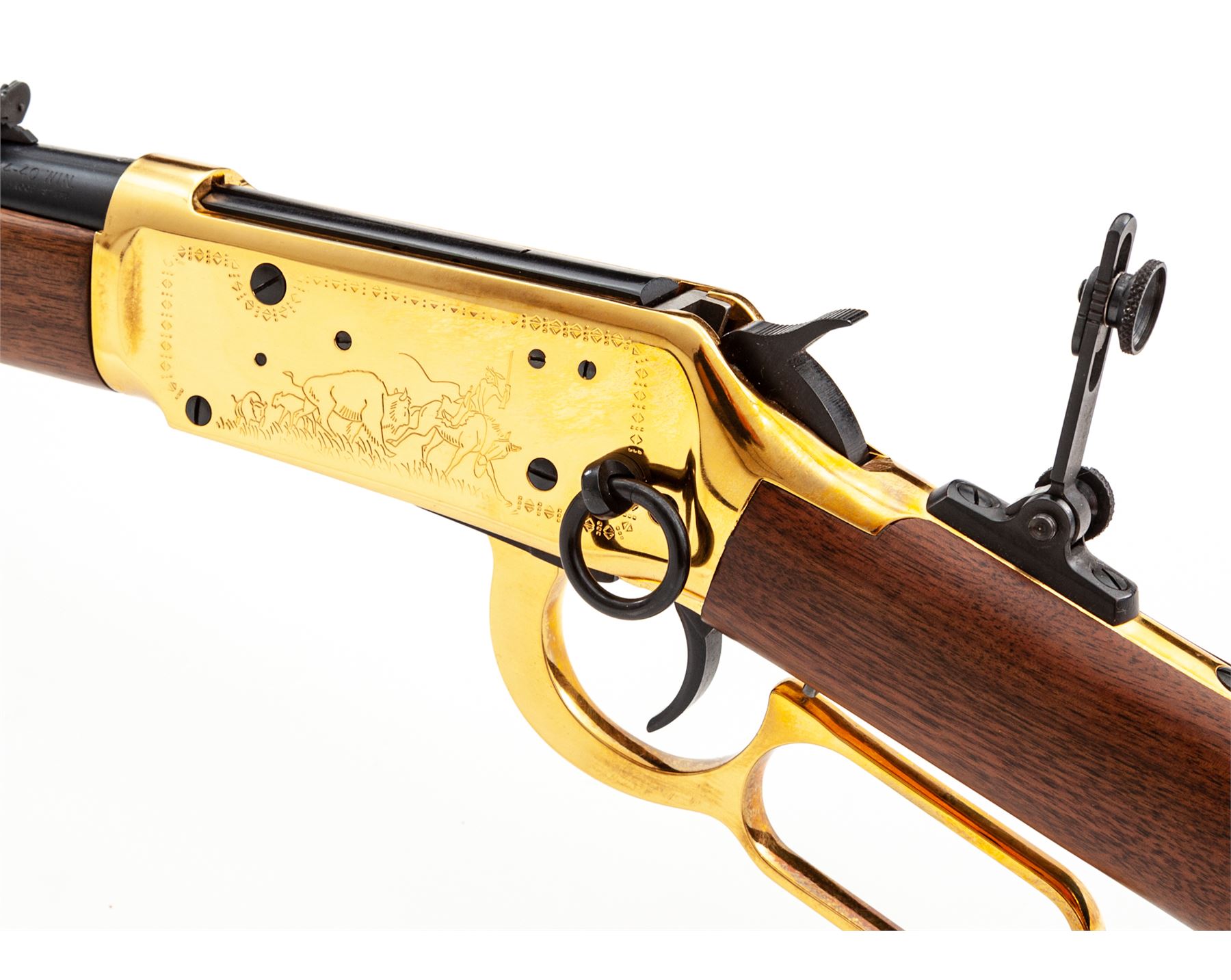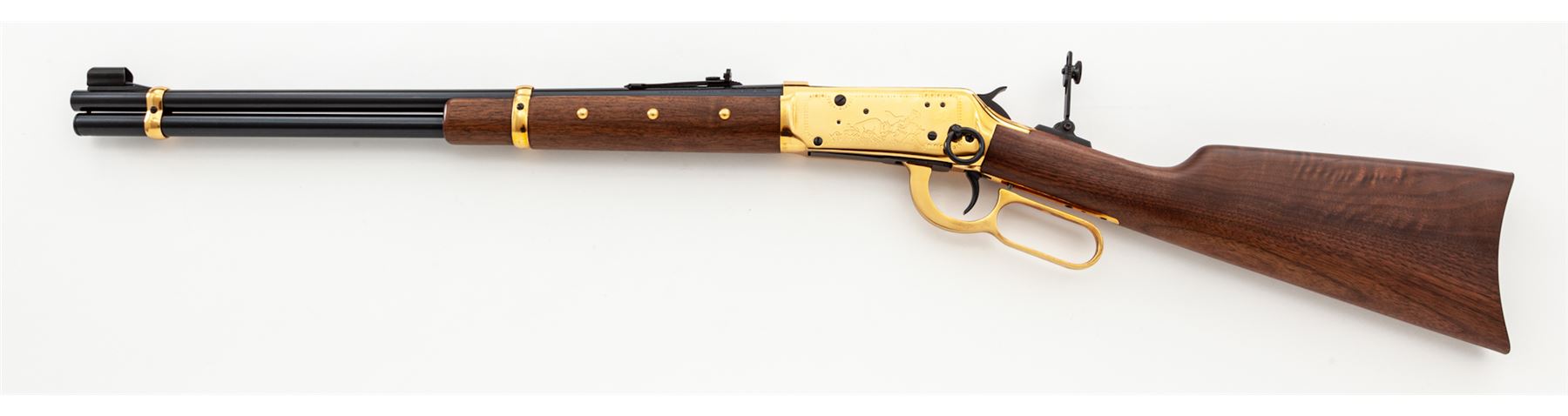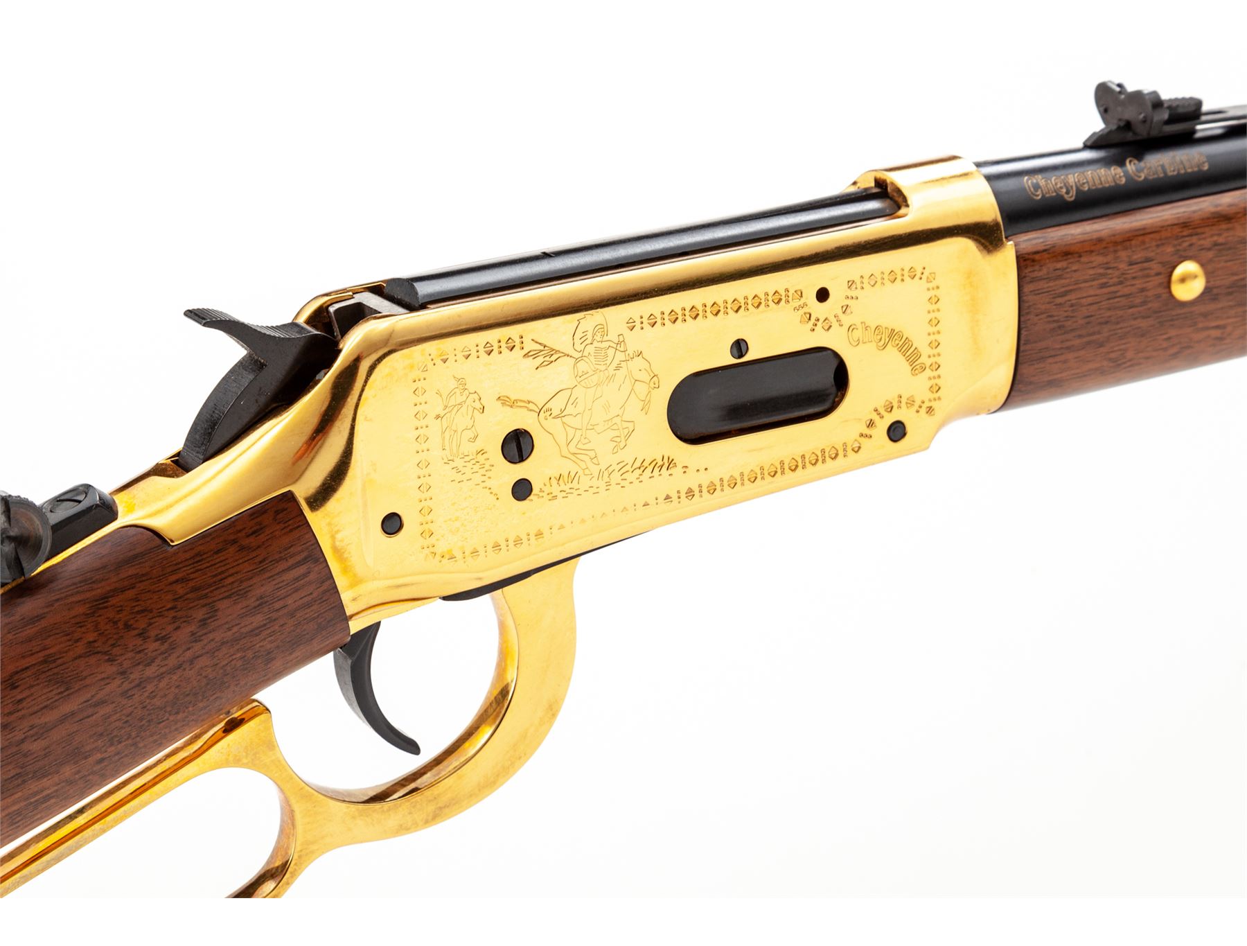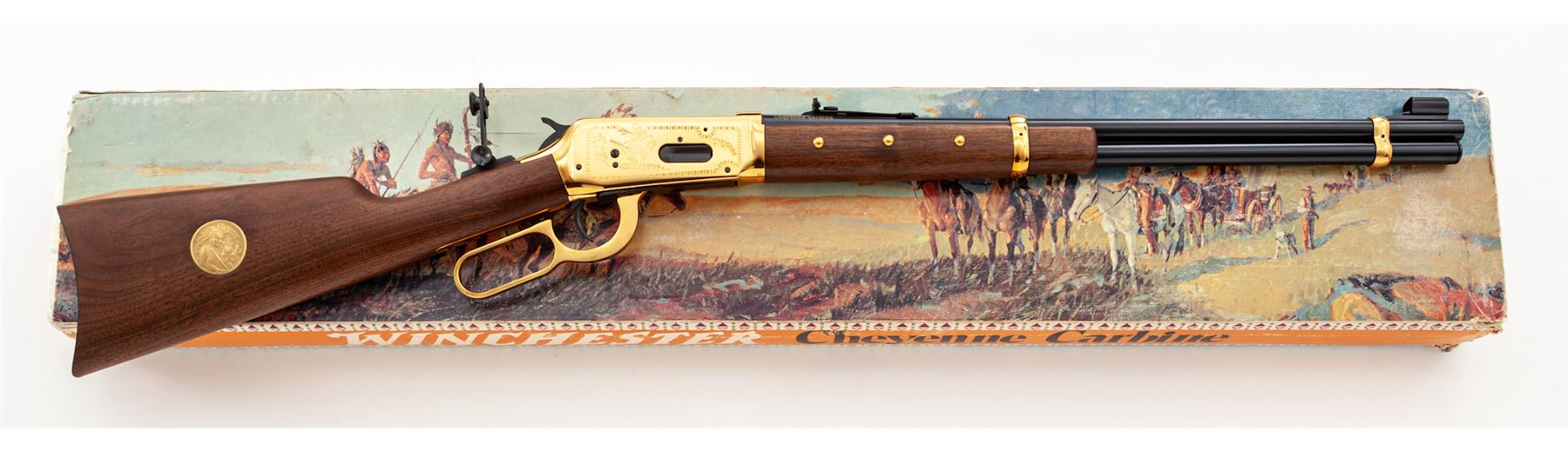 ''Cheyenne'' Commemorative Winchester Model 94 Lever Action Saddle Ring Carbine, #CH03864, .44-40 cal., 20'' blued steel round barrel with standard sights and marked on right side in gold lettering ''Cheyenne Carbine''. Gold-plated receiver, lever, and barrel bands; receiver is roll engraved with decorative border and Native American scenes. Straight grip walnut stock and forend, with gold-plated Cheyenne medallion in stock, and blued crescent buttplate, forend with six gold-plated tacks, and tang sight. In original Styrofoam box with correct end label that is unnumbered, polychrome sleeve, hang tag, Cheyenne instruction booklet, and small Winchester Cheyenne poster that measures 20.75 x12''. Mfg'd 1977. Condition to rifle is excellent, appearing unfired. High polish gold-plated frame and lever with scattered light handling marks. Polychrome sleeve is good showing moderate edgewear and a few tears at the corners, end label is clear. Est.: $700-$900. (Modern)