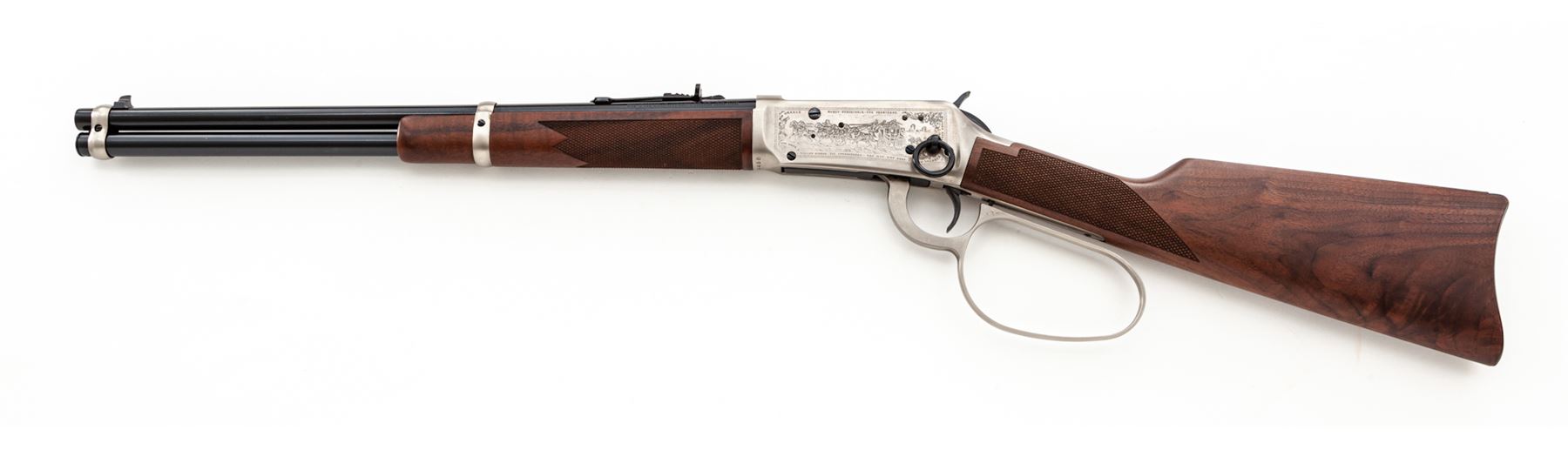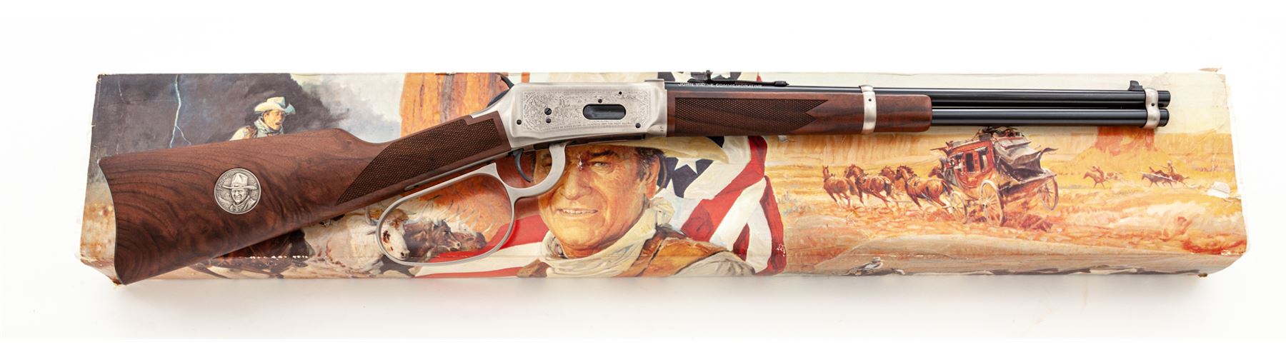 Winchester John Wayne Commemorative Model 94 Lever Action Carbine, #JW24488, .32-40 Win. cal., 18.5'' round barrel, blue finish, pewter frame and large loop lever, saddle ring, checkered straight grip walnut stock with inlaid John Wayne medallion. Nicely engraved frame lists John Wayne movies as borders to both sides, stagecoach and cowboy scenes, with facsimile John Wayne signature on upper tang. In original box with matching end label, polychrome slipcover, hang tag, leather saddle ring thong, owner's manual and other misc. paperwork. Appearing unfired, rifle is in excellent overall condition. Top of bolt and receiver directly in front of the bolt with a little fine micro-scratching. Wood shows no mentionable wear or handling. Bore is mirror bright. Polychrome slipcover shows mostly moderate edgewear, with a few penetrations and tears. Est.: $1,000-$1,500. (C&R List)