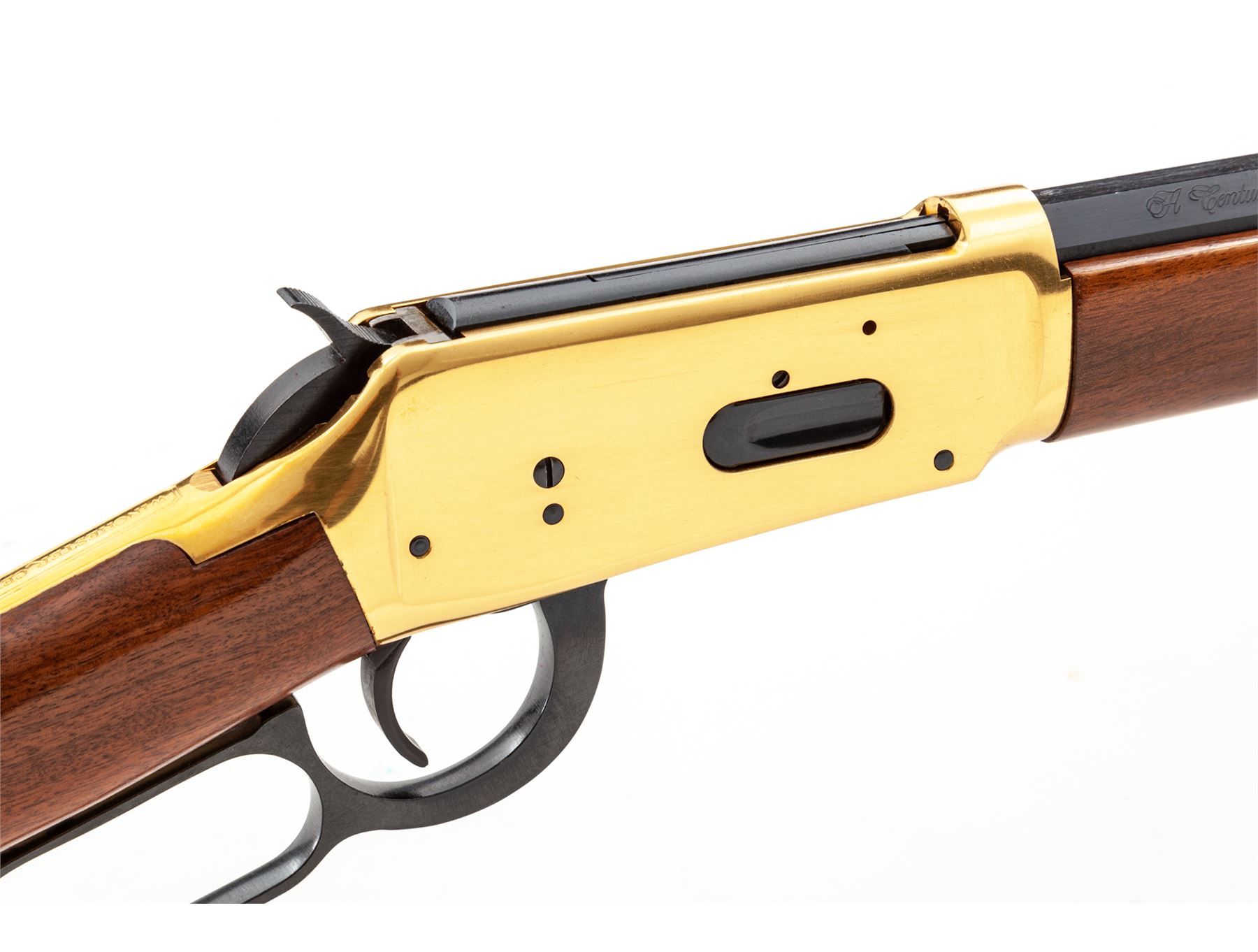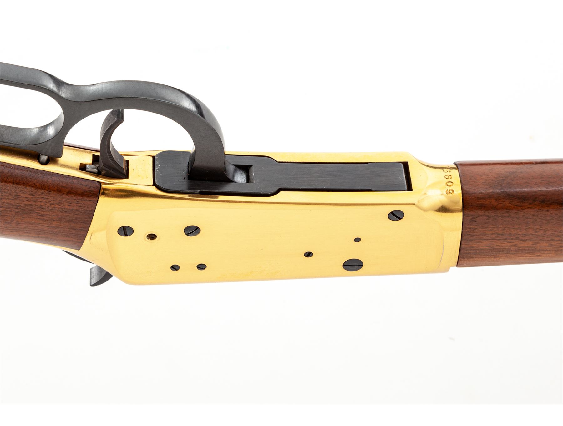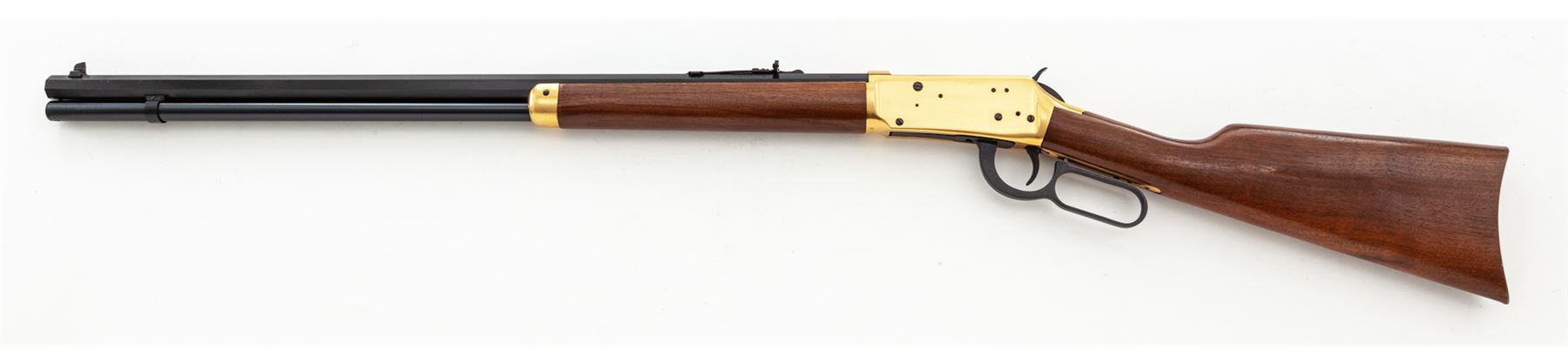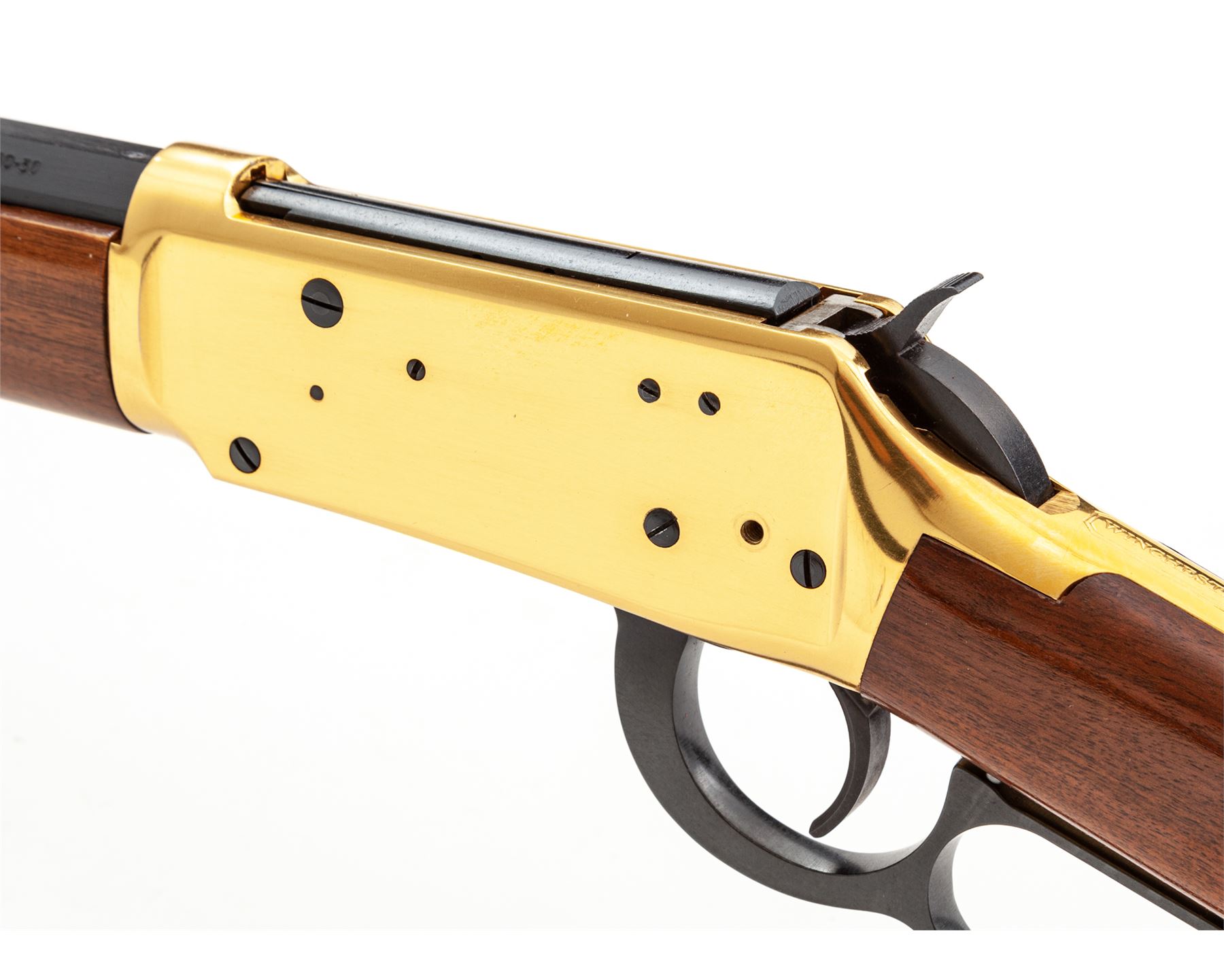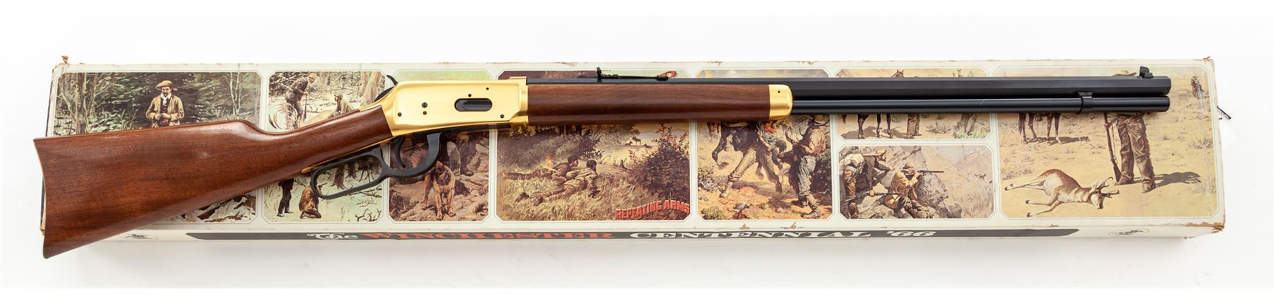 Winchester Centennial '66 Model 94 Commemorative Lever Action Rifle, #76609, .30-30 cal., 26'' blue octagonal barrel, gold-plated frame, forend cap and buttplate; satin finished smooth walnut stock, upper tang marked ''Winchester Centennial '66''. In original box with polychrome slipcover. Approx. 102,309 produced. Condition is excellent, appearing unfired, showing only the lightest handling. Est.: $750-$1,000. (C&R)