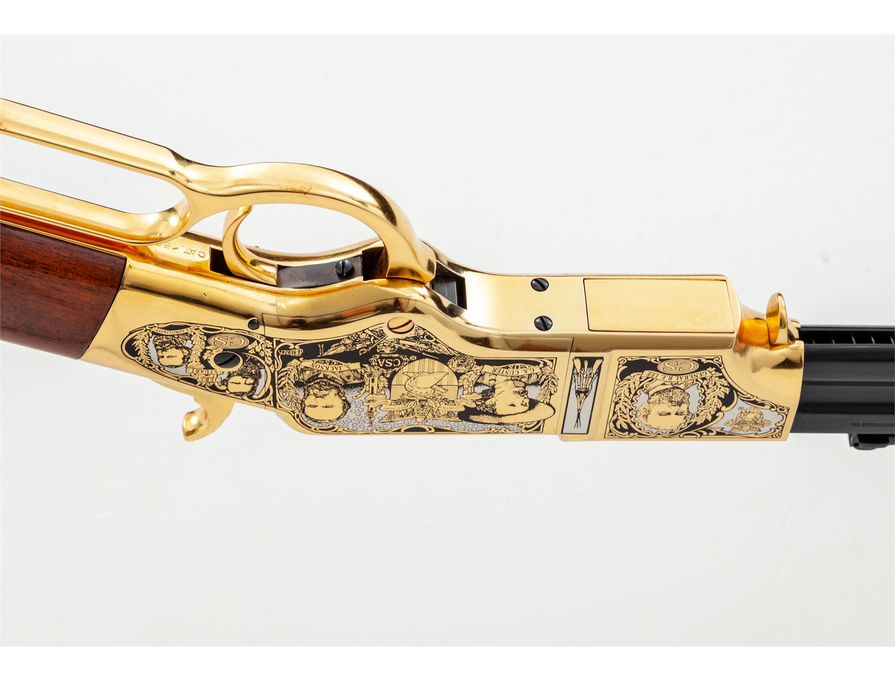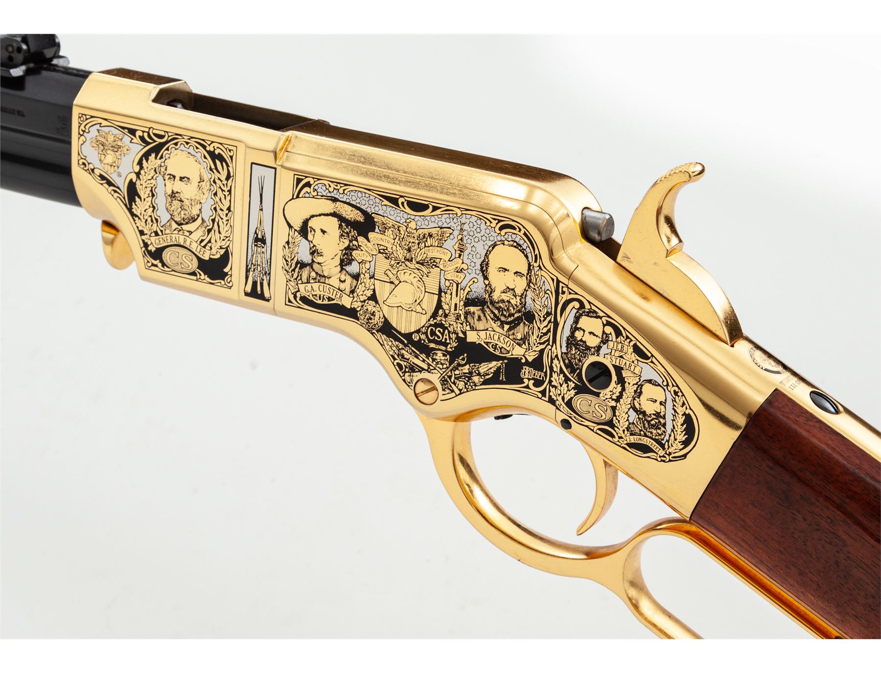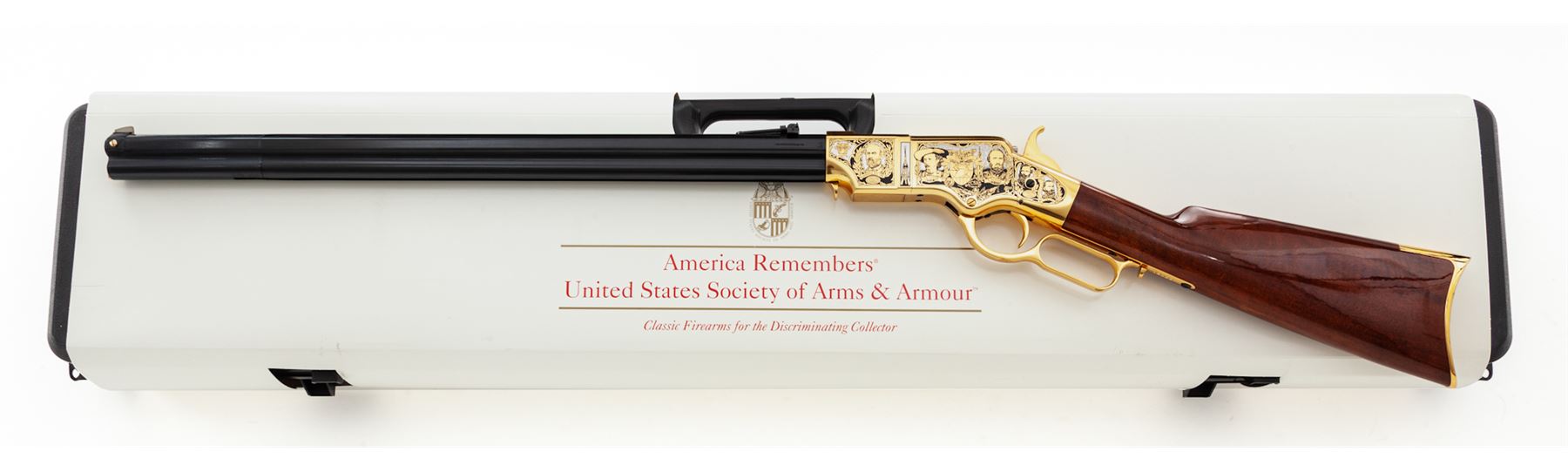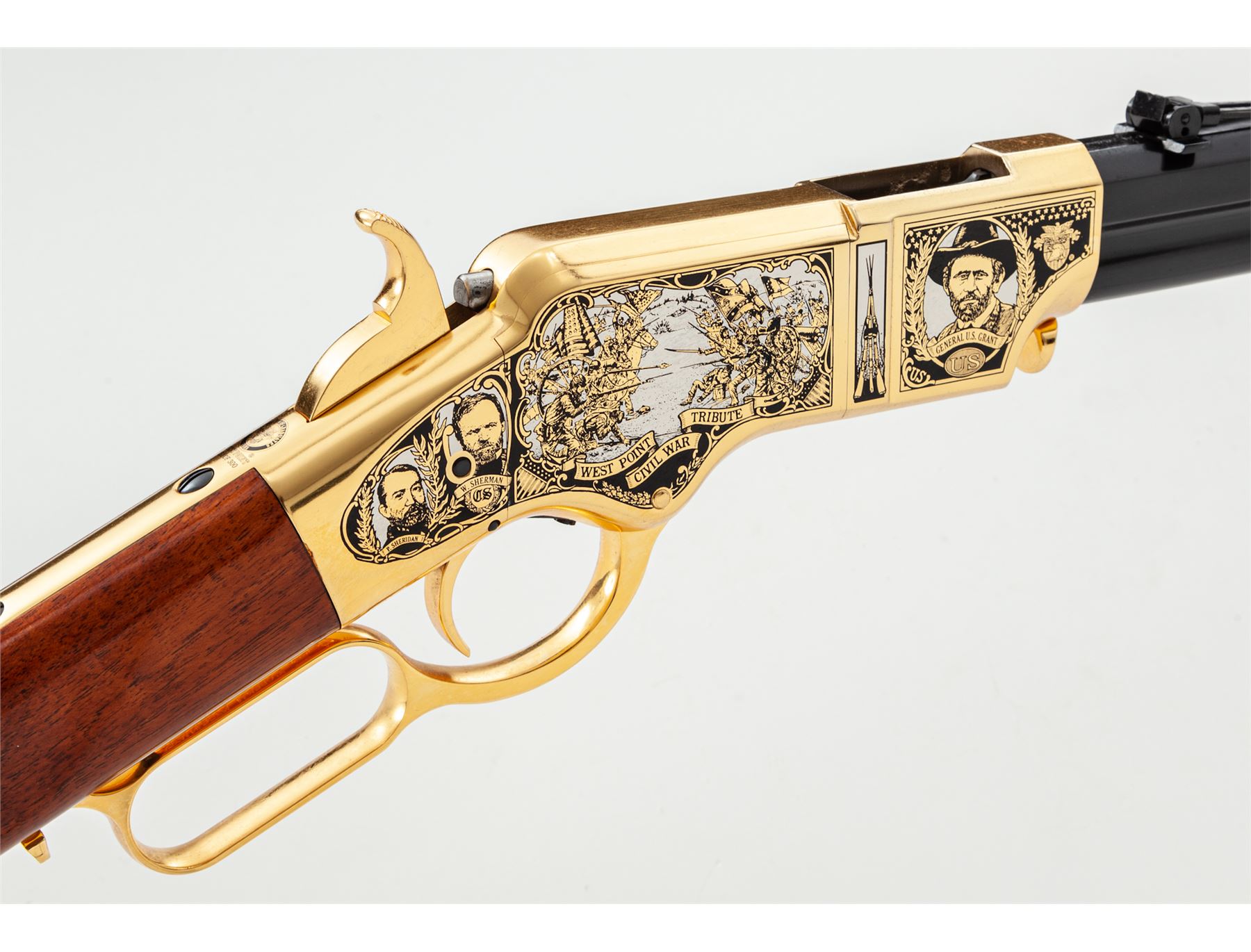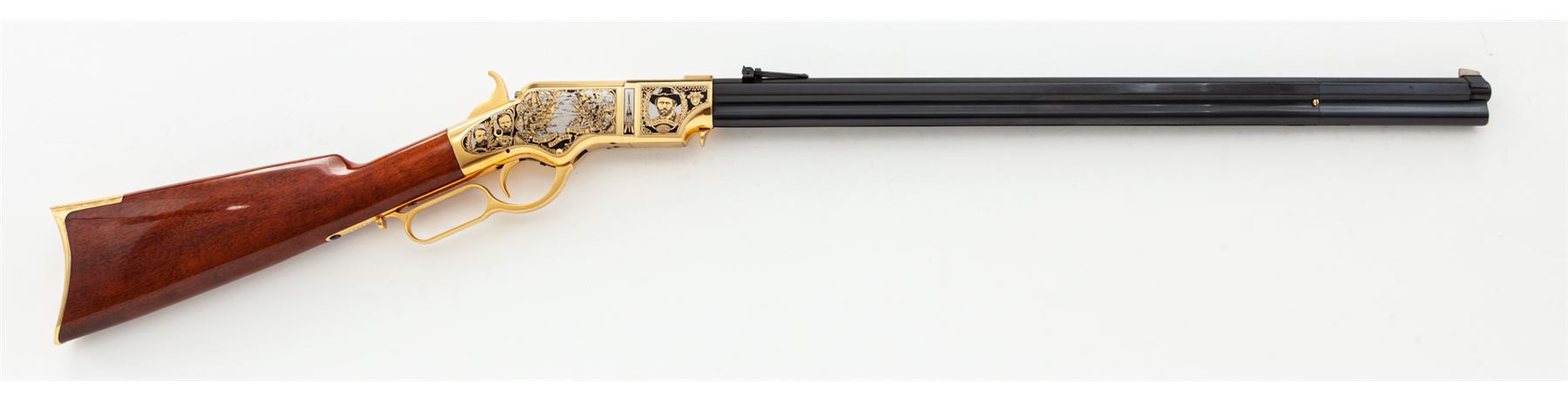 Limited Production America Remembers Uberti Henry Lever Action West Point Civil War Tribute Rifle, #19089, and is #151 of 300. Chambered in .44-40 cal., with a 24.25'' blued barrel, and 24k gold-plated receiver, lever, and crescent-shaped buttplate. Both sides of the receiver with extensive Civil War themed decorations as well as several portraits, including Custer, S. Jackson, R.E. Lee, U.S. Grant, etc. Straight grip walnut stock with a high gloss finish. This rifle includes a black plastic Gun Guard case with white outer America Remembers cardboard wrap, cable lock, maroon colored protective sleeve, America Remembers cleaning cloth, and plain white shipping box. In excellent as new and unfired condition. Gold-plated receiver with a few slight handling marks. Est.: $1,000-$1,500. (Modern)(Sierra Sid's Casino, Sparks, NV.)