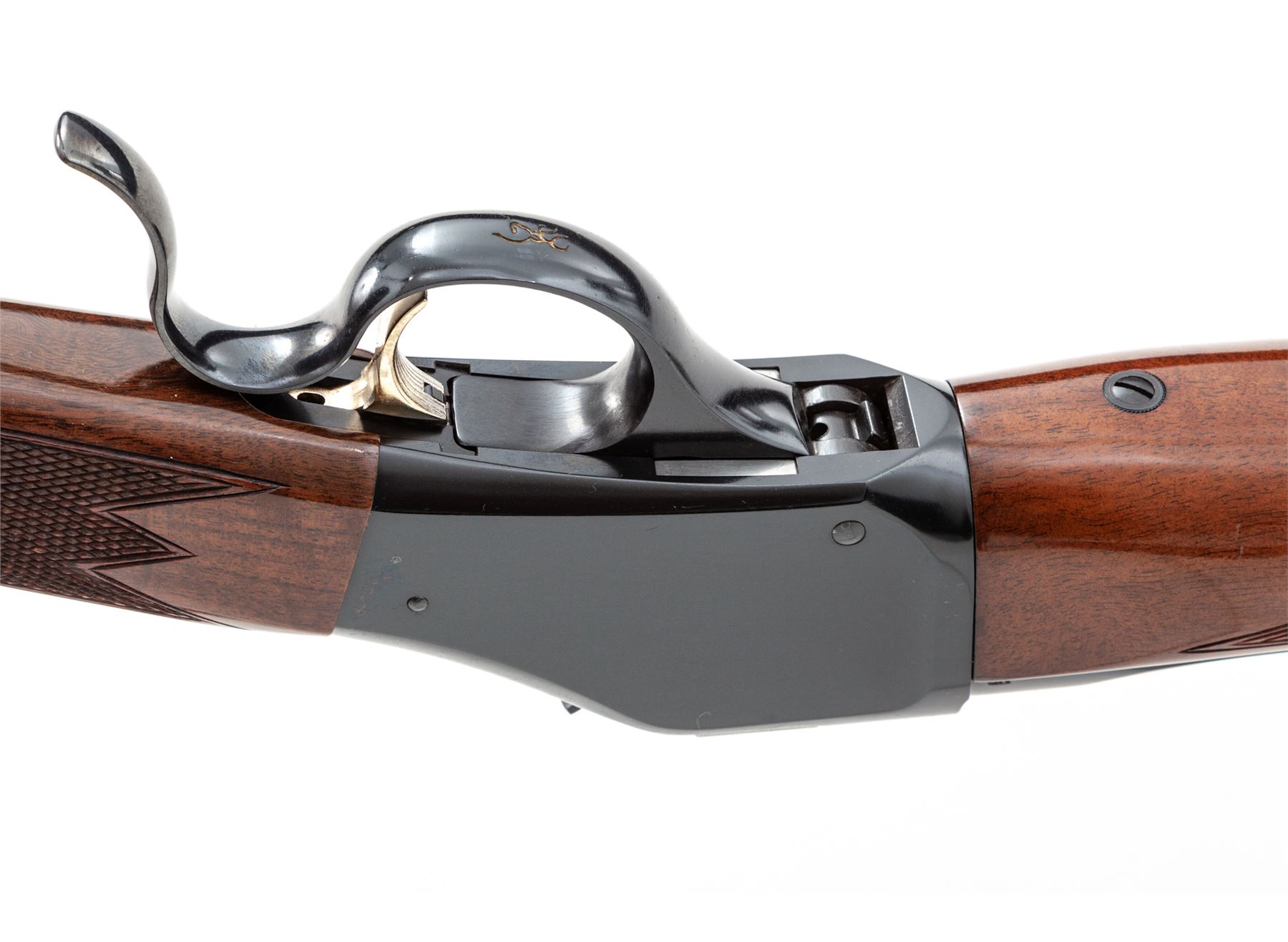 Browning Model 1885 High-Wall Single Shot Rifle, #03683NW247, .30-06 cal., 28'' tapered octagonal barrel, blue finish, factory checkered walnut stock, with peep rear and hooded globe type front sight. Made in Japan. Condition is excellent showing only the lightest marks from handling. Est.: $800-$1,200. (Modern)