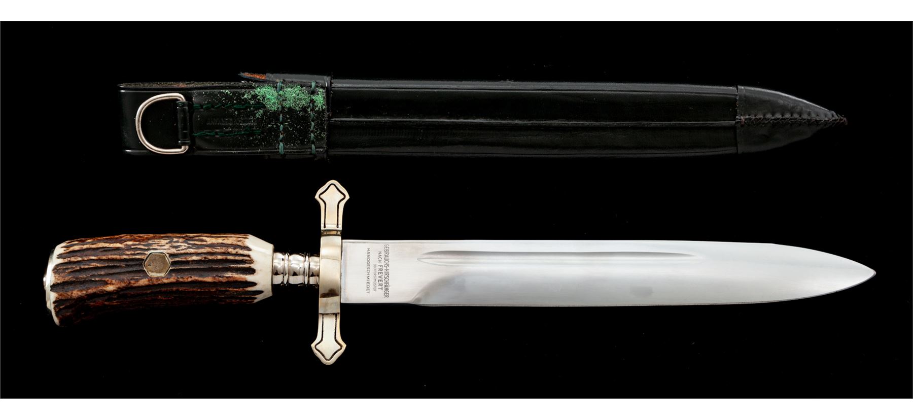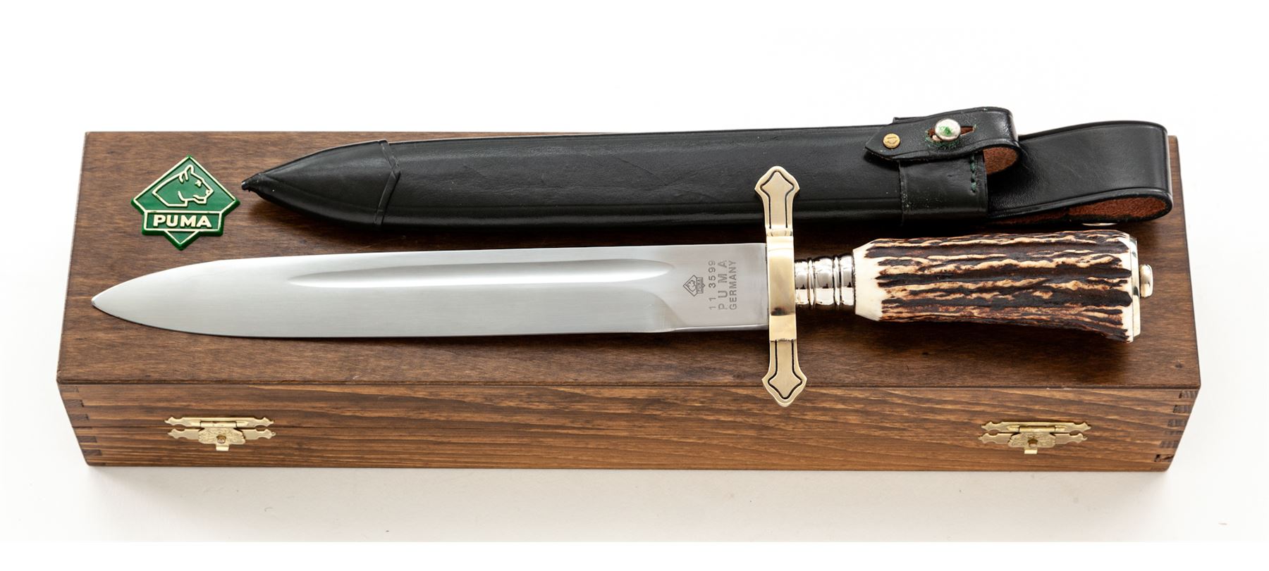 Rare Puma #3599 Hirschfanger Fixed Blade Hunting Knife, with the original box and sheath, 9.75'' blade, 15.25'' overall, stag handle; nickel silver hilt, ferrule, and pommel. Mfg'd in 1988. Included is the original black leather sheath with hang tag, wood box with correct end label and Puma medallion on the outside of the lid, foam insert, sharpening instructions, small Puma pocket catalog with skinning instructions, moisture strips, and four (4) sheets in German that are related to the Hirschfanger. The knife itself is in excellent as new overall condition. Sheath is also in unused condition but some of the green foam interior is stuck to the backside of the belt loop. Wood case is very good, exterior with light scratches and impressions from storage; foam piece on the inside of the lid shows a little deterioration and needs to be reattached. A hard-to-find knife complete with all of the hang tags, associated paperwork, etc. Est.: $600-$900.