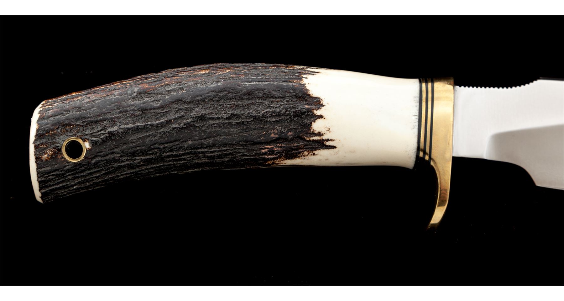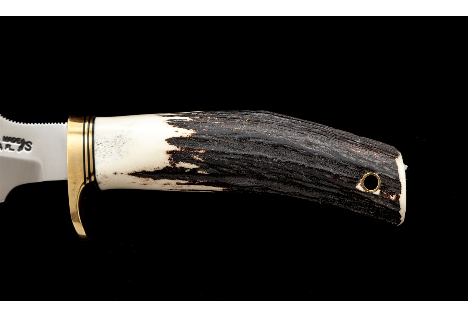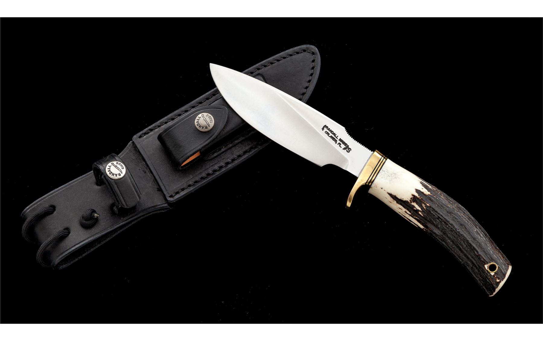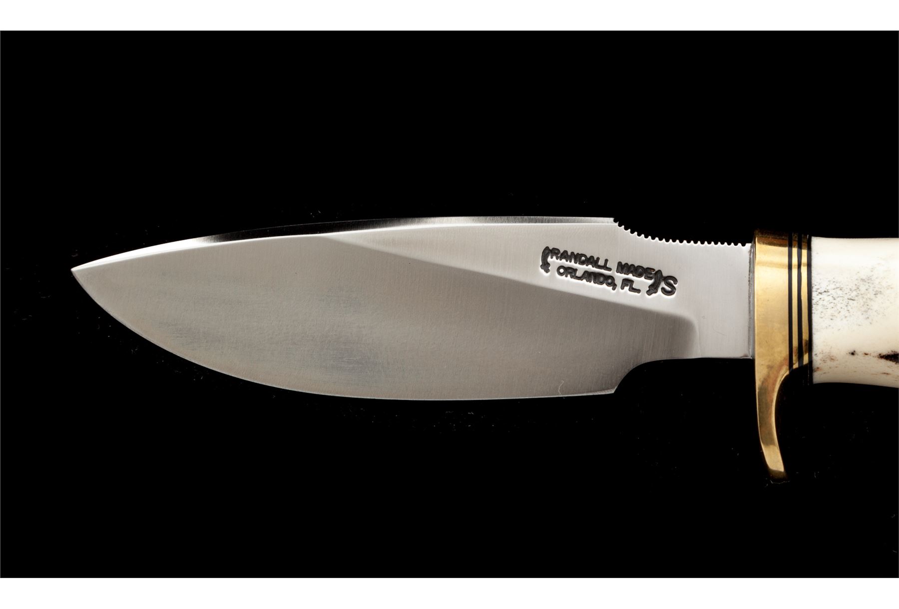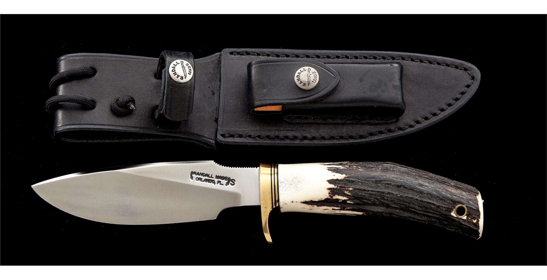 Randall Model 11 ''Alaskan Skinner'' Fixed Blade Knife, with sheath, 5'' blade with standard Randall stainless logo, and 1'' portion on the top of the blade is notched for finger/thumb placement; 9-5/8'' overall length. Stag handle with brass single hilt and wrist thong ferrule, with black and brass spacers. In black leather Randall sheath stamped on backside with Randall logo and ''11 5'', with ''Randall Made'' snaps, unmarked salmon-colored sharpening stone, and black leg tie. In excellent as new overall condition, never carried or sharpened. Good looking solid piece of stag. Sheath is excellent. Est.: $400-$600.