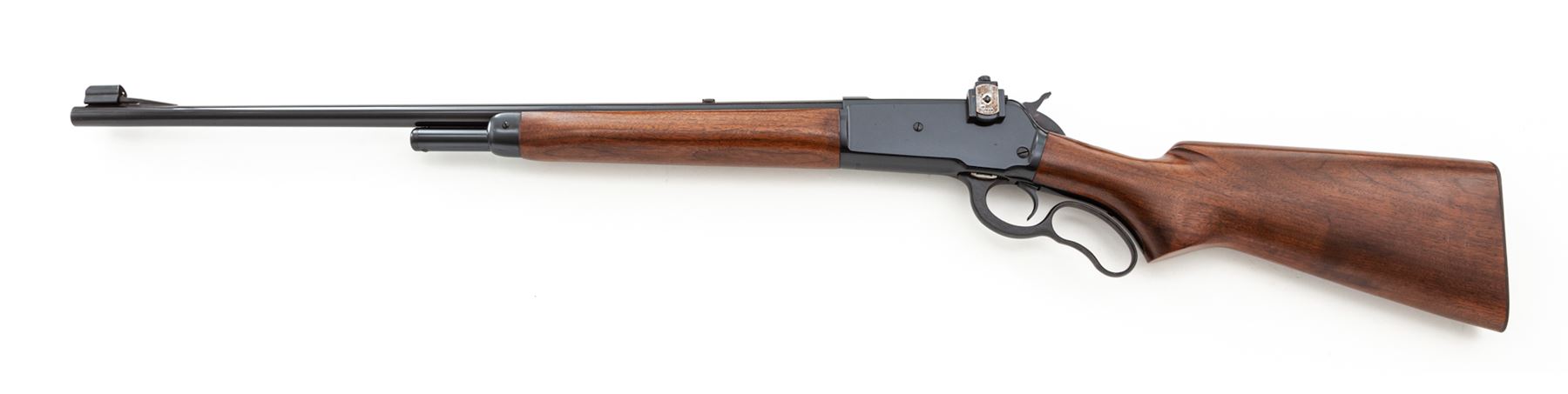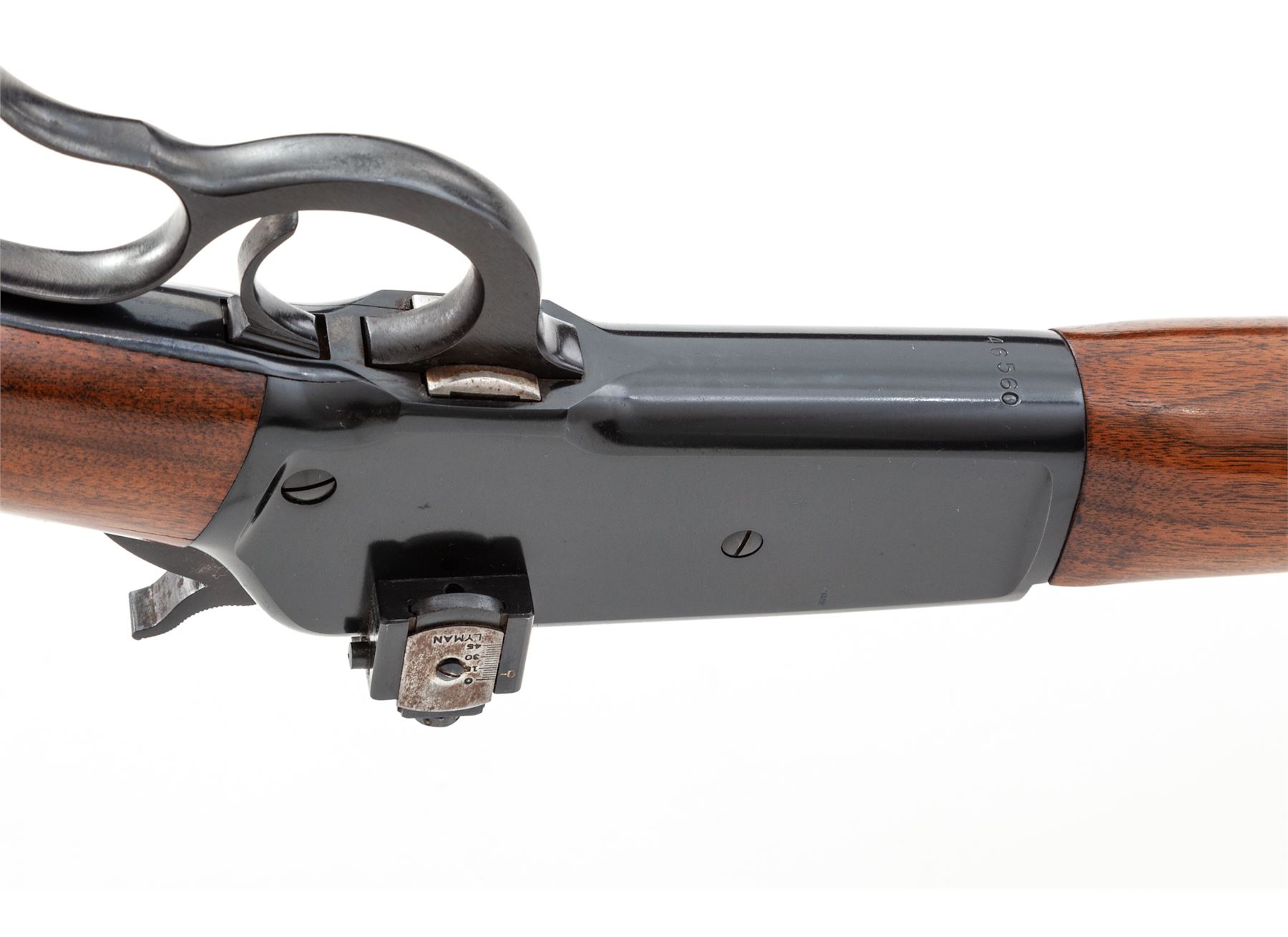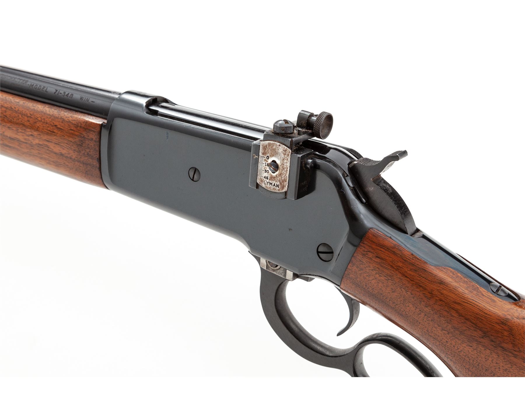Winchester Model 71 Lever Action Rifle, #46560, .348 WCF cal., 24'' barrel, blue finish, walnut stock and forend, checkered steel buttplate, with Lyman receiver sight. Mfg'd 1957. Condition is excellent retaining approx. 98% finish. Light handling marks to stock. Crisp action, bright bore. Est.: $1,200-$1,800. (C&R)