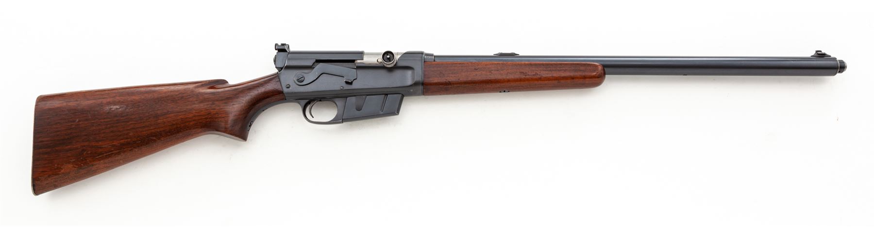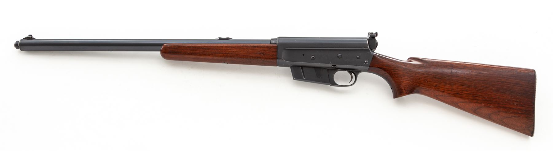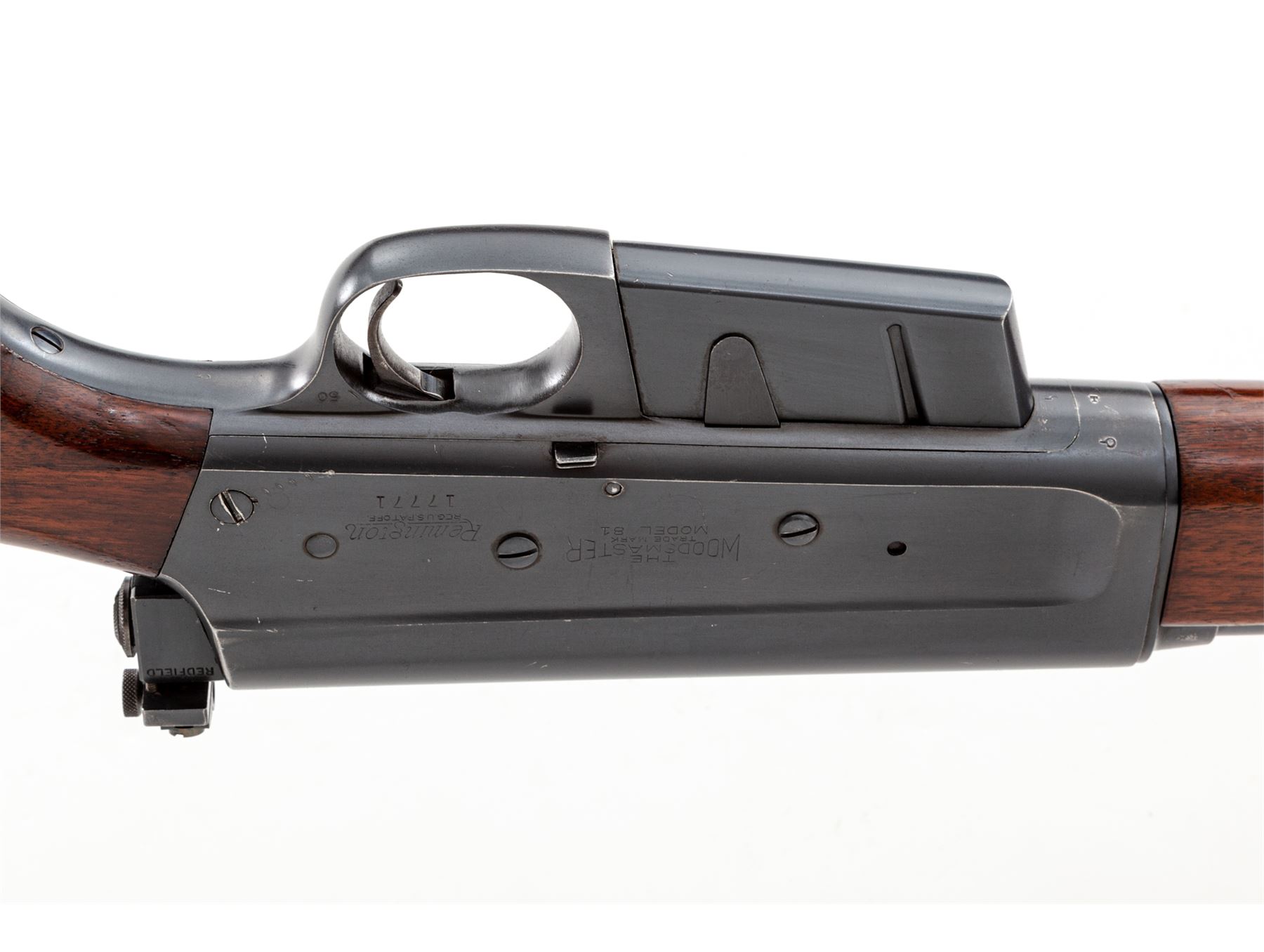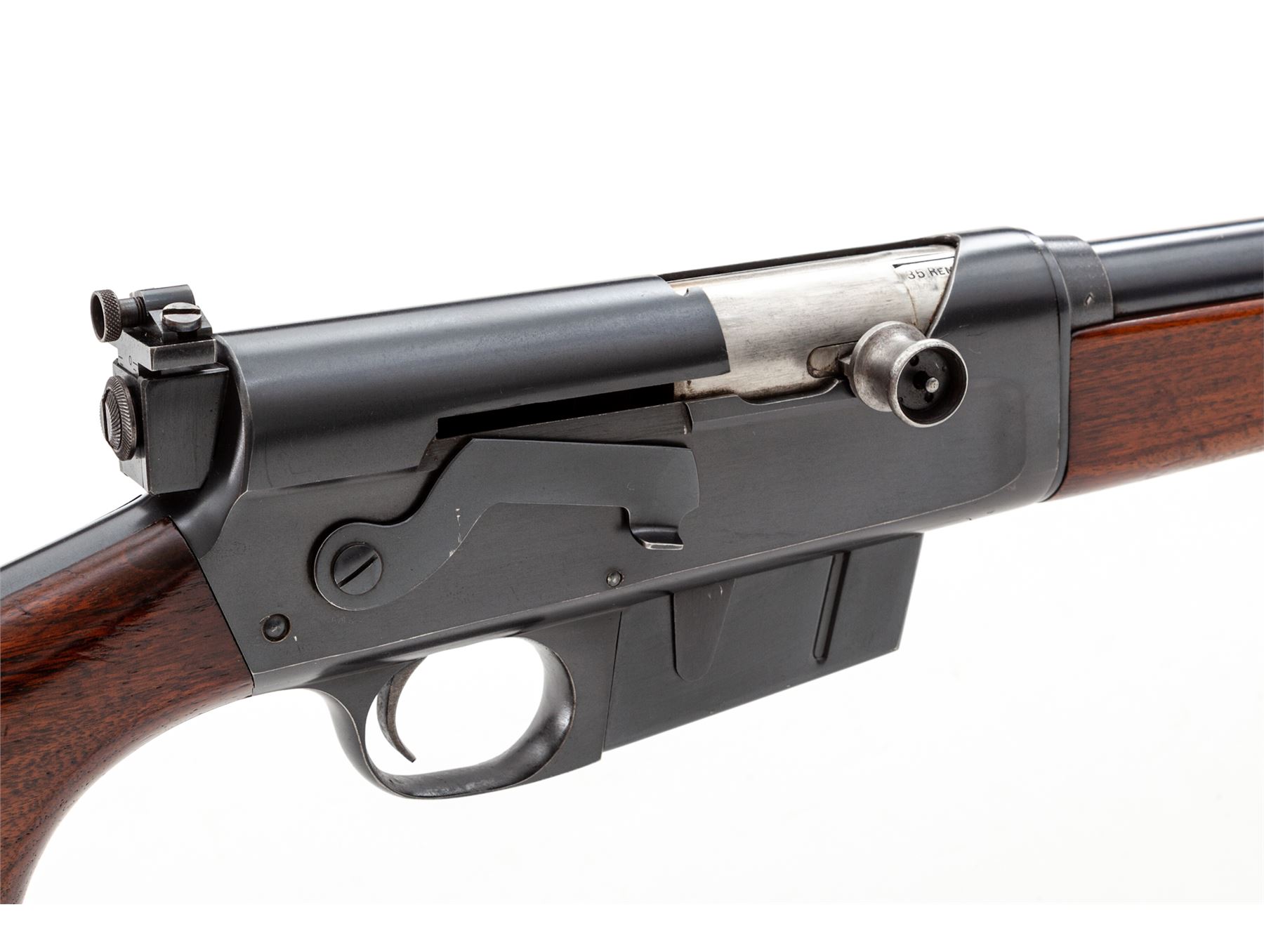 Remington Model 81 Semi-Automatic Rifle, #17771, .35 Rem. cal., 21.5'' barrel, blue finish, smooth pistol-grip walnut stock and forend, with added Redfield peep sight. Condition is fine retaining approx. 97% original blue. Rearmost frame screw left side with mild screw slot deformation and very light chatter marks in same general area. Stock with light scuffs, several scratches, and an additional coat of varnish. Good action, mirror bright bore. Est.: $500-$750. (C&R)