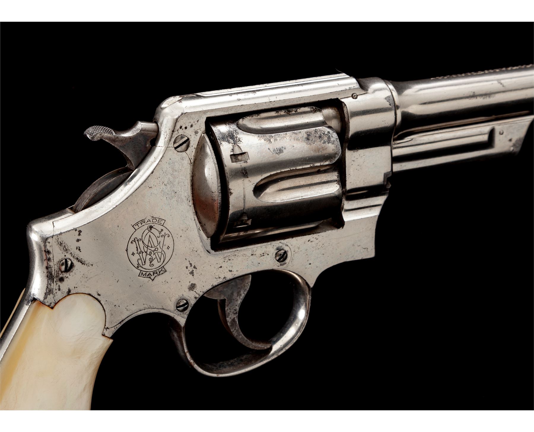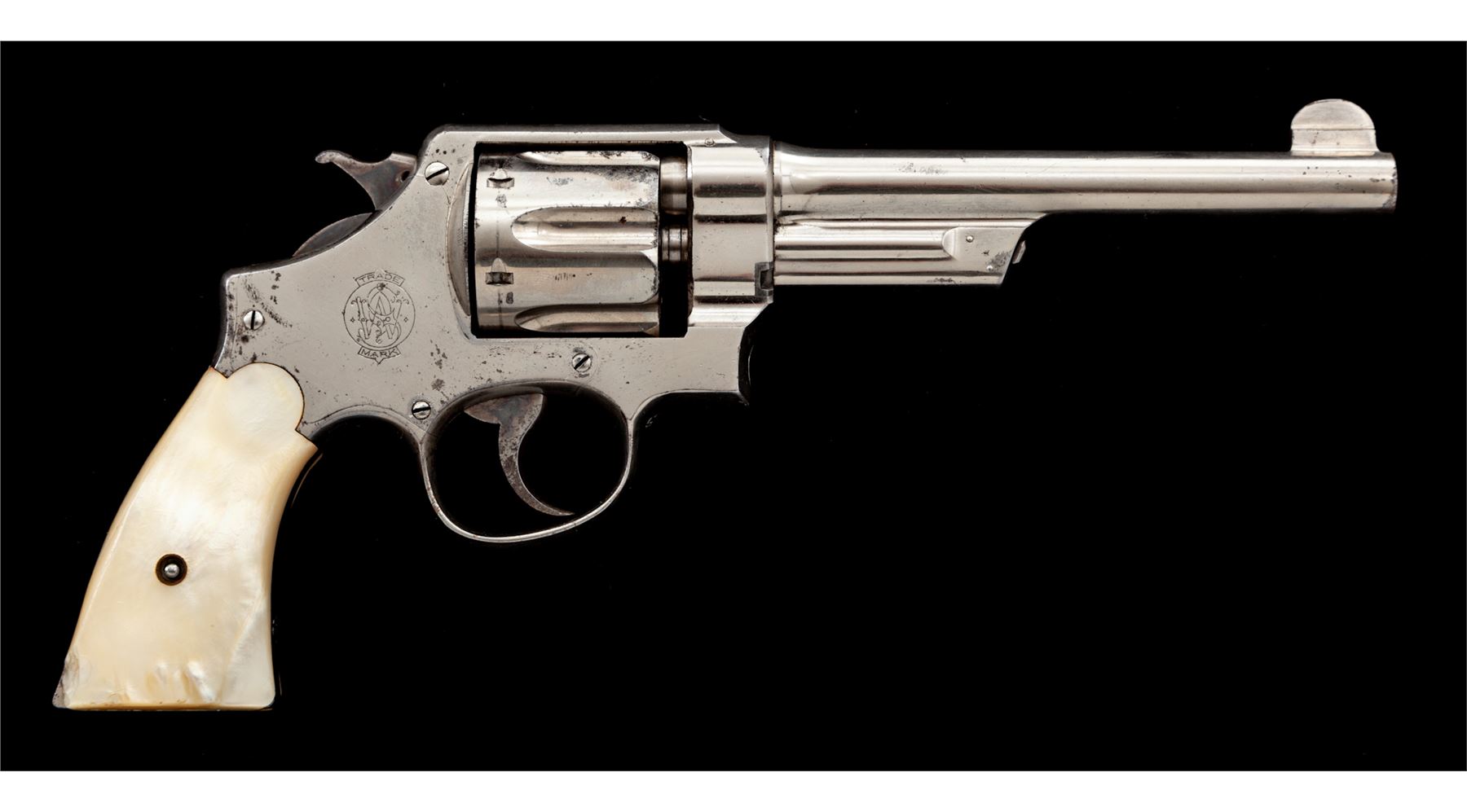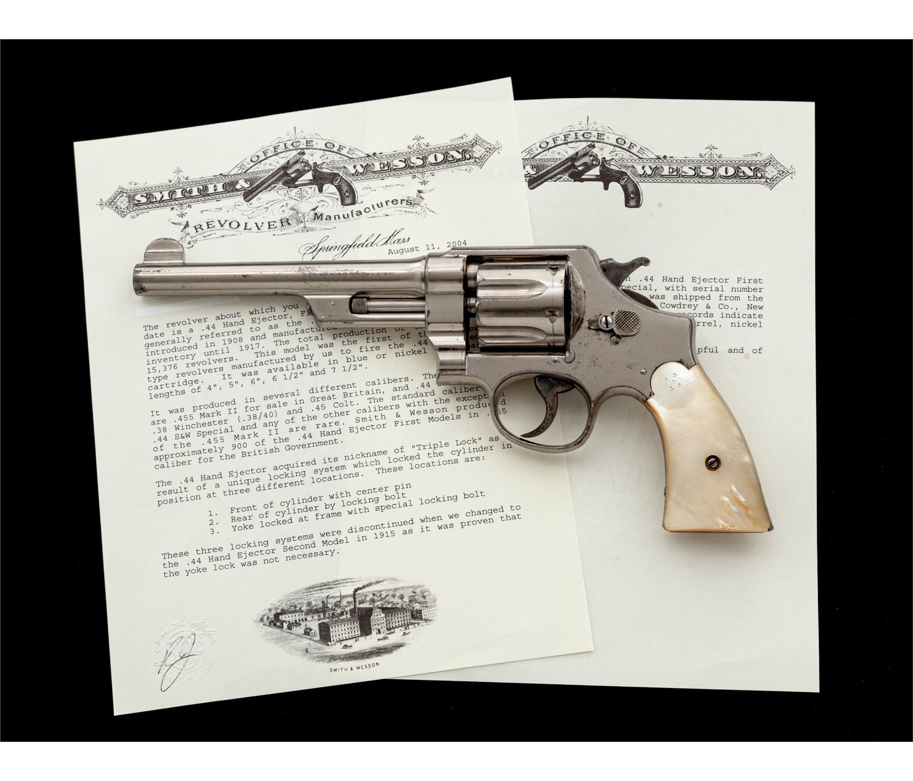 Smith & Wesson 1st Model Hand Ejector Double Action Revolver (Triplelock), #9487, .44 Spec. cal., 6.5'' barrel, nickel finish, pearl grips, standard fixed sights. Factory letter verifies all features except pearl grips, as this example was originally shipped with checkered walnut grips on Aug. 5, 1915, to Cowdrey & Co., NYC, NY, a large export distributor, with factory letter signed by S&W Historian Roy G. Jinks. Left grip panel features five circle-dot motifs in scallop area, with matching numbered cylinder and barrel. Condition is fine retaining approx. 90% thinning and lightly flaking blue, with losses at muzzle and very light lifting to left side of barrel near caliber marking, and in the area adjacent to the cylinder latch. Grips remain very iridescent with small loss at toe of right panel. Good action, fine bore. Est.: $800-$1,200. (C&R/PPT)