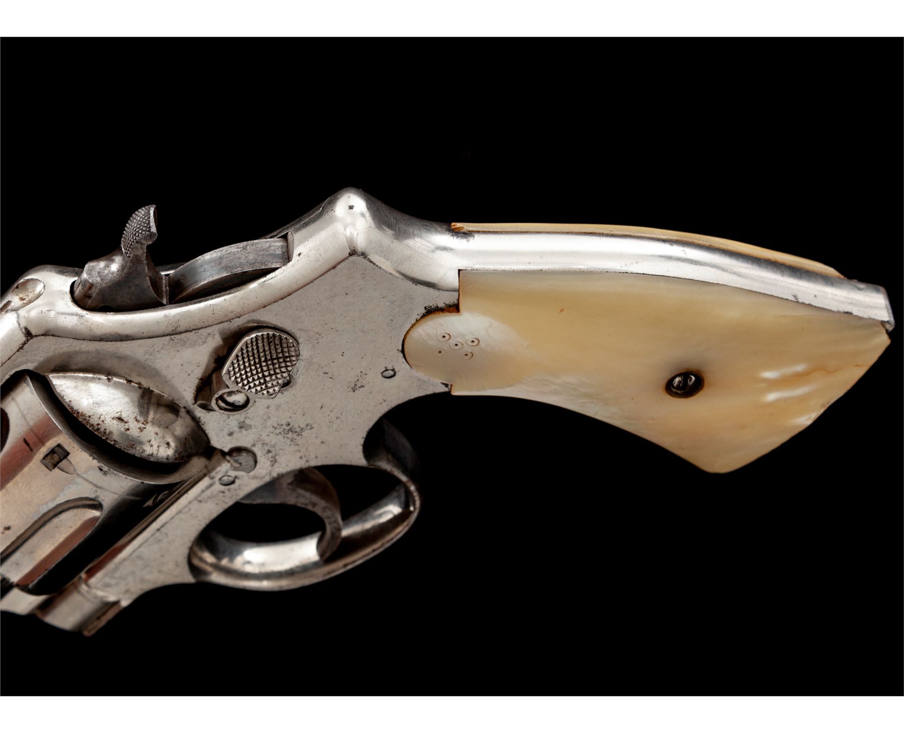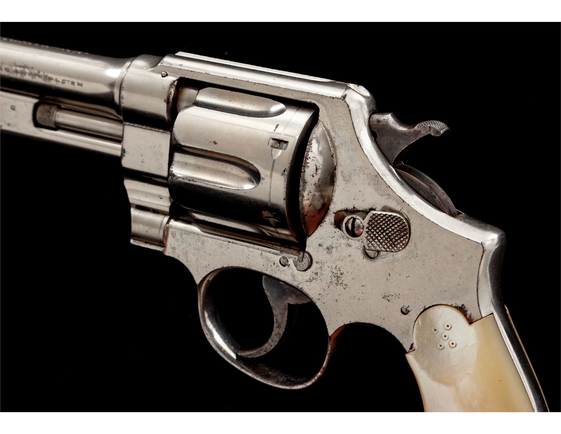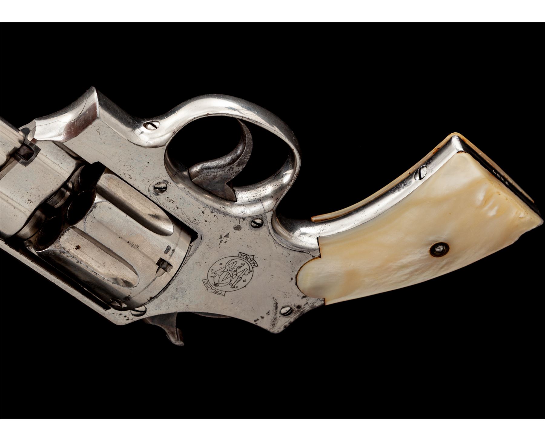Smith & Wesson 1st Model Hand Ejector Double Action Revolver (Triplelock), #9487, .44 Spec. cal., 6.5'' barrel, nickel finish, pearl grips, standard fixed sights. Factory letter verifies all features except pearl grips, as this example was originally shipped with checkered walnut grips on Aug. 5, 1915, to Cowdrey & Co., NYC, NY, a large export distributor, with factory letter signed by S&W Historian Roy G. Jinks. Left grip panel features five circle-dot motifs in scallop area, with matching numbered cylinder and barrel. Condition is fine retaining approx. 90% thinning and lightly flaking blue, with losses at muzzle and very light lifting to left side of barrel near caliber marking, and in the area adjacent to the cylinder latch. Grips remain very iridescent with small loss at toe of right panel. Good action, fine bore. Est.: $800-$1,200. (C&R/PPT)