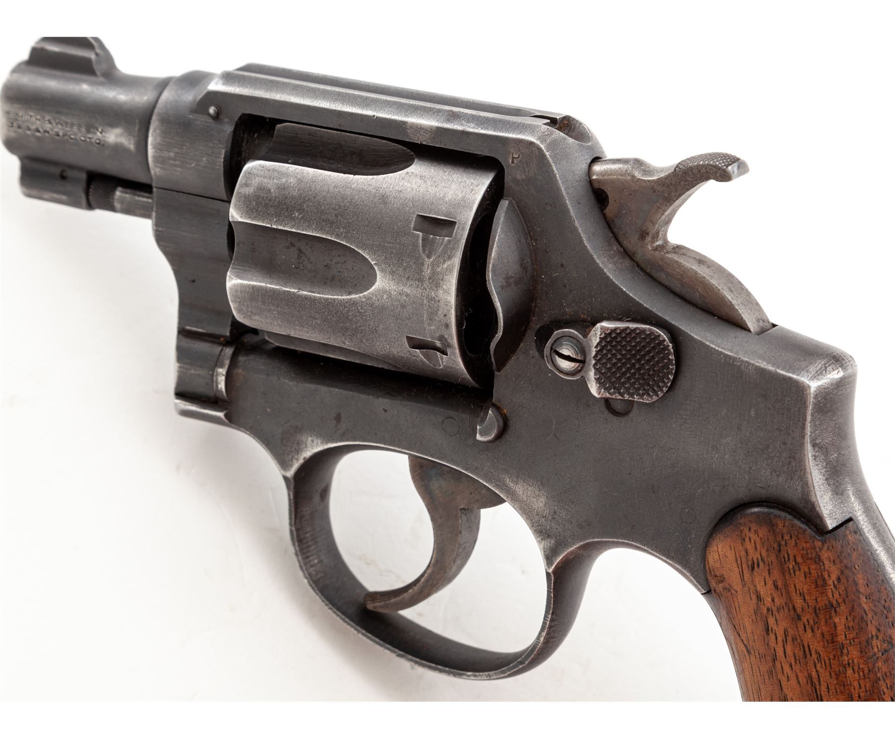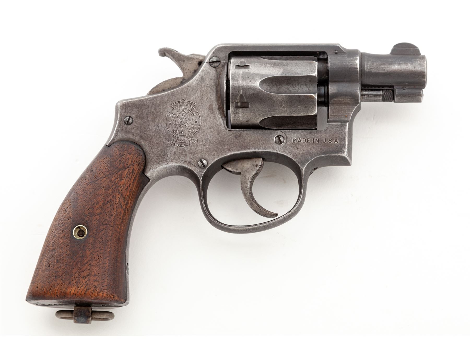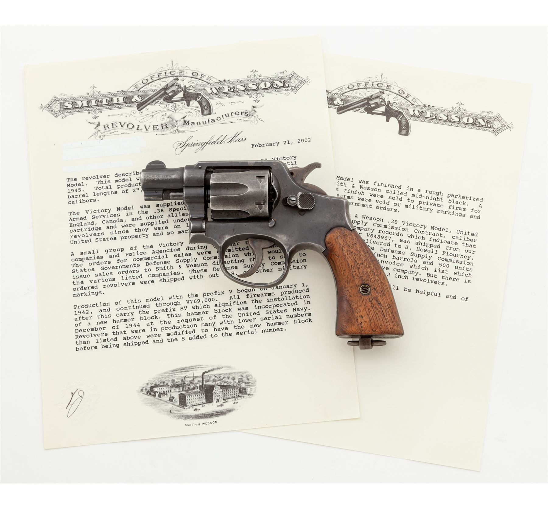 Smith & Wesson Victory Model Double Action Revolver, #V648967, .38 Spec. cal., 2'' barrel, dulite finish, matching numbered smooth walnut grips, with matching numbered cylinder and barrel. Shipped Aug. 27, 1944, to J. Howell Flourney, Shreveport, LA, with factory letter signed by S&W Historian Roy G. Jinks. The shipment to the Defense Supply Commission for this day was 500 units with 2'' barrels. Condition is fine retaining approx. 80% thinning dulite finish. Grips with smooth even wear. Smooth action, bright bore. Est.: $800-$1,200. (C&R/PPT)