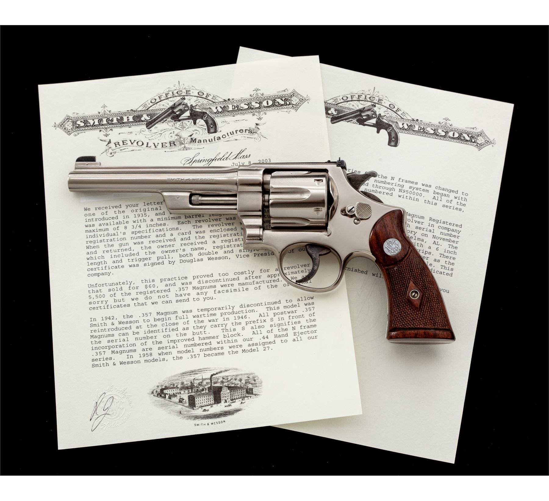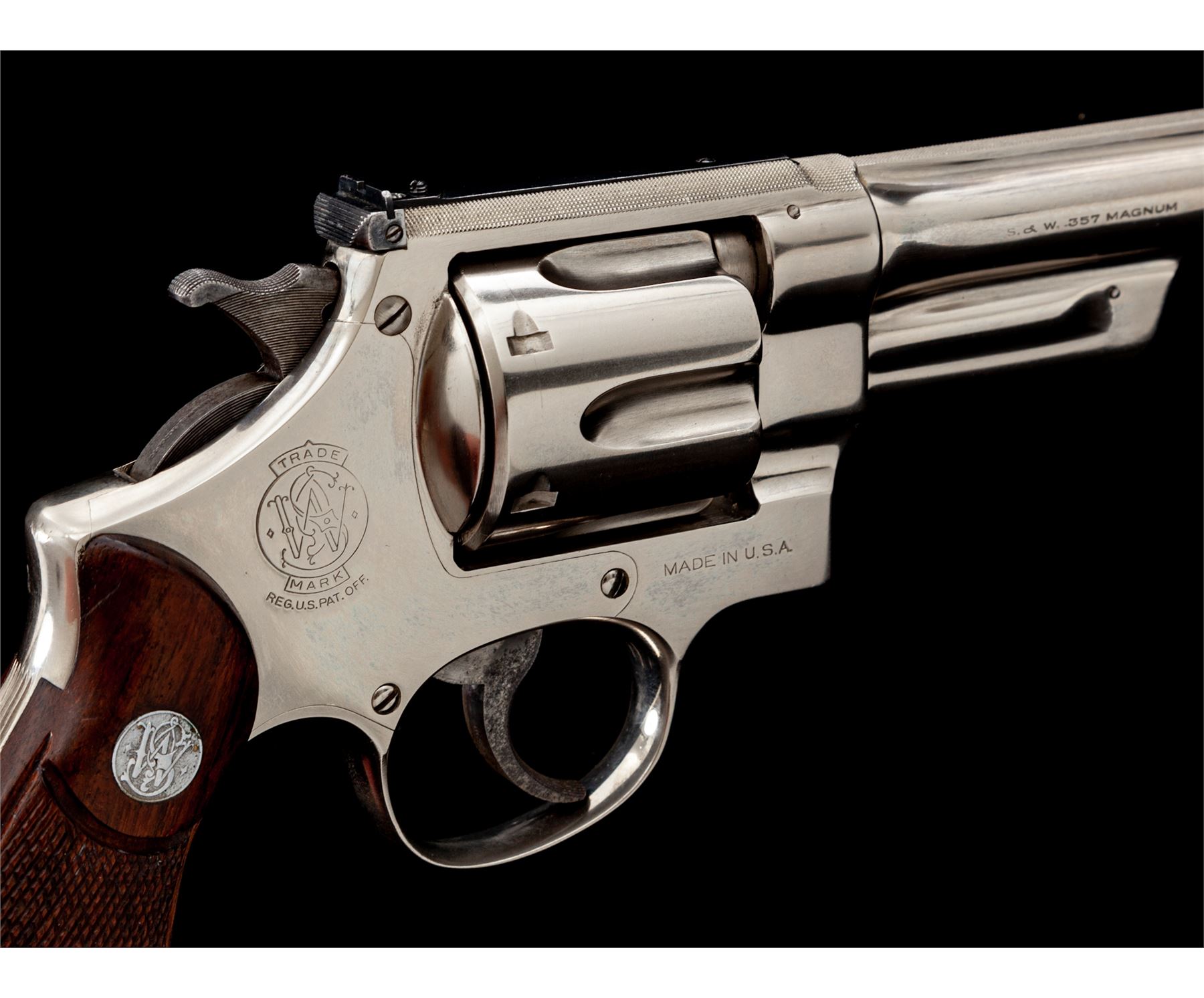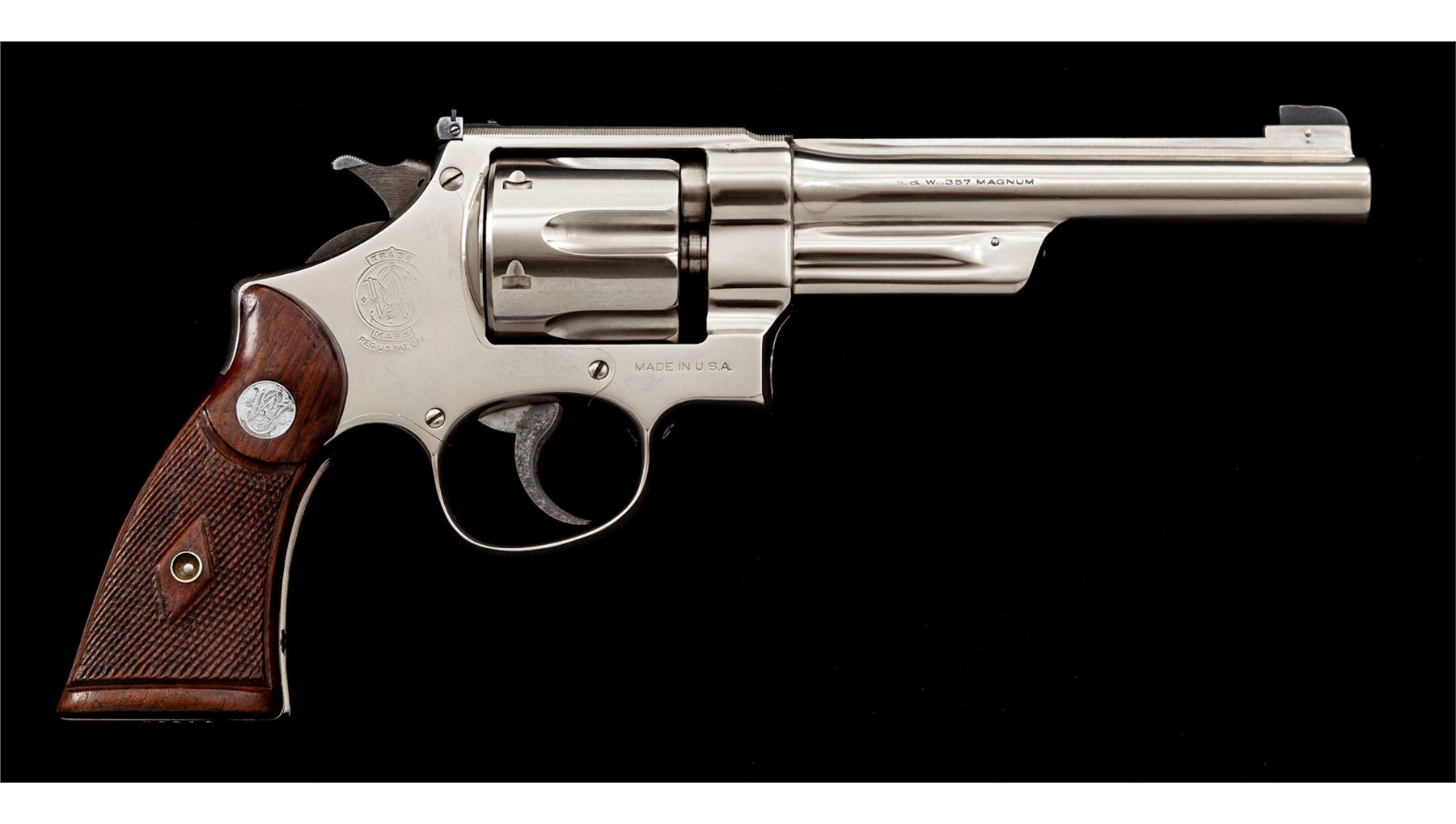 Smith & Wesson Registered Magnum Double Action Revolver, #54471, .357 mag. cal., 6'' barrel, nickel finish, non-matching factory checkered S&W Magna grips, gold bead front and adjustable rear sight, with matching numbered cylinder and barrel. Magnum Registration number 3226 marked inside of crane. Shipped Nov. 19, 1937, to Block Bros., Selma, AL, with factory letter signed by S&W Historian Roy G. Jinks. Factory letter verifies finish, barrel length, and grips. Revolver was refinished in August of 1978, as indicated by the marks under the grips. Considered scarce with only 174 mfg'd in nickel. Condition is excellent as factory refinished, retaining approx. 98%+ slightly toning nickel. Some discoloring to case-colored trigger. Grips and action are excellent, bore is bright. Est.: $4,500-$6,500. (C&R/PPT)