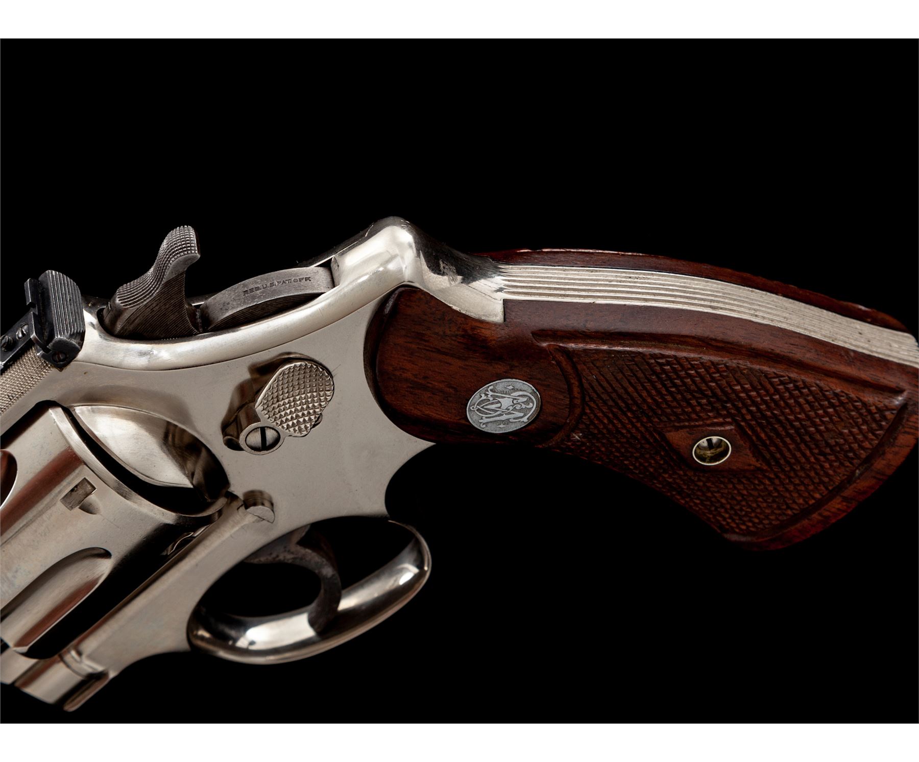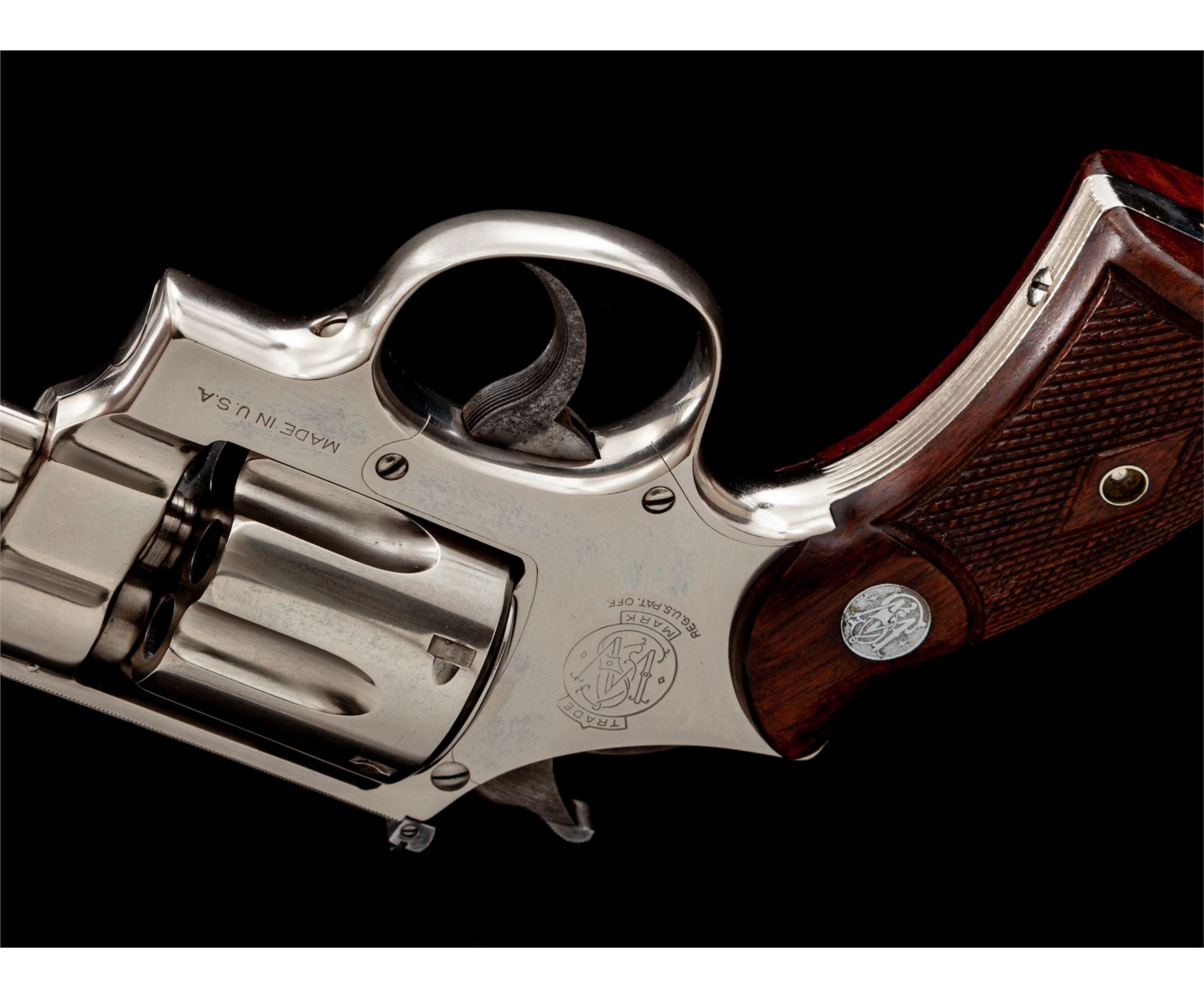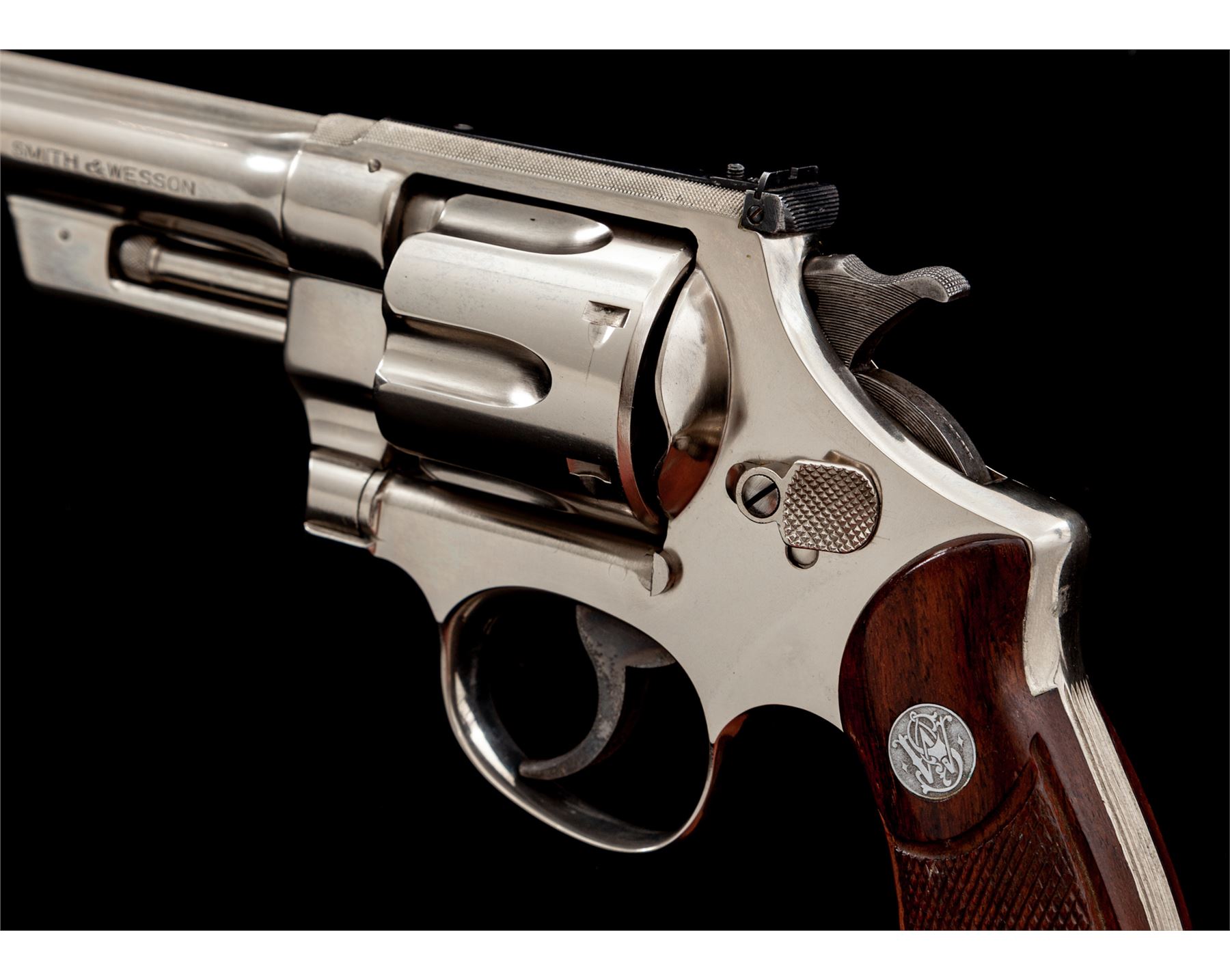 Smith & Wesson Registered Magnum Double Action Revolver, #54471, .357 mag. cal., 6'' barrel, nickel finish, non-matching factory checkered S&W Magna grips, gold bead front and adjustable rear sight, with matching numbered cylinder and barrel. Magnum Registration number 3226 marked inside of crane. Shipped Nov. 19, 1937, to Block Bros., Selma, AL, with factory letter signed by S&W Historian Roy G. Jinks. Factory letter verifies finish, barrel length, and grips. Revolver was refinished in August of 1978, as indicated by the marks under the grips. Considered scarce with only 174 mfg'd in nickel. Condition is excellent as factory refinished, retaining approx. 98%+ slightly toning nickel. Some discoloring to case-colored trigger. Grips and action are excellent, bore is bright. Est.: $4,500-$6,500. (C&R/PPT)