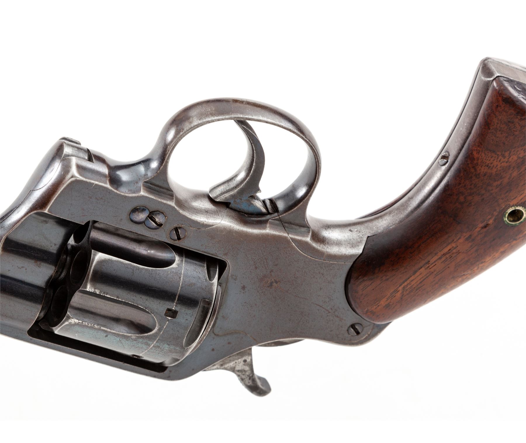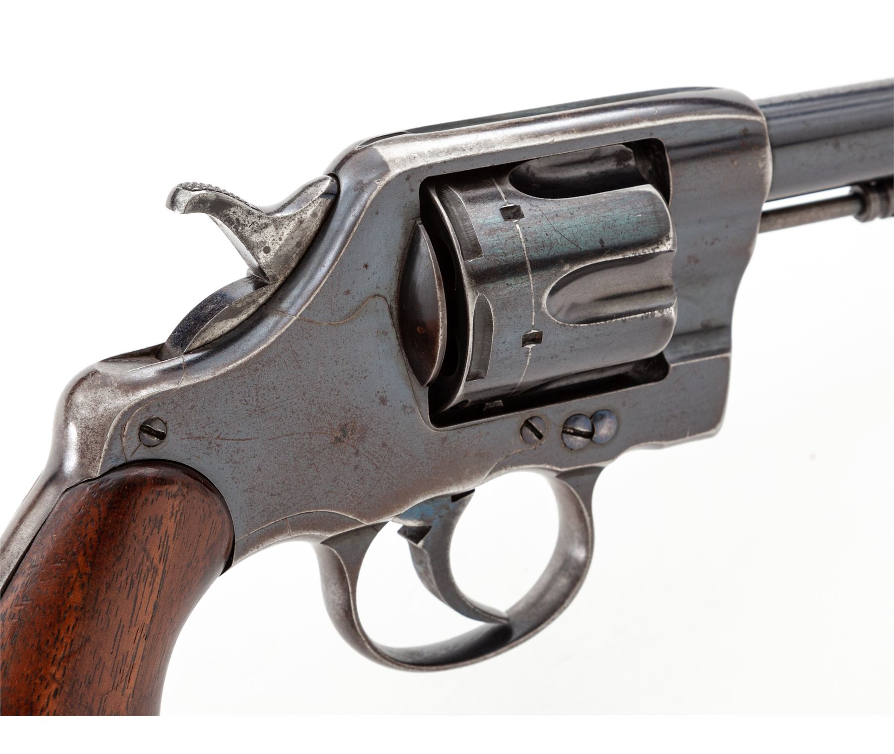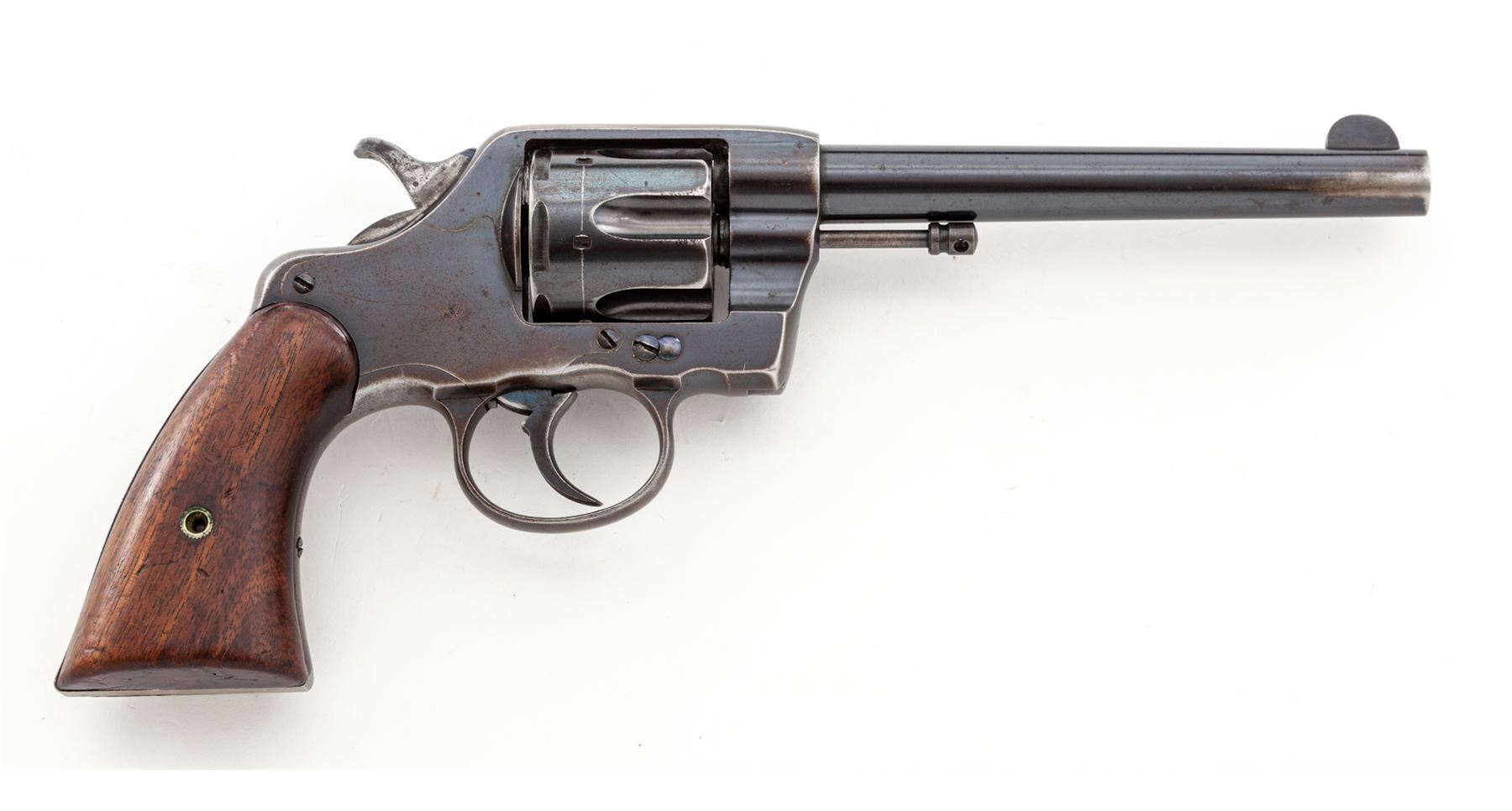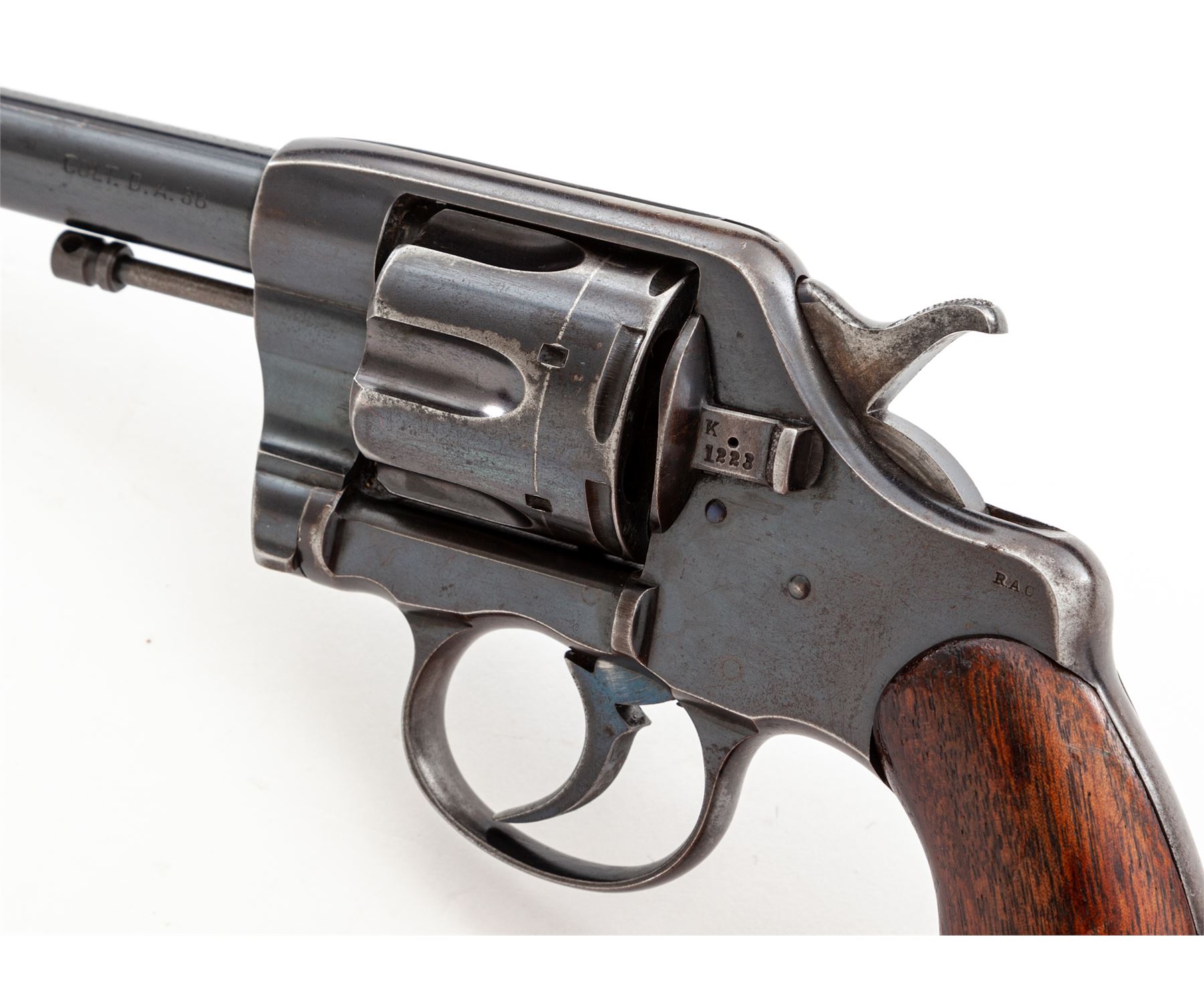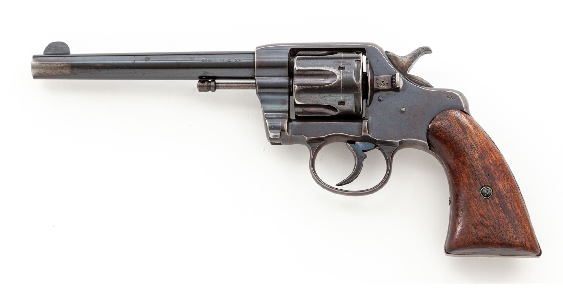 Colt Model of 1895 Double Action Cartridge Revolver, #1223, .38 Colt CF cal., 6'' round barrel marked on top ahead of juncture with frame: ''Colt's Pt. F.A. Mfg. Co., Hartford, CT. U.S.A./Patented Aug. 5, 1884, Nov. 6, 88, Mar. 5, 95'' in two lines and ''Colt. D.A. 38'' on left side, fitted with a tall semi-circular blade front sight; 6-shot ''swing-out'' cylinder with short flutes has an ''RAC'' (Rinaldo A. Carr) military inspector's mark on rear face and features automatic cartridge ejection via a sliding cylinder axle; solid frame (with top groove rear sight, sliding cylinder release and integral triggerguard) marked ''RAC'' in matching tiny letters at rear hump on left side and with a tiny ''2'' under left grip; two-piece oil-finished walnut grips (inside left grip marked ''8'' at bottom and with a previous owner's initials ''GS''). Mfg'd 1895, originally with full-blued finish. Serial numbers match on frame, cylinder crane and sliding cylinder release (the latter also marked ''K'' and with a dot); all markings are sharp. Condition is excellent retaining approx. 80% glossy original deep Colt blue overall, the missing finish confined primarily to the gripstraps and triggerguard bow but also a patch at left-side muzzle, on right frame and general highpoint wear. Grips show a few minor dings but are solid and smooth. Action is crisp in both single- and double-actions; bore is clean with defined rifling. This revolver presents somewhat of an enigma, as it bears the ''RAC'' military inspector's marks and military style plain walnut grips; but no Army or Navy contract markings; likely it was an overrun revolver sold on the civilian market. It is also notable for being one of the earliest swing-out cylinder Colt models. Est.: $500-$700. (Antique)
