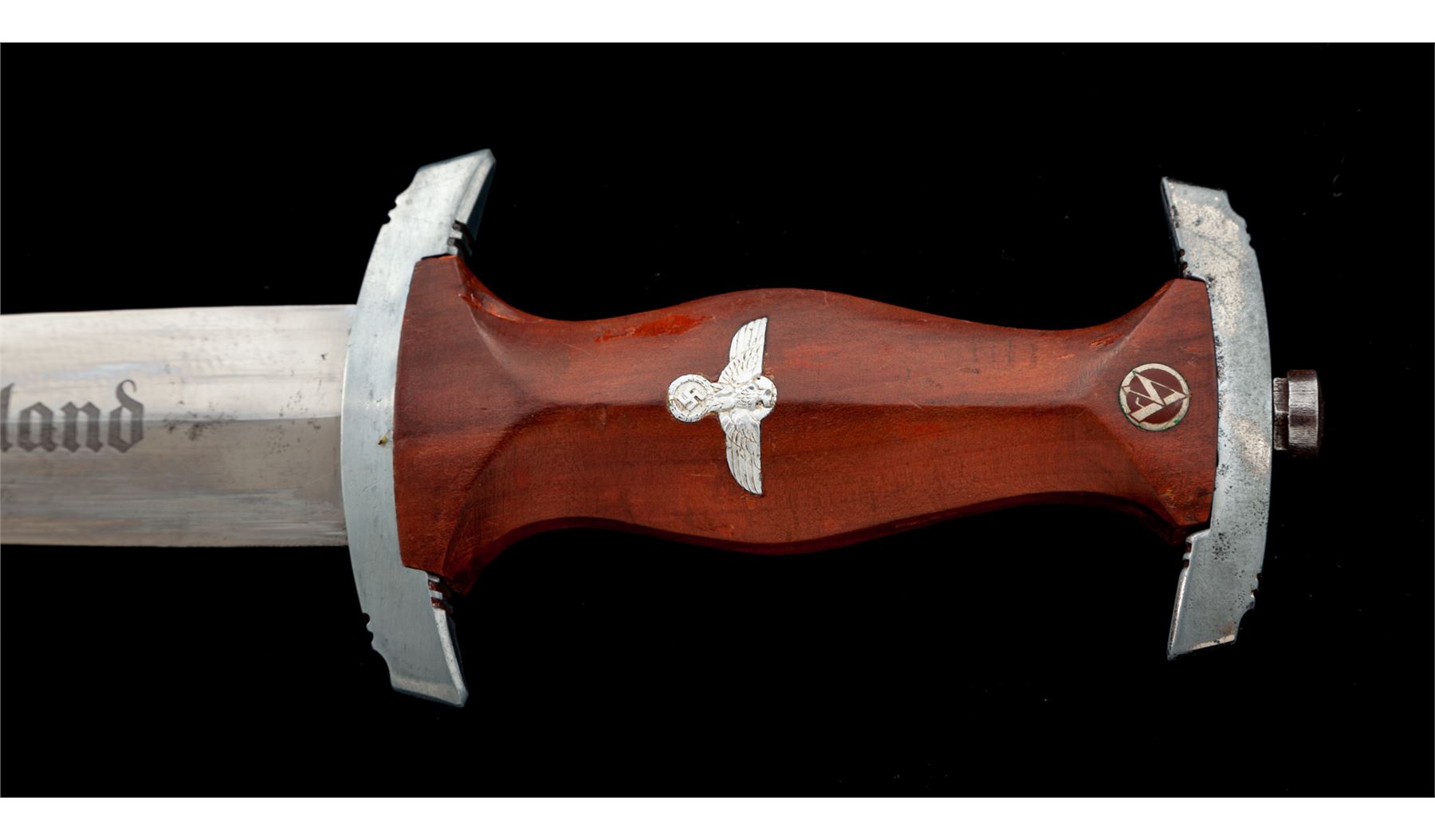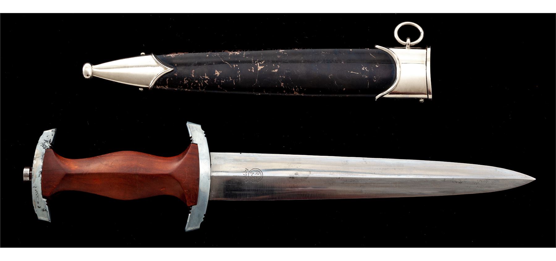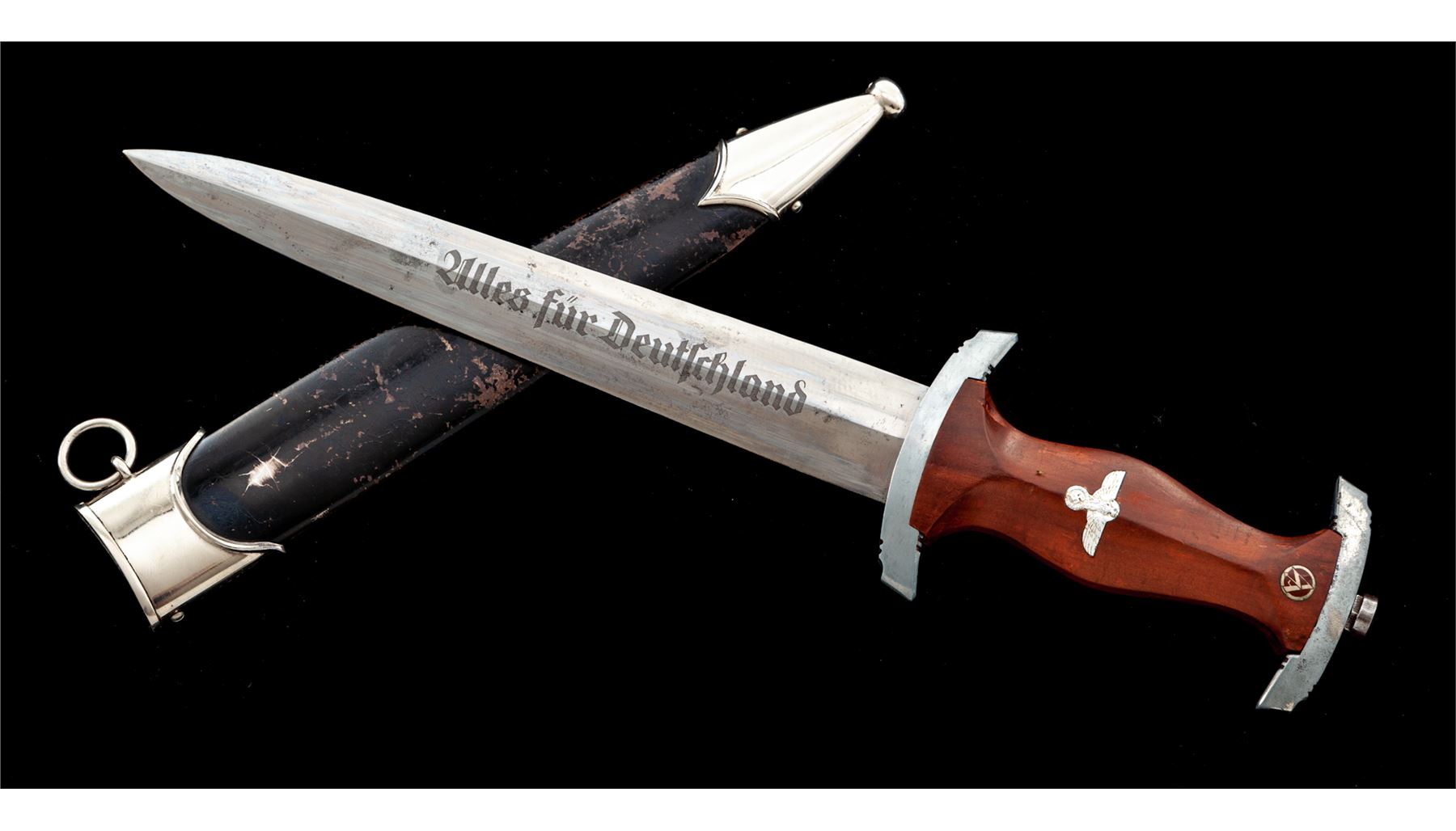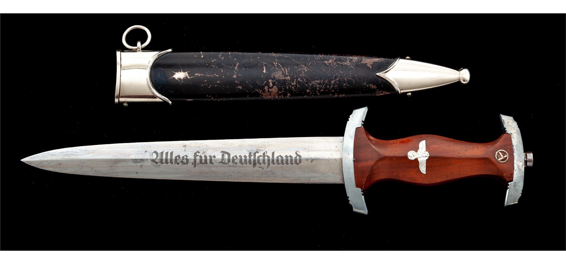 Late Nazi NSKK Dagger RZM, with etched ''ULLES fur DEUTCHLAND'' motto on blade, maker marked on back side ''RZM M7/13'' for Arthur Schuttelhofer & Co. Blade shows numerous runner marks, is bright, and shows a lot of the original cross graining finish. The motto etching is a nice gray color. Wood handle features an aluminum eagle and enameled S/A roundel. Grip has a couple of small dings and scratches. Crossguards are the late pot metal type, which have lost some of their bright finish. Scabbard has nickel silver fittings in very good shape. Black painted finish on the scabbard shows wear, scratches, and crazing under the paint. Blade length is 8.75'', overall length is 14-5/8''. Est.: $450-$650.
