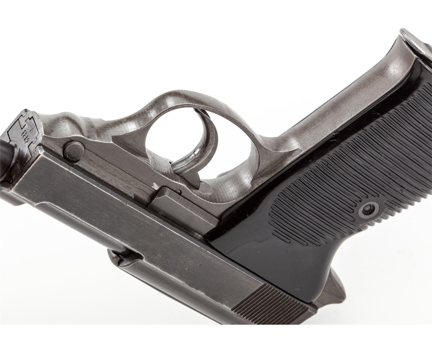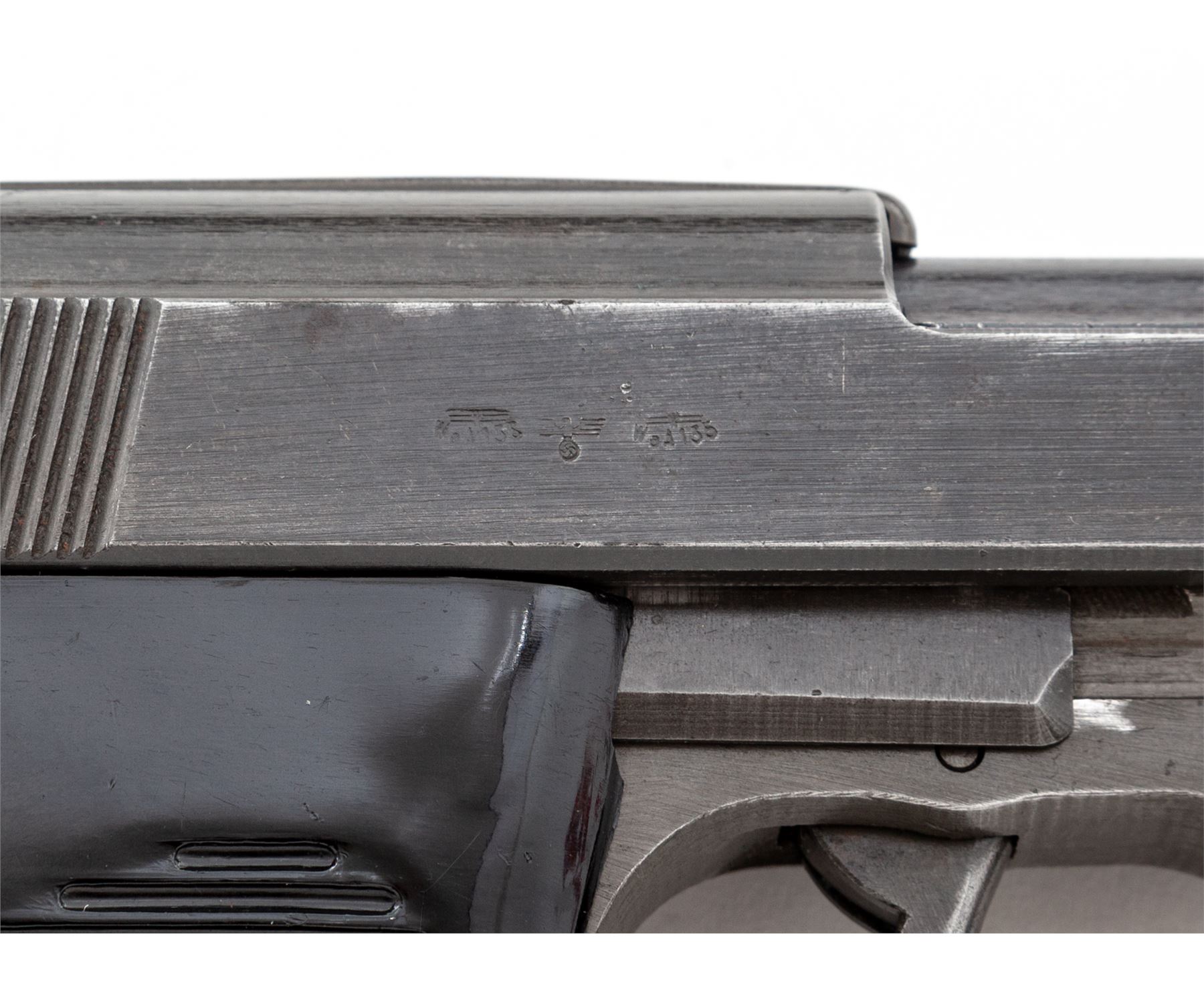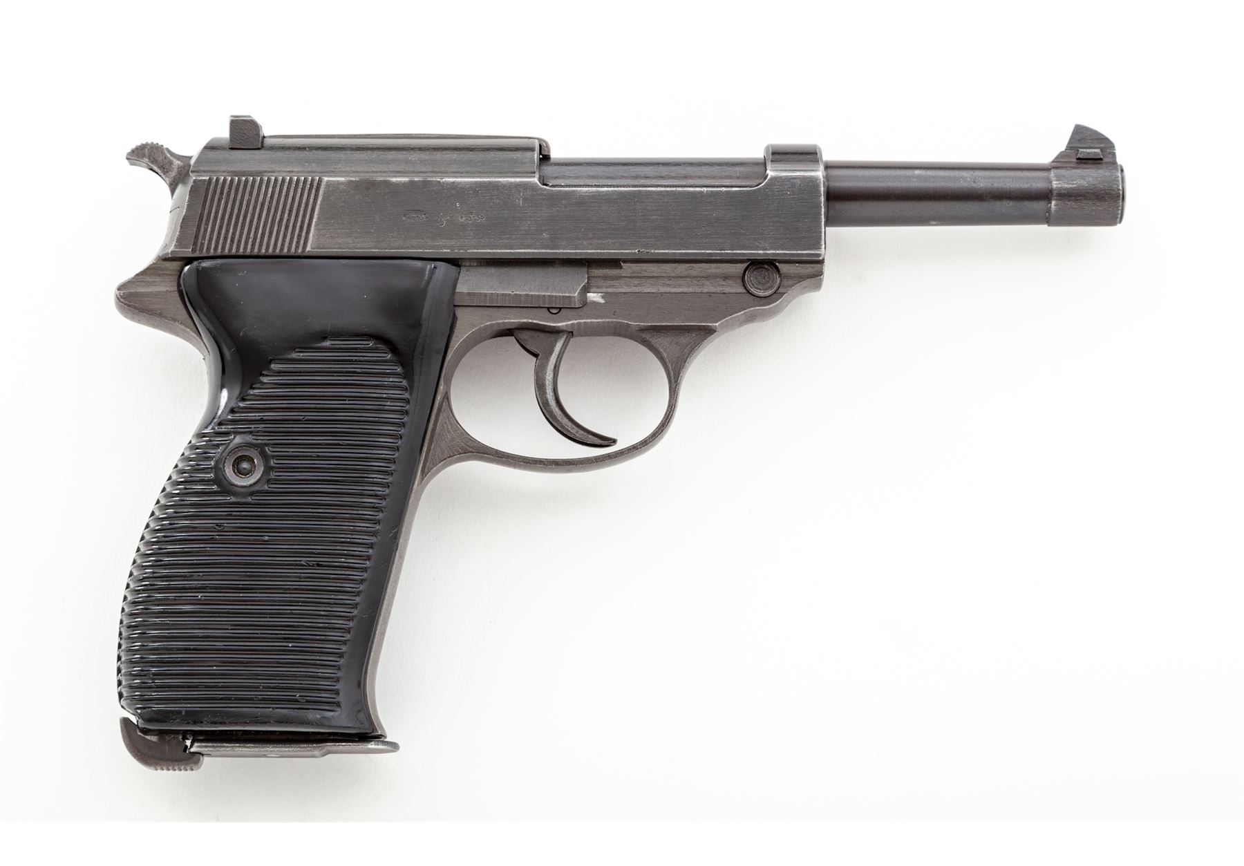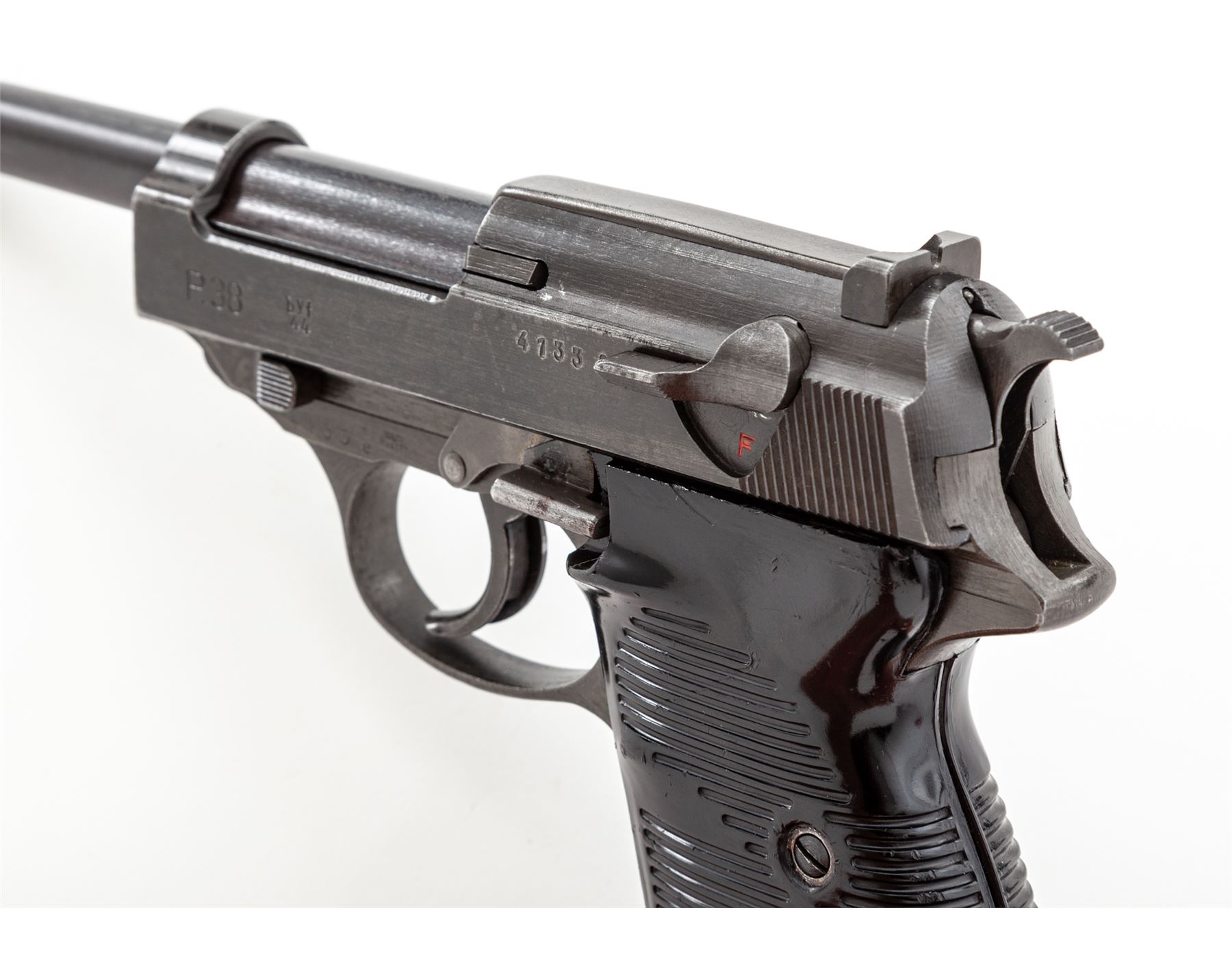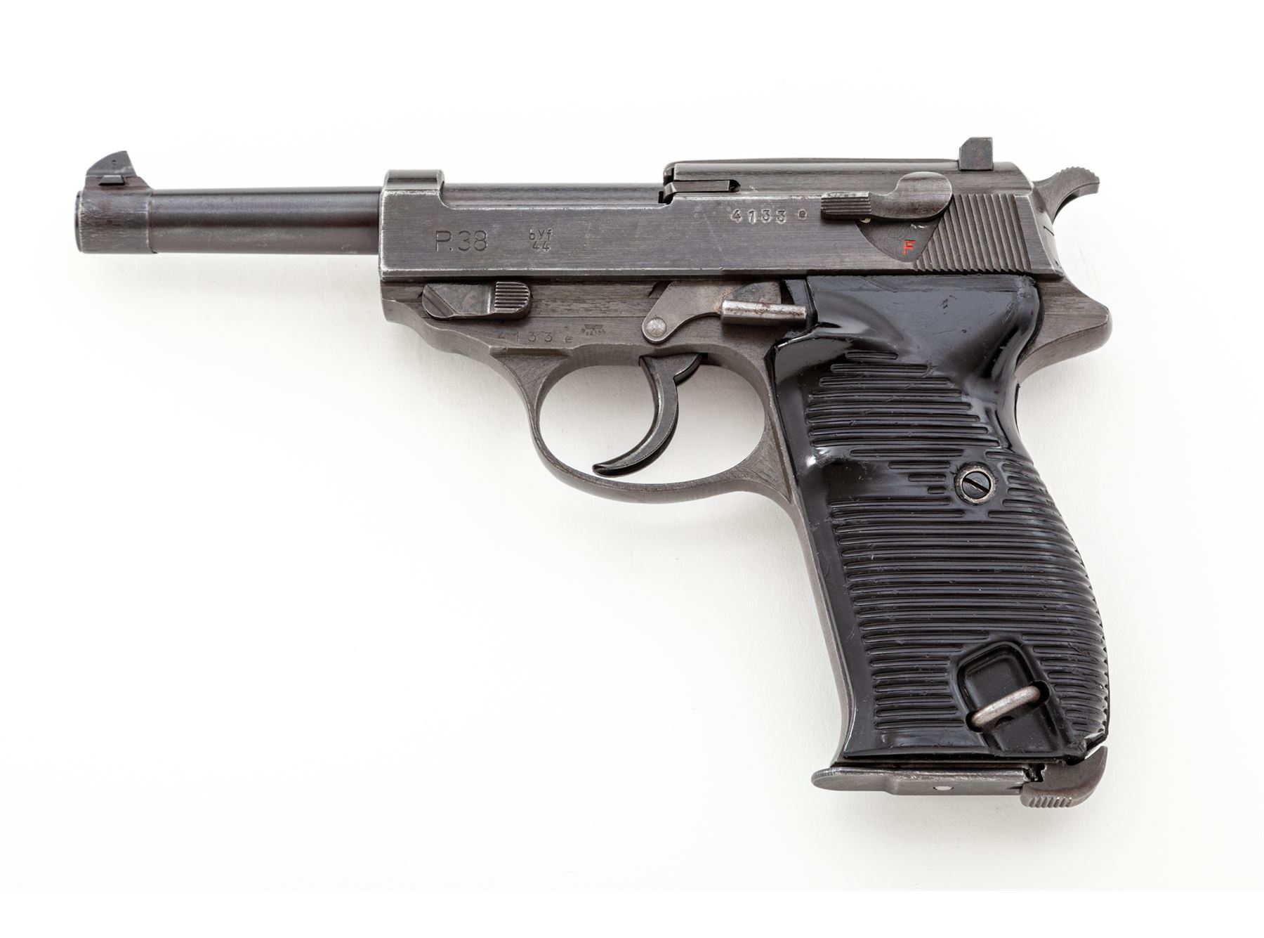 WWII Two-Tone German P.38 Semi-Automatic Pistol, by Mauser (byf-44), #4133e, 9mm, 4.75'' barrel, blue and phosphate finish, dark phenolic resin grips, with one wartime magazine marked ''P38U/jvd''. Matching numbered slide, frame, barrel, and locking block, with ''(eagle)/A135'' ampt. Condition is about fine retaining approx. 85% thinning blue with some touchup. Grips are very good with light scuffs and scratches. Action is good, bore is excellent. Magazine with little finish remaining. Est.: $800-$1,200. (C&R)