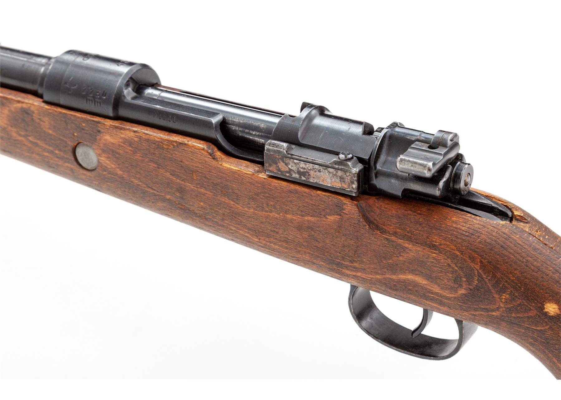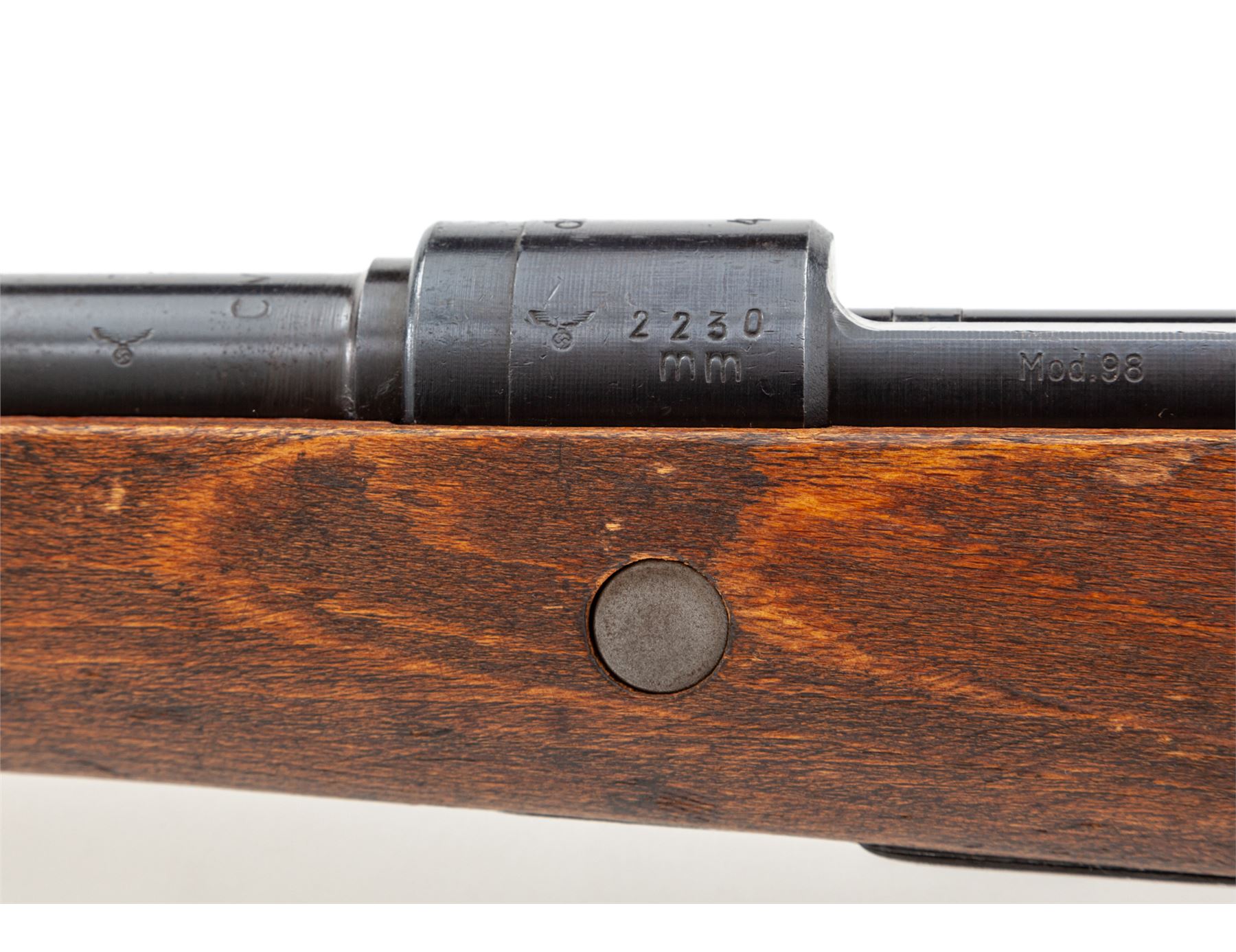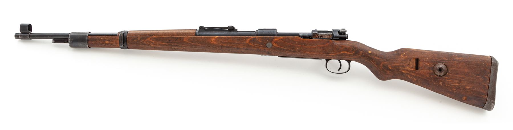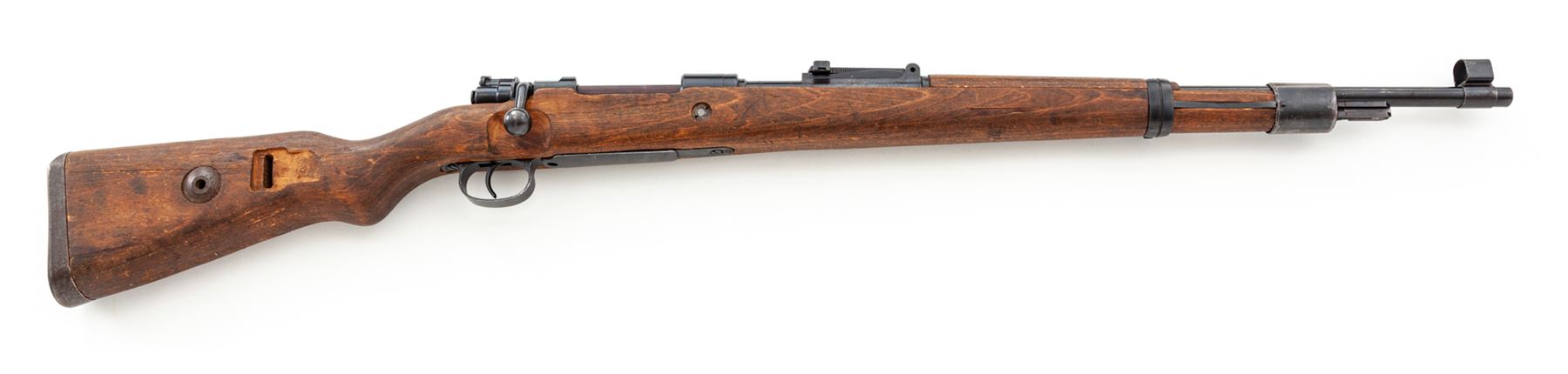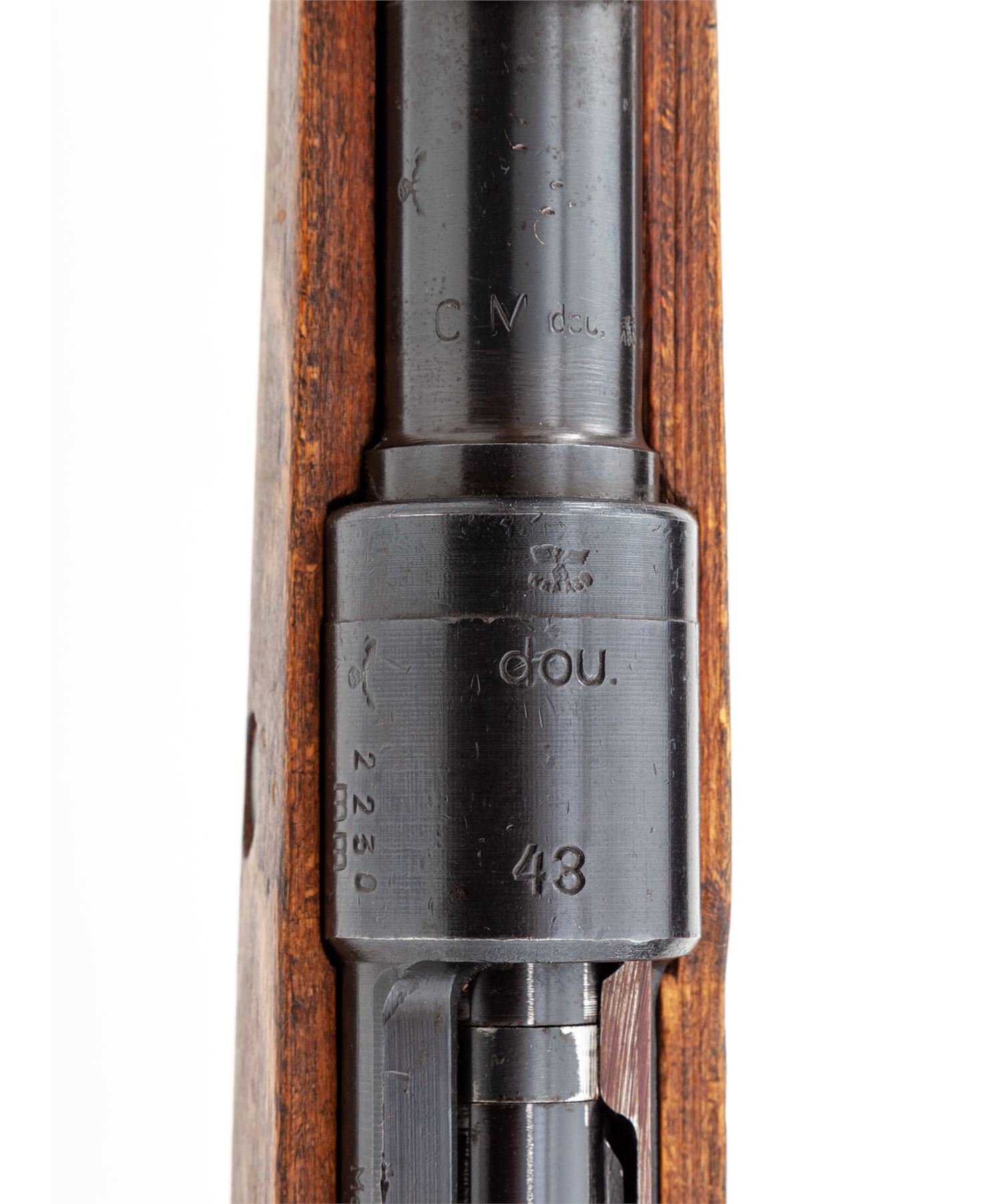 German Kar98k Mauser Bolt Action Rifle, #2230, 8x57mm cal., 23.6'' barrel, blued finish, laminated stock with cupped buttplate, inverted ''V'' front sight with hood and adjustable tangent rear sight. Marked on receiver ring ''dou/43'', and on left side receiver rail ''Mod.98''. Eagle stamps on left side of barrel and receiver ring. Barrel stamped ''CM'', and ''dou''. Eagle waffenampt stamp on right side of buttstock. No cleaning rod. Matching numbers. Bolt closes on empty magazine. Condition overall is very good with approx. 90% of the reblued finish remaining on the metal (no finish on buttplate), with a mottled color to the bolt latch and browning to the front band, buttplate, etc. Stock has several delamination cracks and an overall dry appearance with some darkening and light handling marks. Action is smooth, bright bore is excellent. No visible import stamps. Est.: $600-$800. (C&R)