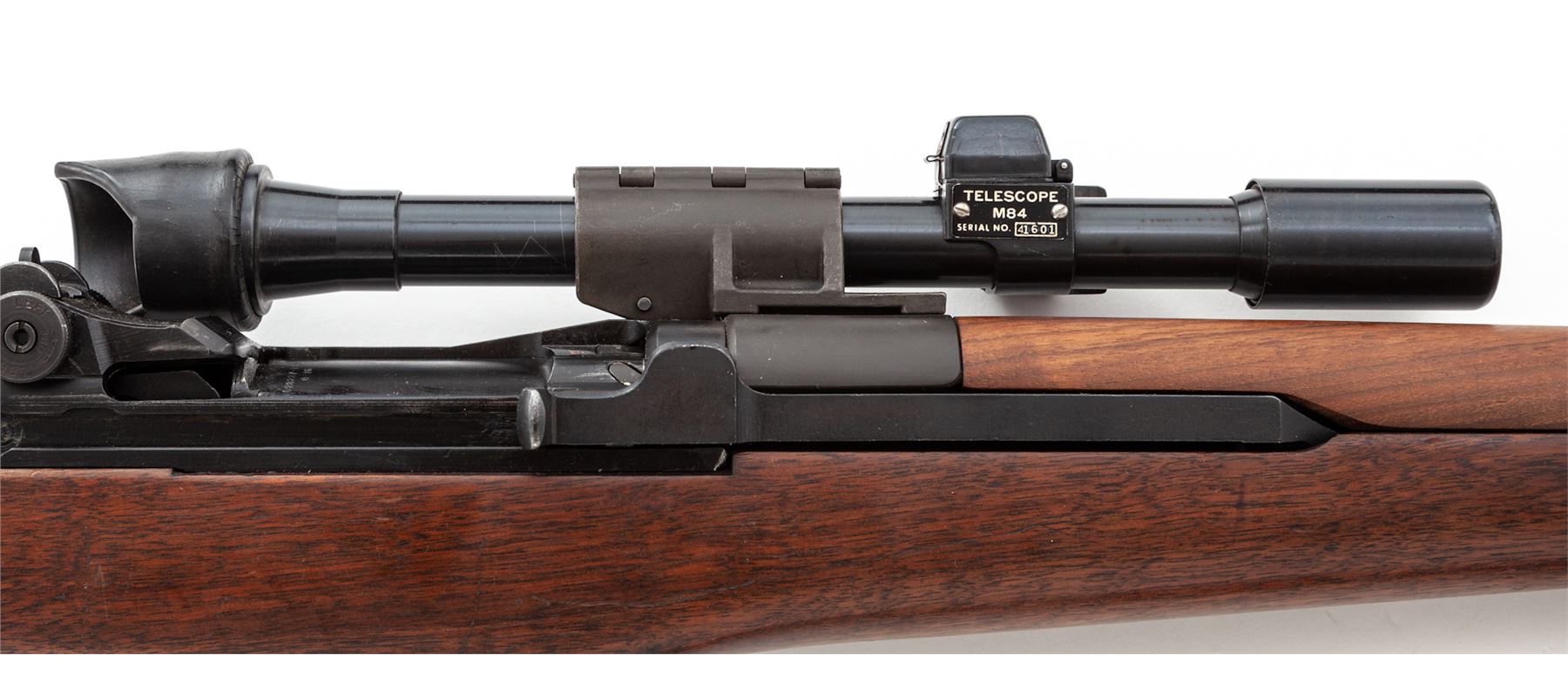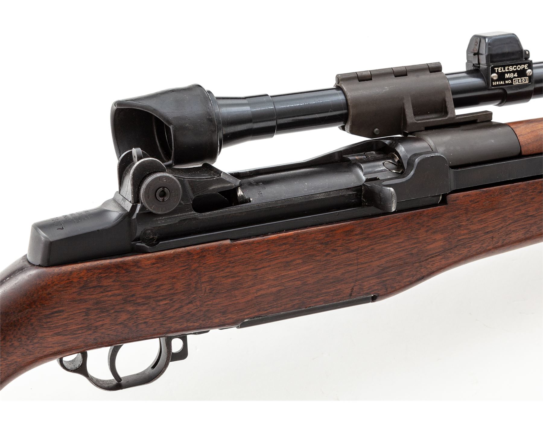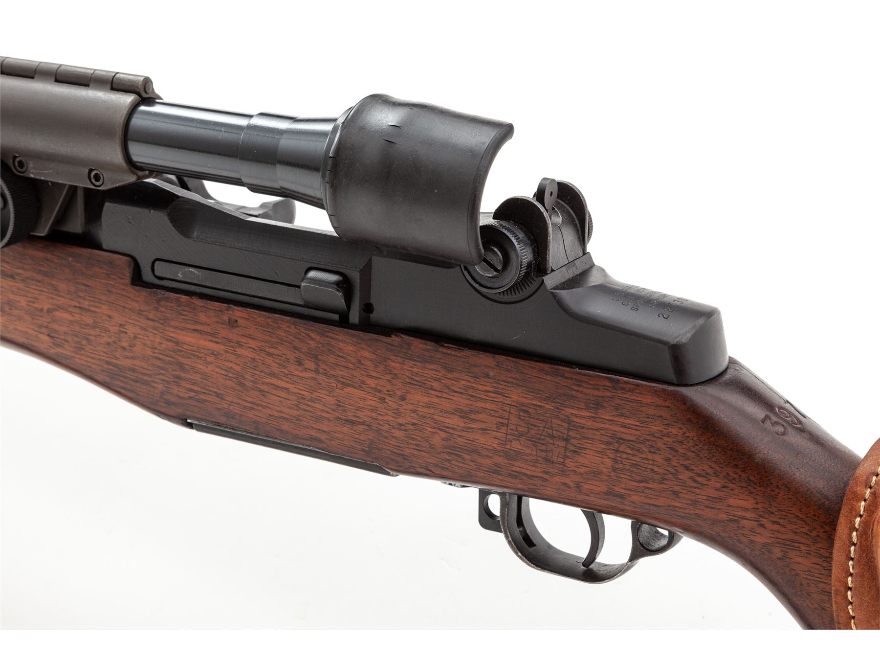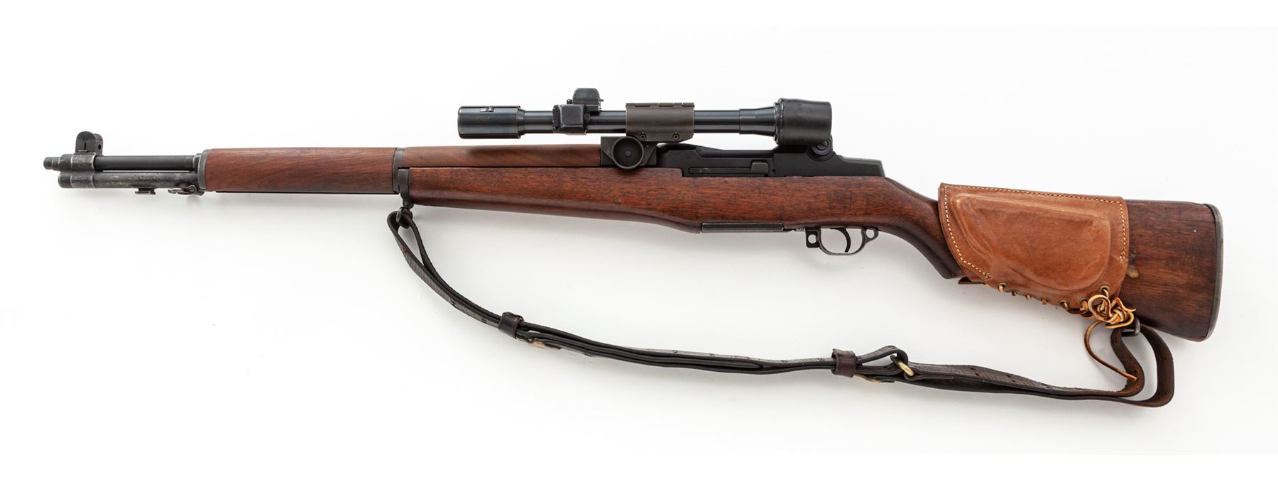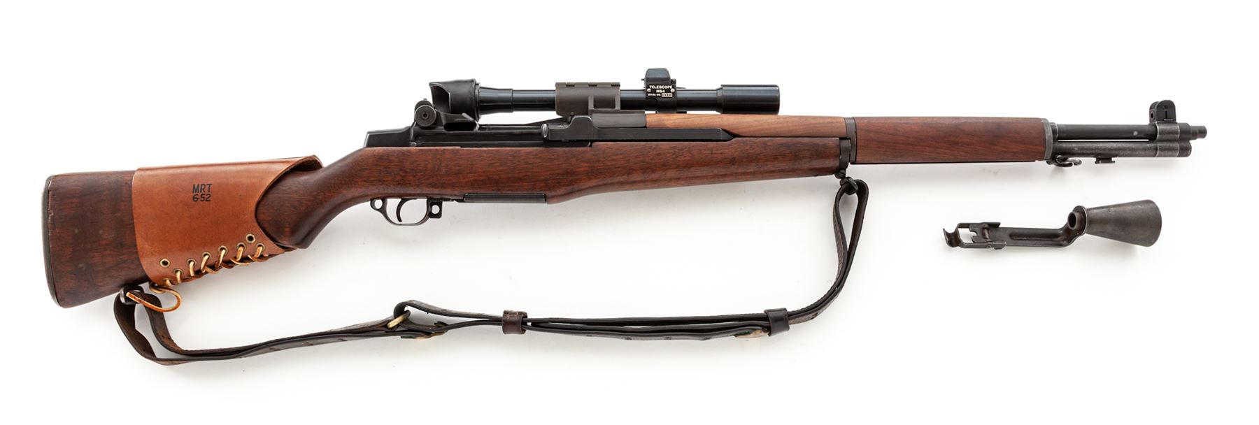 U.S. M1-D Semi-Automatic Sniper Rifle, by Springfield, #2273077, .30-06 cal., 24'' barrel marked ''S-A-2-52'', dark manganese phosphate finish, SA/GAW cartouched walnut stock with small Ordnance wheel, brown leather MRT 6-52 marked leather cheekpiece, topped with an M84 telescope (#41601) on standard M1-D mount. With WWI era M-1907 sling. M2 flash hider by the Hart Mfg. Co. Condition is excellent as arsenal reworked, with later type parkerizing. Stock with last three digits of serial number stamped at wrist, with light general impressions. Forward and upper handguard were replaced at time of overhaul and are slightly newer. Sling with moderate general overall wear. Good action, mirror bright bore, with clear scope optics. Est.: $2,000-$3,000. (C&R)