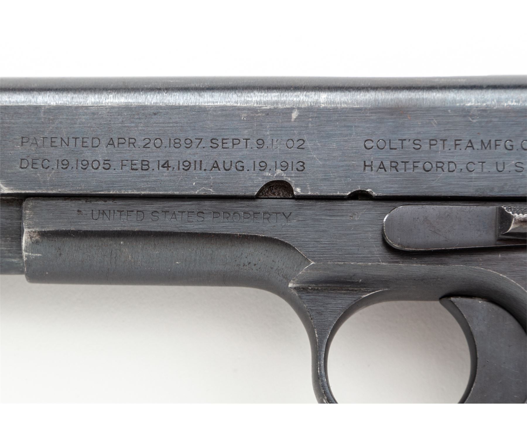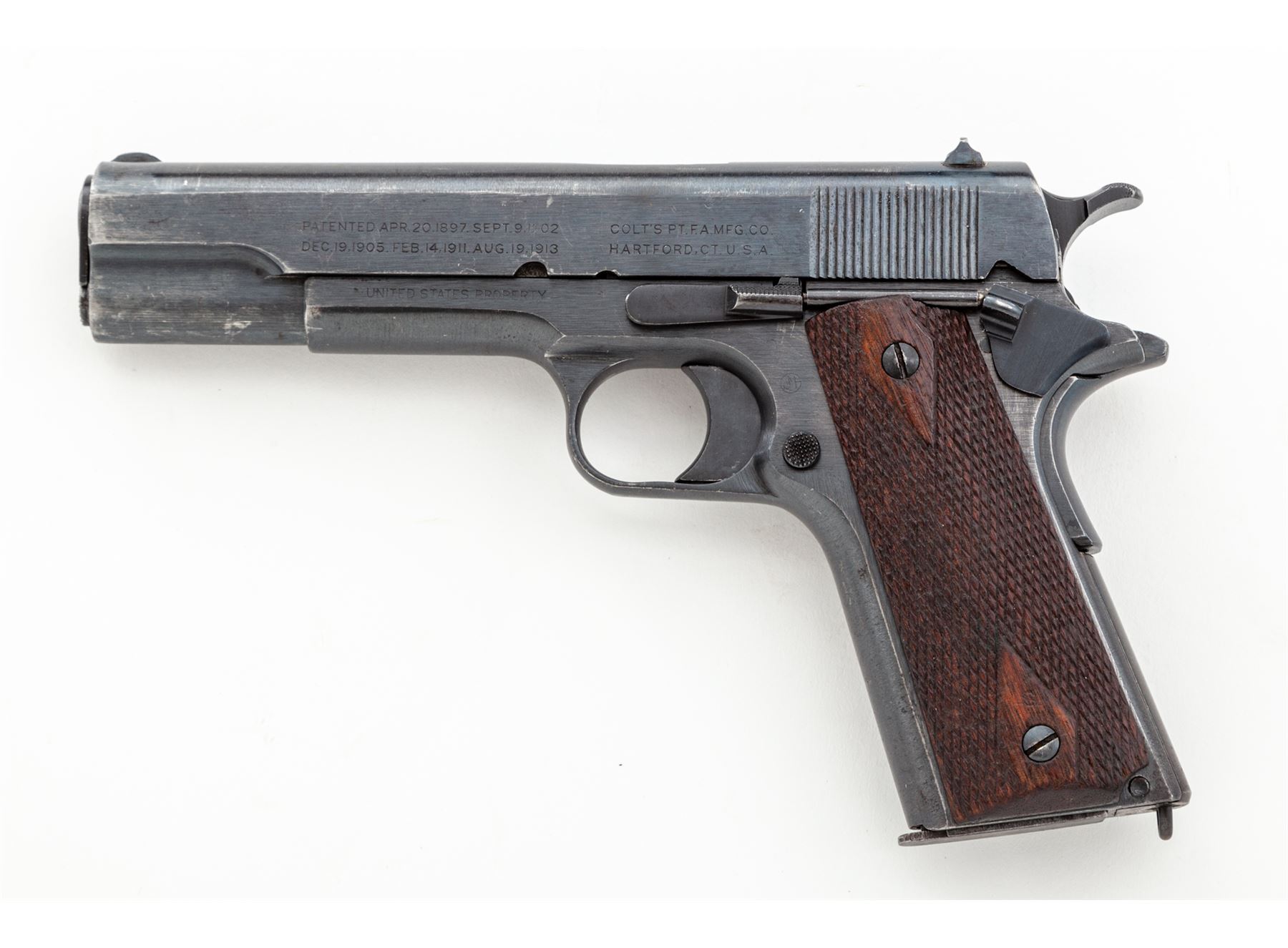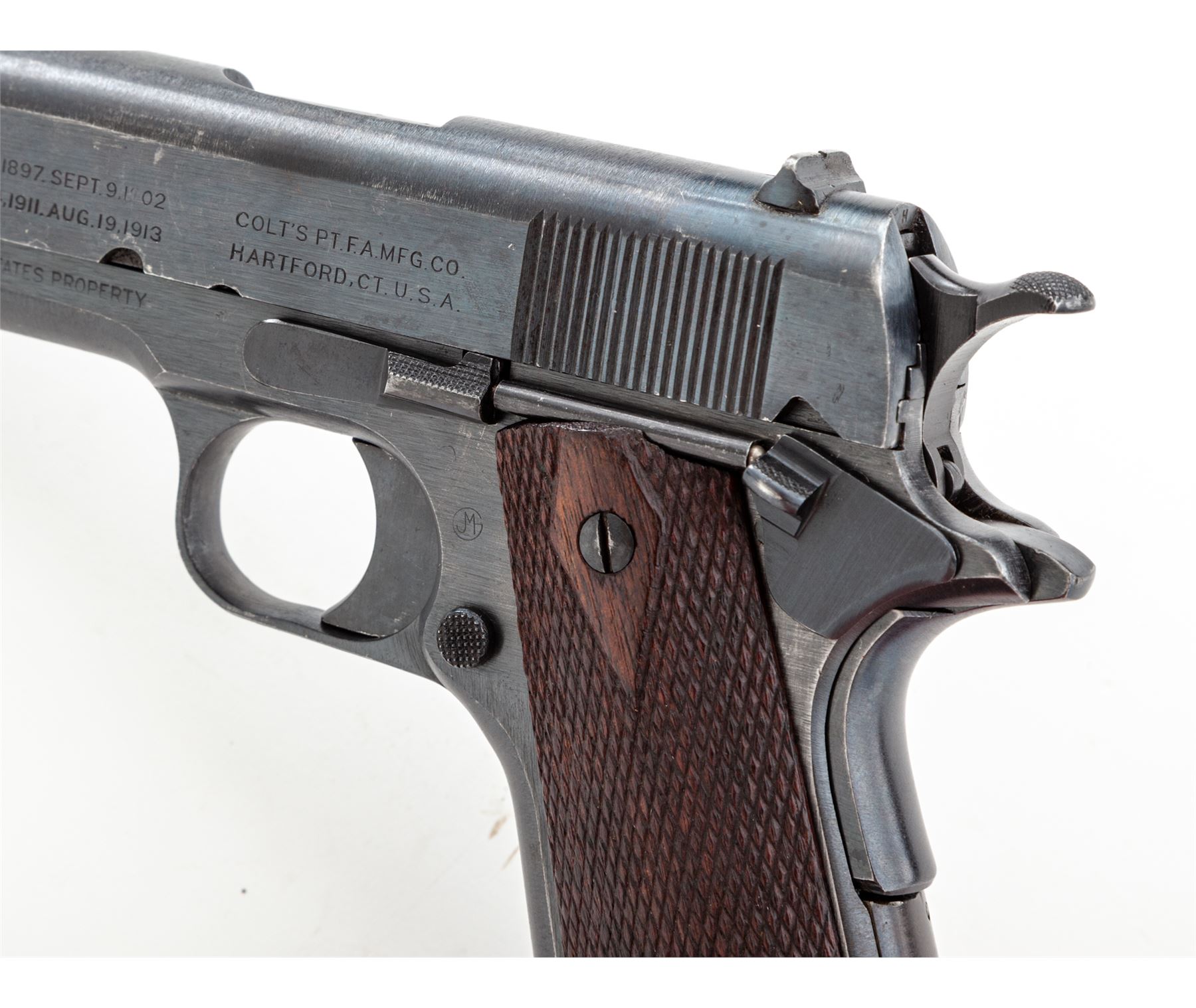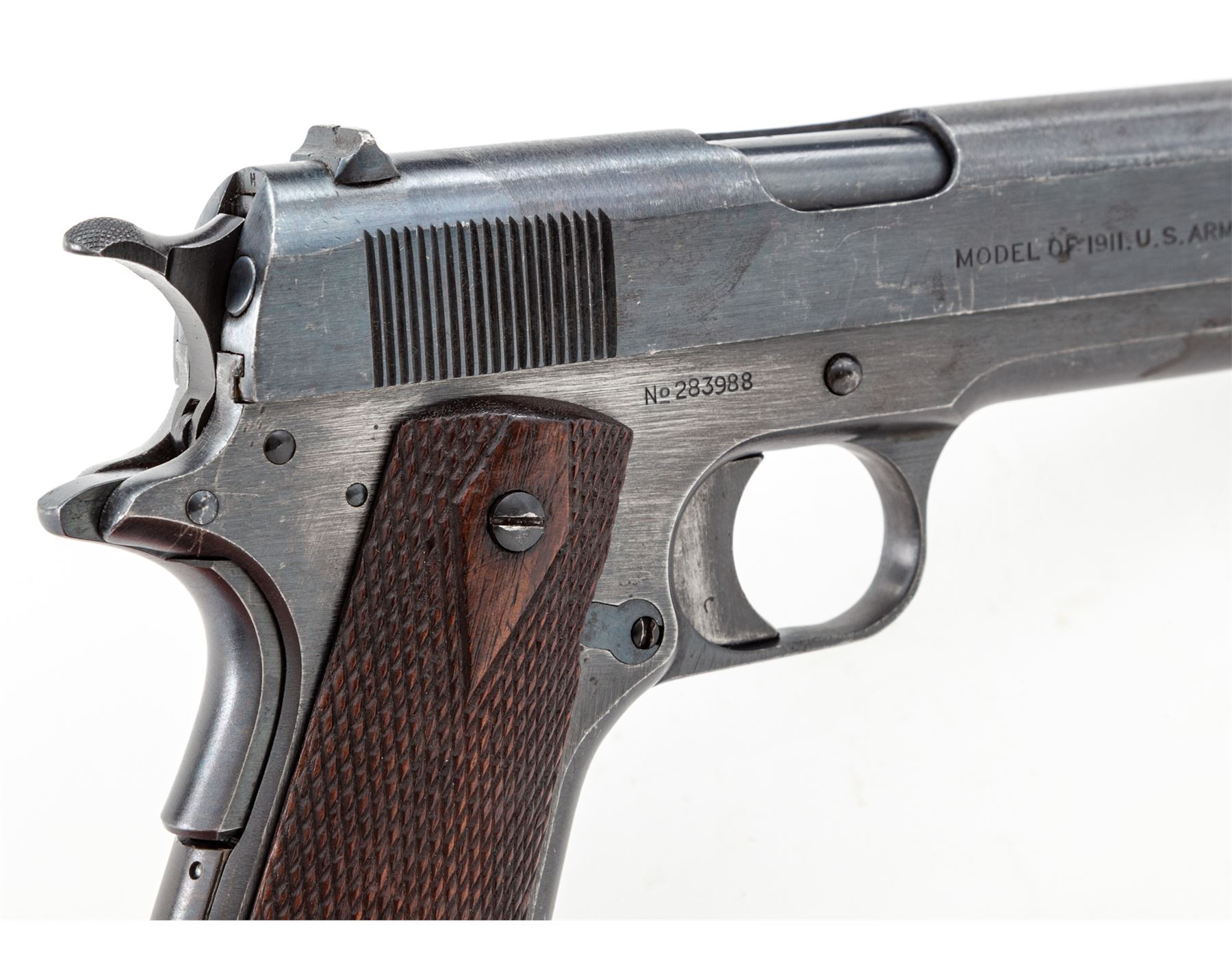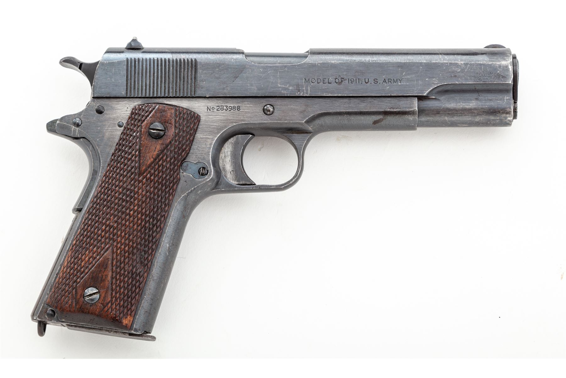 Colt Model 1911 Semi-Automatic Pistol, #283988, .45 ACP cal., 5'' correct ''PH'' marked barrel, blue finish, diamond checkered walnut grips, with one correct two-tone loopless magazine. Mfg'd 1918. Condition is fine retaining approx. 90% generally thinning blue. Evidence of excess cleaning to portions of frame and slide. Markings to slide are clear, however, the Rampant Colt logo to rear portion of slide was struck very lightly. Grips show moderate flattening to checkers, most pronounced to left side. Action and bore are excellent. Est.: $1,200-$1,800. (C&R/PPT)