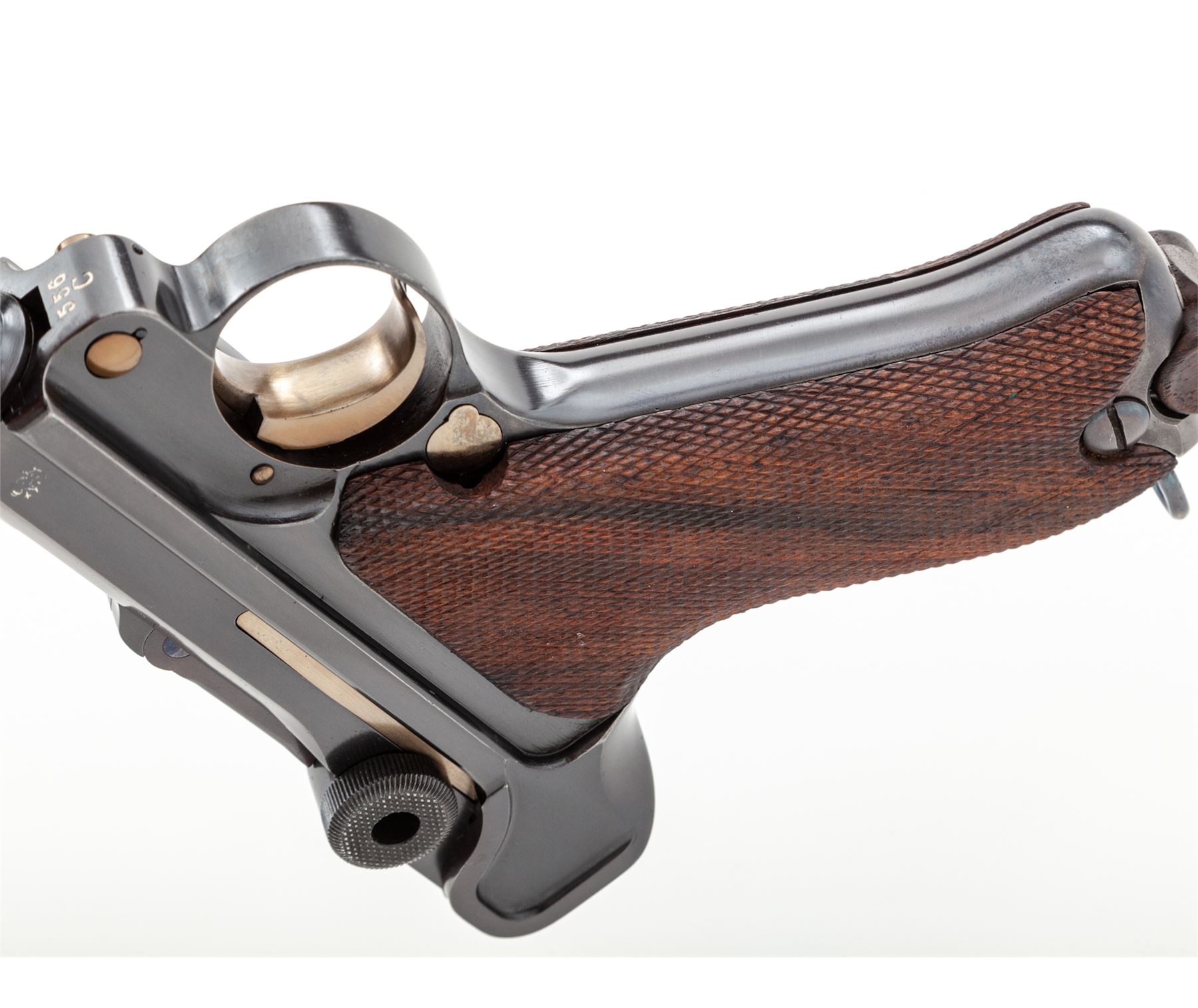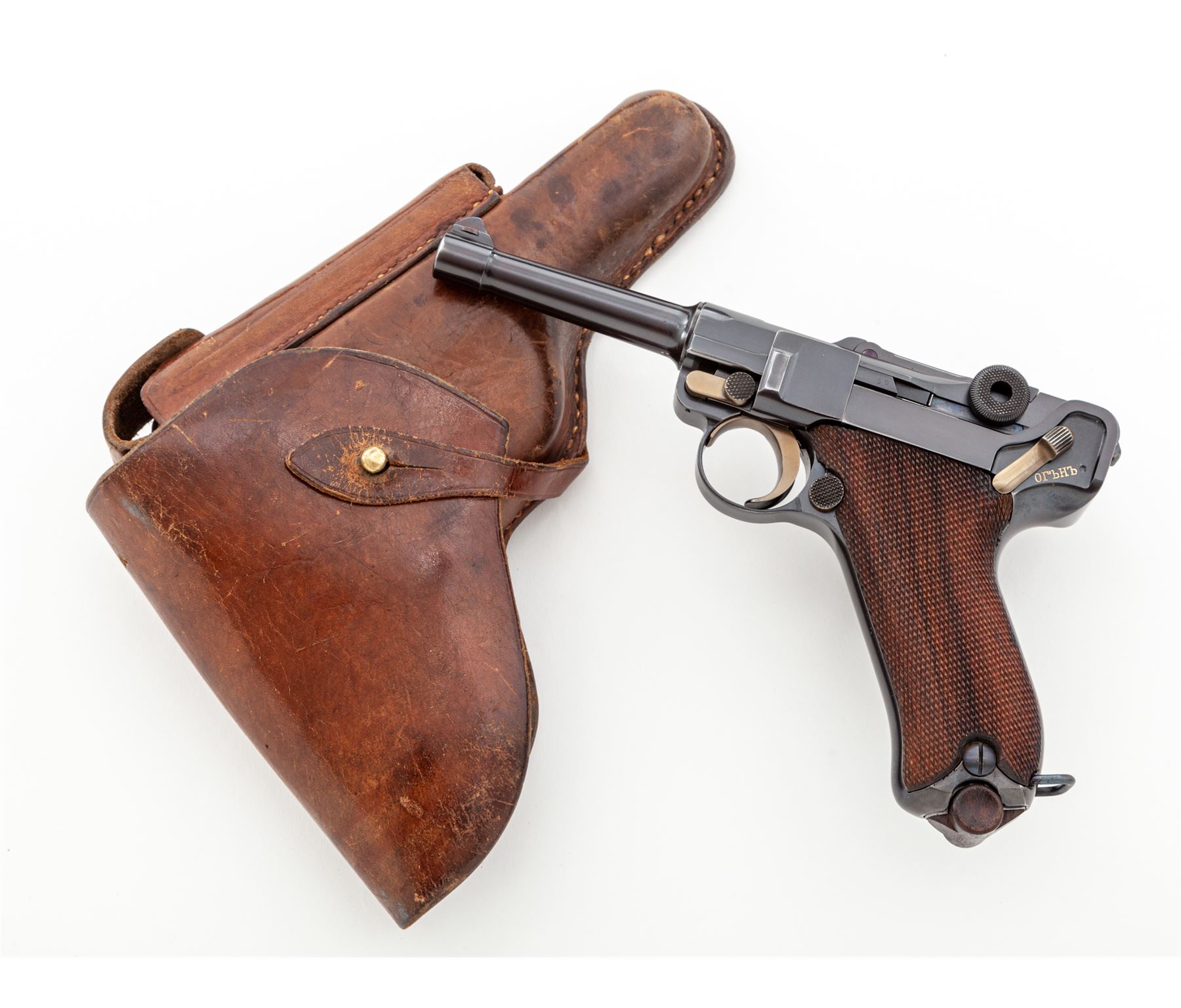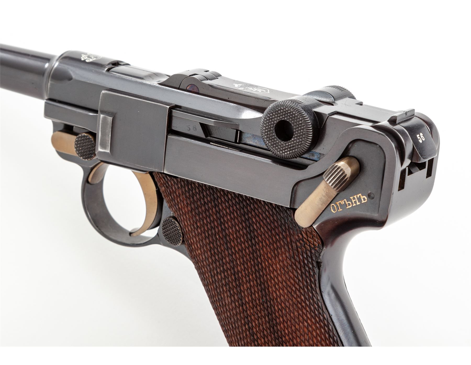 Model 1908 Bulgarian Contract Luger, #556c, 9mm, 4'' barrel, blue finish, straw small parts, factory checkered walnut grips, with tin-plated unmarked walnut based magazine. DWM to chamber area, Bulgarian crest at central toggle link, Cyrillic marked extractor and thumb safety. Lower portion of backstrap features lanyard loop as standard on Bulgarian contract pistols. Originally ordered in 1910, with a total quantity of just 10,000. In brown leather Bulgarian holster. Condition is excellent as professionally restored, retaining approx. 99% of an expertly accomplished blue and straw finish. Grips are excellent, action is crisp, bore is mirror bright. Holster is excellent with minor oil staining and nice tight stitching. Est.: $2,250-$2,750. (C&R)