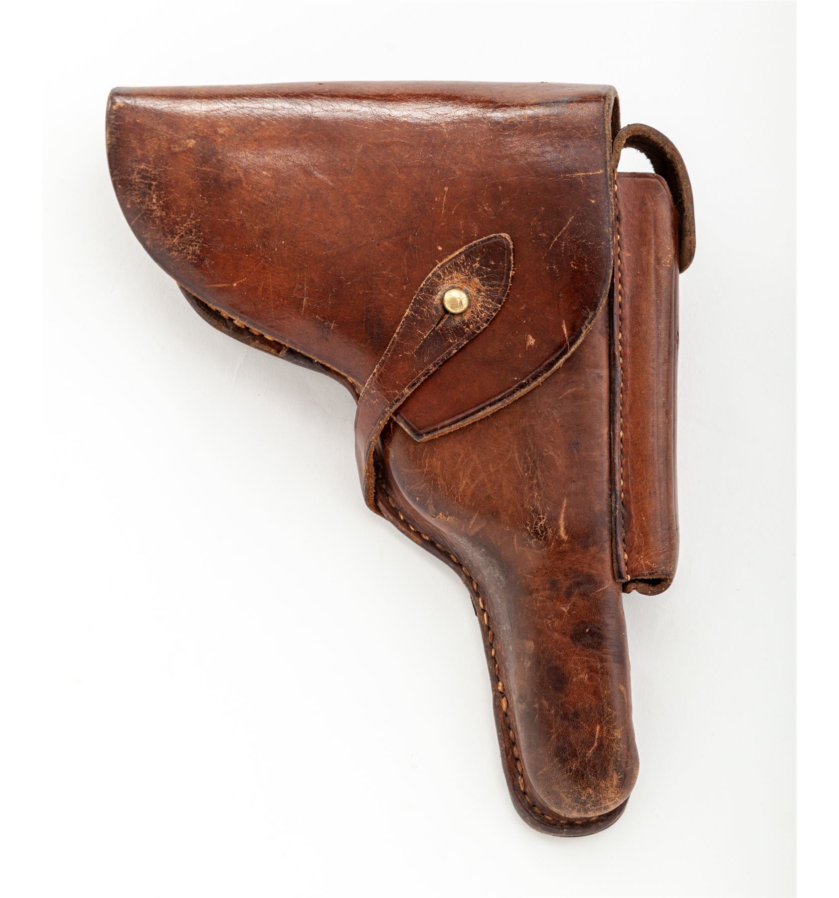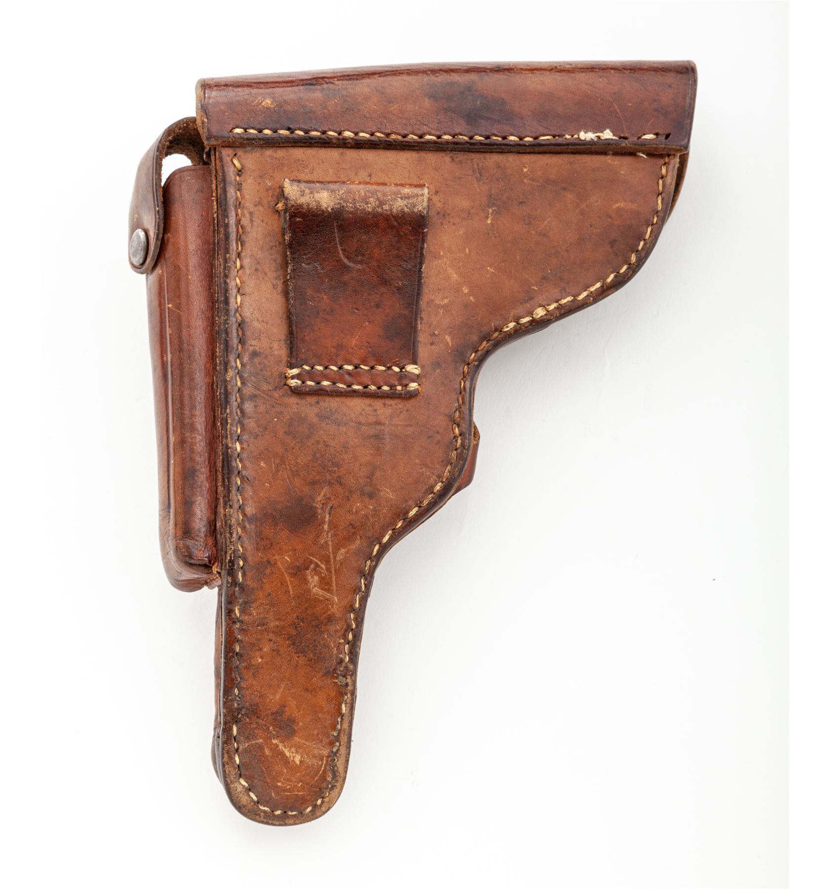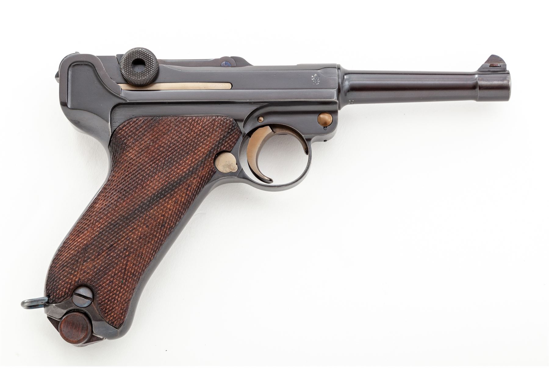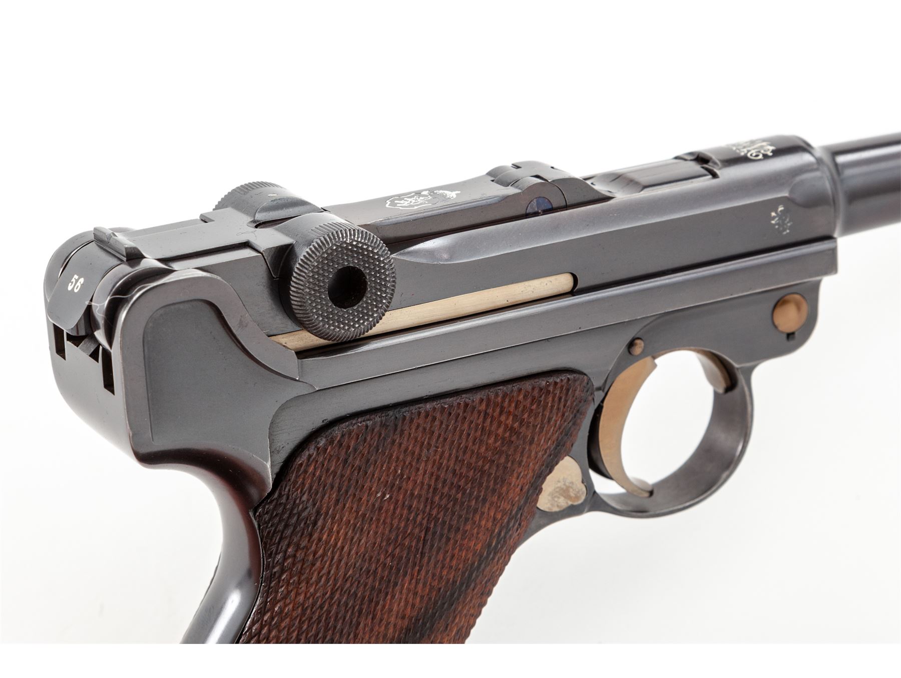 Model 1908 Bulgarian Contract Luger, #556c, 9mm, 4'' barrel, blue finish, straw small parts, factory checkered walnut grips, with tin-plated unmarked walnut based magazine. DWM to chamber area, Bulgarian crest at central toggle link, Cyrillic marked extractor and thumb safety. Lower portion of backstrap features lanyard loop as standard on Bulgarian contract pistols. Originally ordered in 1910, with a total quantity of just 10,000. In brown leather Bulgarian holster. Condition is excellent as professionally restored, retaining approx. 99% of an expertly accomplished blue and straw finish. Grips are excellent, action is crisp, bore is mirror bright. Holster is excellent with minor oil staining and nice tight stitching. Est.: $2,250-$2,750. (C&R)