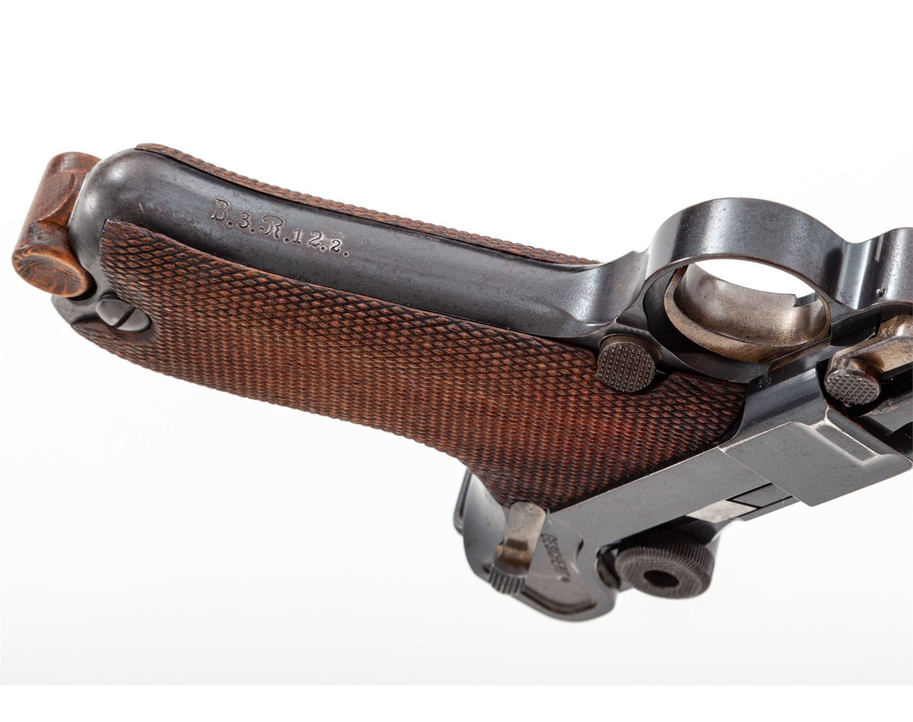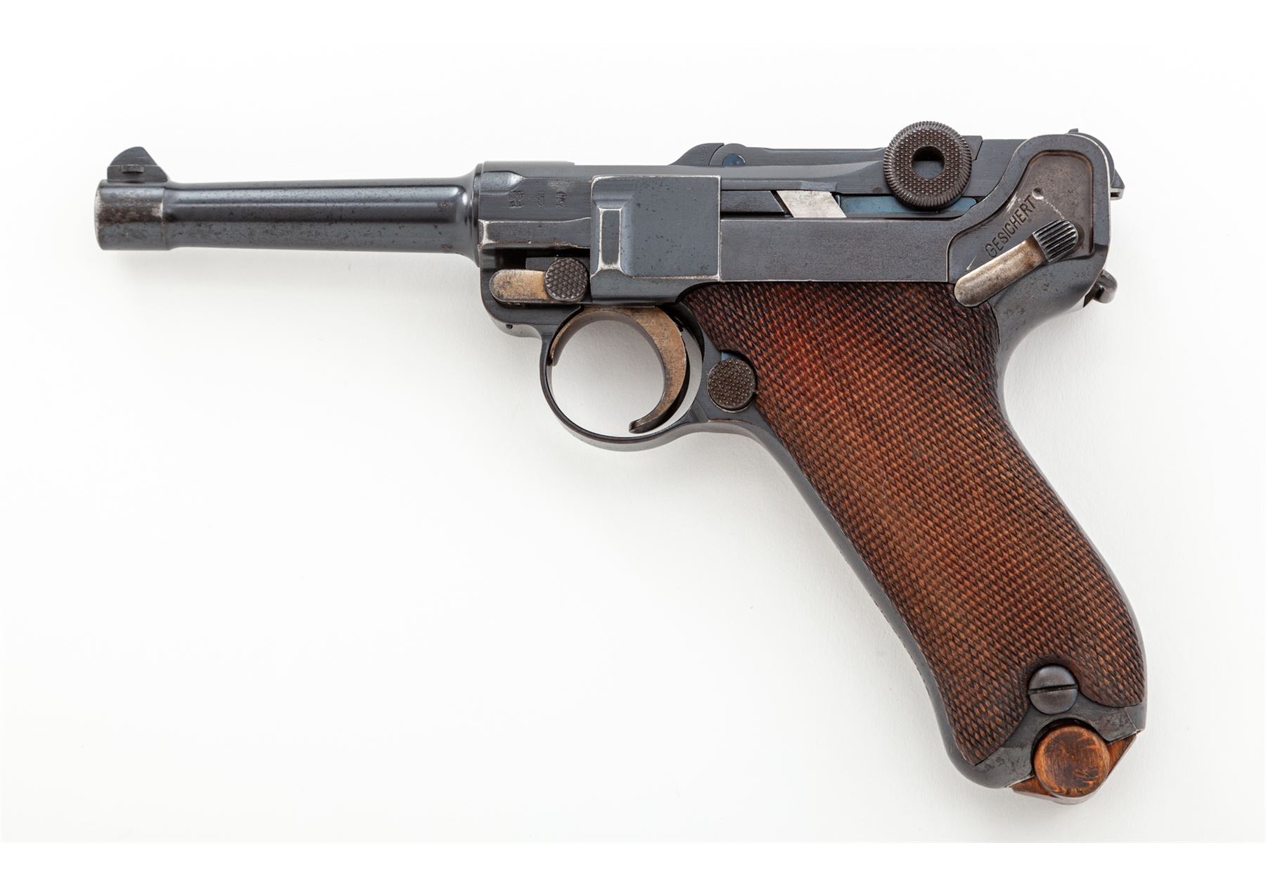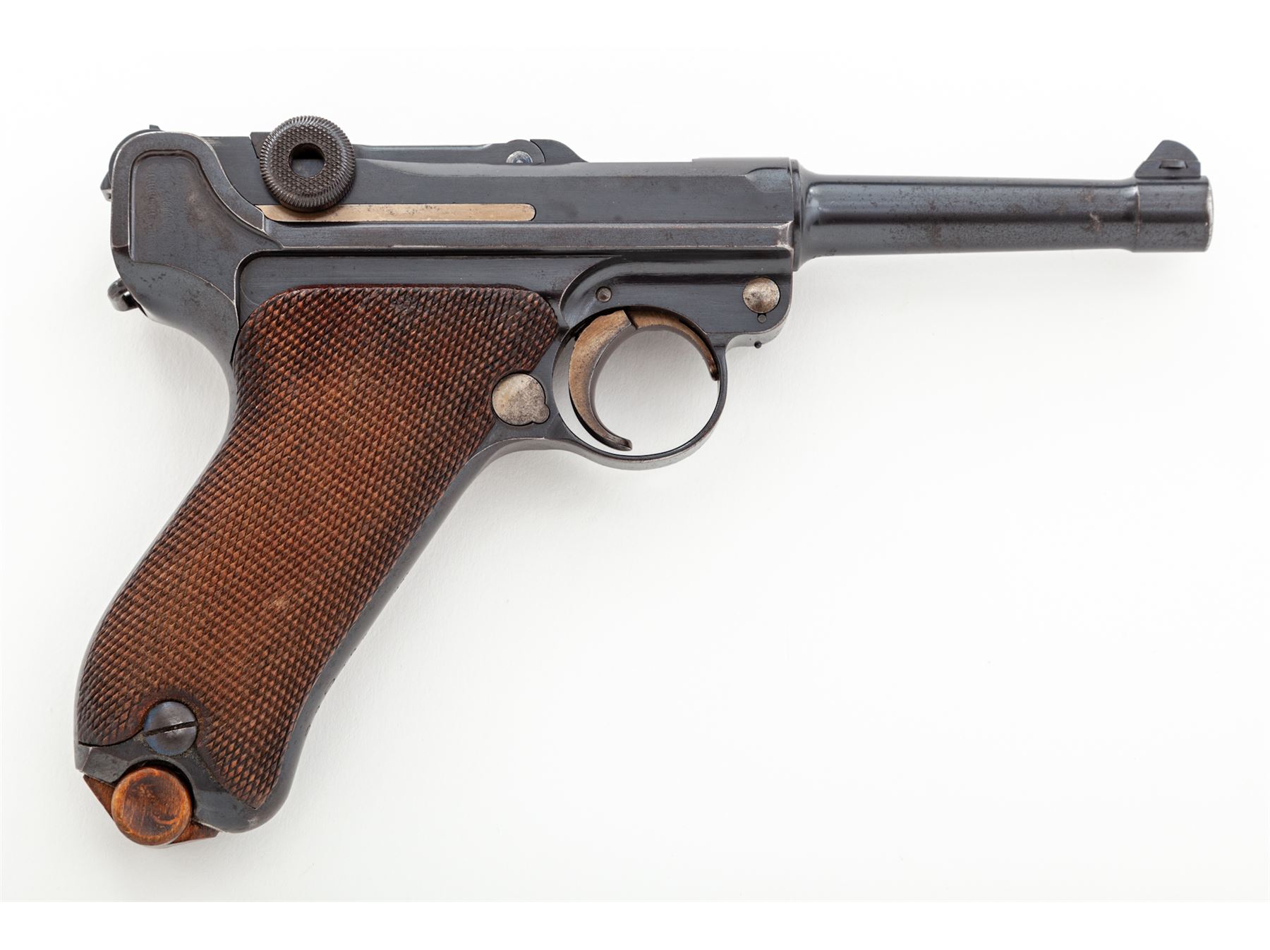 Pre-WWI Era P.08 Luger, #8082a, 9mm, 4'' barrel, blue finish, straw small parts, checkered walnut grips, with tin-plated wood based magazine with non-matching serial number. Blank chamber area, DWM to toggle link, ''Gesichert'' marked thumb safety, ''Geladen'' to extractor. All visible matching numbers, except magazine. Front strap marked ''B.3.R.12.2.''. An interesting early variation that was mfg'd for the German Army without stock lug, and year of mfg. precedes 1912 as the chamber area is undated. These early models lack the toggle hold-open device. Condition is excellent retaining approx. 92%-94% lightly thinning blue and most of the losses at highpoint of sideplate. Grips show minor oil staining but very little wear to checks. Action is crisp, bore is bright. Est.: $2,000-$3,000. (C&R/PPT)