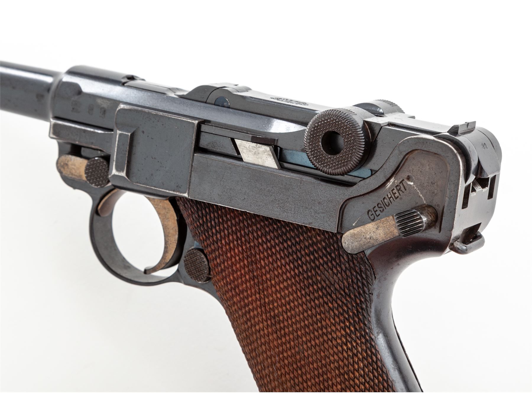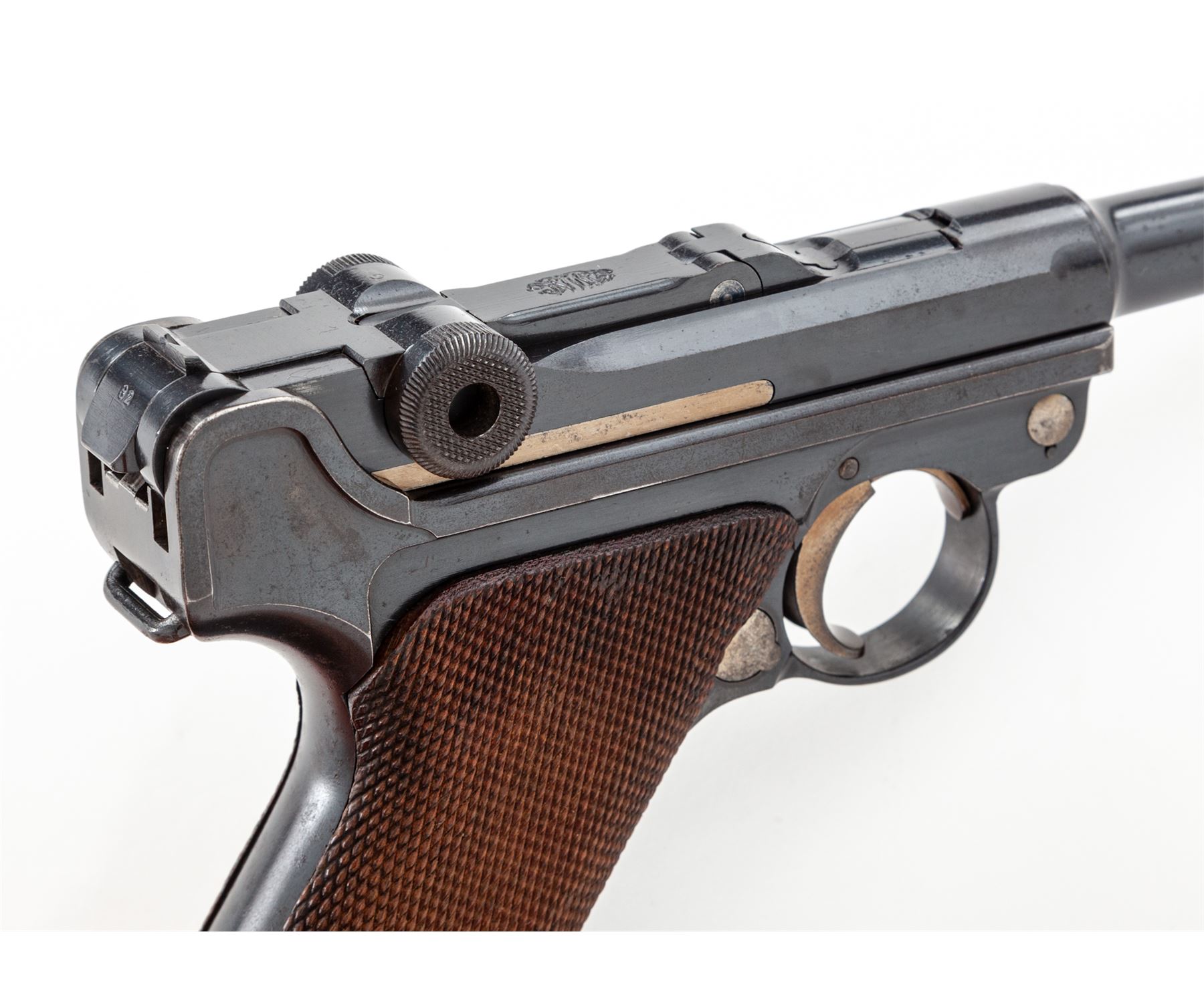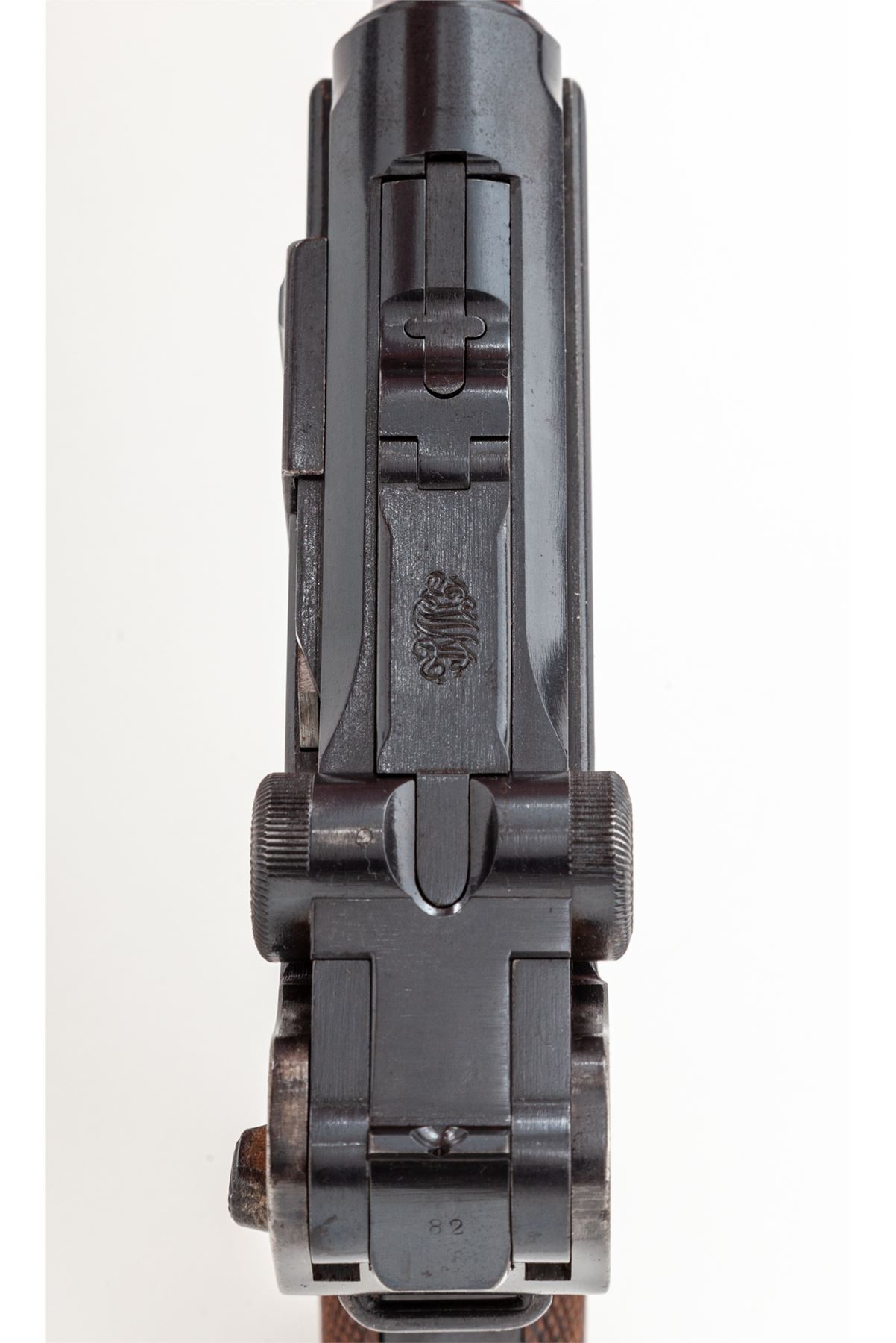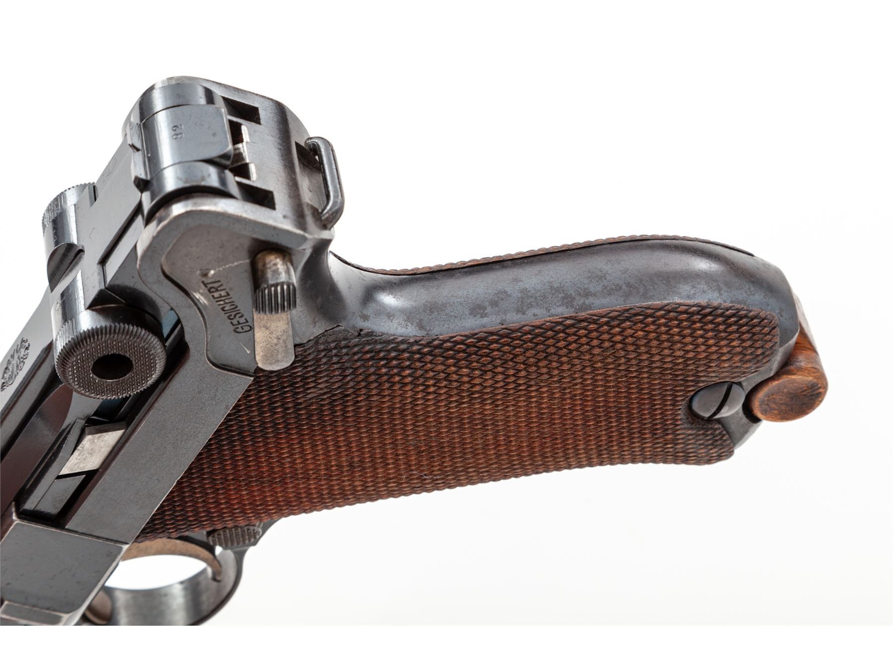 Pre-WWI Era P.08 Luger, #8082a, 9mm, 4'' barrel, blue finish, straw small parts, checkered walnut grips, with tin-plated wood based magazine with non-matching serial number. Blank chamber area, DWM to toggle link, ''Gesichert'' marked thumb safety, ''Geladen'' to extractor. All visible matching numbers, except magazine. Front strap marked ''B.3.R.12.2.''. An interesting early variation that was mfg'd for the German Army without stock lug, and year of mfg. precedes 1912 as the chamber area is undated. These early models lack the toggle hold-open device. Condition is excellent retaining approx. 92%-94% lightly thinning blue and most of the losses at highpoint of sideplate. Grips show minor oil staining but very little wear to checks. Action is crisp, bore is bright. Est.: $2,000-$3,000. (C&R/PPT)