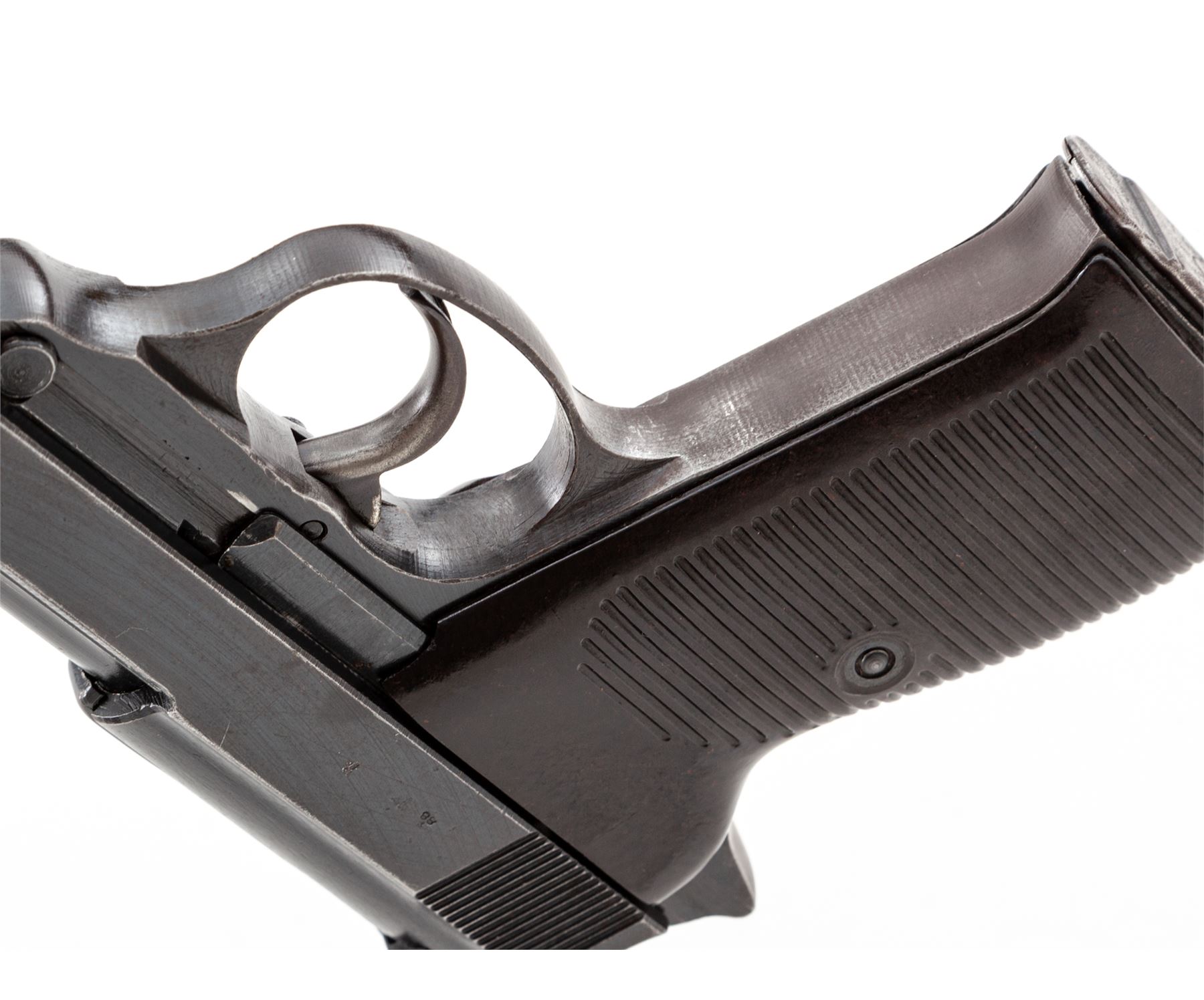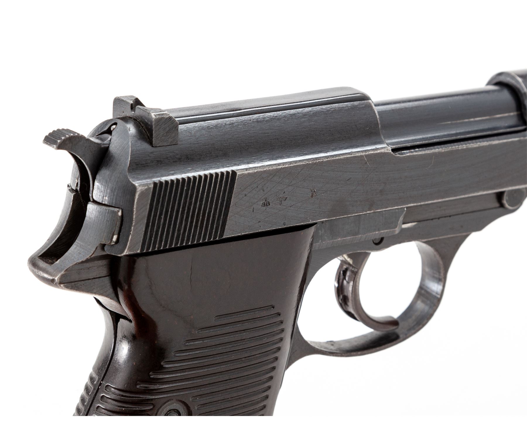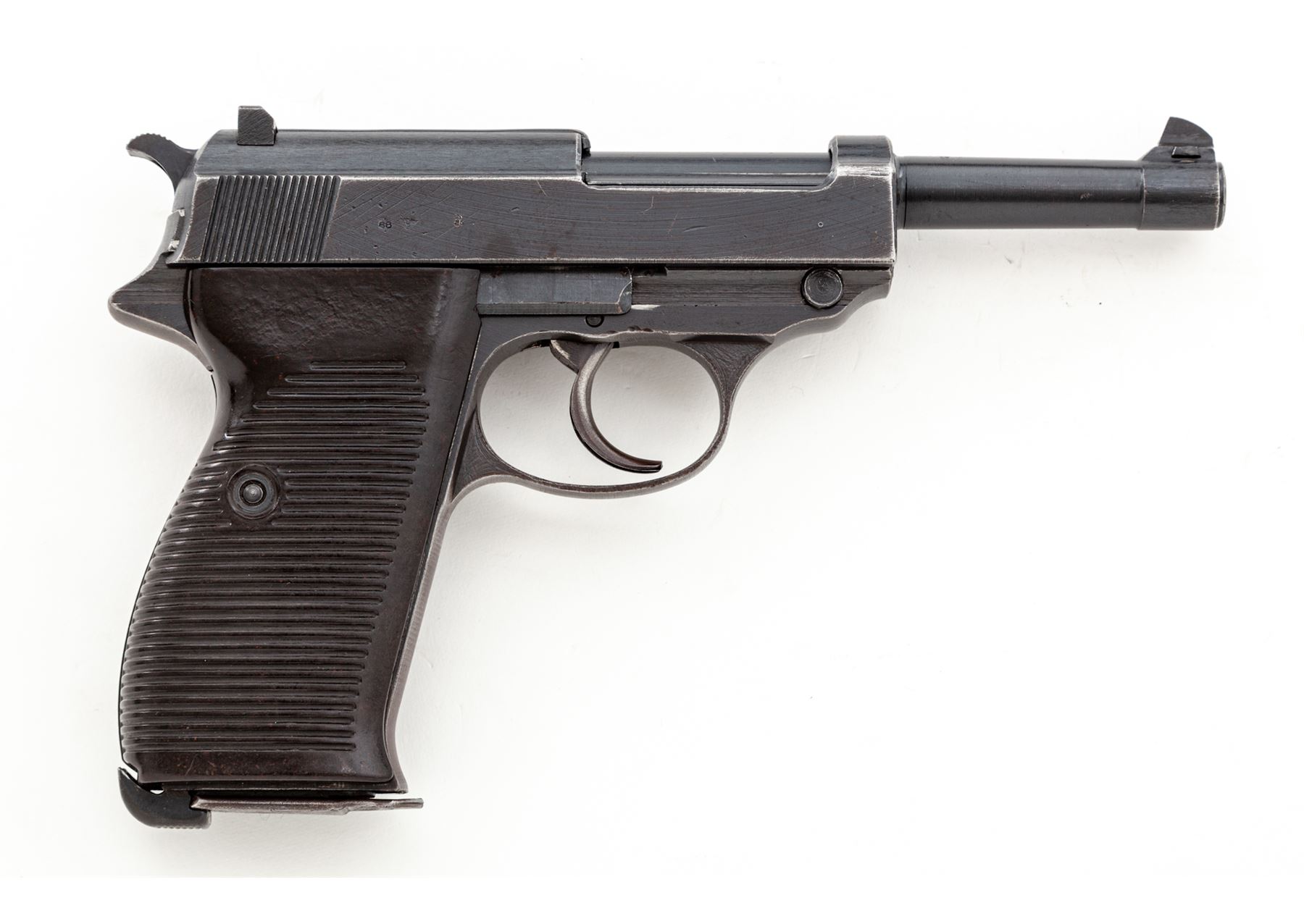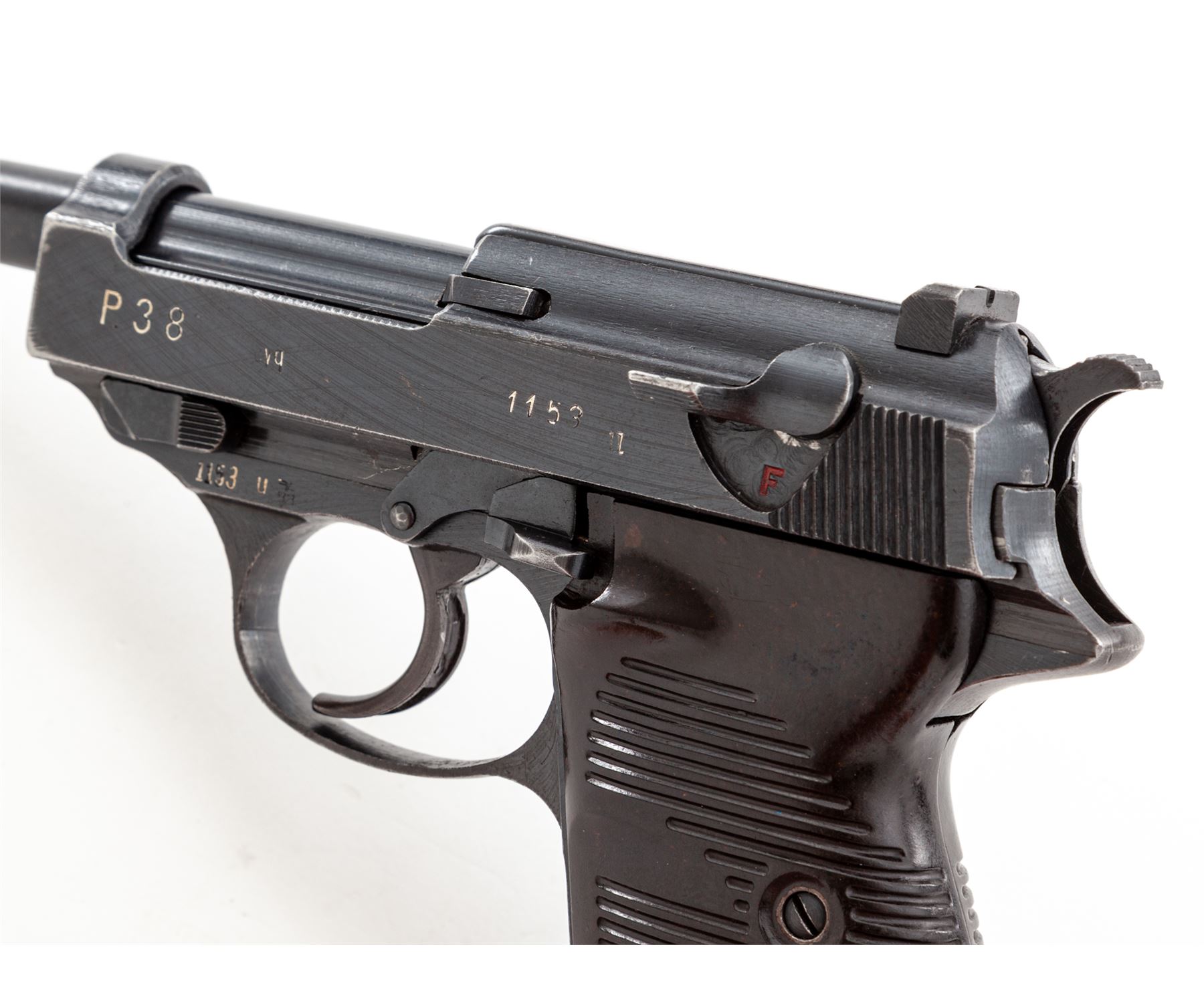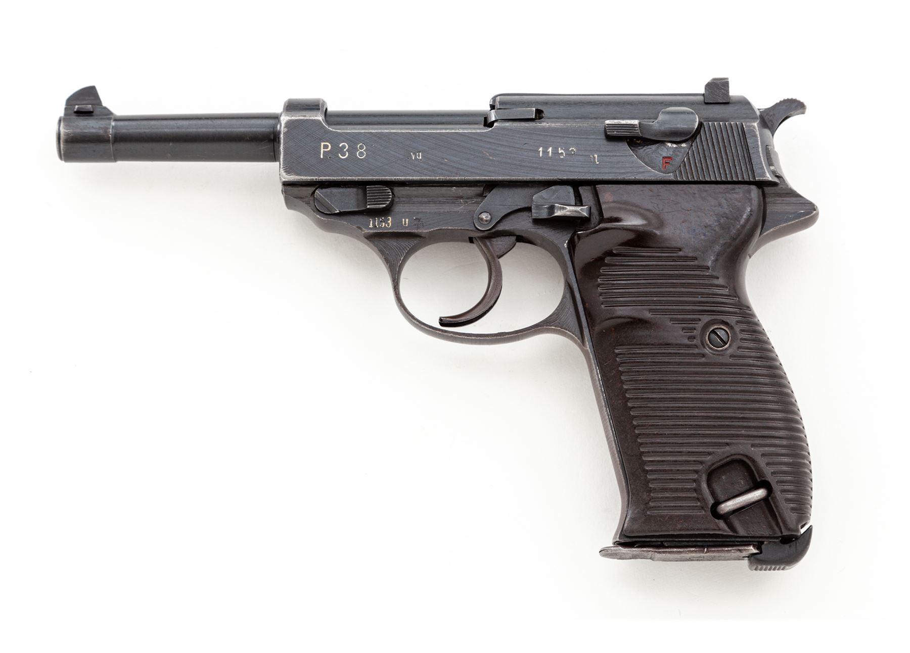 WWII Era P.38 Semi-Automatic Pistol, by Spreewerk (cyq), #1153u, 9mm, 5'' barrel, blue finish, brown phenolic resin grips, with one WWII era P.38 magazine. All visible matching numbers including locking block; magazine with added number 748. Condition is near excellent retaining approx. 92% thinning factory blue. Grips are fine, action is good, bore is bright. Est.: $500-$750. (C&R)