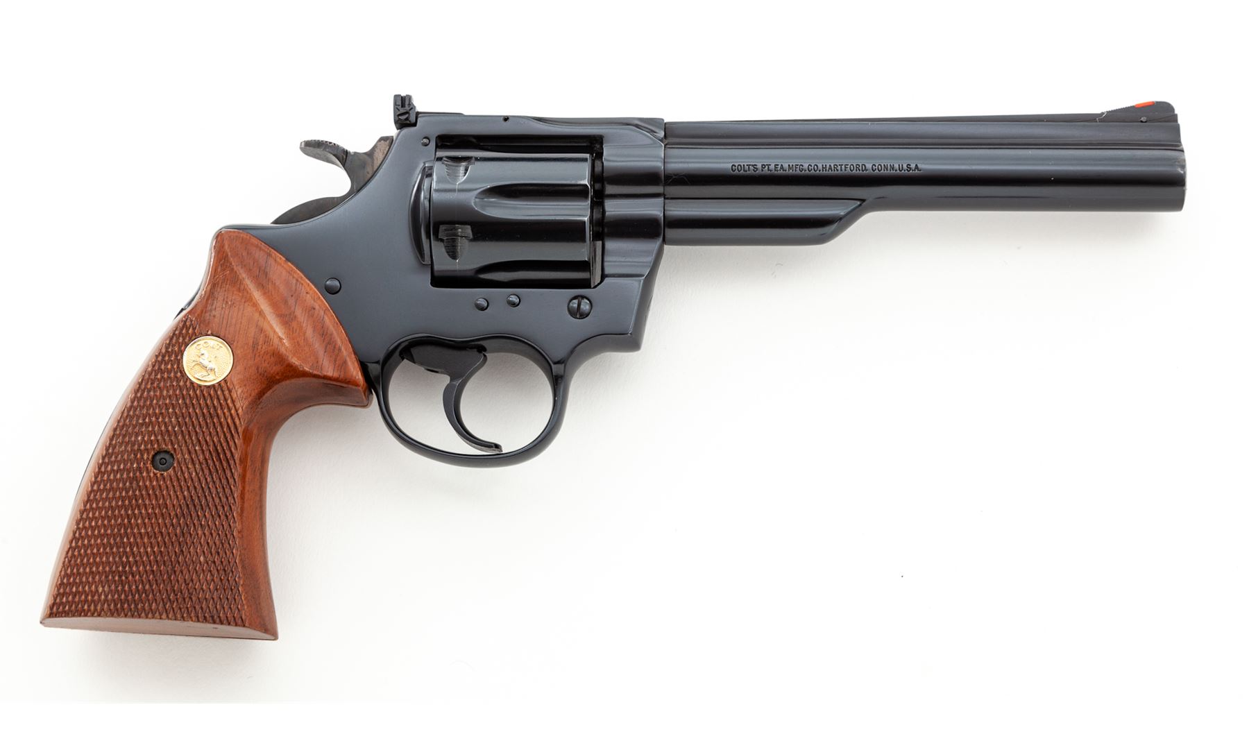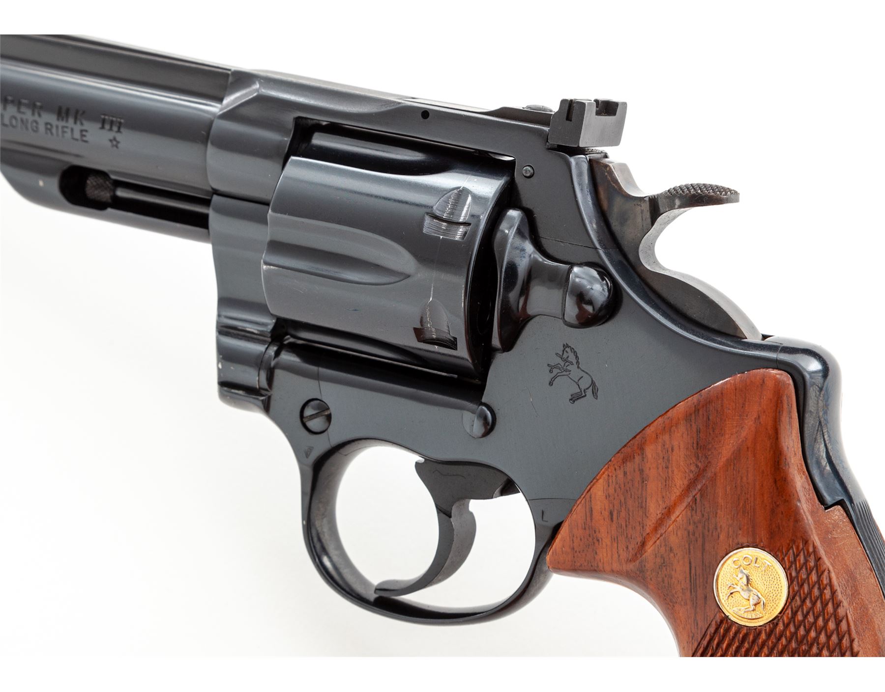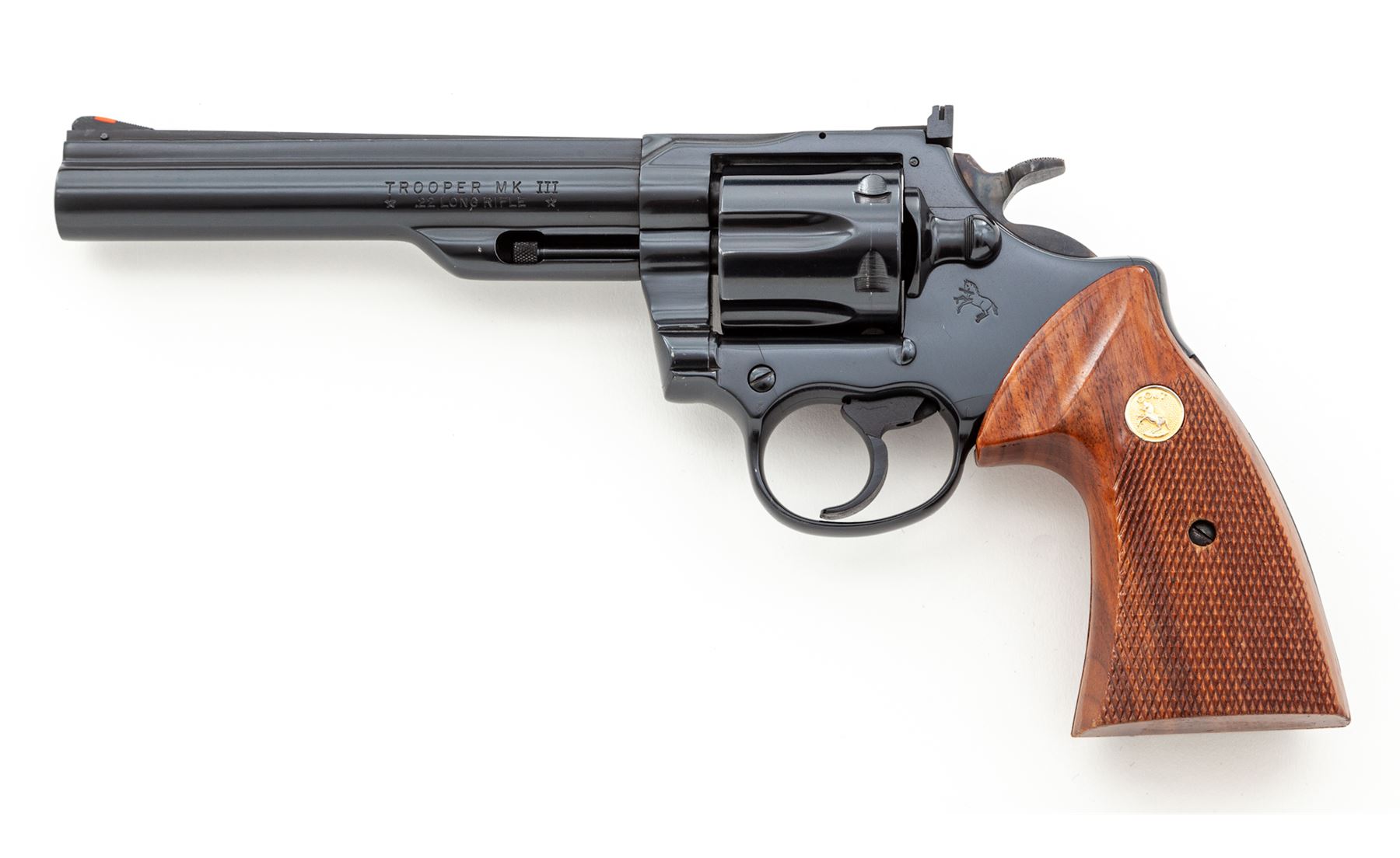 Colt Trooper MK III Double Action Revolver, #Y18260, .22 LR cal., 6'' barrel, blue finish, factory checkered walnut grips with gold medallions, red ramp front and adjustable rear sight, checkered hammer, and wide trigger. Includes an extra set of Pachmayr rubber grips with gold Colt medallions. Condition is excellent showing very little use, with very light marks from storage and one small scratch just below cylinder latch. Grips are excellent, action is smooth and crisp, bore is bright. Est.: $1,000-$1,500. (Modern)(Not available to Calif. residents.)