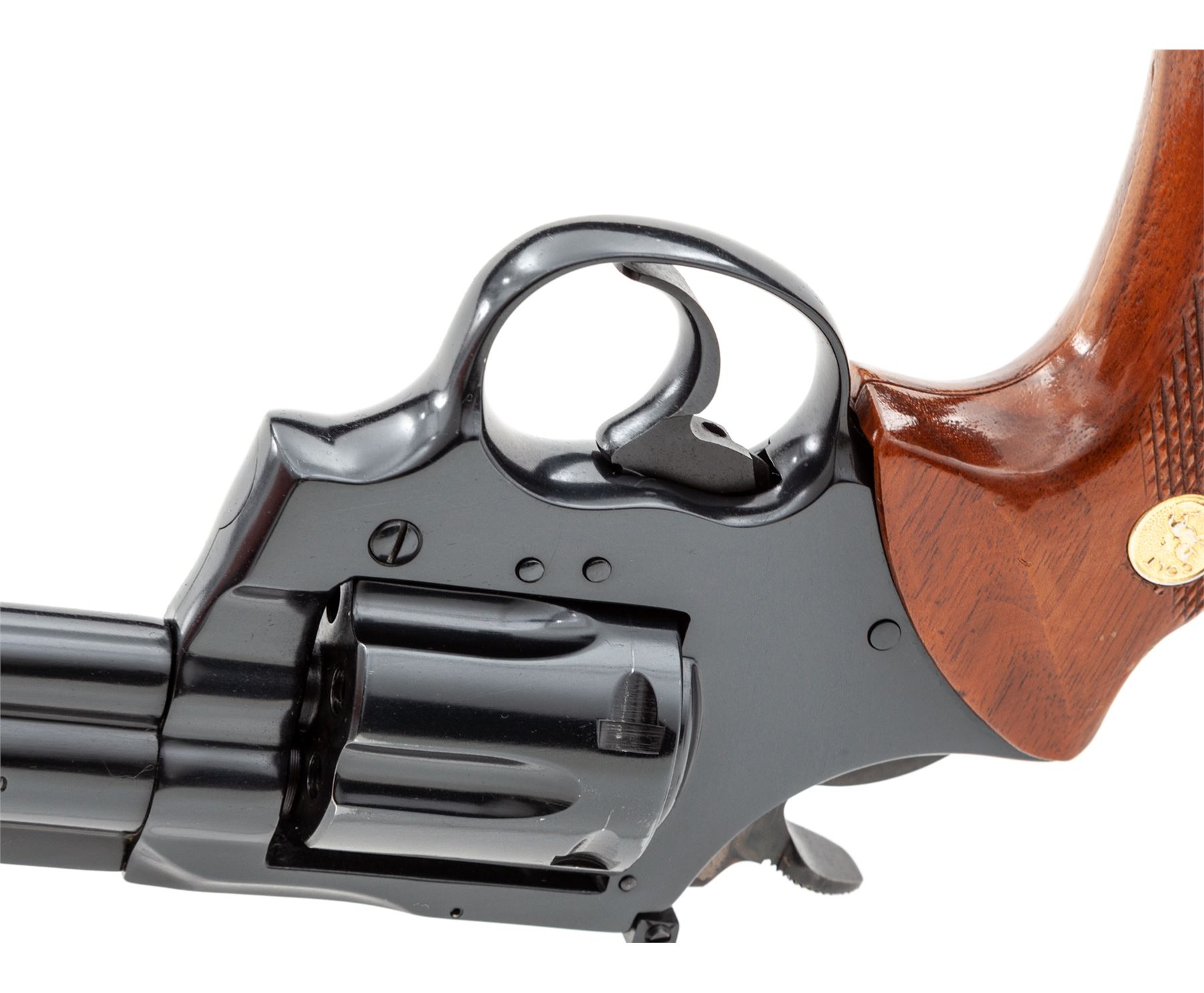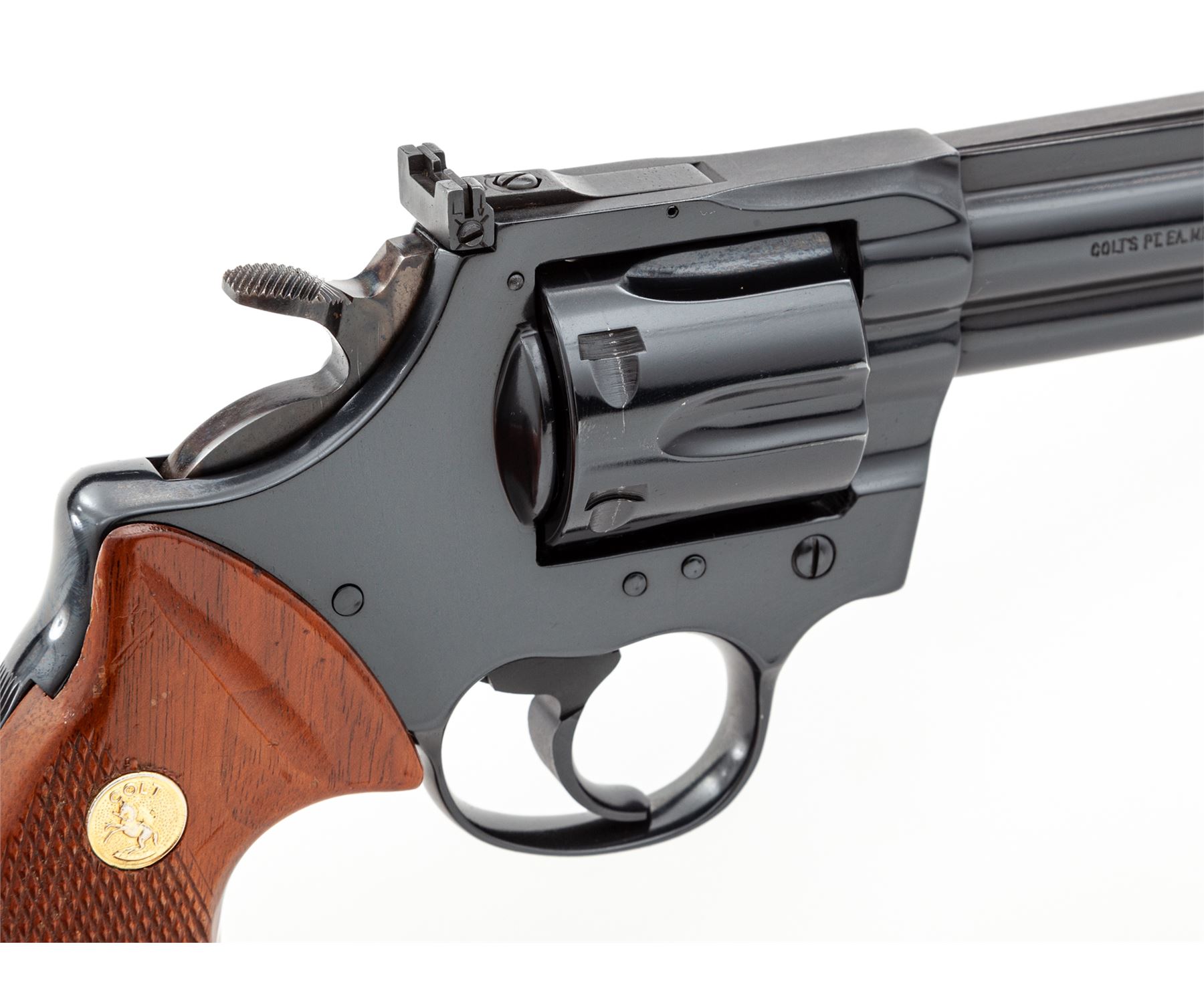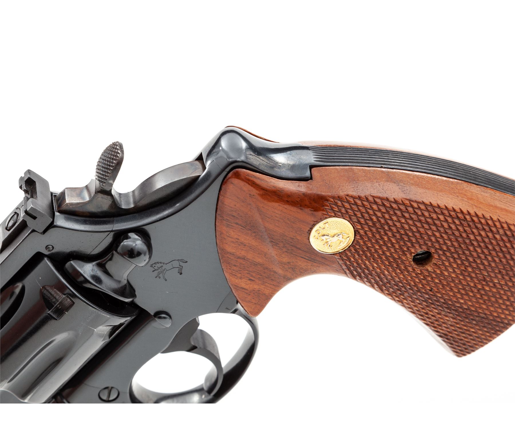 Colt Trooper MK III Double Action Revolver, #Y18260, .22 LR cal., 6'' barrel, blue finish, factory checkered walnut grips with gold medallions, red ramp front and adjustable rear sight, checkered hammer, and wide trigger. Includes an extra set of Pachmayr rubber grips with gold Colt medallions. Condition is excellent showing very little use, with very light marks from storage and one small scratch just below cylinder latch. Grips are excellent, action is smooth and crisp, bore is bright. Est.: $1,000-$1,500. (Modern)(Not available to Calif. residents.)