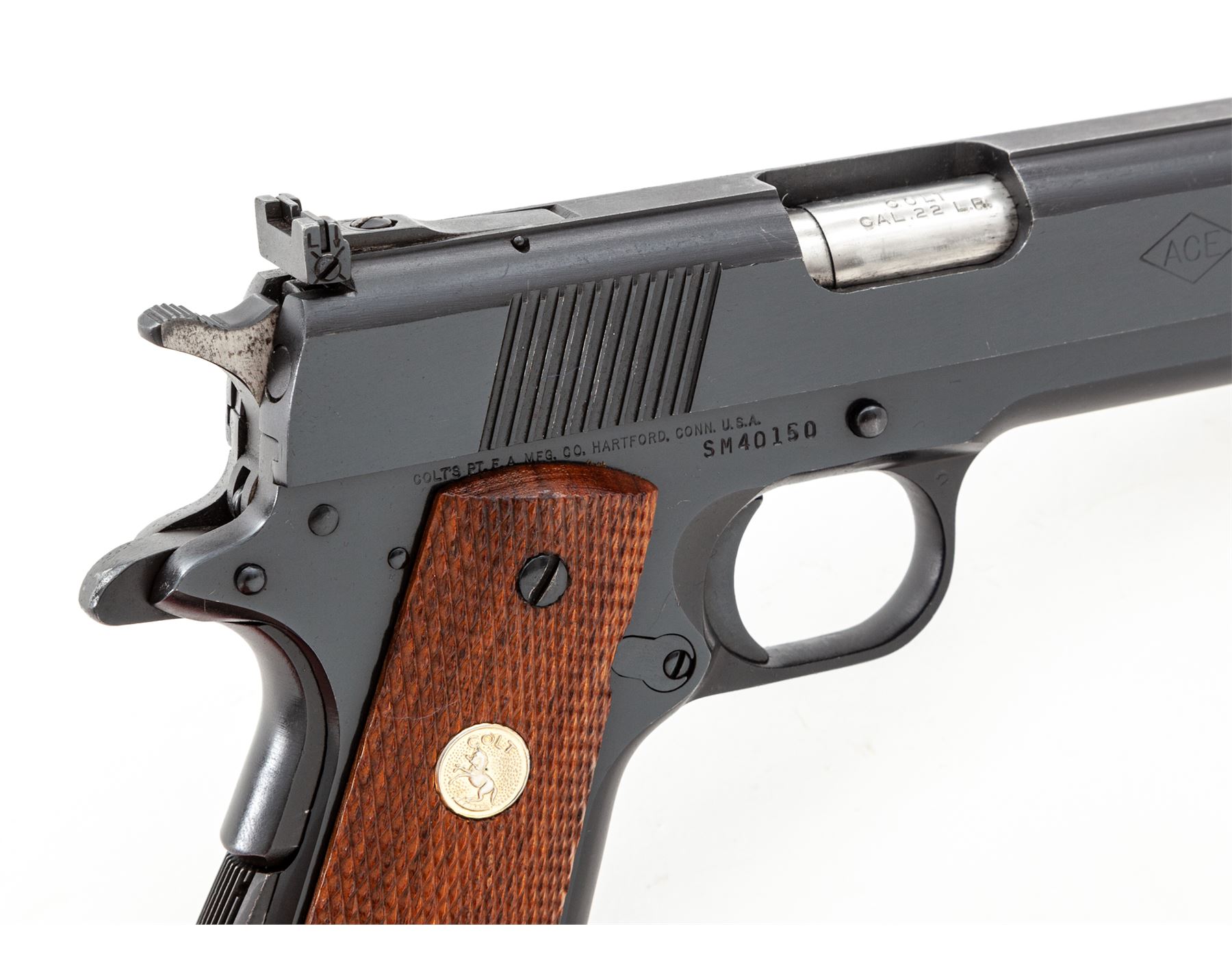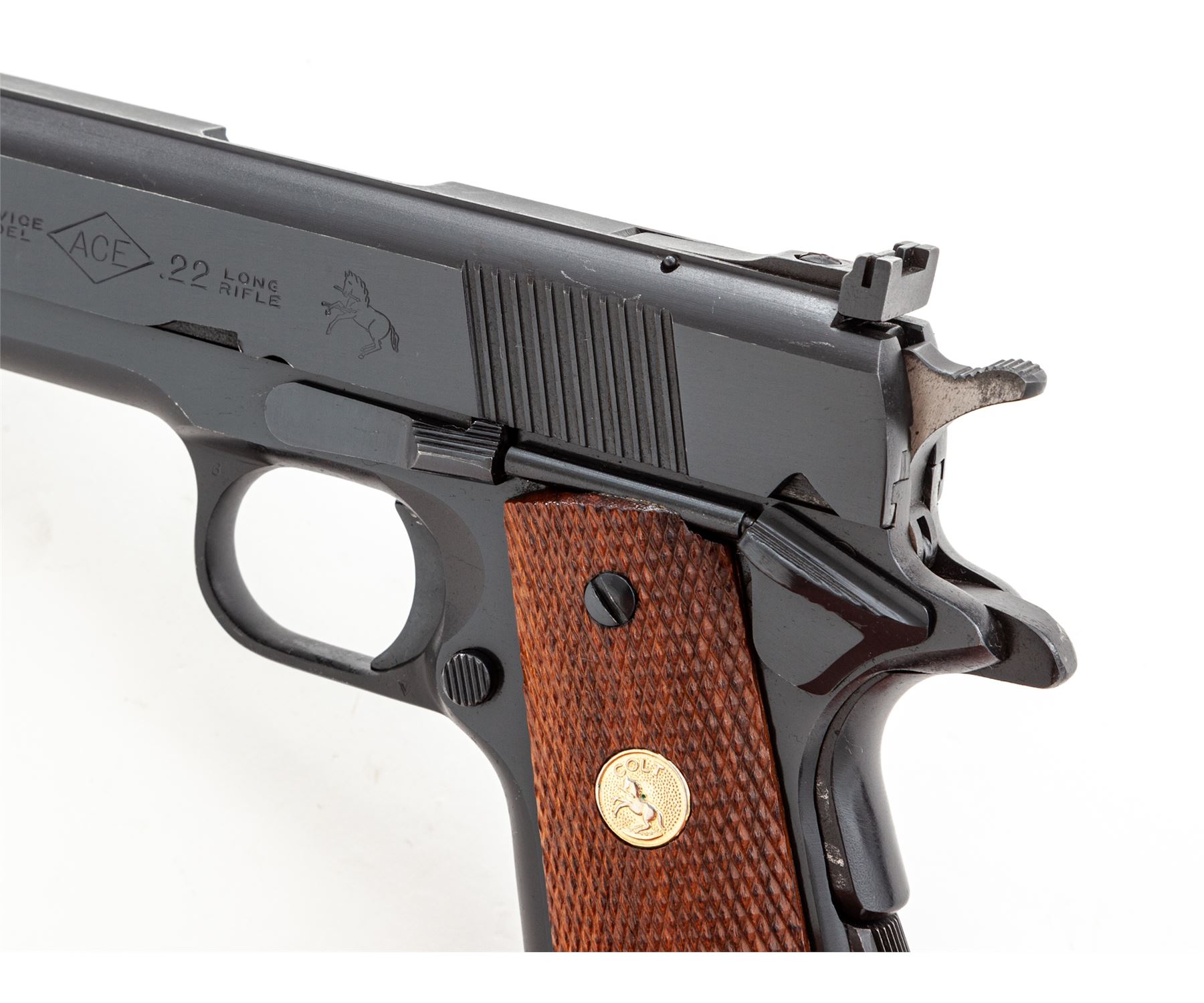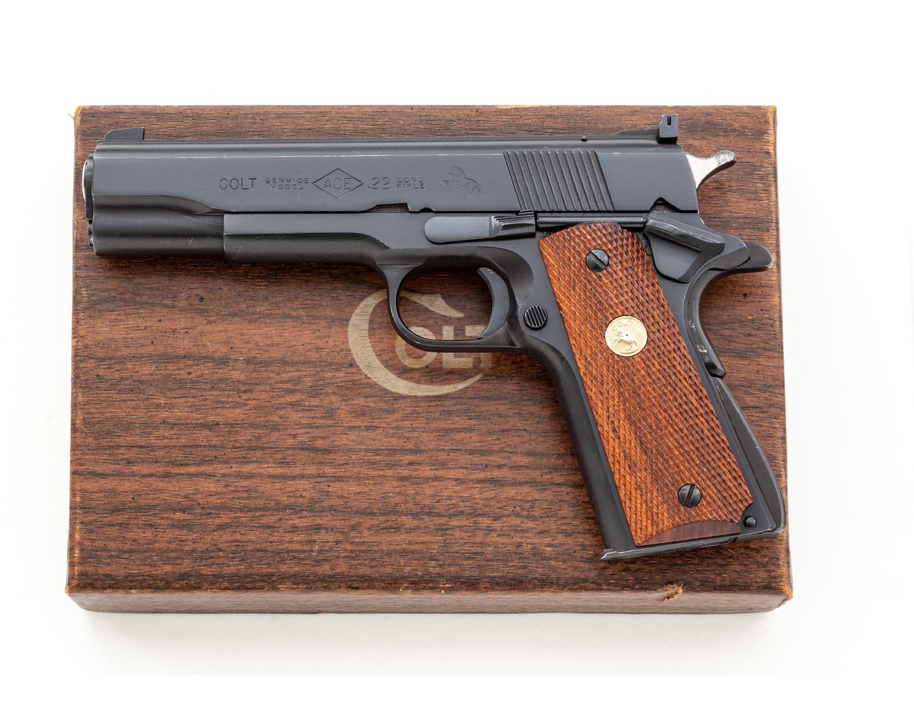 Colt Service Model Ace Semi-Automatic Pistol, #SM40150, .22 LR cal., 5'' barrel, blue finish, factory checkered walnut grips with gold medallions, factory adjustable sights, with one factory .22 cal. magazine, in a Colt pre-Series 70 Gov't Model box. Dating from the late 1970s to early 1980s. Condition is excellent showing only the lightest wear at muzzle. Minor carbon spotting to bright sides of hammer. Grips appear as new. Good action, bright bore. Est.: $800-$1,200. (Modern)(Not available to Calif. residents.)