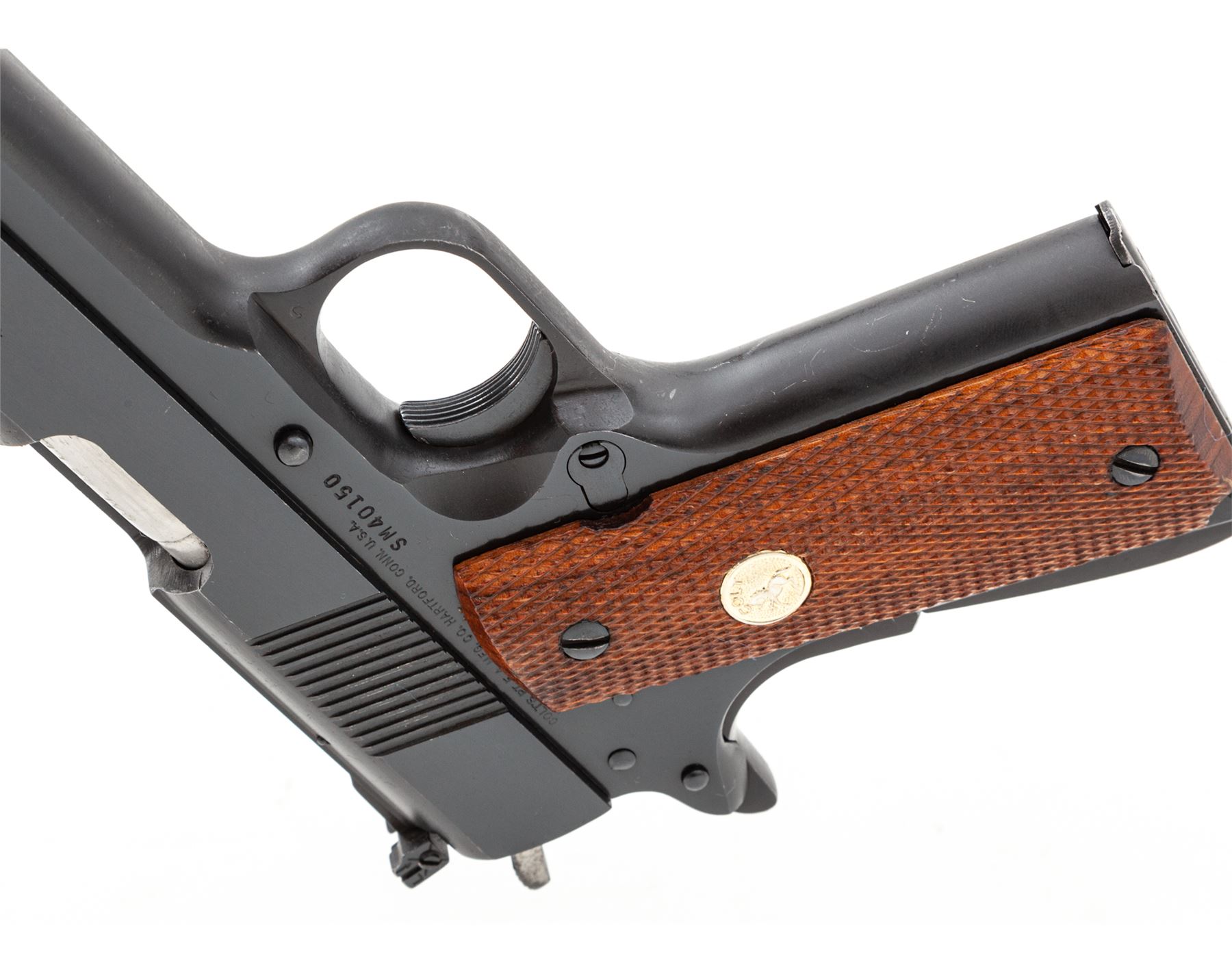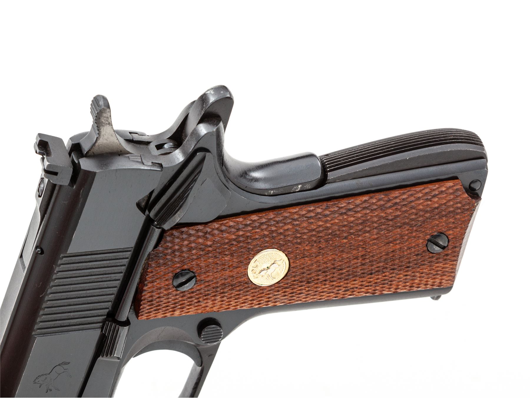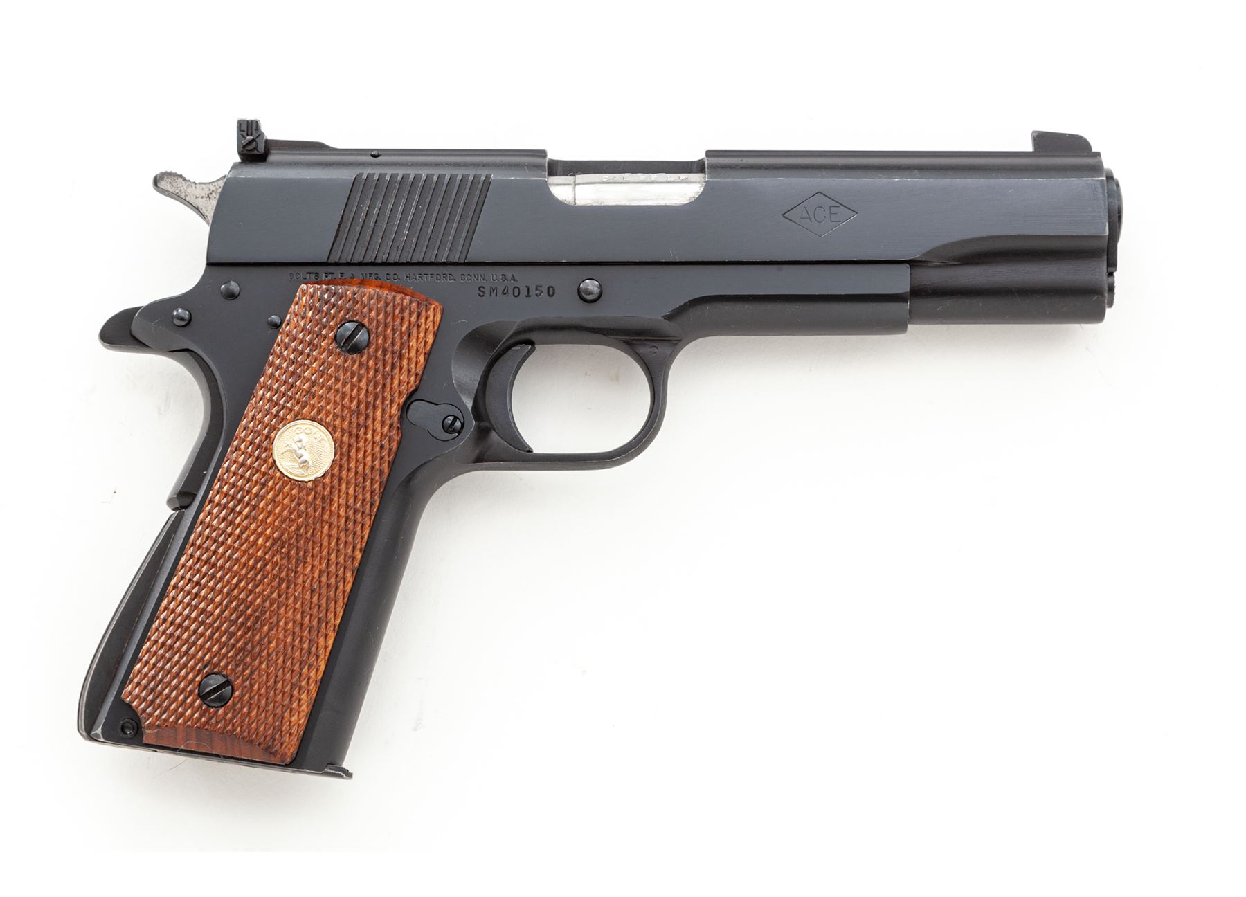 Colt Service Model Ace Semi-Automatic Pistol, #SM40150, .22 LR cal., 5'' barrel, blue finish, factory checkered walnut grips with gold medallions, factory adjustable sights, with one factory .22 cal. magazine, in a Colt pre-Series 70 Gov't Model box. Dating from the late 1970s to early 1980s. Condition is excellent showing only the lightest wear at muzzle. Minor carbon spotting to bright sides of hammer. Grips appear as new. Good action, bright bore. Est.: $800-$1,200. (Modern)(Not available to Calif. residents.)