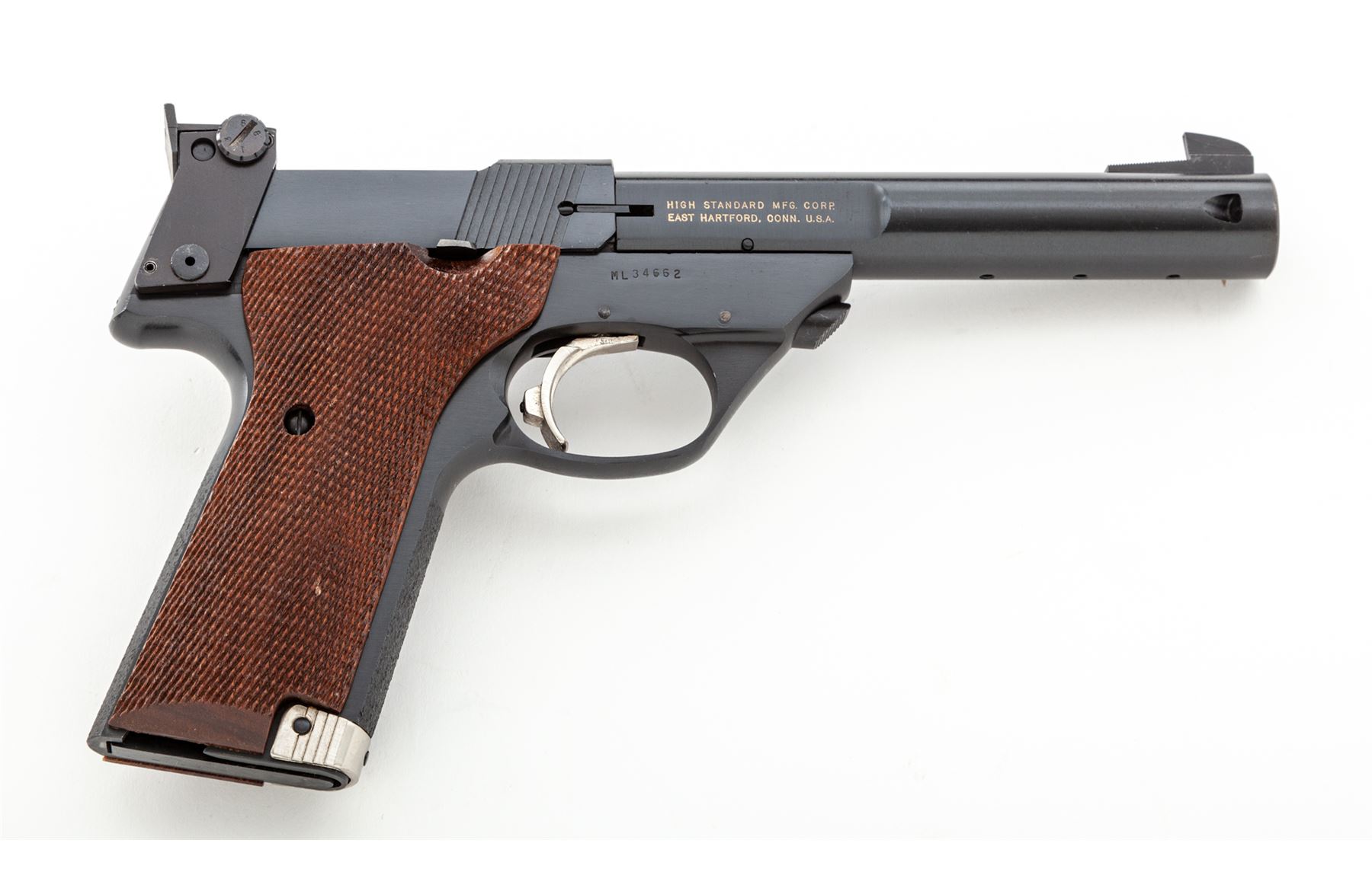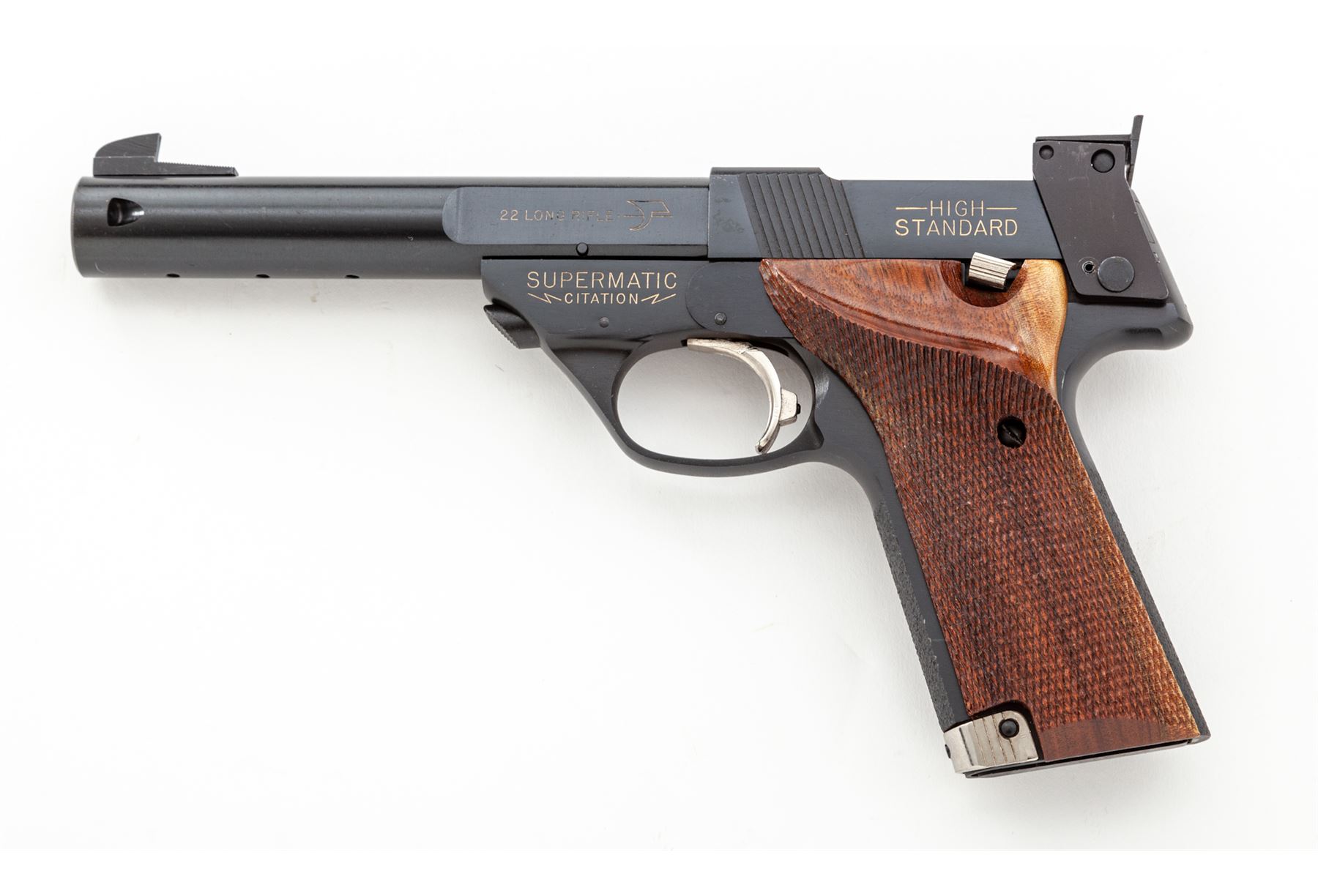 High Standard Supermatic Citation Semi-Automatic Target Pistol, #ML34662, .22 LR cal., 5.5'' barrel, blue finish, factory checkered thumbrest walnut grips, with one magazine, in original box with instructions. Condition is excellent, appearing as new and unfired. Est.: $500-$750. (Modern/PPT)