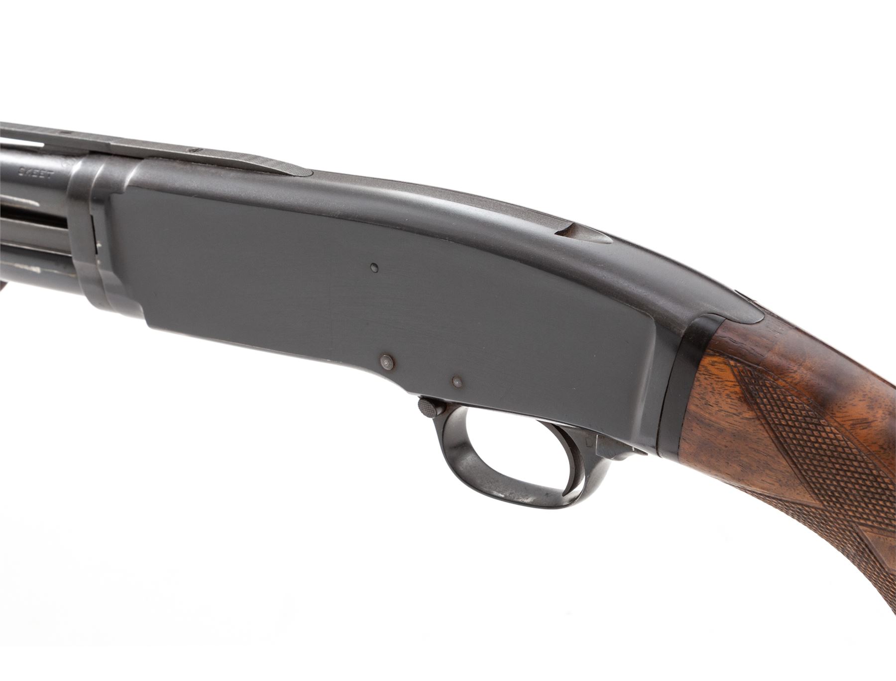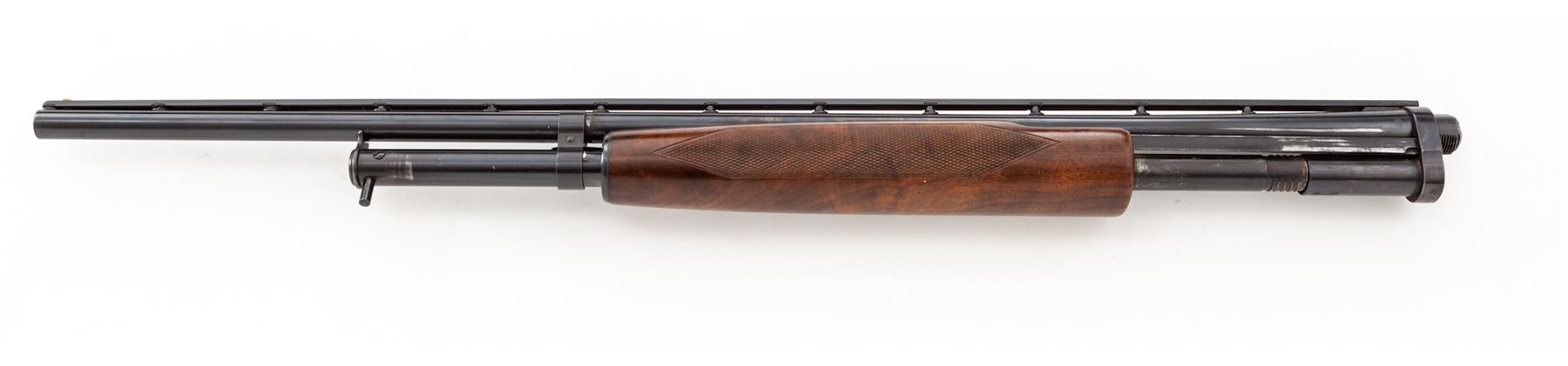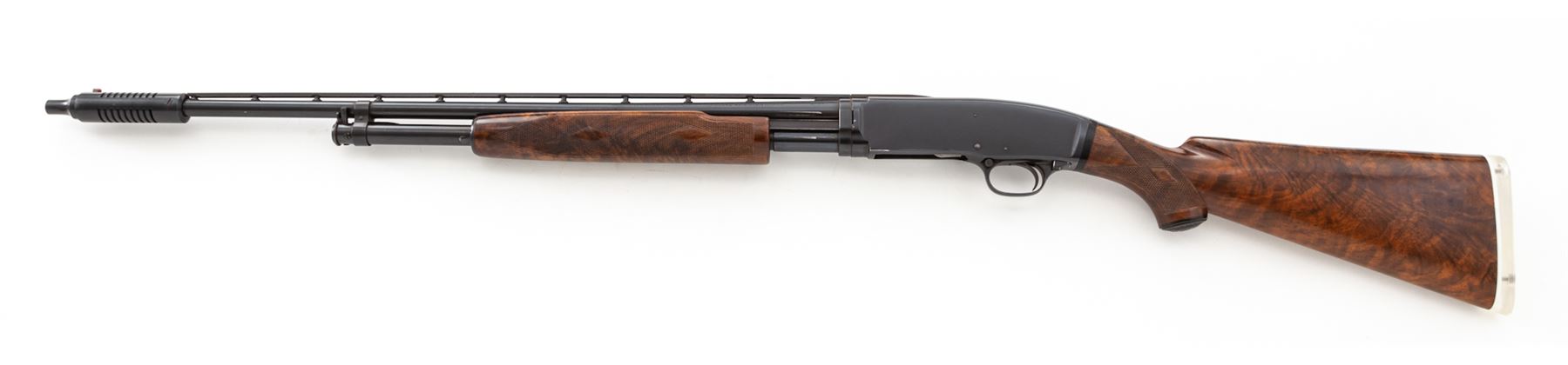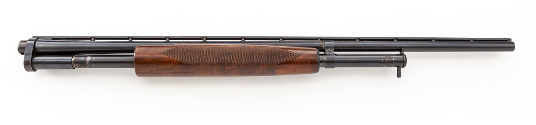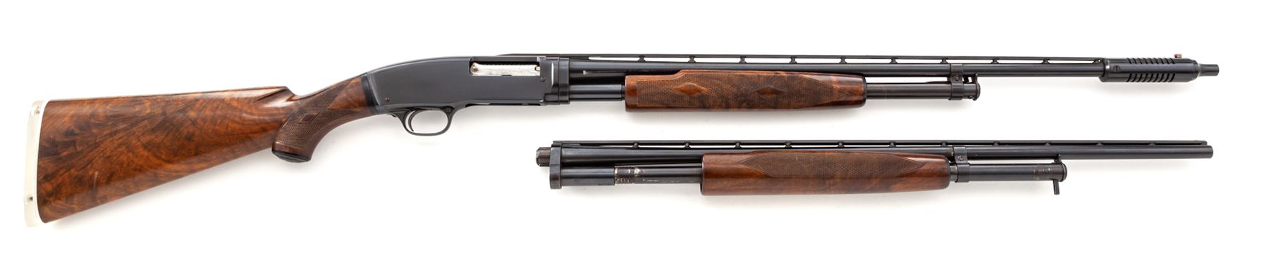Winchester Model 42 Deluxe Grade Slide-Action Shotgun, .410 bore, with extra barrel, #68467, 26.5'' vent rib barrel with 2.5'' chamber and marked ''Skeet'', but with Lyman-made Cutts compensator device attached (spreader tube installed). Rib is marked ''Simmons Specialties, Pat. Pend'', and has round posts with doughnut mounts on barrel; rib extends 2.75'' onto top of receiver, which has flat blue finish. Bottom of receiver is marked ''Deluxe'' below serial numbers; both bolt and lifter are machine turned. Wood is beautiful Exhibition Grade walnut and has full forend with ''double diamond'' checkering pattern at 20 LPI. Buttstock has pistol grip with original Winchester grip cap and ''single diamond'' checkering pattern. Length of pull is 14.5'', but original buttplate has been replaced with a clear Lucite buttplate. Second barrel is 26'' with 3'' chamber and Full choke, also with Simmons vent rib marked as above; forend is full but has standard Winchester checkering, #59003. Mfg'd 1948. Condition is excellent with only a few small marks to metal, some wear to action, and numerous small handling marks but no gouges to the beautiful wood. Gun may have been stored for a while, as action is sluggish but functions correctly (a thorough cleaning would help). Barrels were probably plain when originally sold, then had early Simmons vent ribs installed, which was the same rib later installed on new guns for Winchester by Simmons. A very nice and mostly original Model 42 Deluxe Grade. Est.: $5,000-$7,000. (C&R)