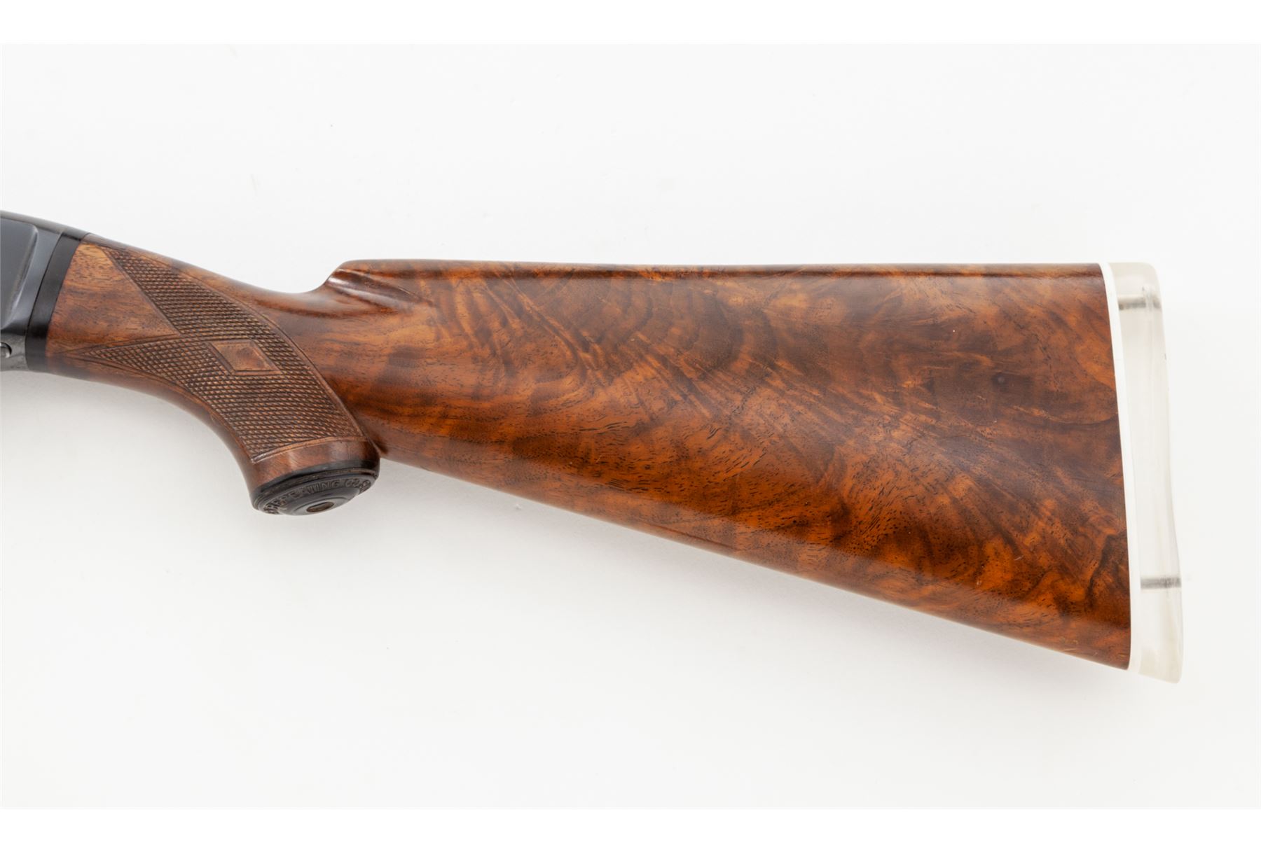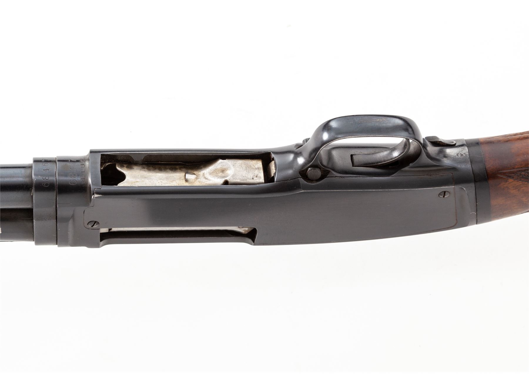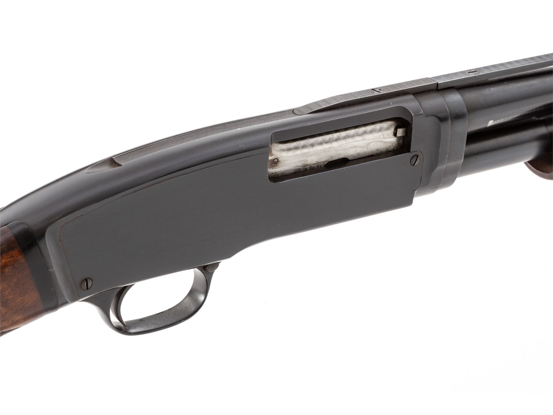 Winchester Model 42 Deluxe Grade Slide-Action Shotgun, .410 bore, with extra barrel, #68467, 26.5'' vent rib barrel with 2.5'' chamber and marked ''Skeet'', but with Lyman-made Cutts compensator device attached (spreader tube installed). Rib is marked ''Simmons Specialties, Pat. Pend'', and has round posts with doughnut mounts on barrel; rib extends 2.75'' onto top of receiver, which has flat blue finish. Bottom of receiver is marked ''Deluxe'' below serial numbers; both bolt and lifter are machine turned. Wood is beautiful Exhibition Grade walnut and has full forend with ''double diamond'' checkering pattern at 20 LPI. Buttstock has pistol grip with original Winchester grip cap and ''single diamond'' checkering pattern. Length of pull is 14.5'', but original buttplate has been replaced with a clear Lucite buttplate. Second barrel is 26'' with 3'' chamber and Full choke, also with Simmons vent rib marked as above; forend is full but has standard Winchester checkering, #59003. Mfg'd 1948. Condition is excellent with only a few small marks to metal, some wear to action, and numerous small handling marks but no gouges to the beautiful wood. Gun may have been stored for a while, as action is sluggish but functions correctly (a thorough cleaning would help). Barrels were probably plain when originally sold, then had early Simmons vent ribs installed, which was the same rib later installed on new guns for Winchester by Simmons. A very nice and mostly original Model 42 Deluxe Grade. Est.: $5,000-$7,000. (C&R)