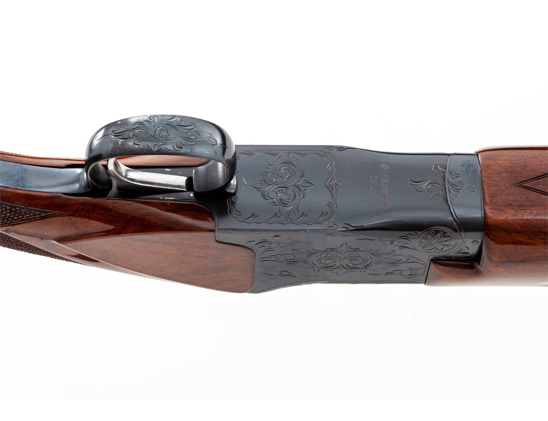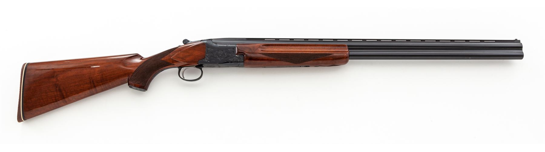 Winchester Model 101 Standard Grade Over/Under Skeet Gun, #K135551. 12 ga. 28'' vent rib barrels have 2-3/4'' chambers and are choked Skt/Skt, with target beads. Boxlock action features a single selective trigger, selective ejectors and non-auto safety. Receiver and triggerguard are hand engraved with very nice scroll patterns. Beavertail forend and pistol-grip buttstock are of European walnut with high-gloss finish, good checkering coverage, metallic grip cap and Whtieline presentation model target recoil pad. Mfg'd 1970. Condition is excellent with few handling marks to wood but little wear to action, which locks tight and functions correctly; bores are dusty but undamaged. Est.: $750-$1,000. (Modern)