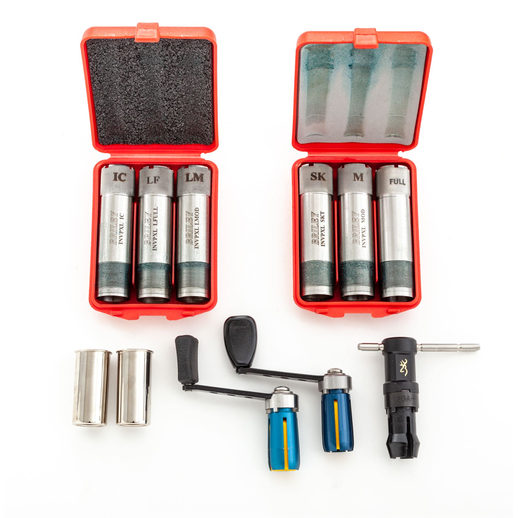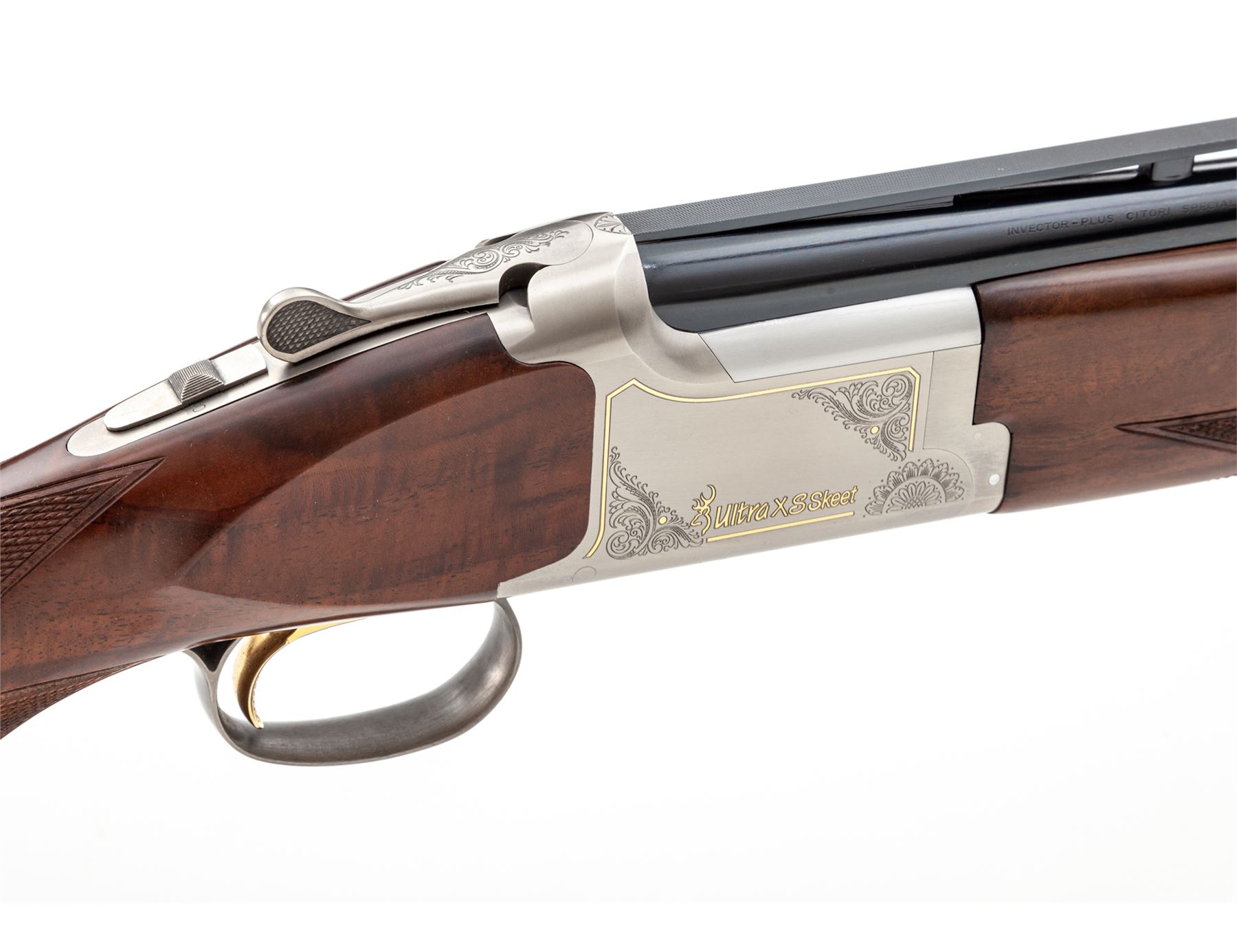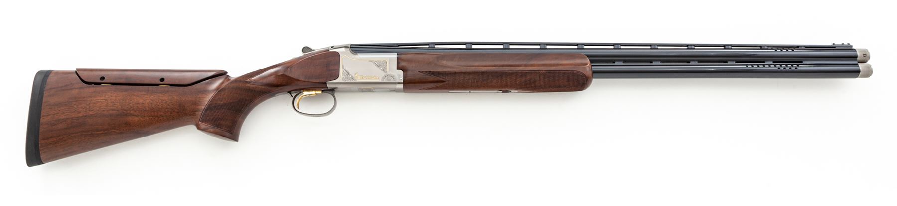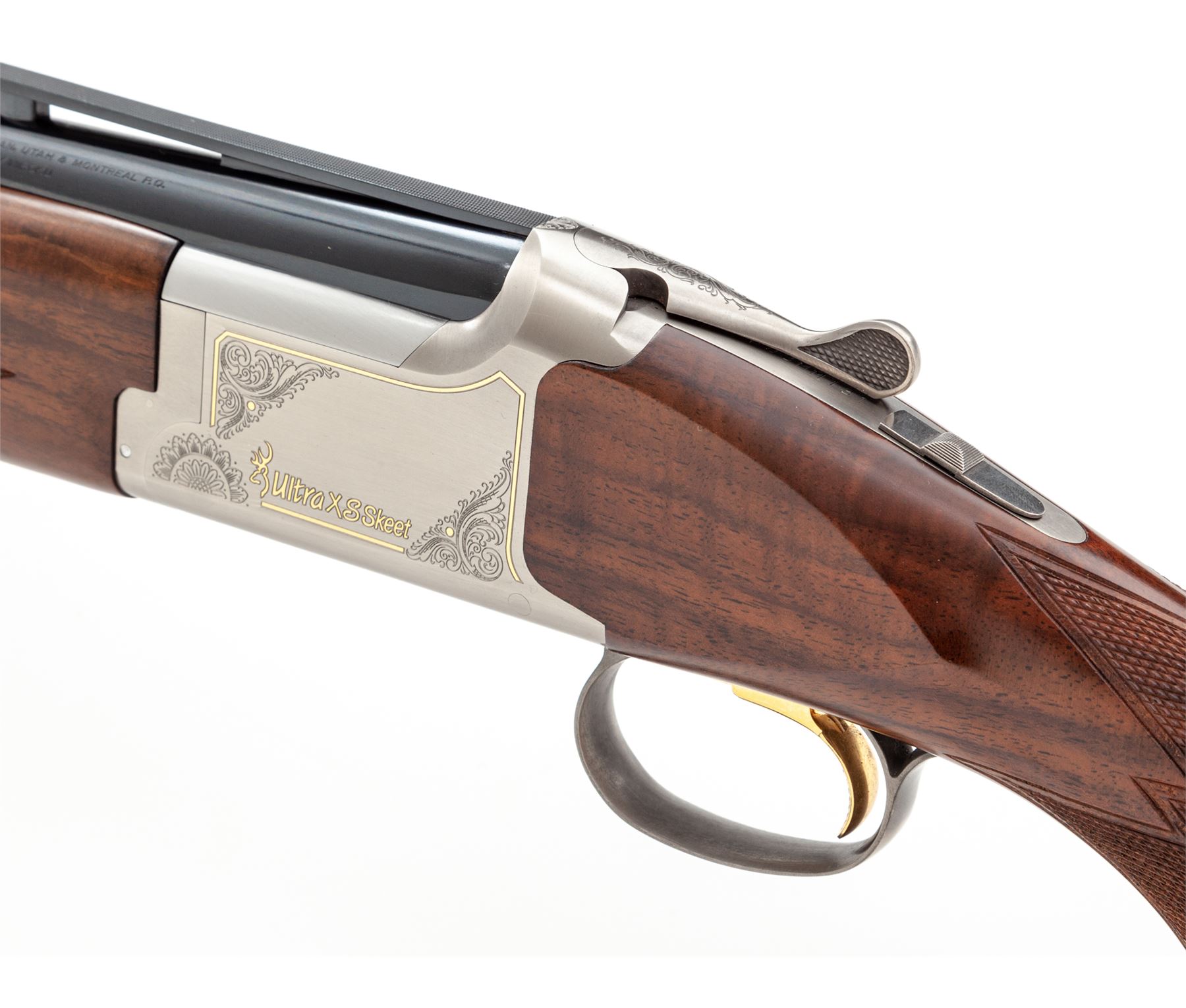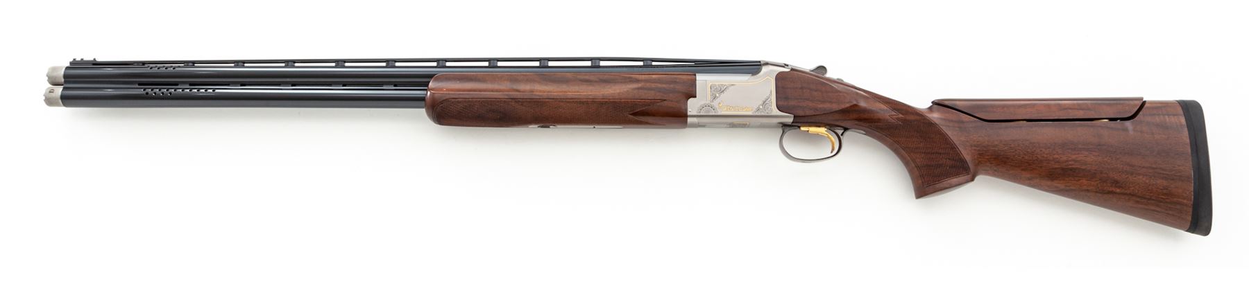 Browning Citori Ultra XS Skeet Over/Under Shotgun, #05803MM131. 12 ga. 28'' vent rib barrels have 2-3/4'' chambers and are fitted for Hi-Viz front sight and Invector-Plus choke tubes (eight (8) tubes included). Redesigned boxlock action features single selective trigger, auto ejectors, non-auto safety and adjustable length of pull. Silver nitride finished receiver is nicely border engraved with gold accents, beavertail forend and flat pistol-grip buttstock are dense grain walnut with Wundhammer swell grip, adjustable comb, and black Browning recoil pad. Mfg'd 2000. Condition is like new as contained in sturdy SKB brand hard case, with all choke tubes and wrenches, front sight inserts, and firing pin block. Wood is unmarred, action locks up very tight, and bores are mirror bright. Est.: $1,750-$2,250. (Modern)