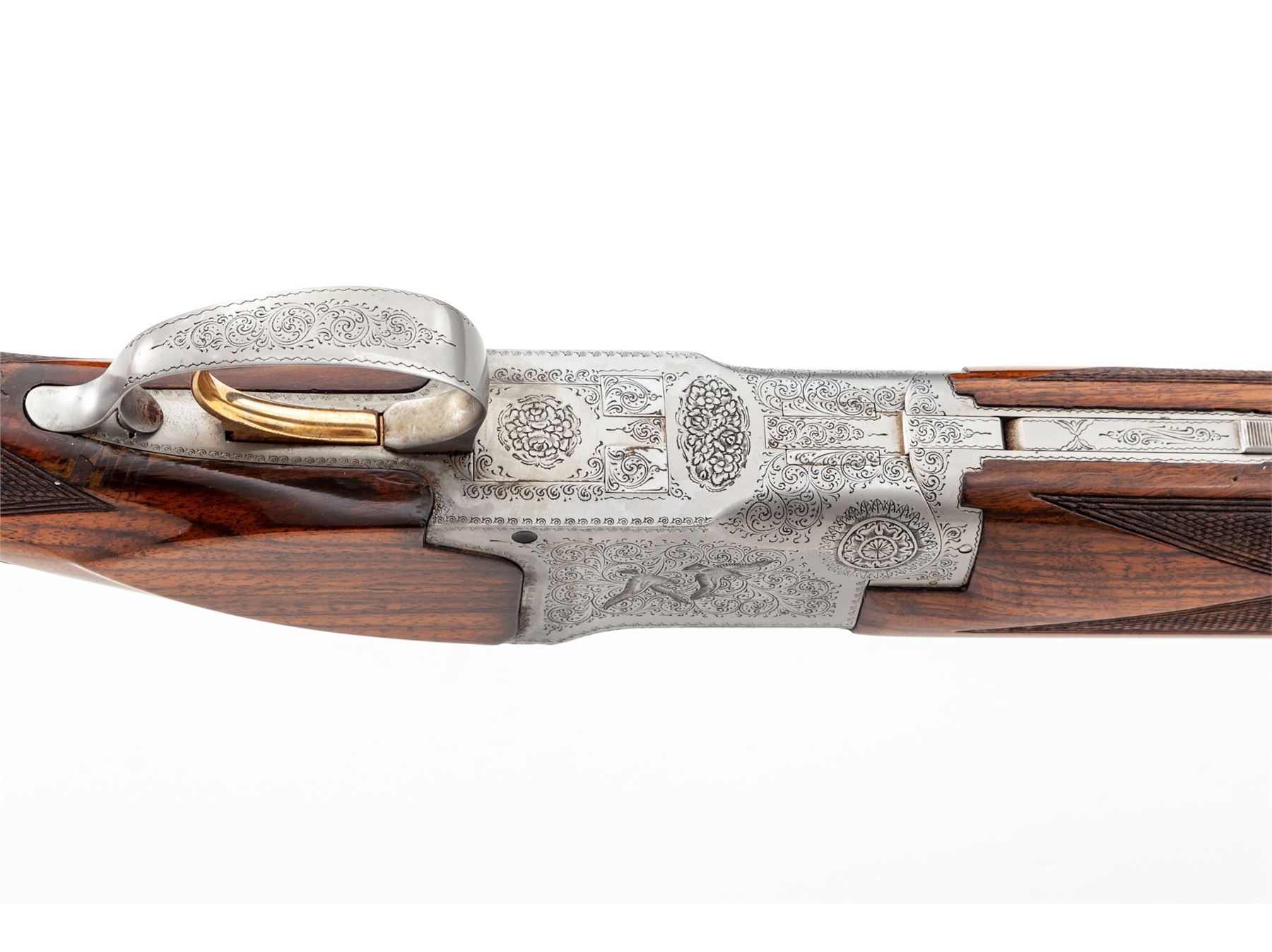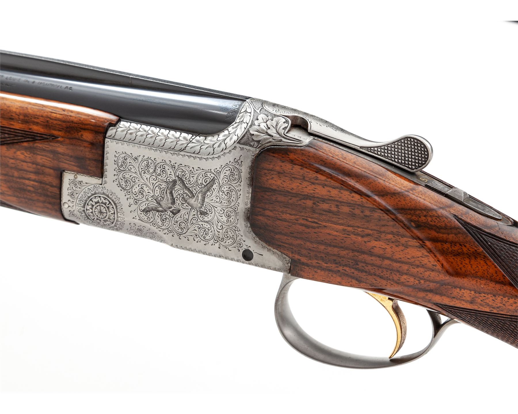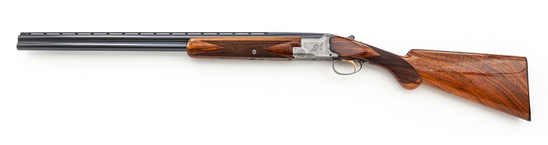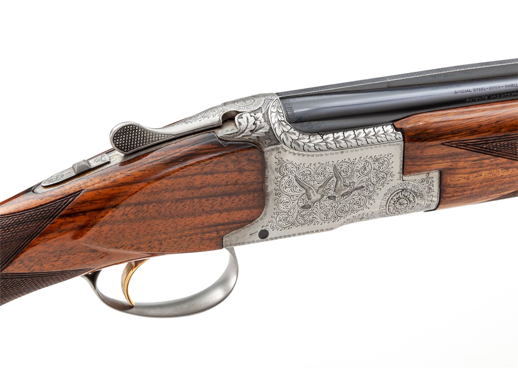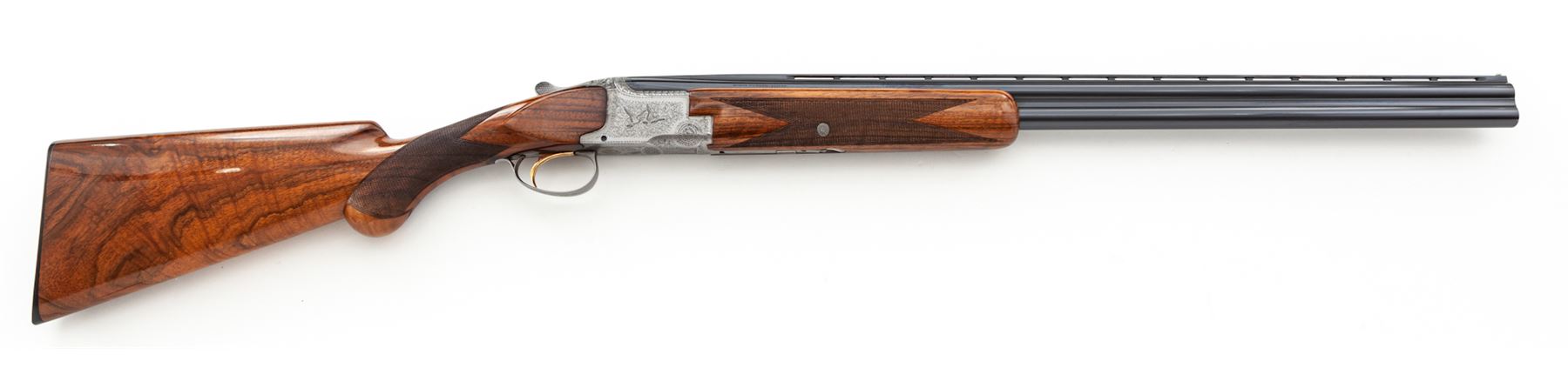 Browning Superposed Pigeon Grade Over/Under Skeet Shotgun, #45361V7. 26-1/2'' 20 ga. vent rib barrels have 3'' chambers and are choked Skt/Skt. Action features single selective trigger, auto ejectors and non-auto safety. Greyed receiver is engraved with two pigeons in flight on each side, with rose & scroll patterns on balance, including triggerguard, top tang and forend iron. Standard size forend and round-knob pistol-grip buttstock are lighter-colored walnut with nice figure and high-gloss finish; buttplate is original Browning black plastic. Mfg'd 1967. Condition is near excellent with few marks to wood, but some evidence of possible salt wood corrosion where buttstock meets receiver. This should be checked by a competent gunsmith; otherwise, action functions correctly and locks tight, bores are bright. Est.: $2,500-$3,000. (C&R)