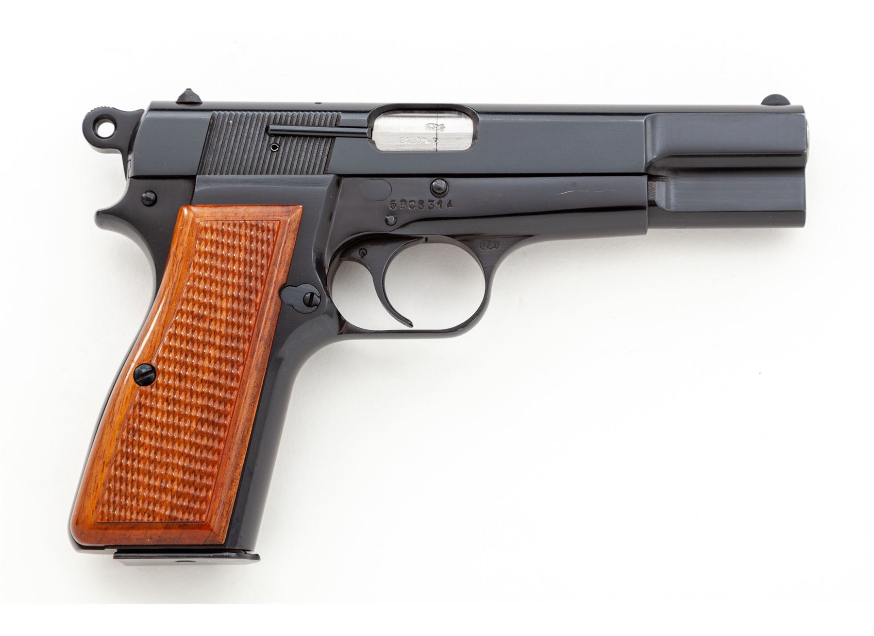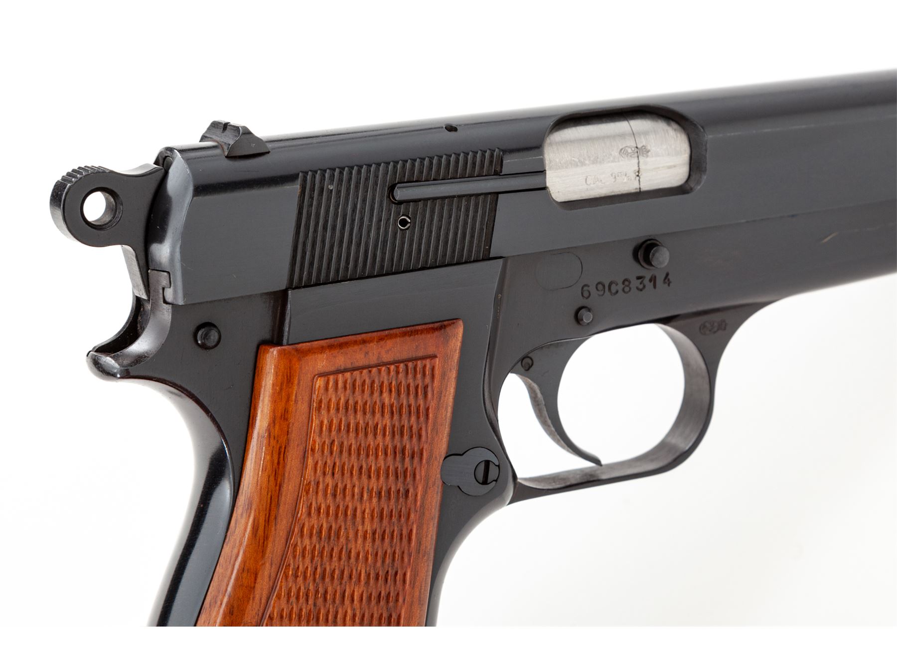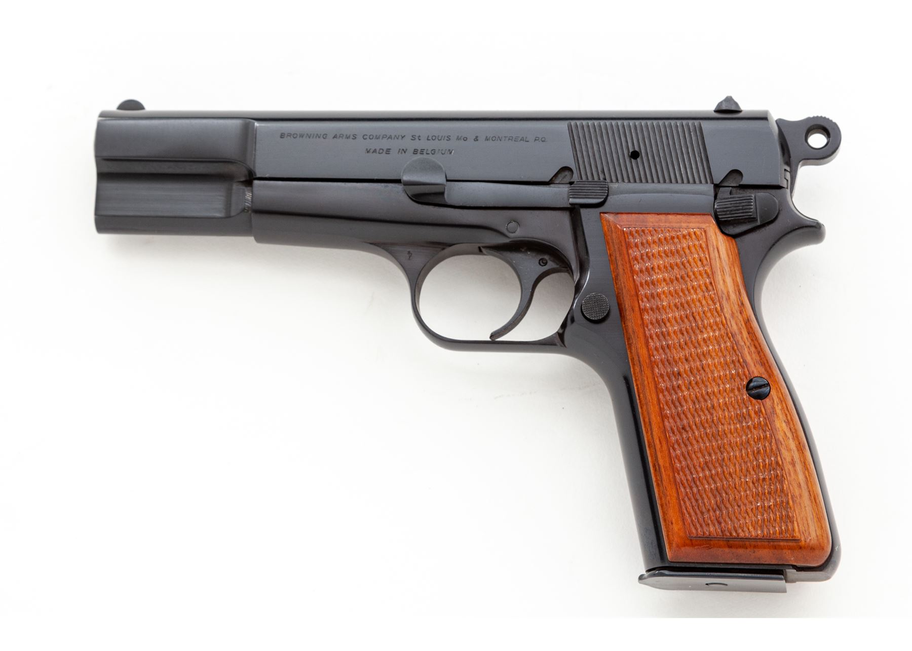 Browning Hi-Power Semi-Automatic Pistol, #69C8314, 9mm cal., 4-5/8'' barrel, dark blue finish, factory checkered red backed walnut grips, ring hammer, blade front sight, ''U''-notched rear sight. Included are three (3) 13-round magazines; two (2) with parkerized bodies, one is marked ''Made In Italy'', both with blued floorplates and one blued steel magazine with black plastic floorplate. Left side of slide is marked ''BROWNING ARMS COMPANY ST LOUIS MO & MONTREAL P.Q.'' and ''MADE IN BELGIUM''. Mfg'd 1969. Approx. 99% original blue finish remains and pistol rates as excellent overall; metal with only a few slight handling marks. Grips retain all of their gloss finish with only a few insignificant marks to the smooth borders, checkering shows no visible wear. Action is smooth, bore is bright with excellent rifling; inside and out a very clean high condition pistol. Est.: $750-$1,000. (Modern/PPT) (High-cap mags not available to Calif. residents.)